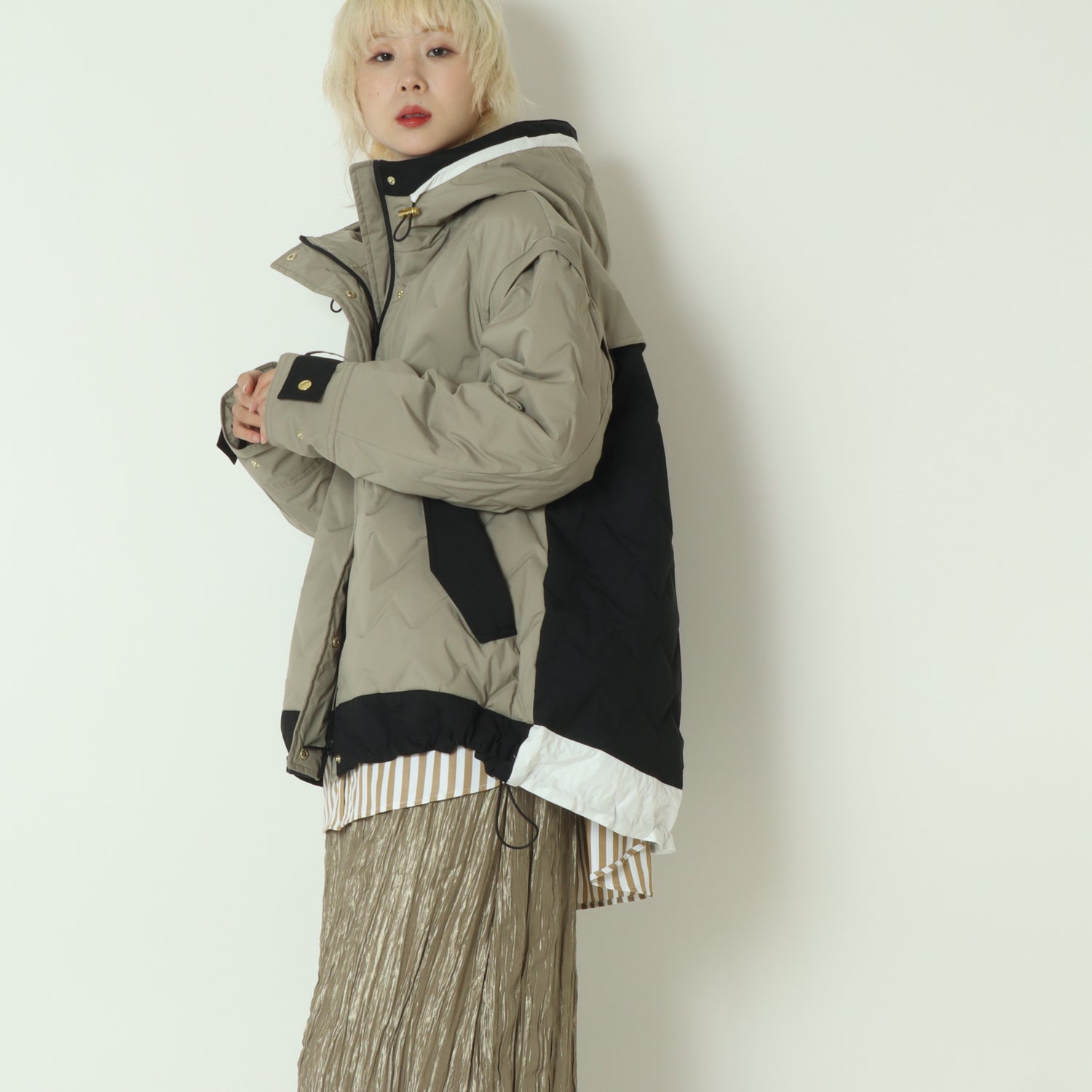 程よい透け感素材にチュールを部分的に切り替え、ライトに羽織れるフードパーカーです。