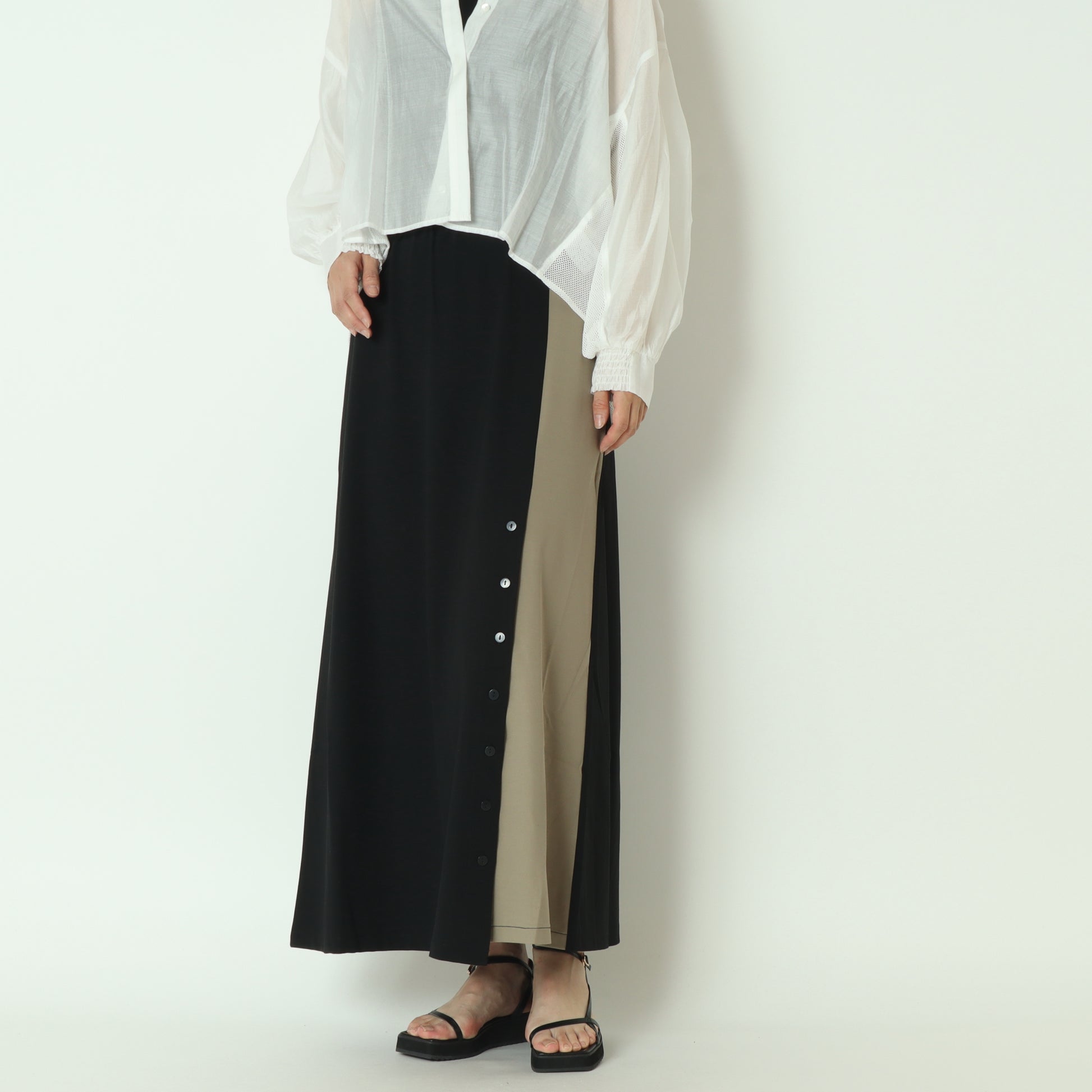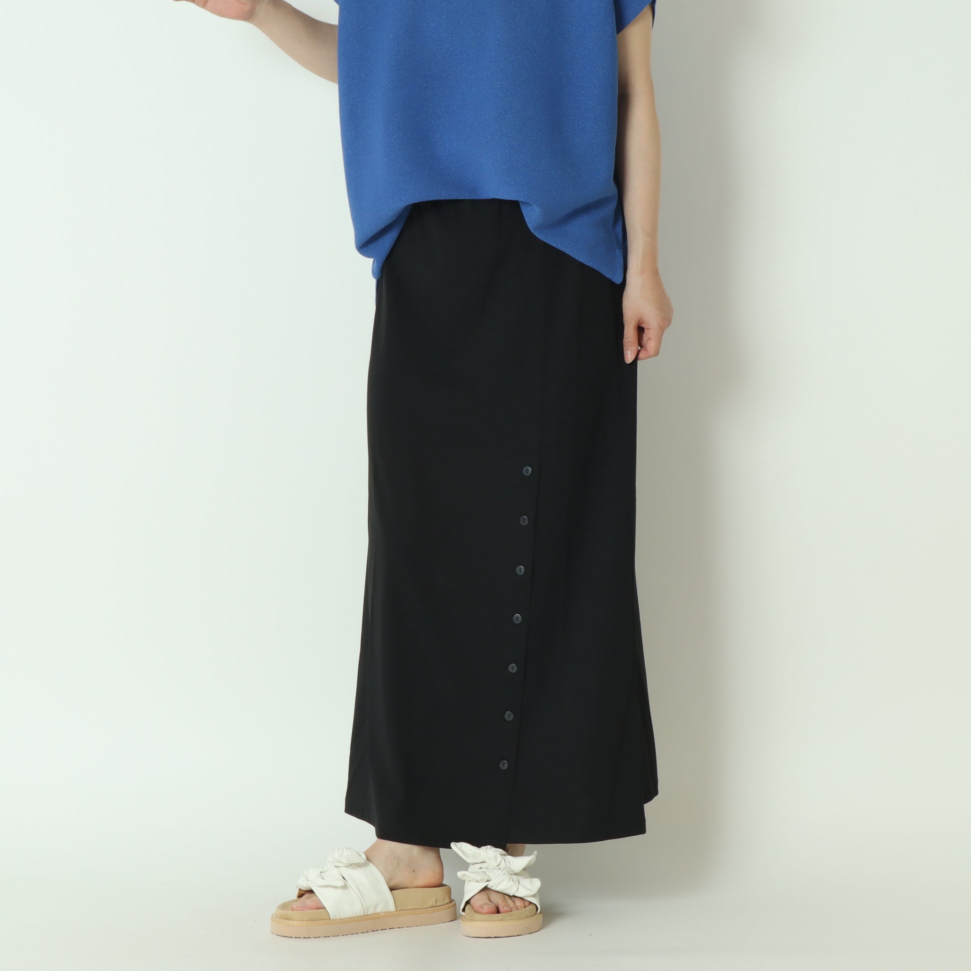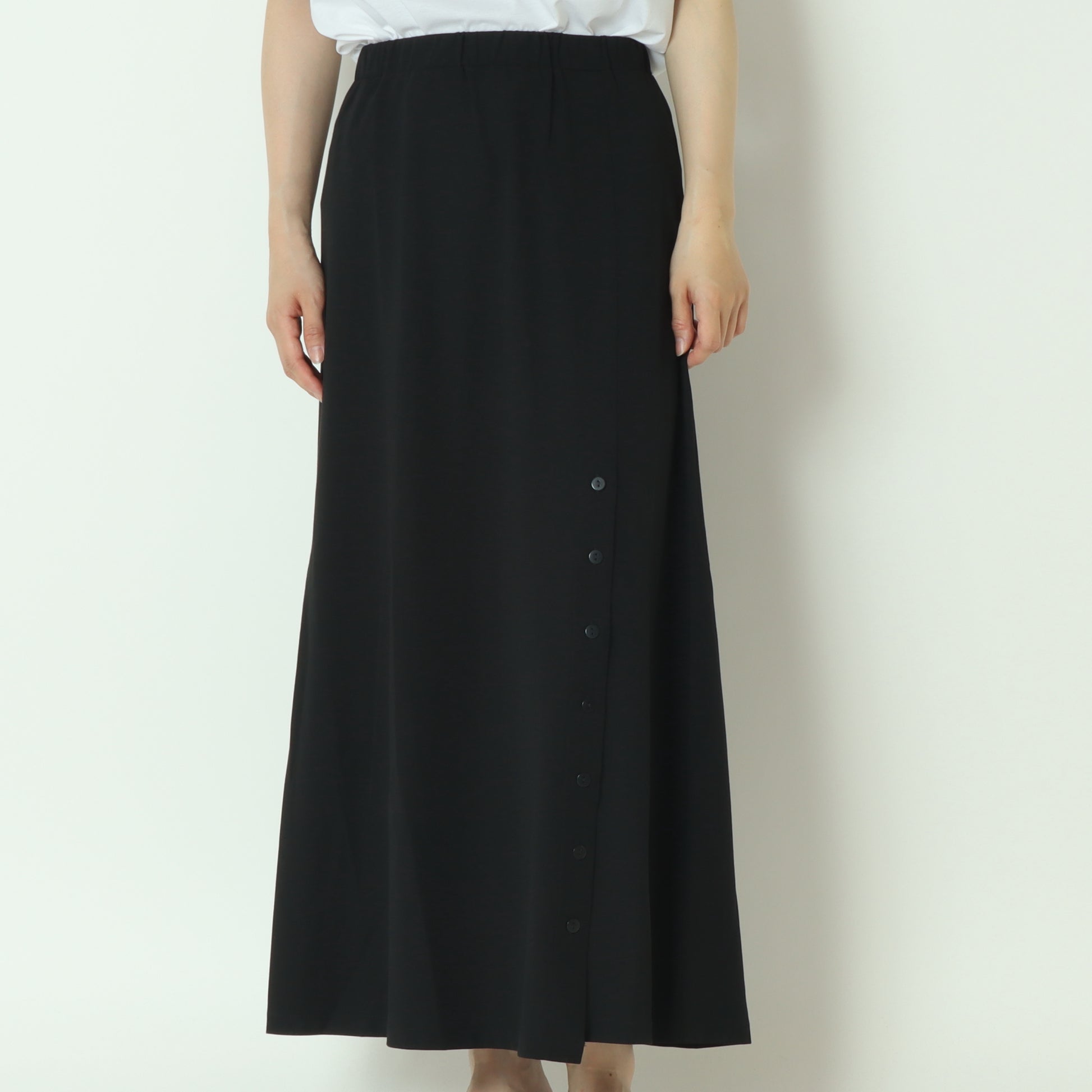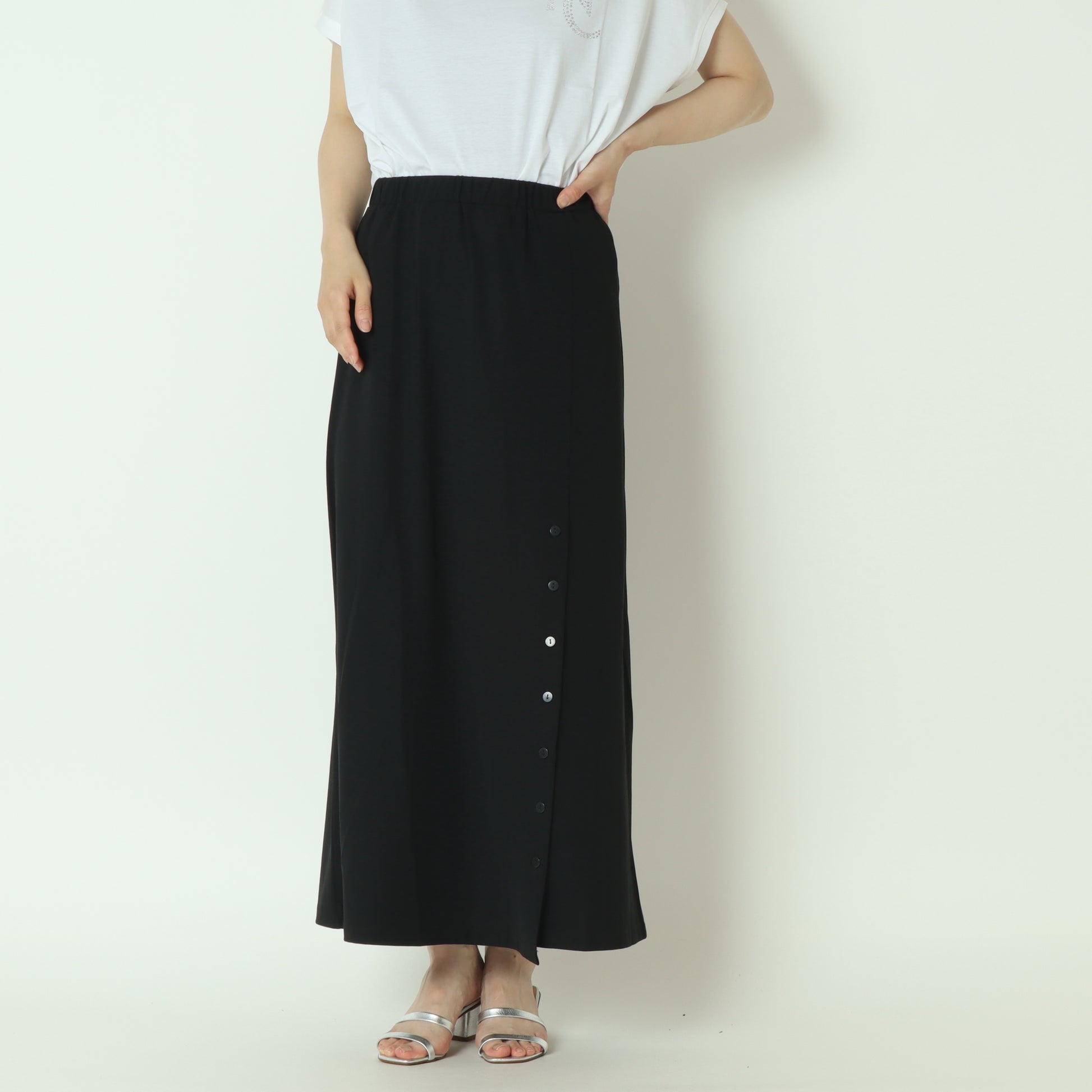ボタンのついた切替がラップ風なマキシ丈スカート。