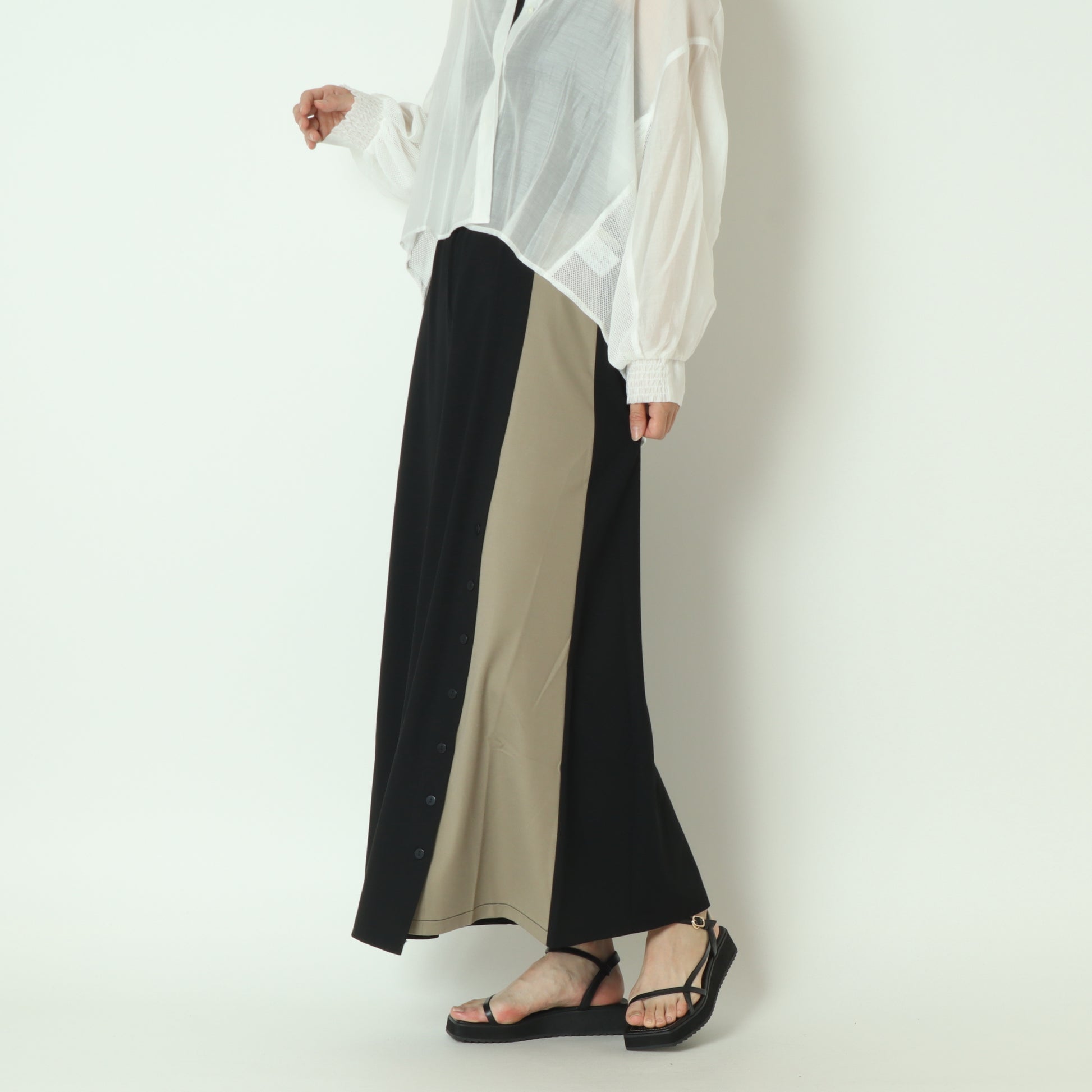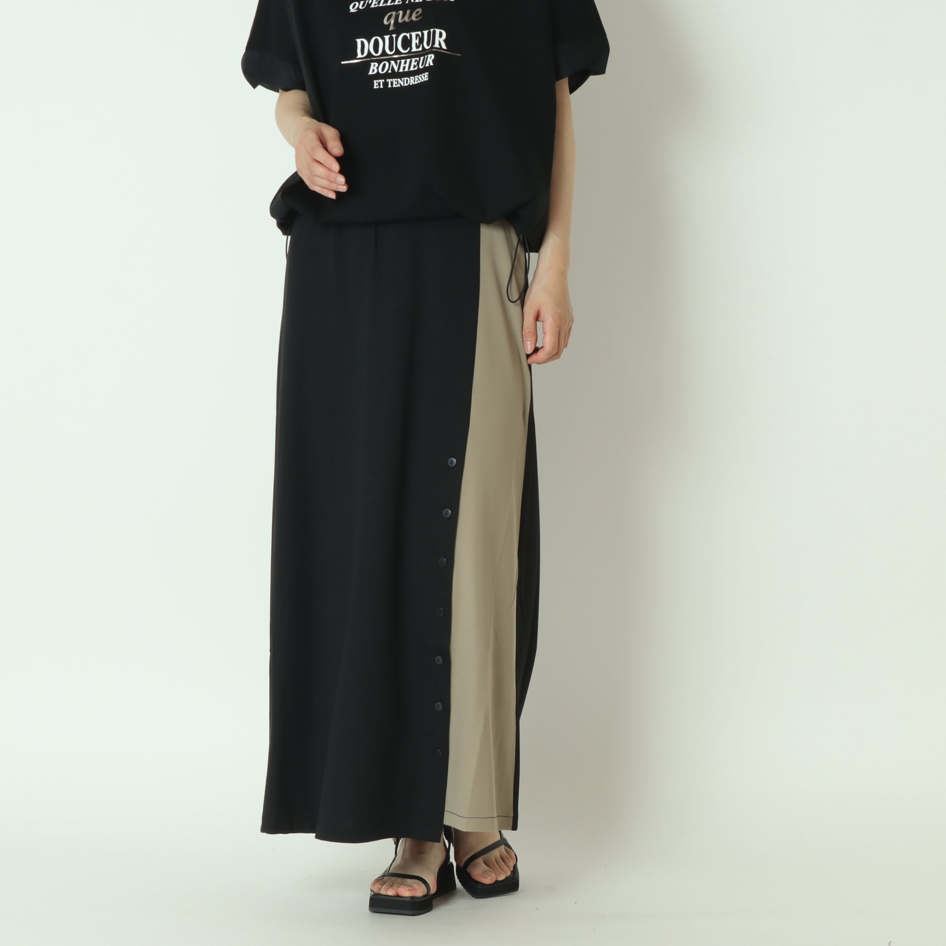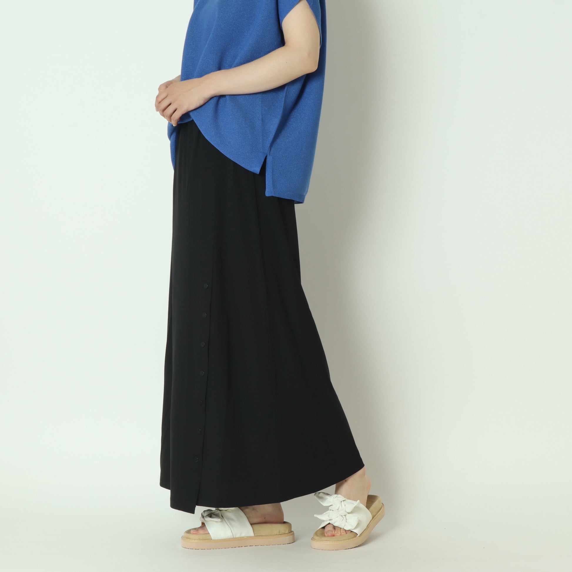 ボタンのついた切替がラップ風なマキシ丈スカート。