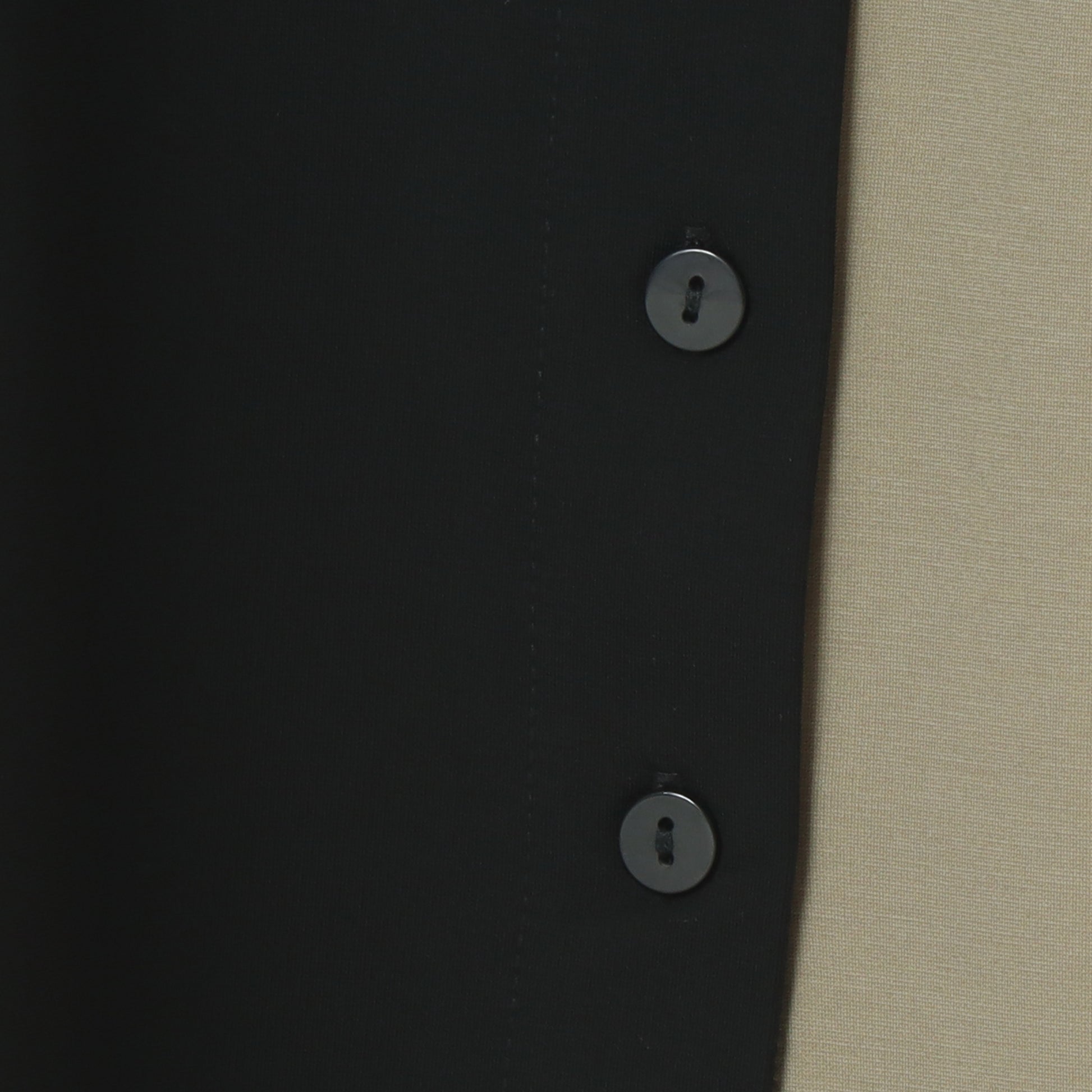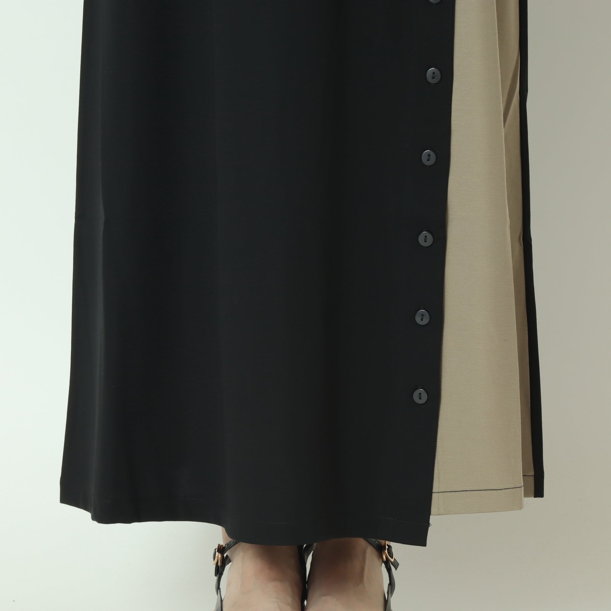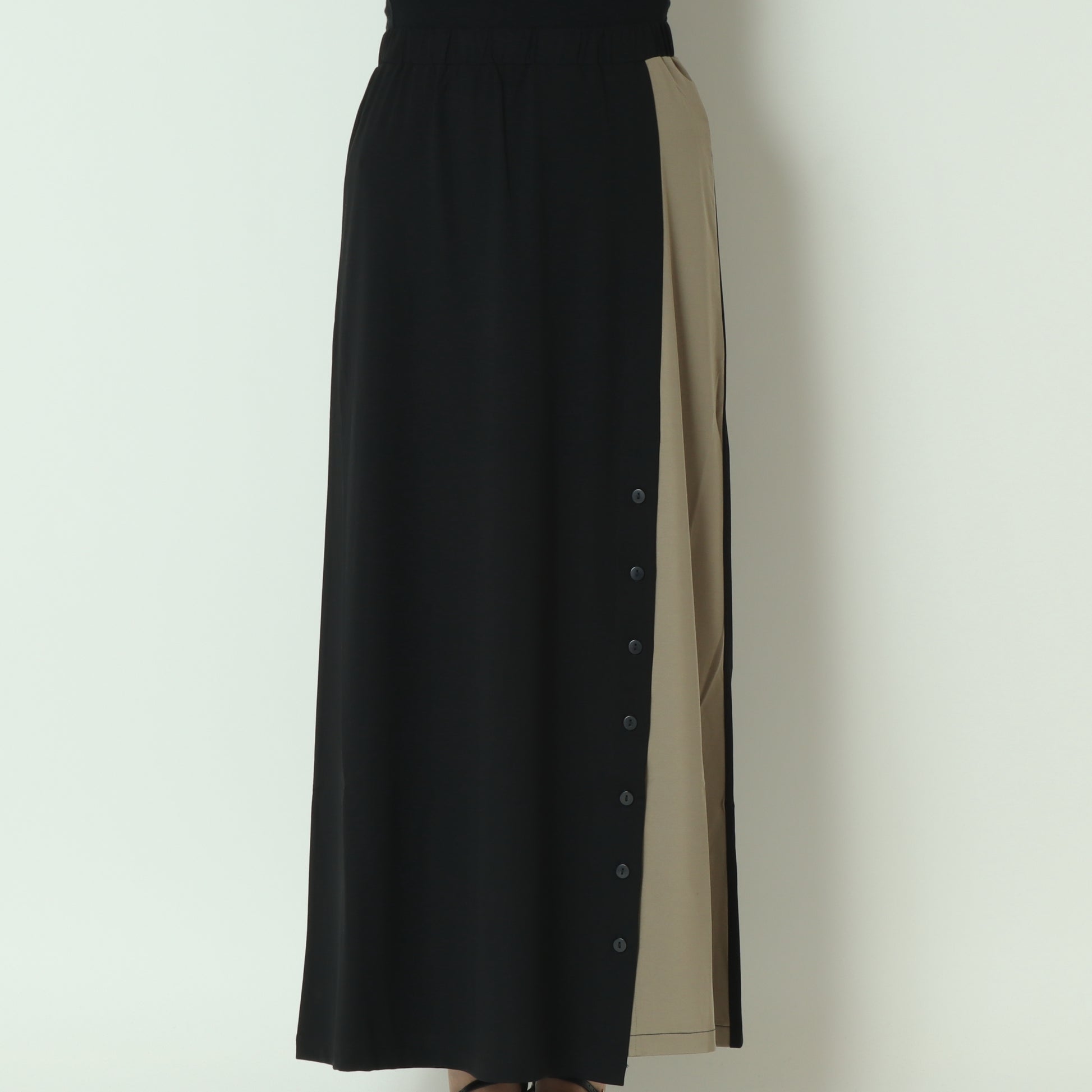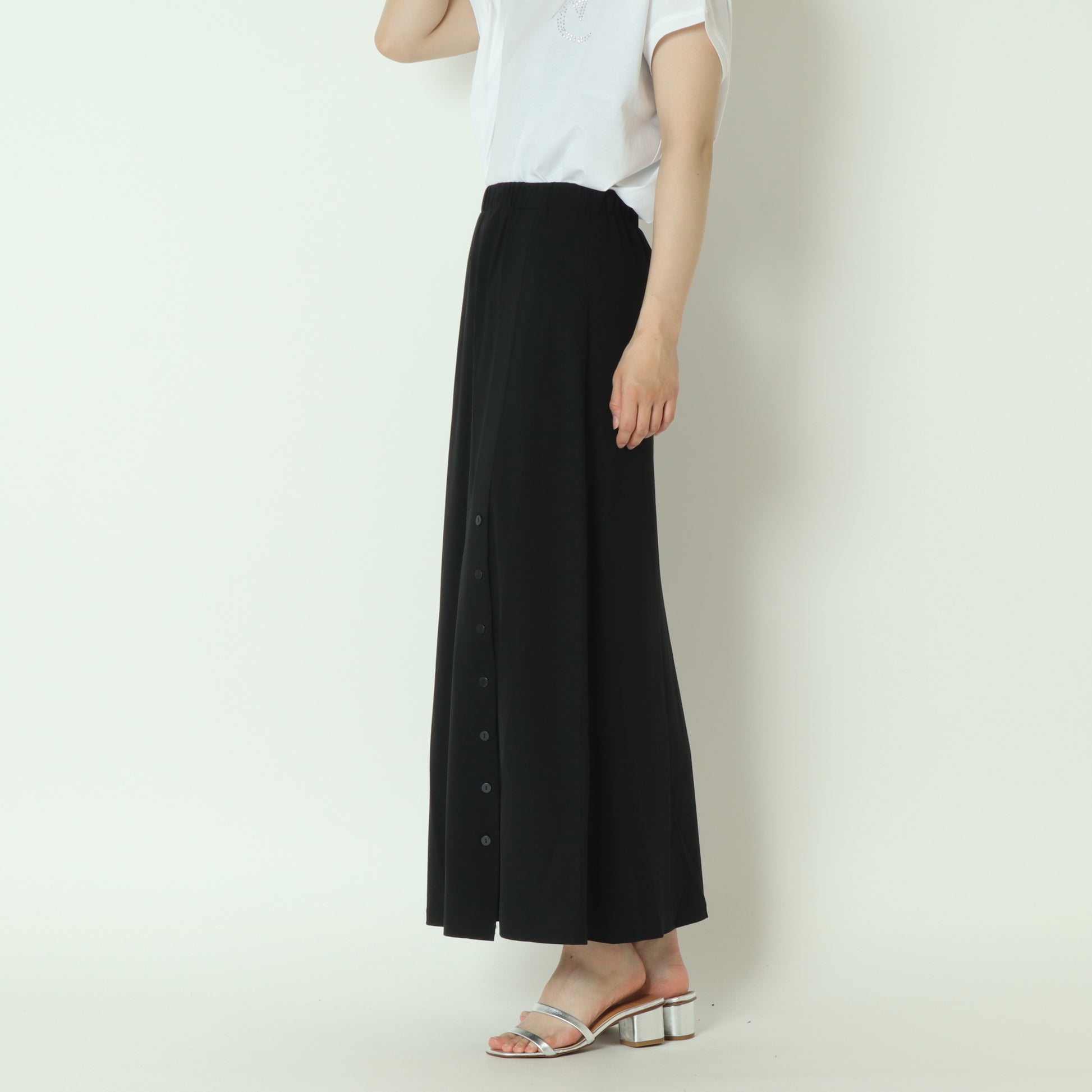 ボタンのついた切替がラップ風なマキシ丈スカート。