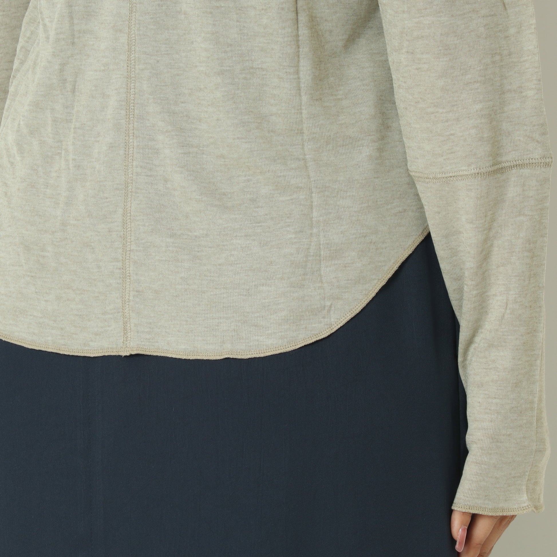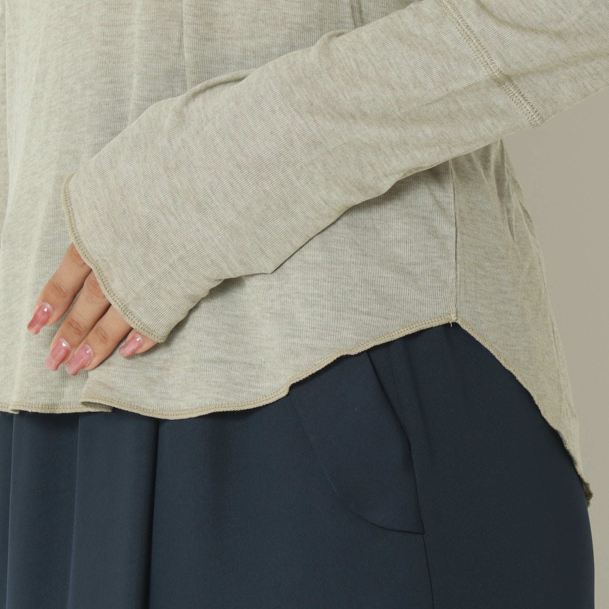 高めのネックや、長めの袖はレイヤードにも最適で、ニットやワンピースのインに合わせても、ゴワゴワせず着回しやすい万能アイテムです。