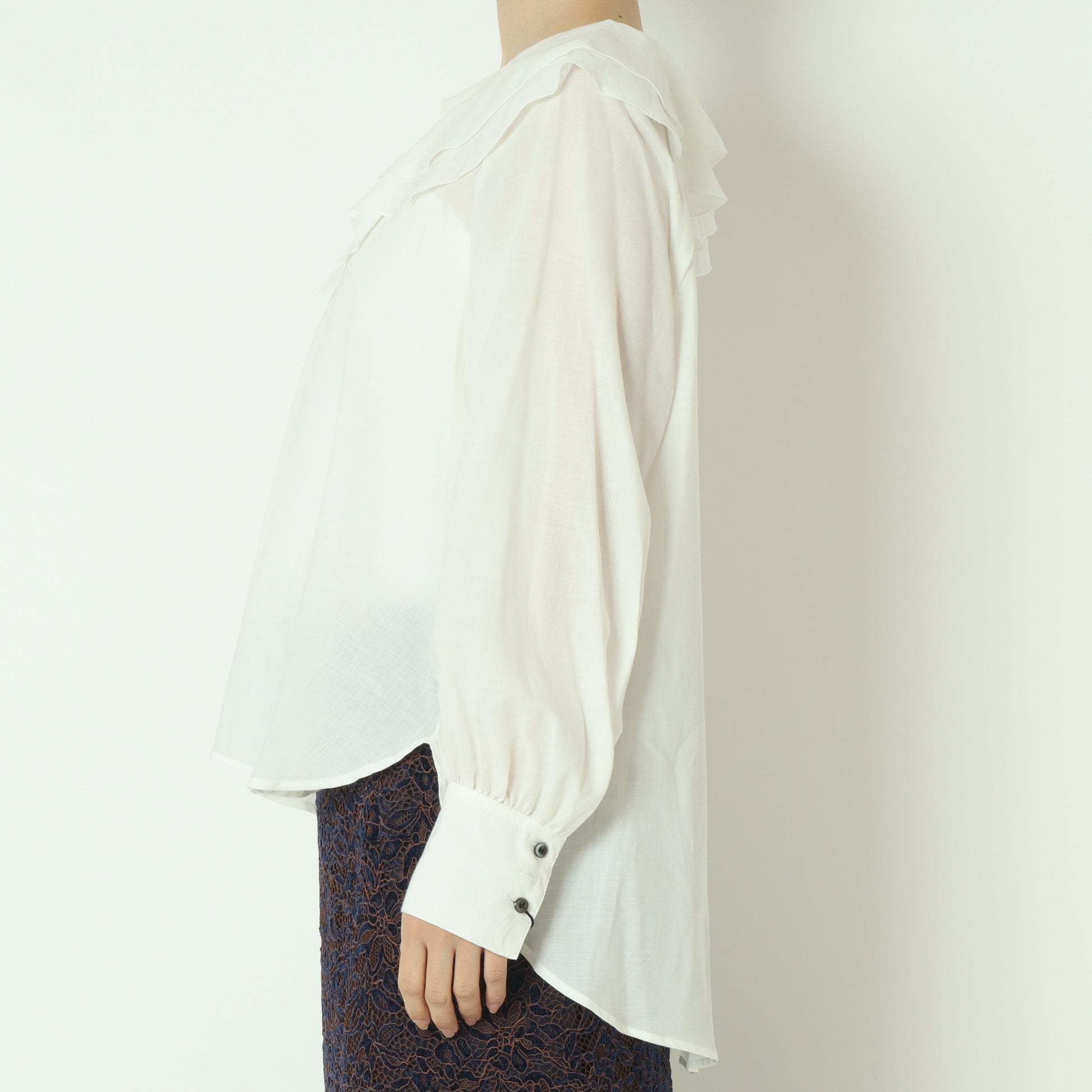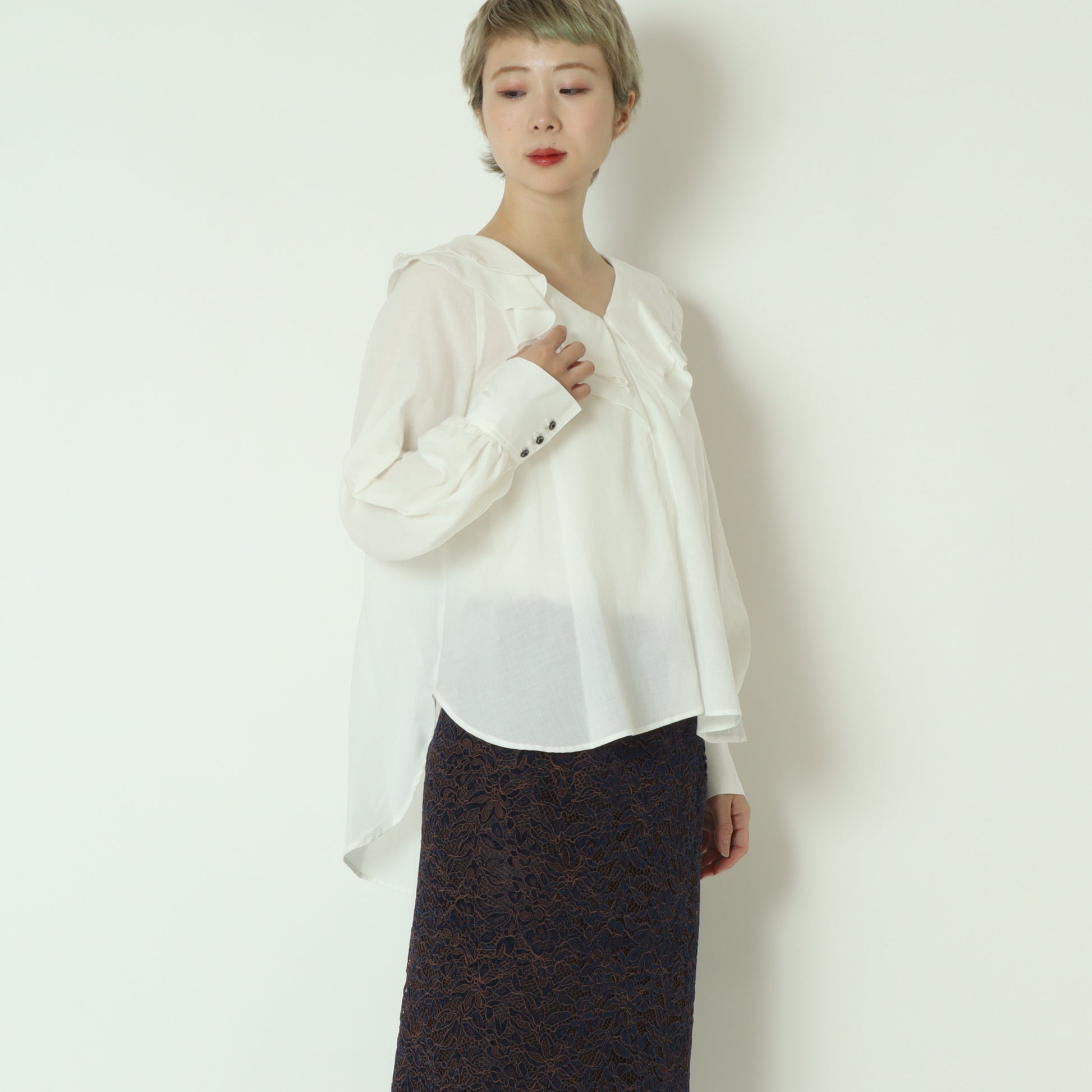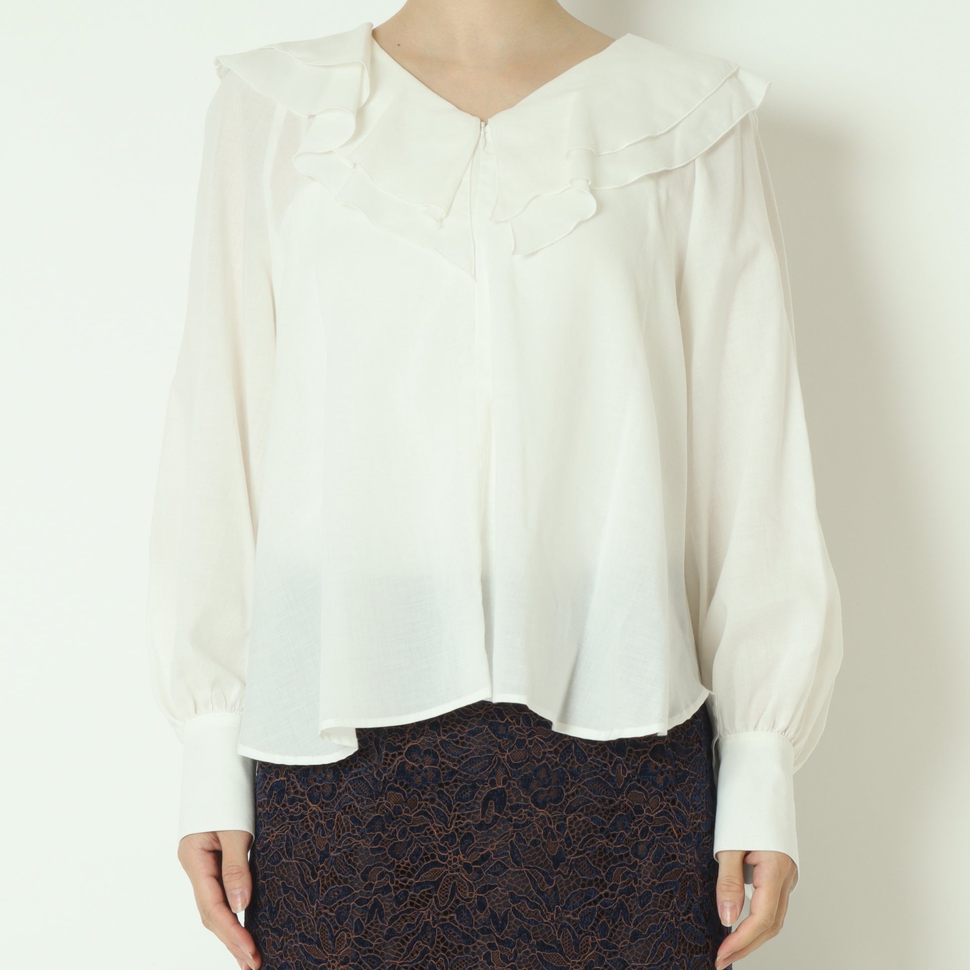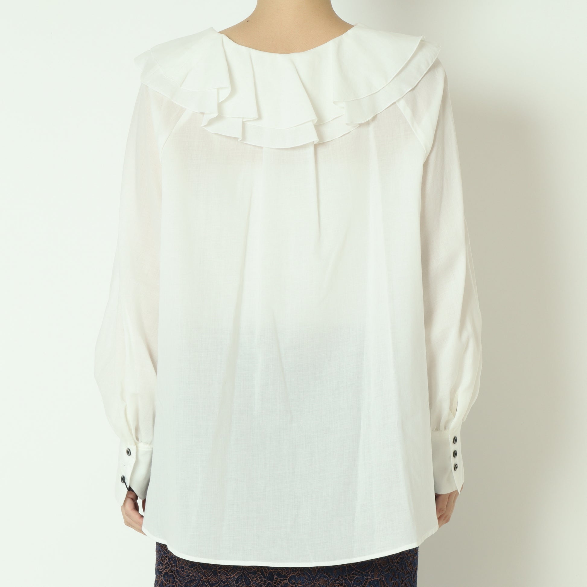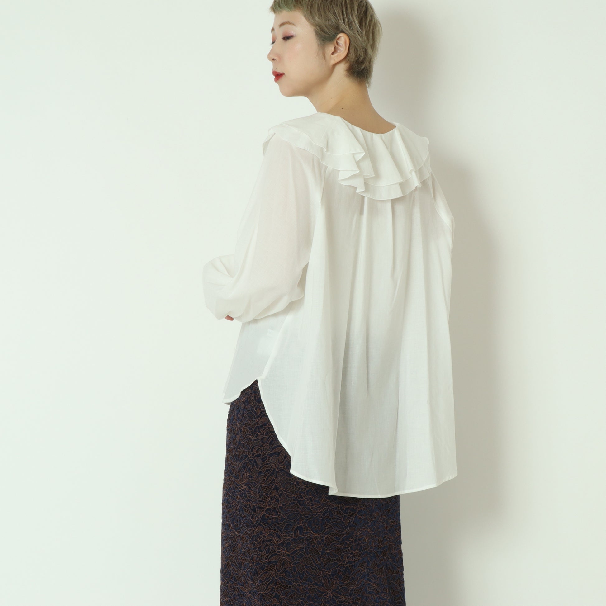 たっぷりと華やかなフリルネックが印象的なシアーブラウス。