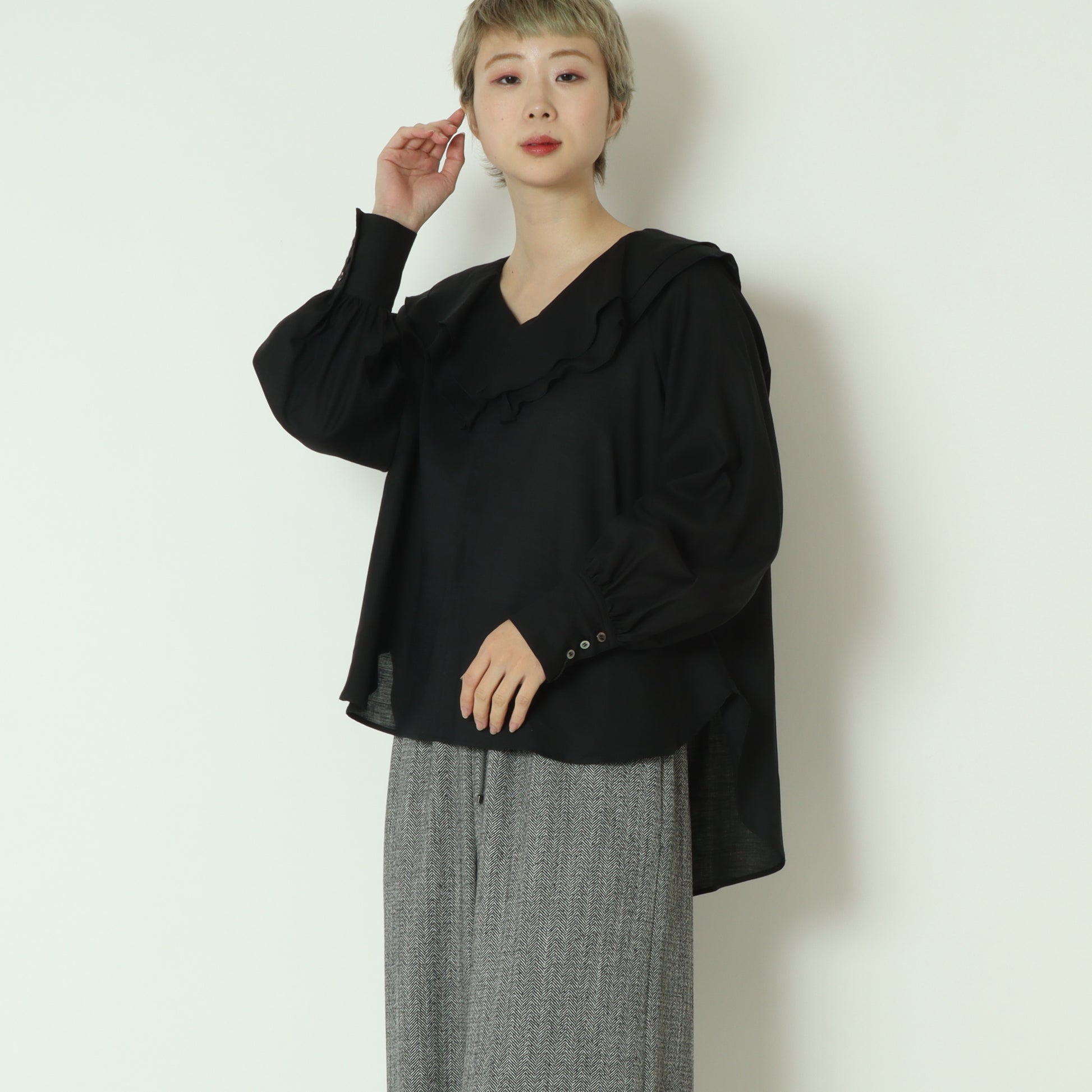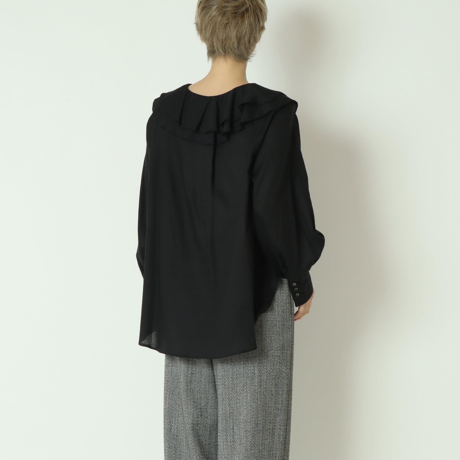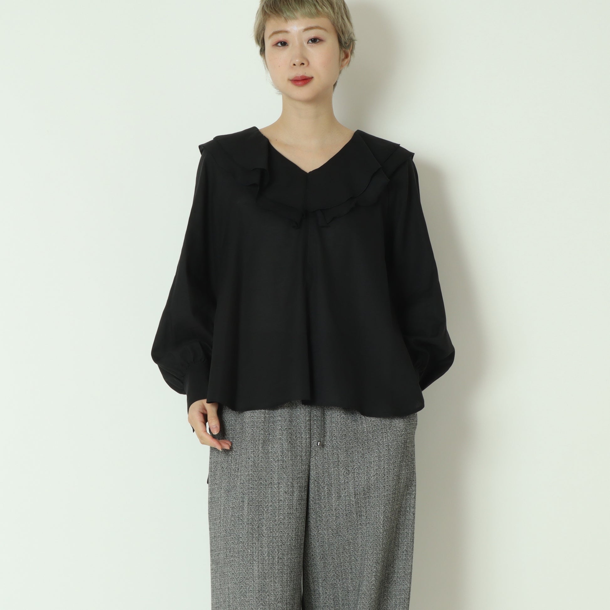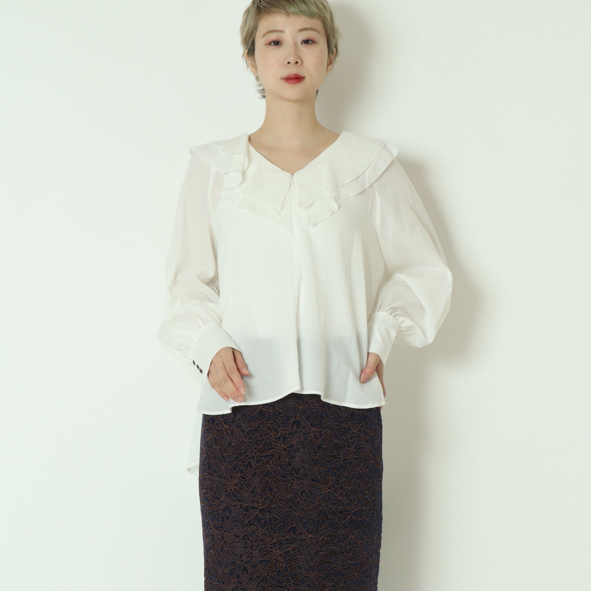 たっぷりと華やかなフリルネックが印象的なシアーブラウス。