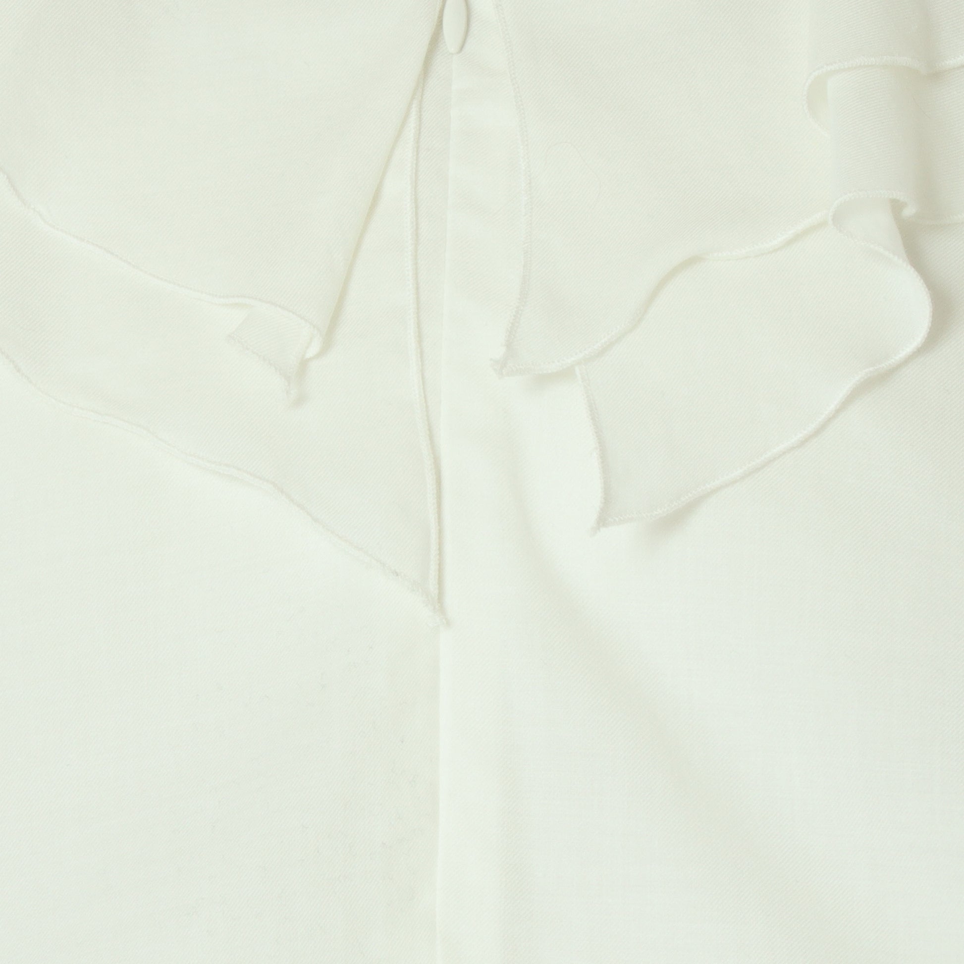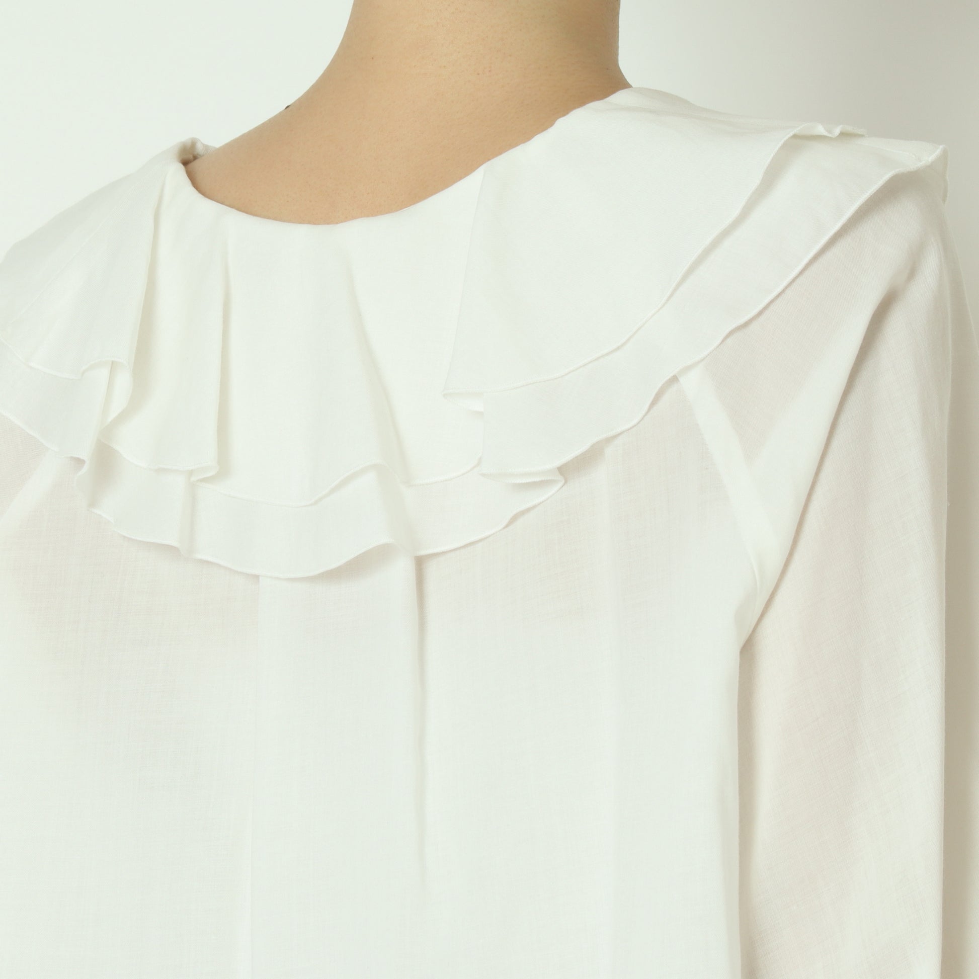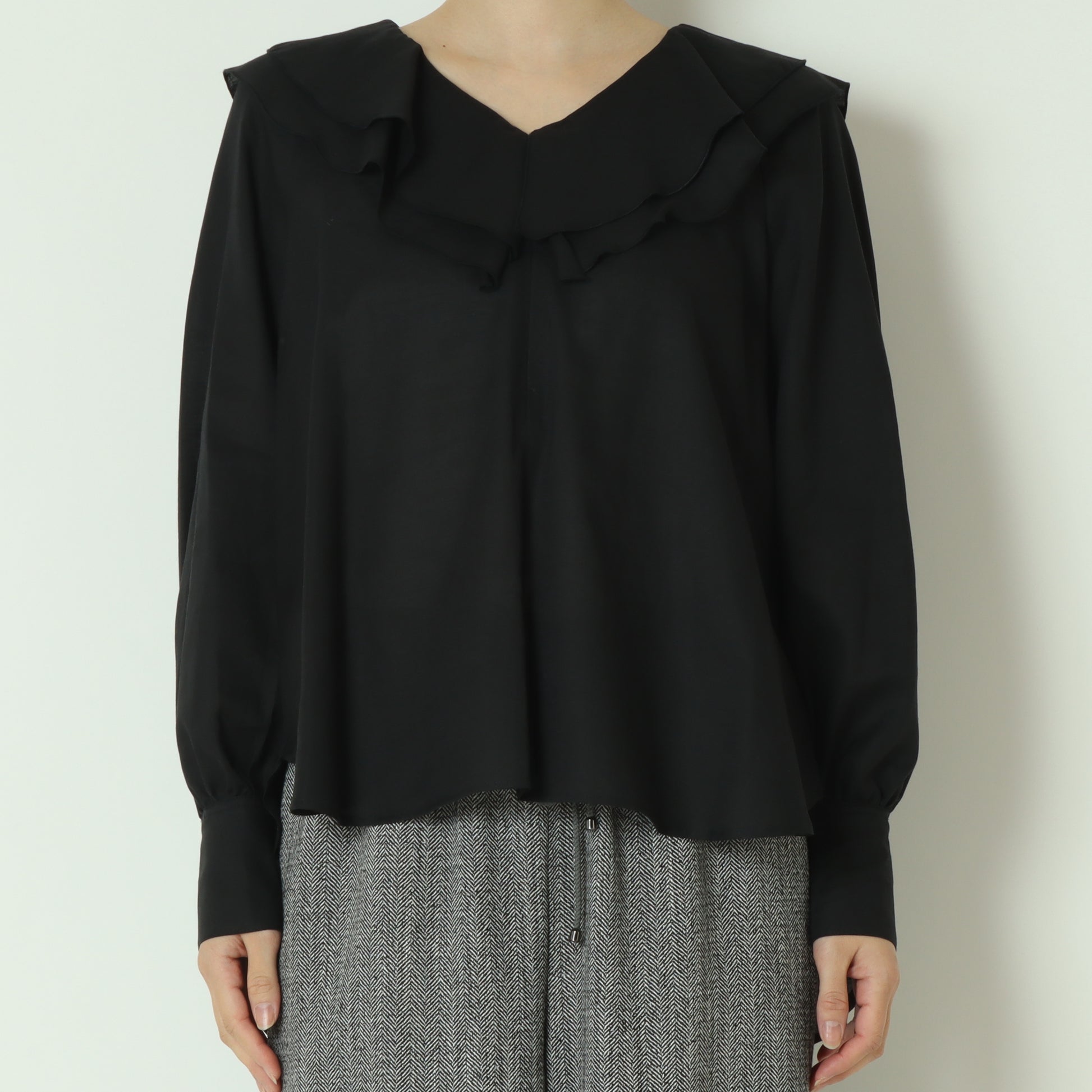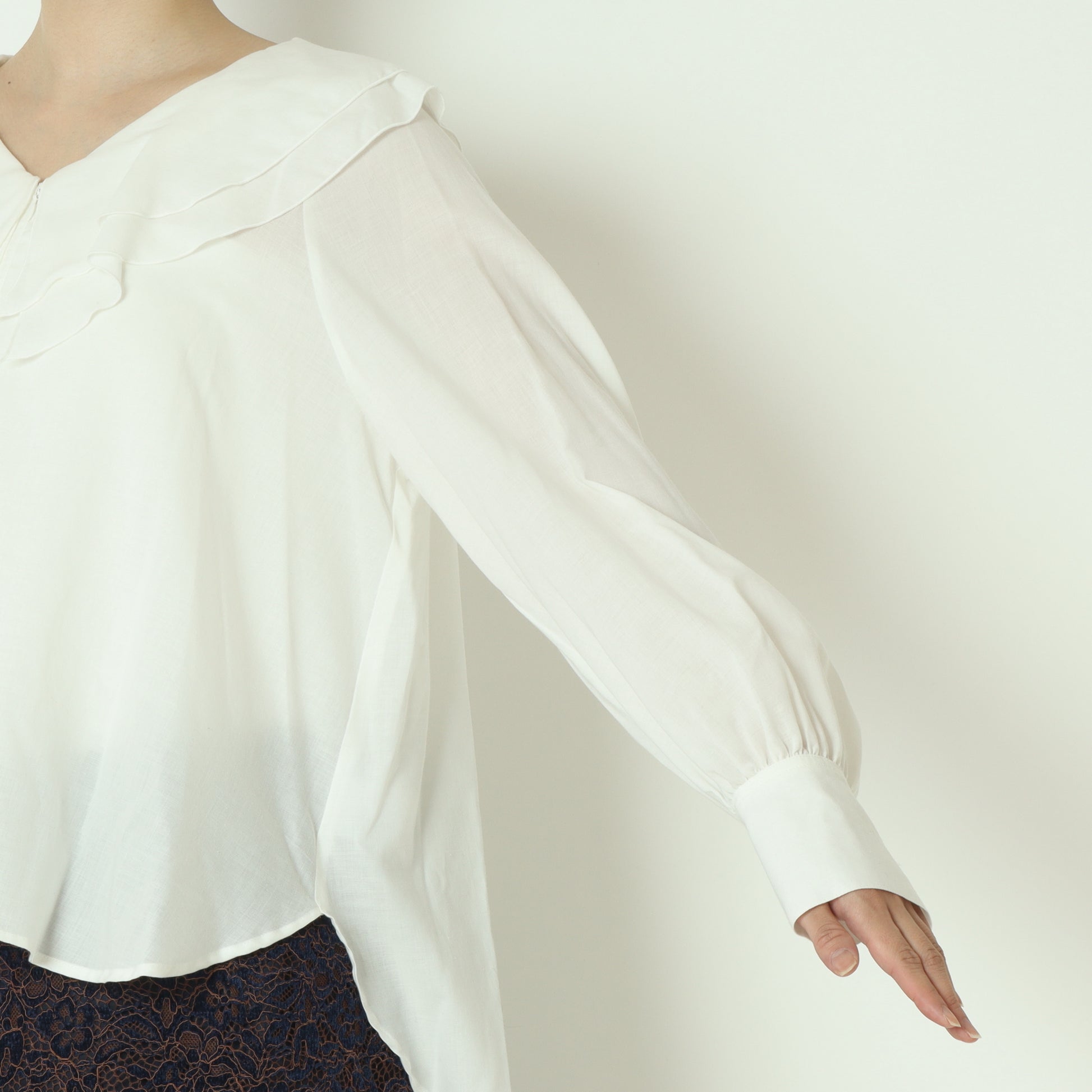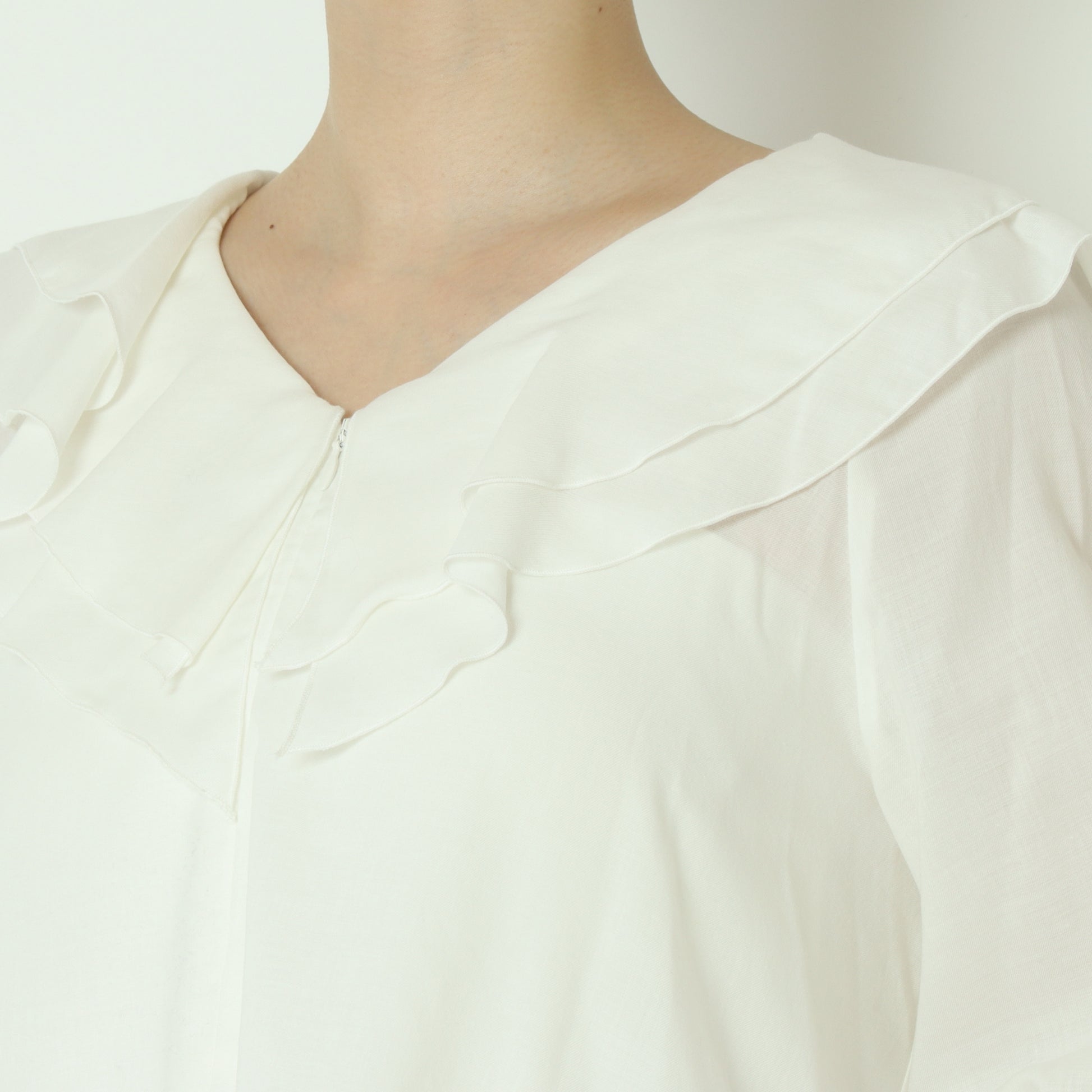 たっぷりと華やかなフリルネックが印象的なシアーブラウス。