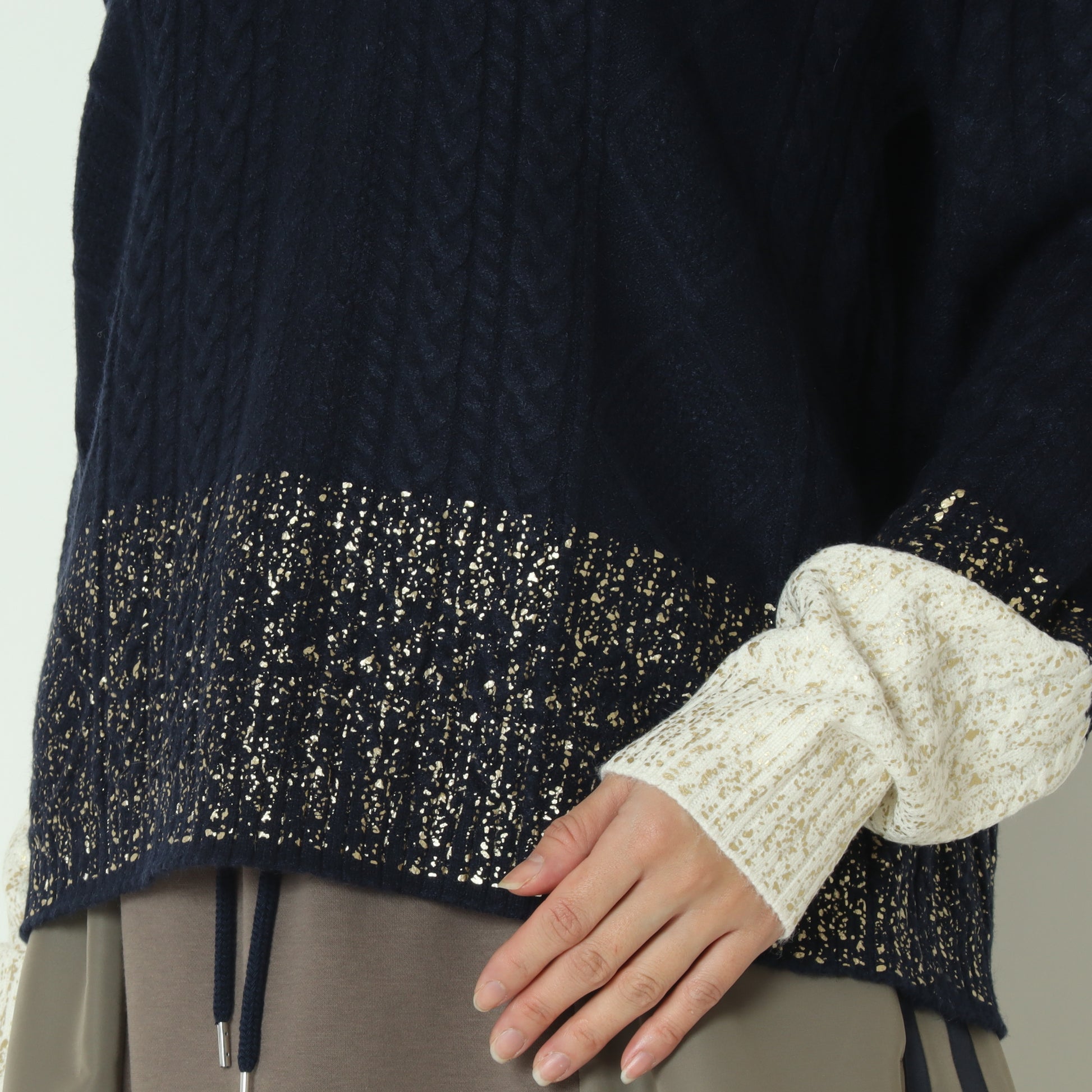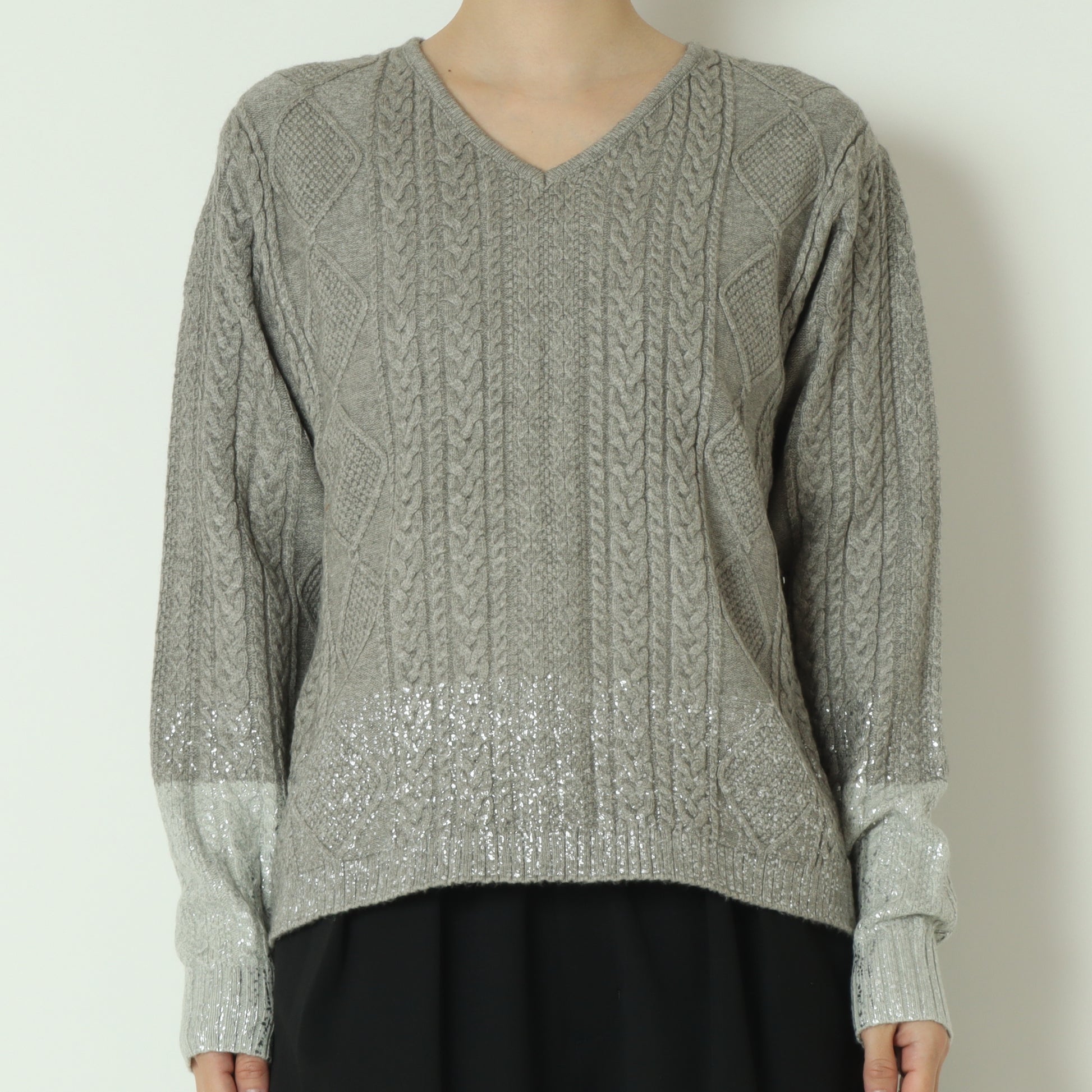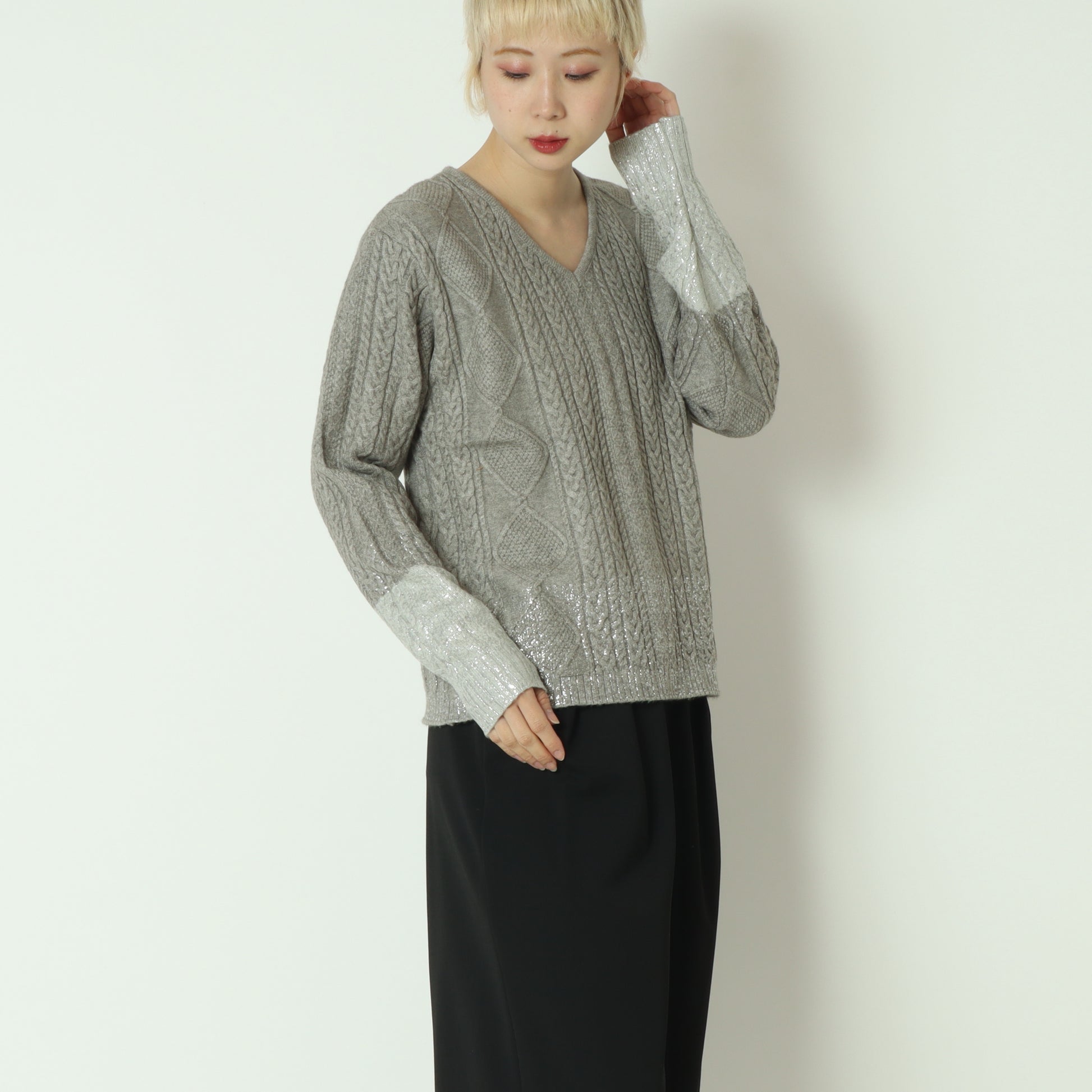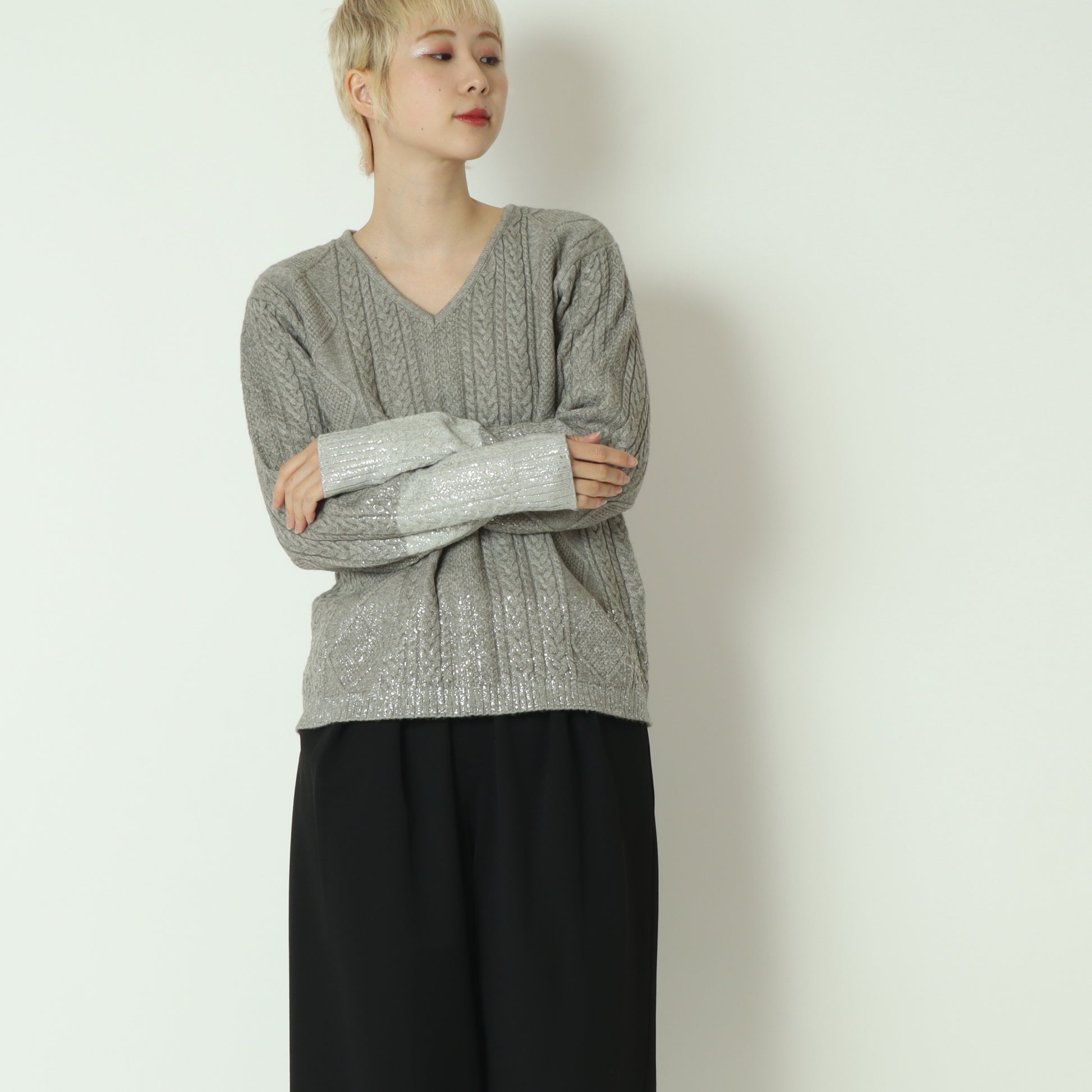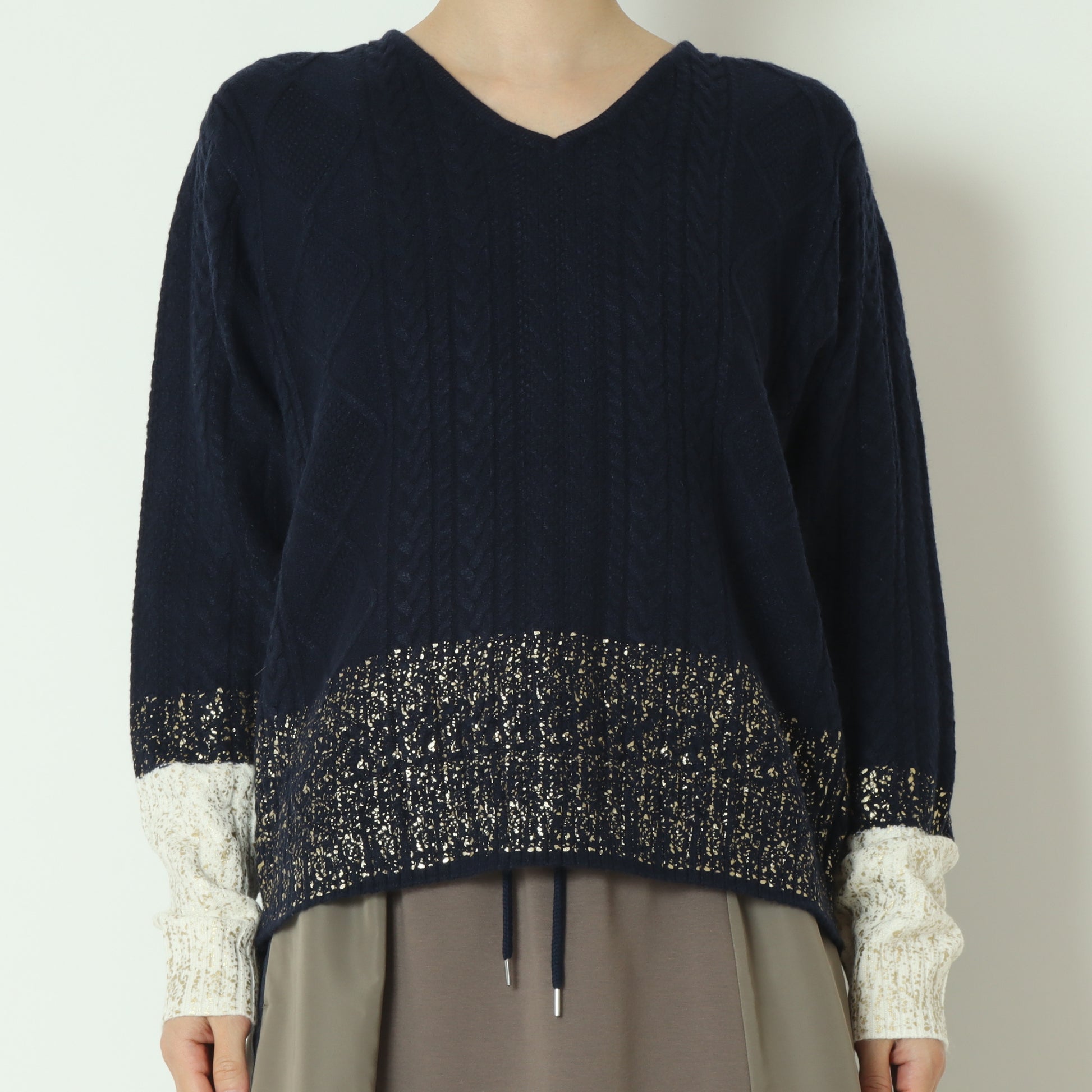 裾と袖に箔コーティングを施したデザイン性のあるVネックプルオーバー。