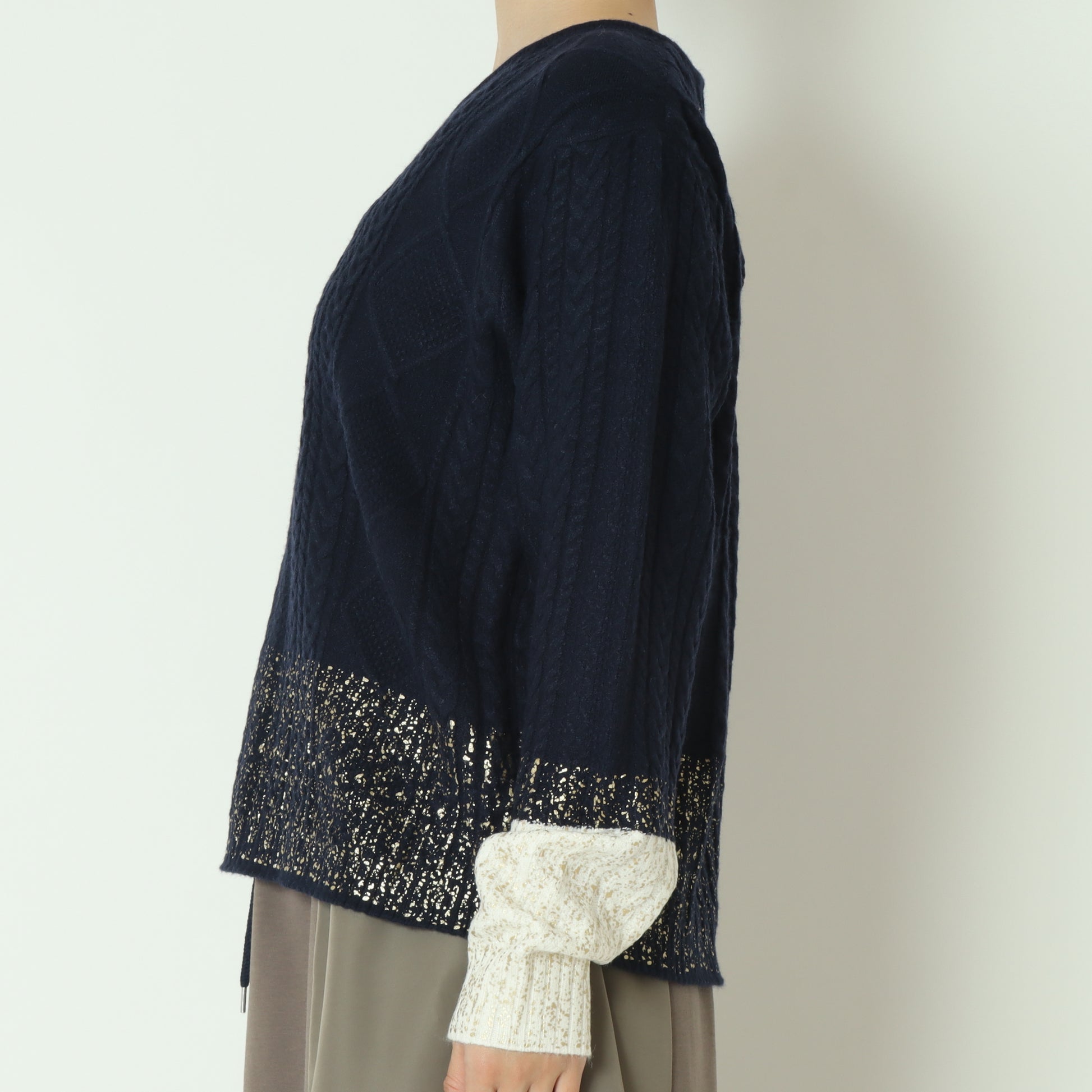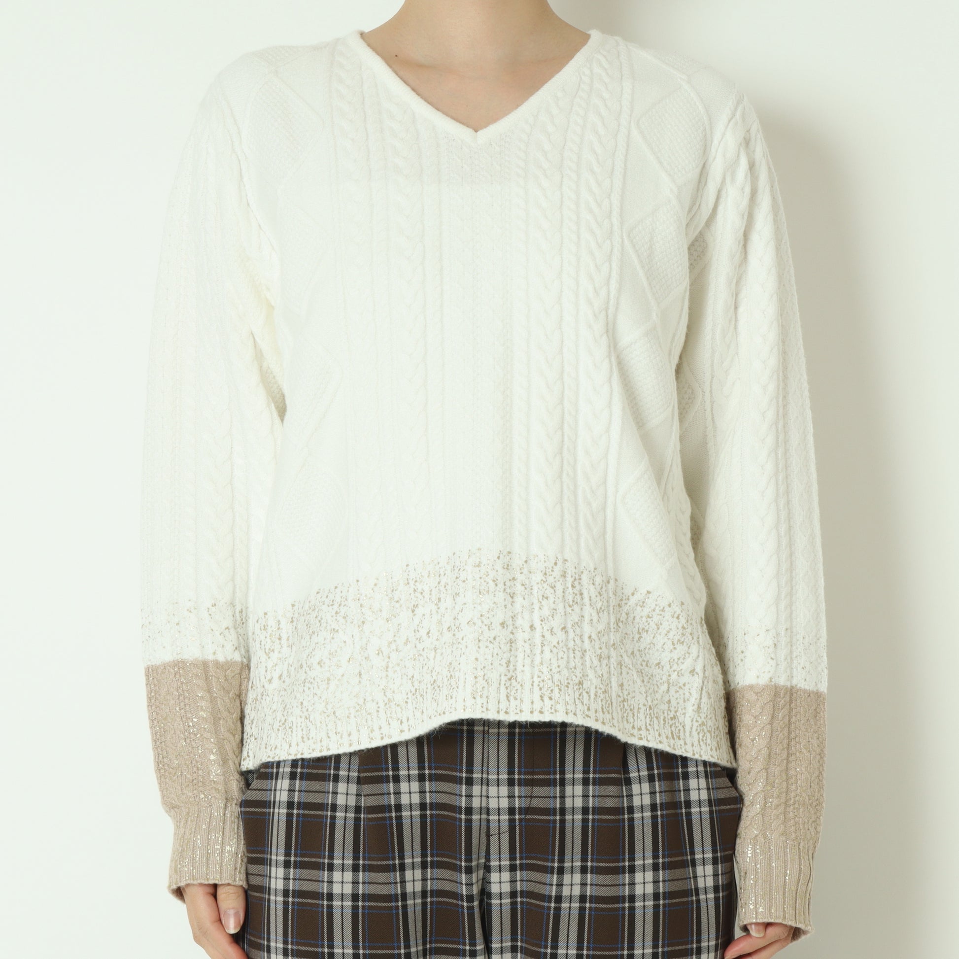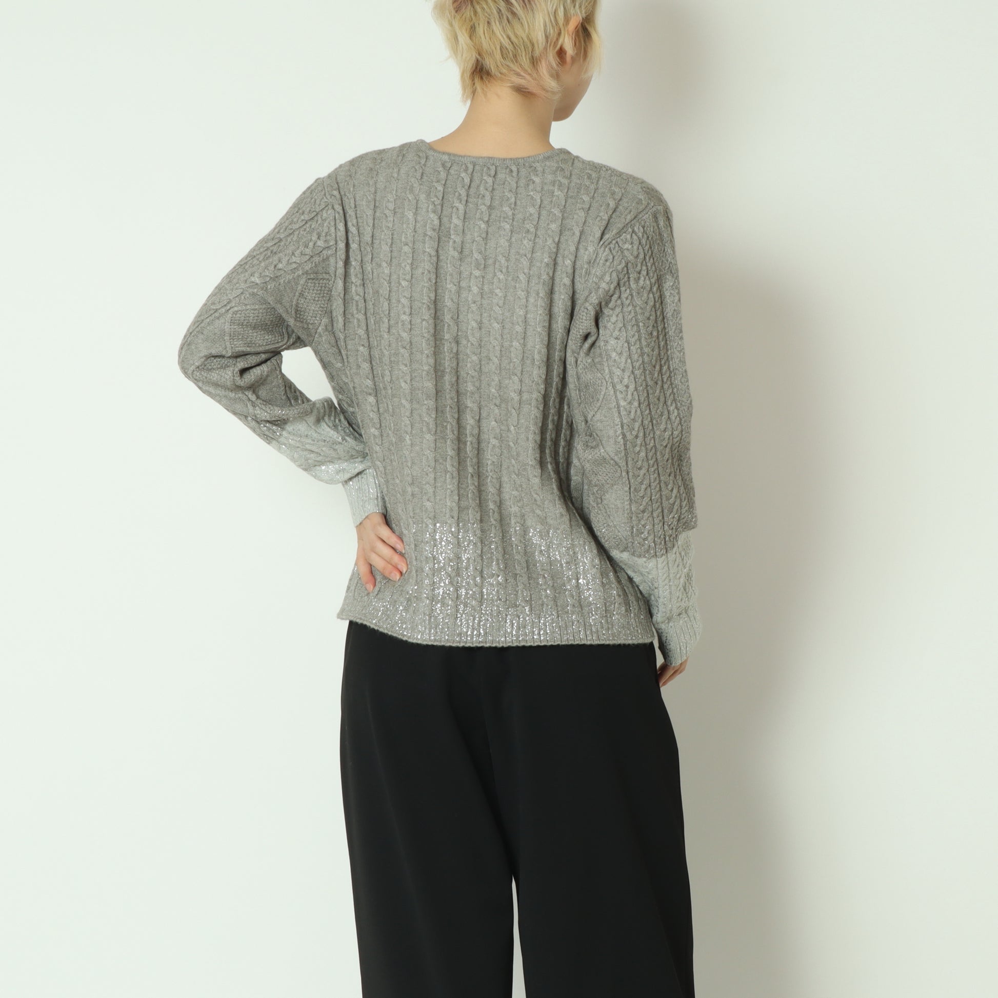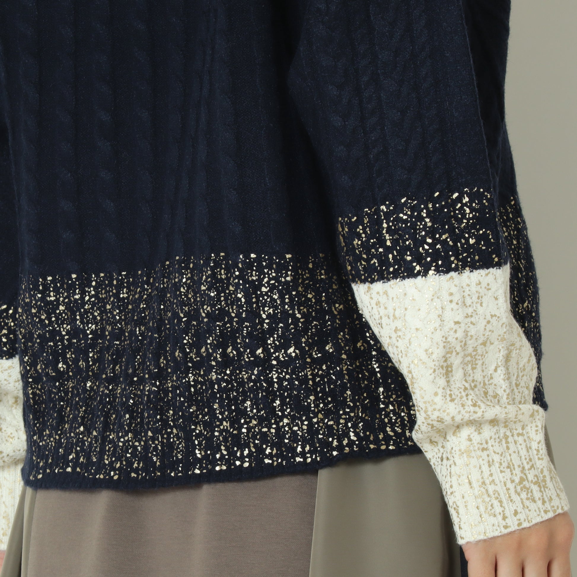 裾と袖に箔コーティングを施したデザイン性のあるVネックプルオーバー。