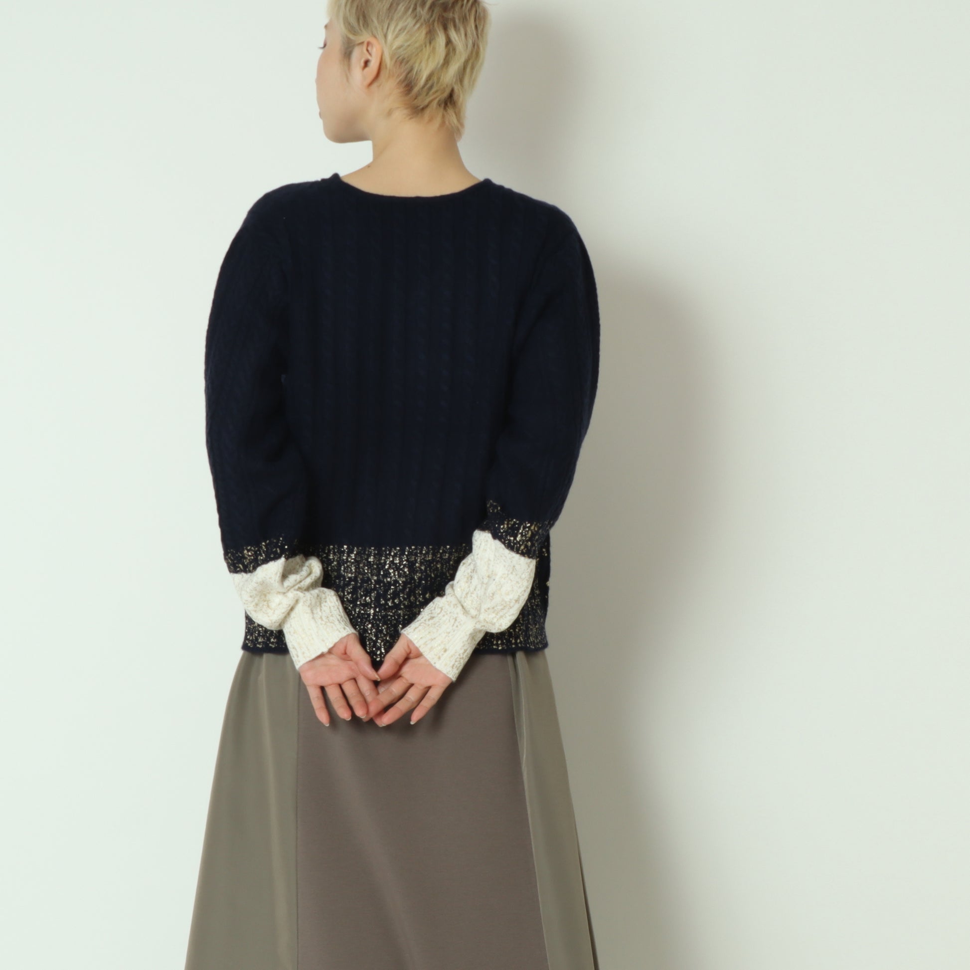 袖口はバイカラーに切り替えた上に箔コーティングが施され、バイカラー部分は長めにとっているので、腕が長く見えてスタイルアップ効果も◎