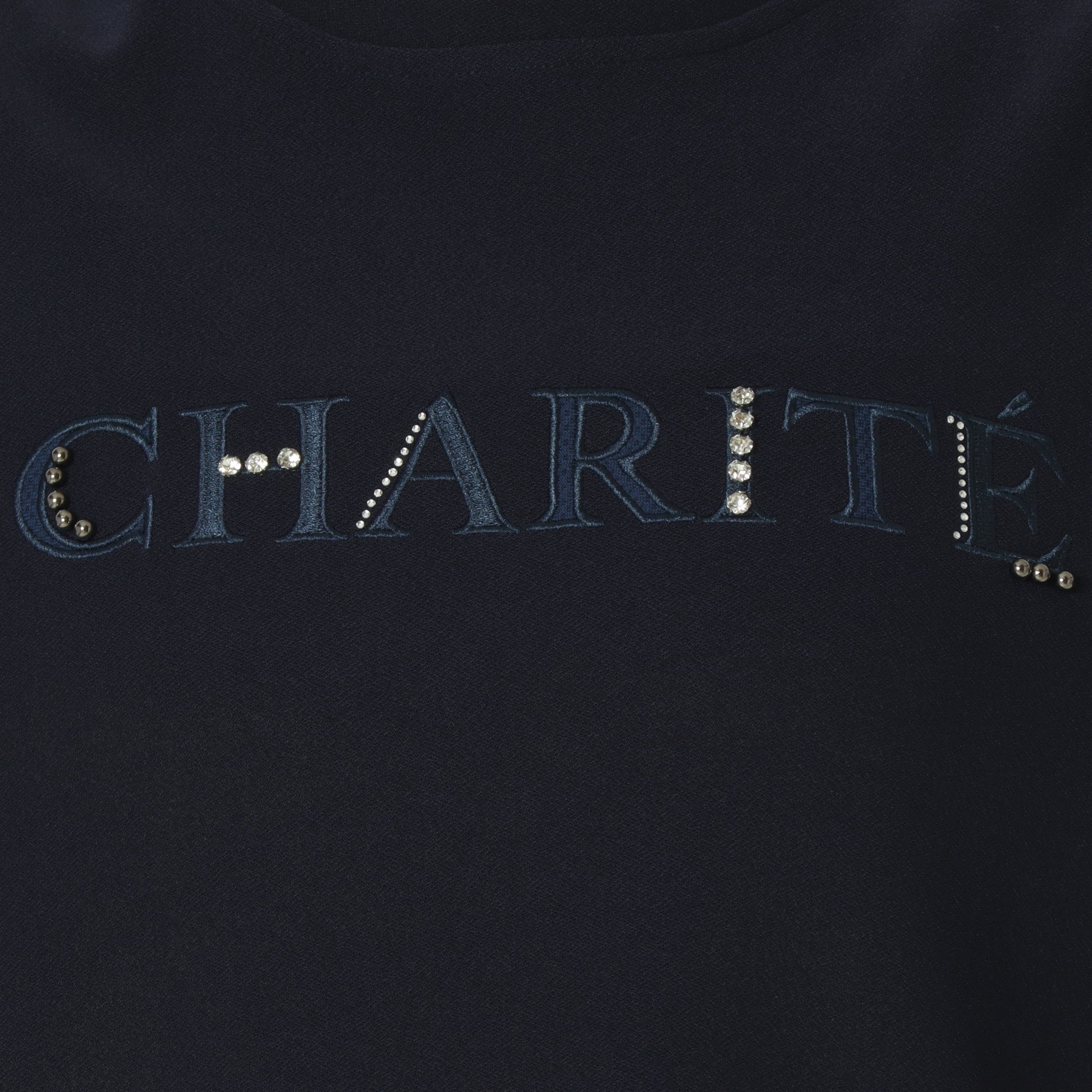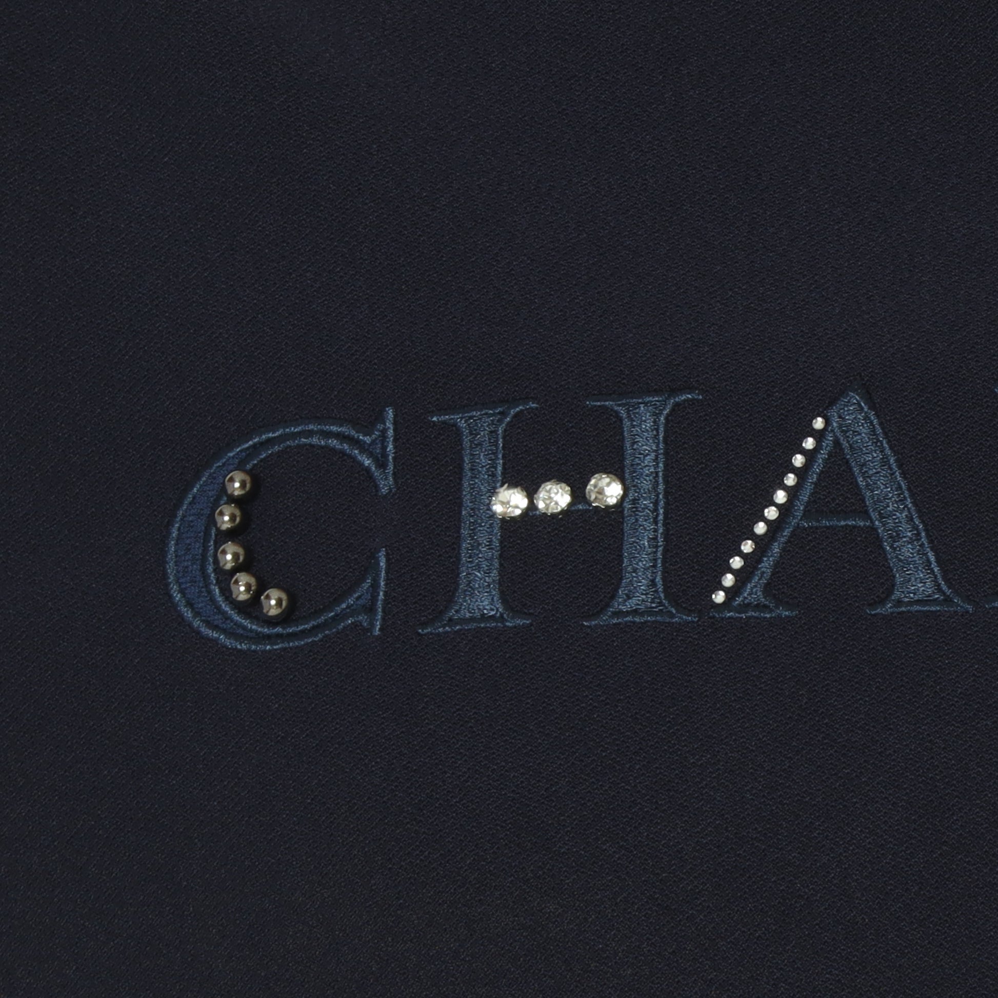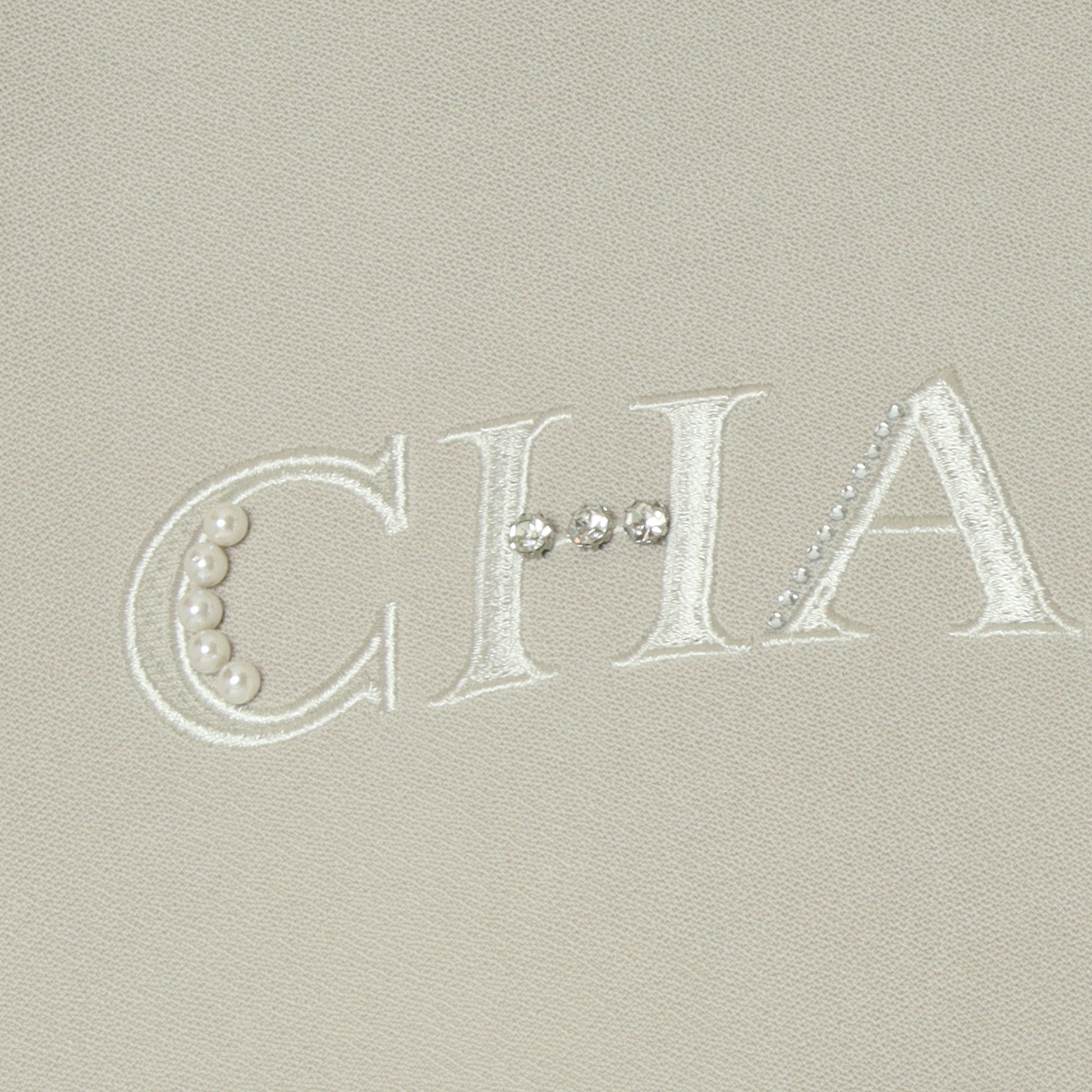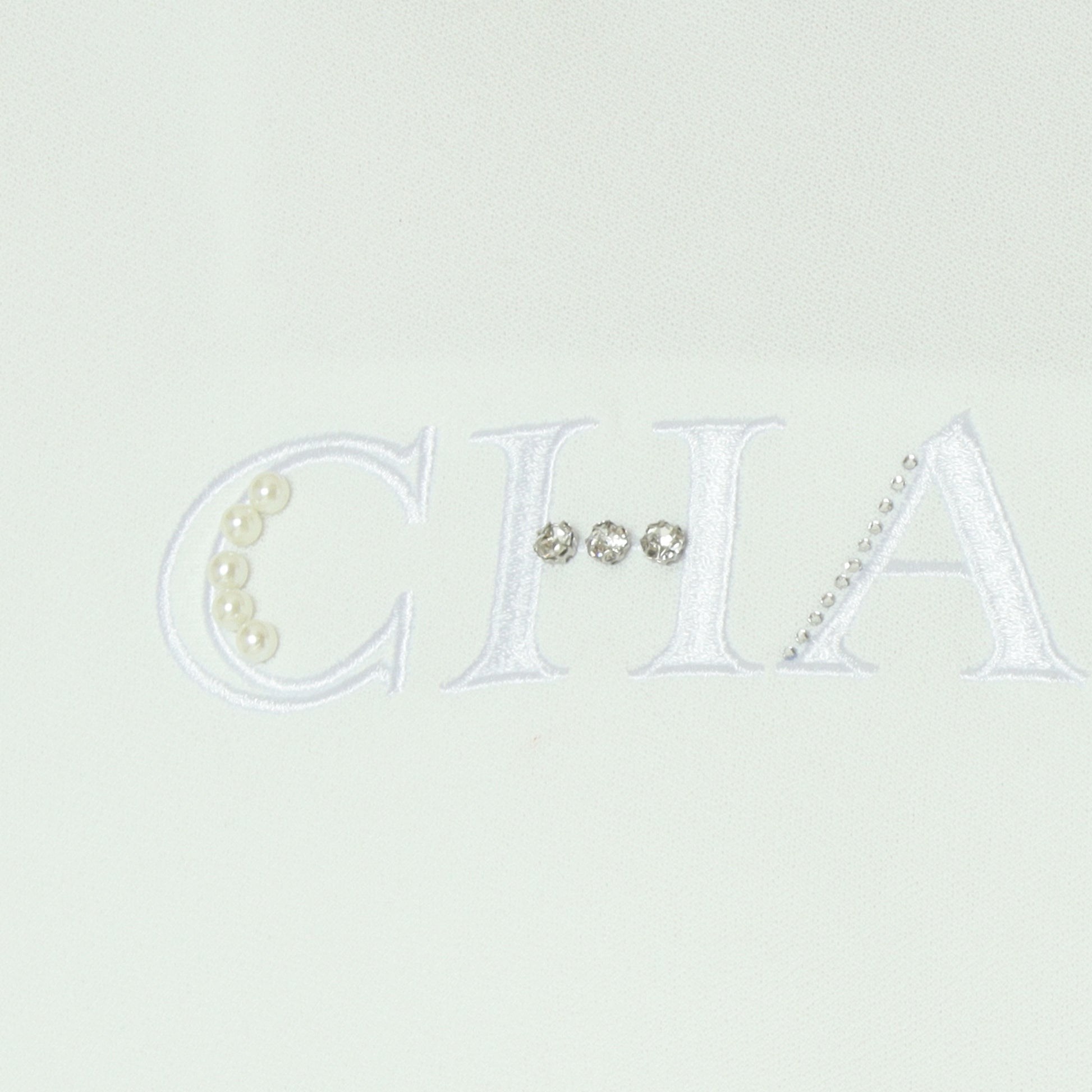 胸元に施したロゴは刺繍、パール、ラインストーン、ビジューそれぞれを用いた贅沢なデザインで、上品でエレガントな印象です◎