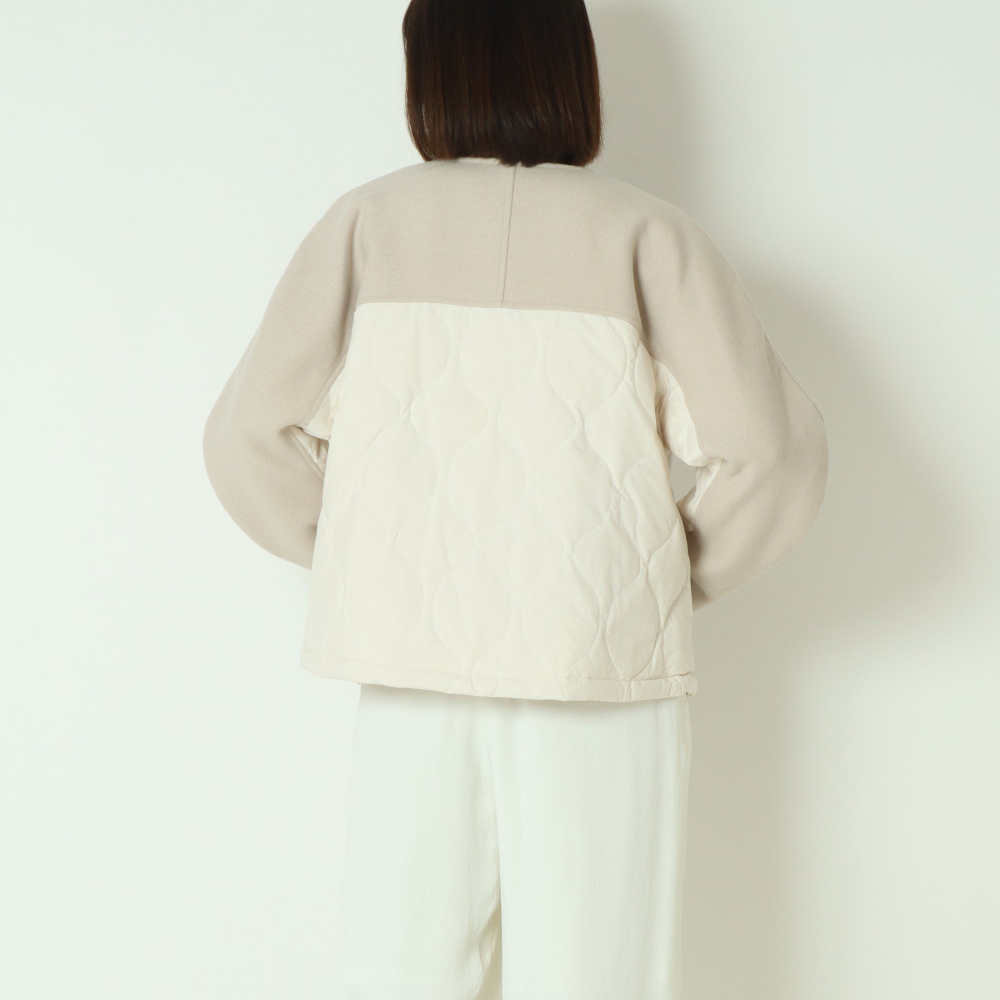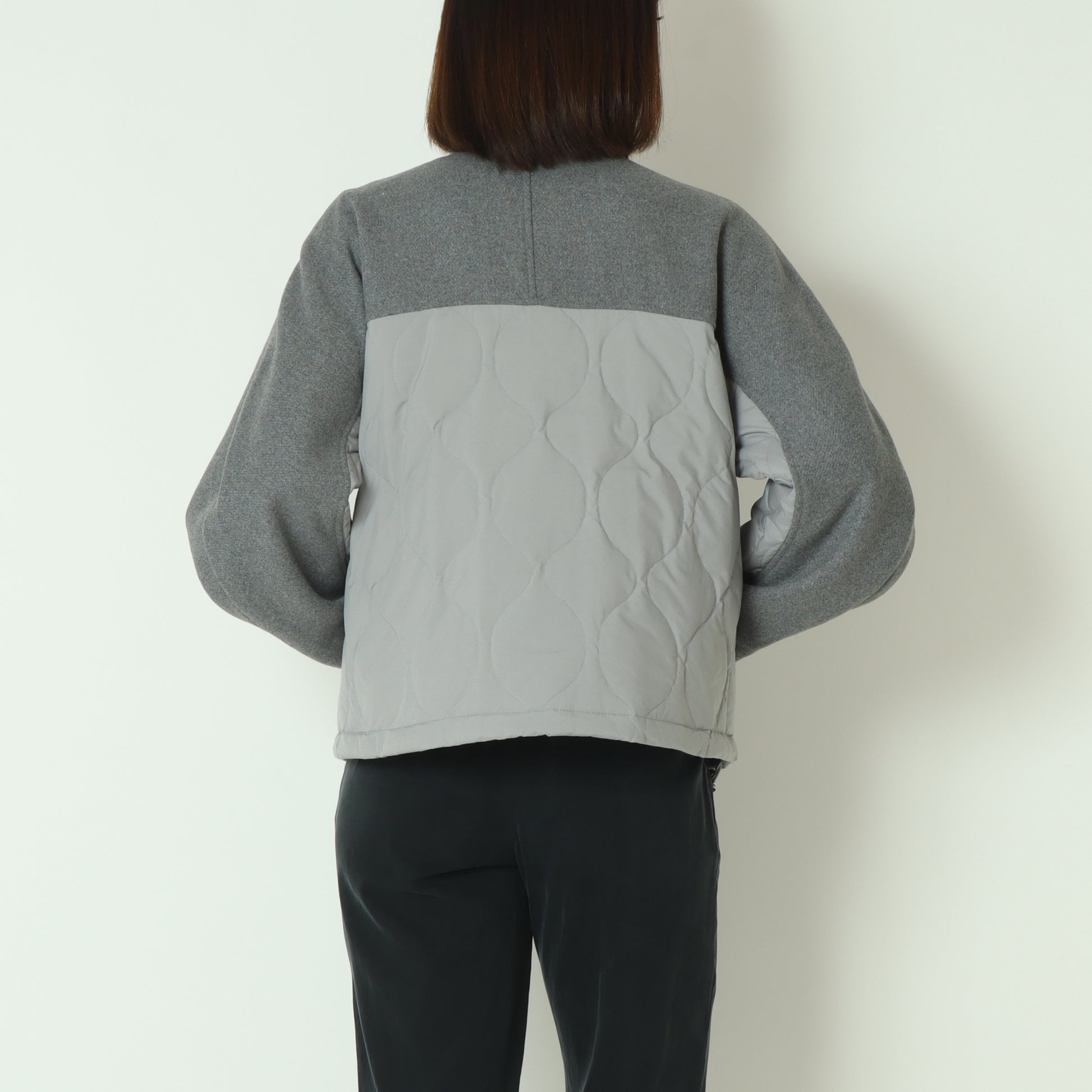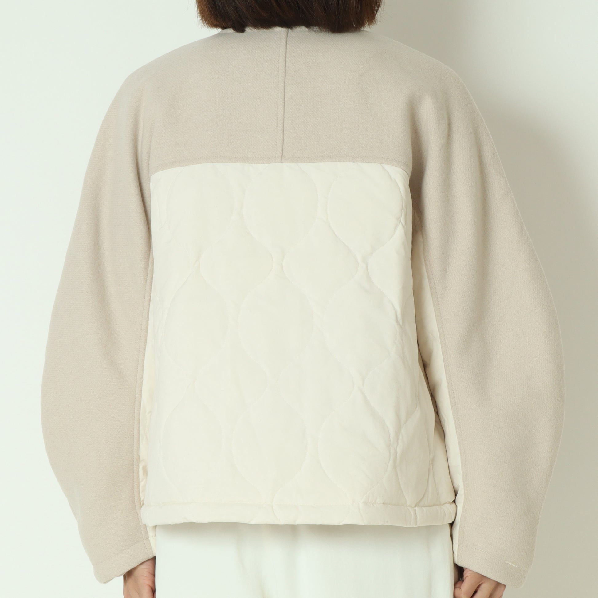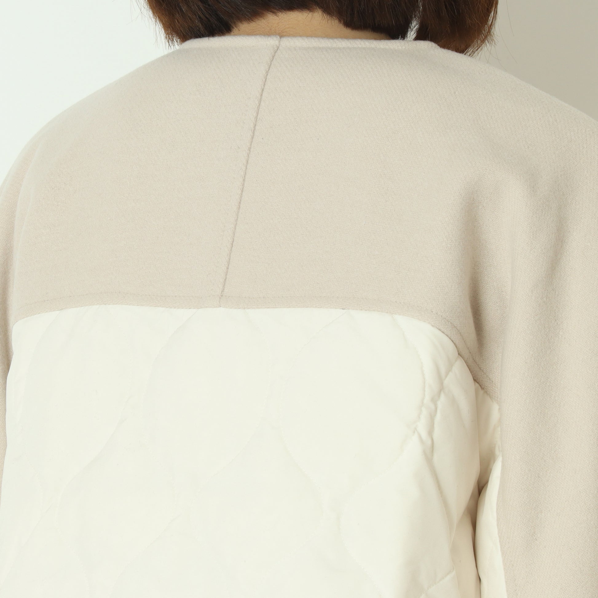 フロントがウール混素材バックはダウン素材のノーカラージャケット