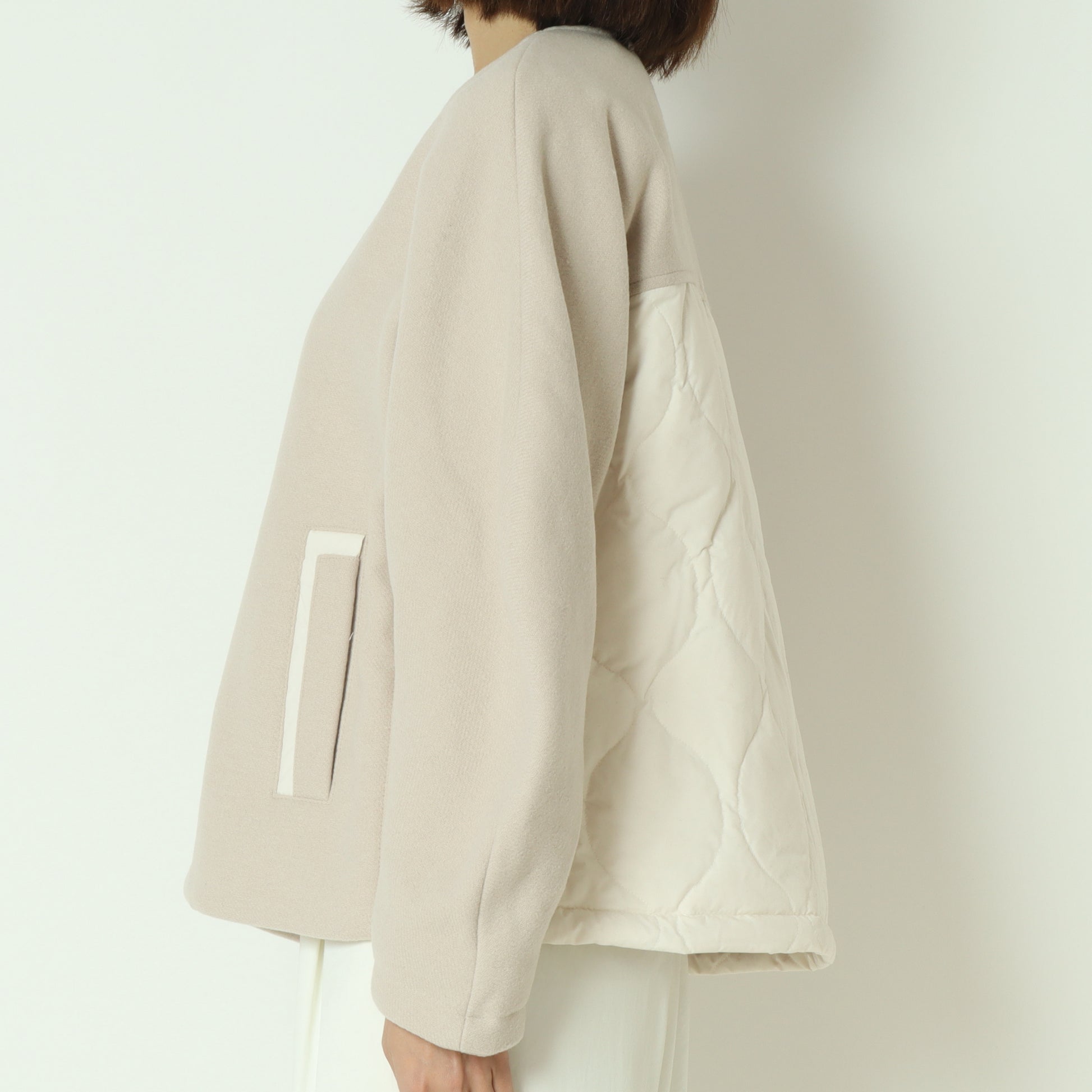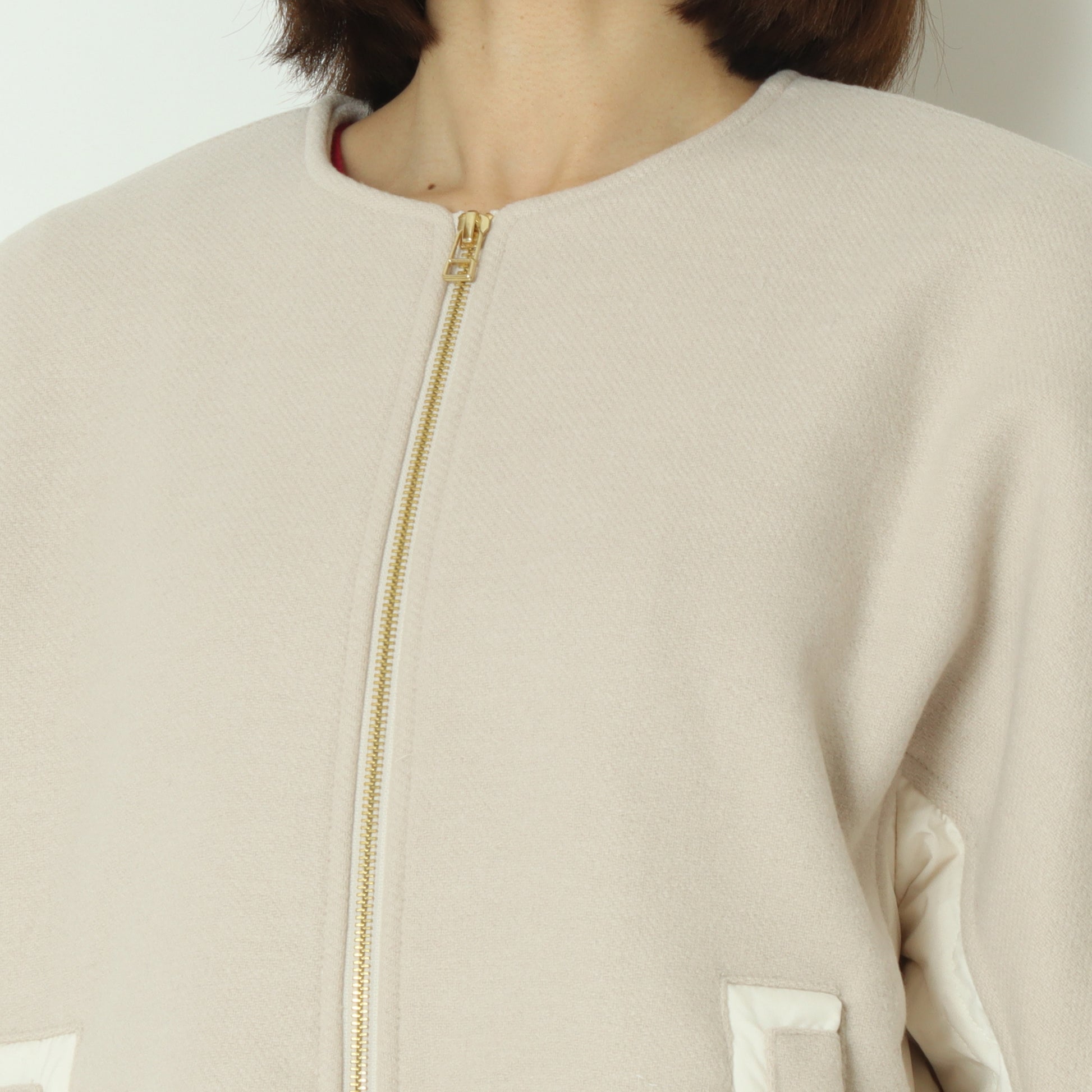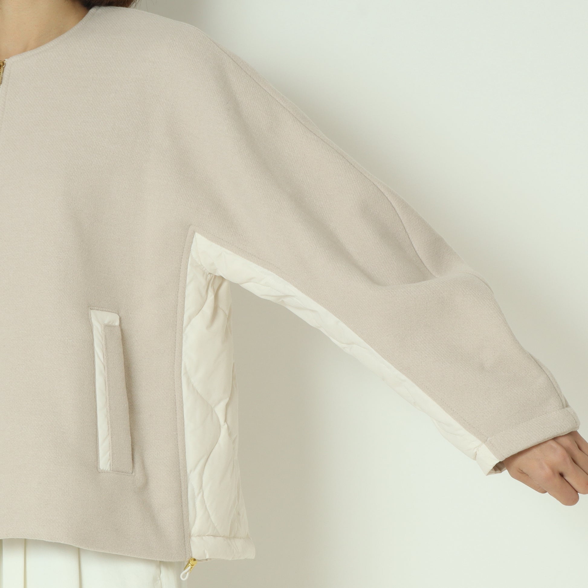 フロントがウール混素材バックはダウン素材のノーカラージャケット