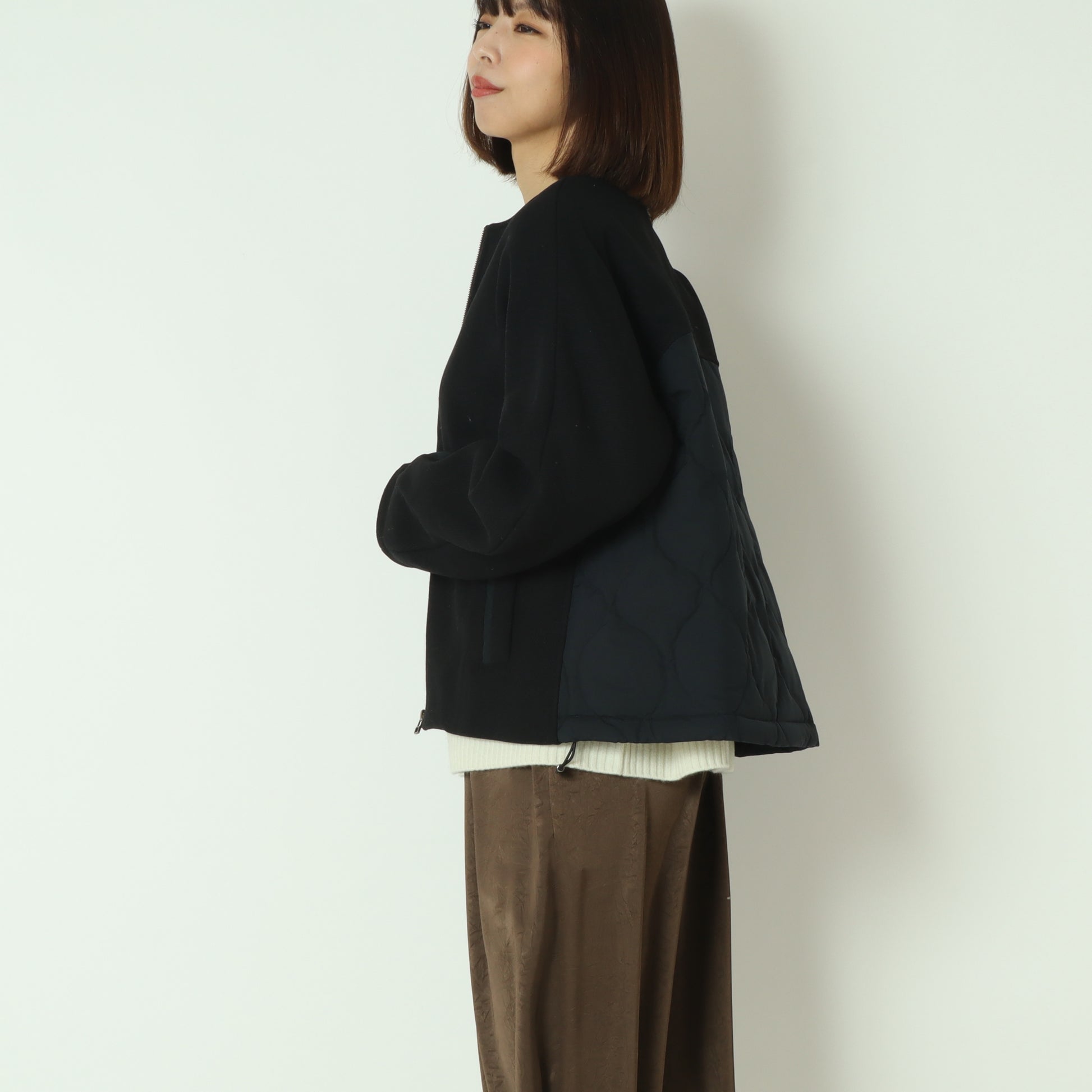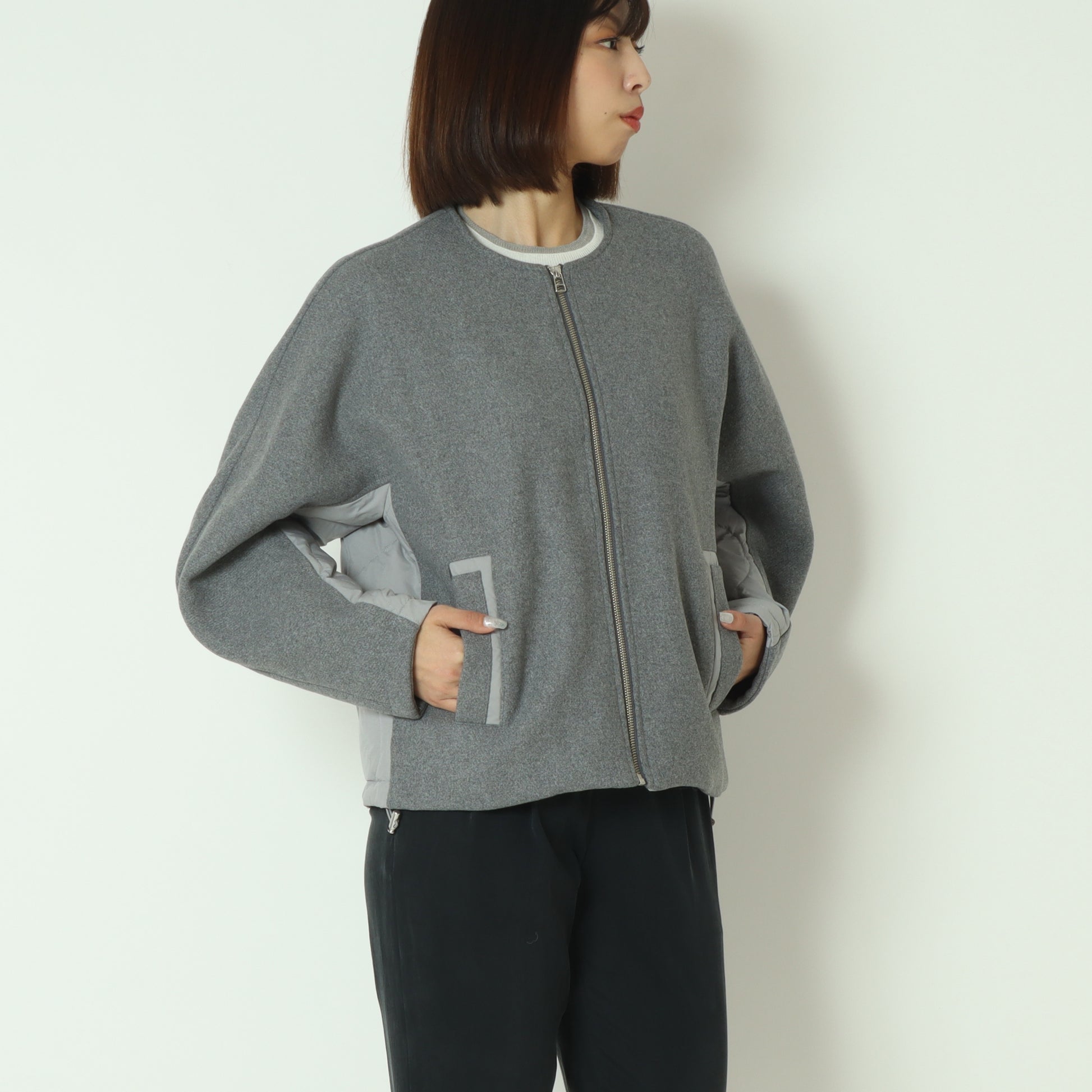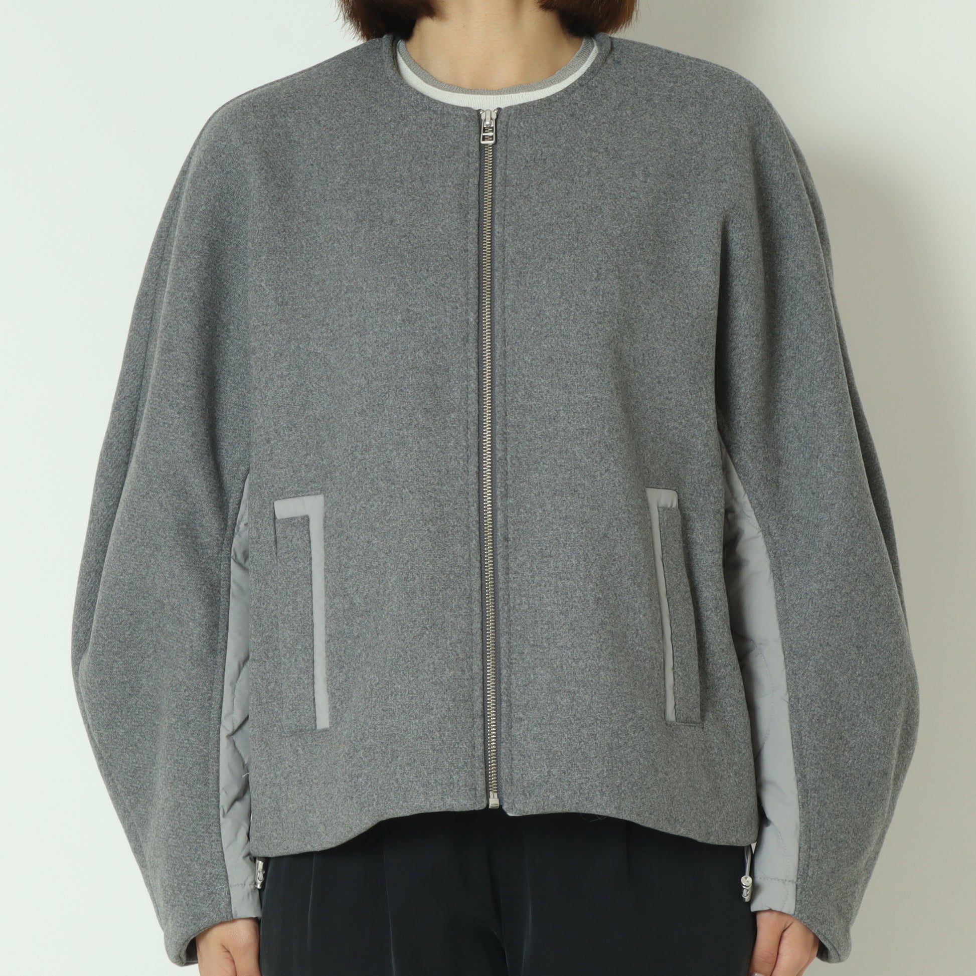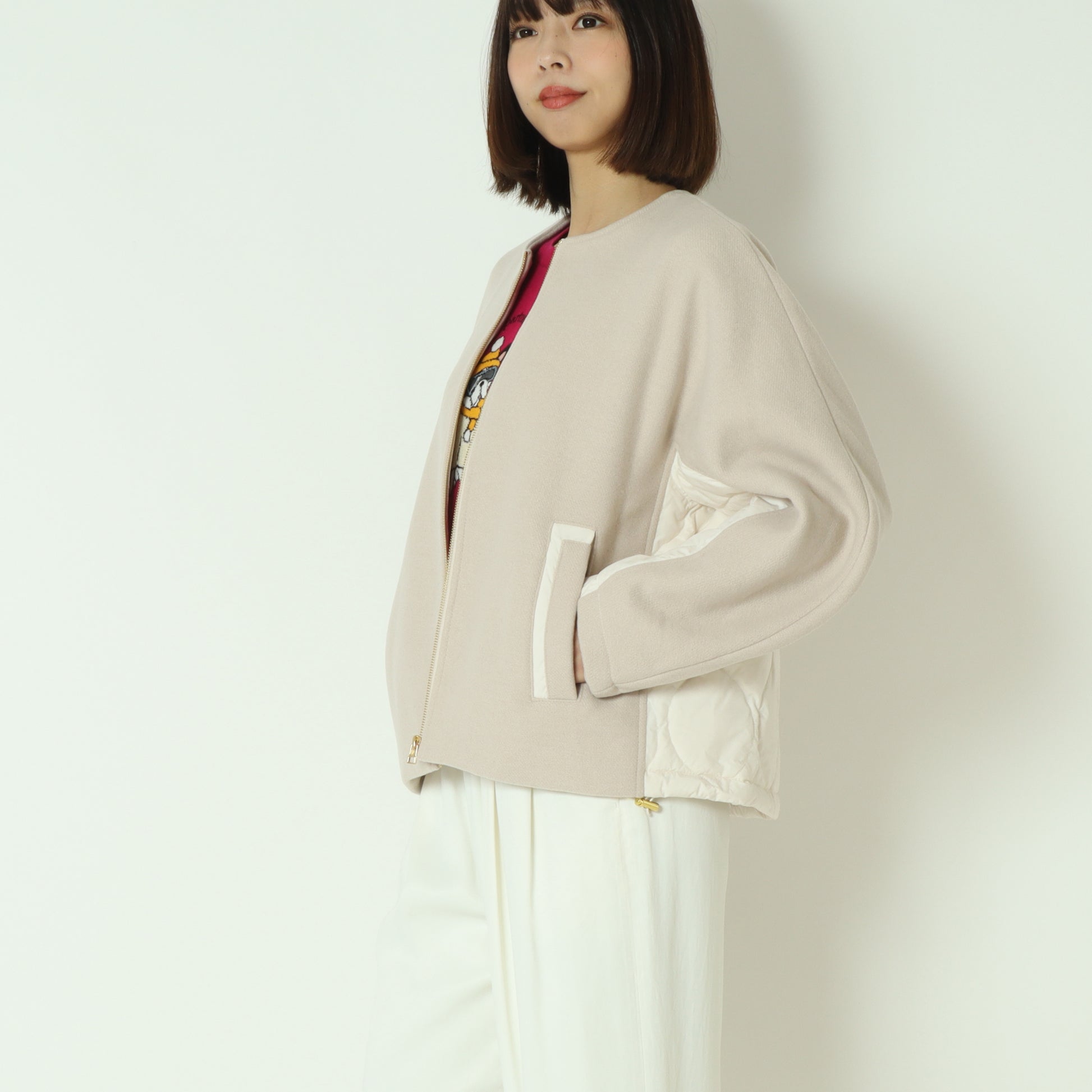 フロントがウール混素材バックはダウン素材のノーカラージャケット