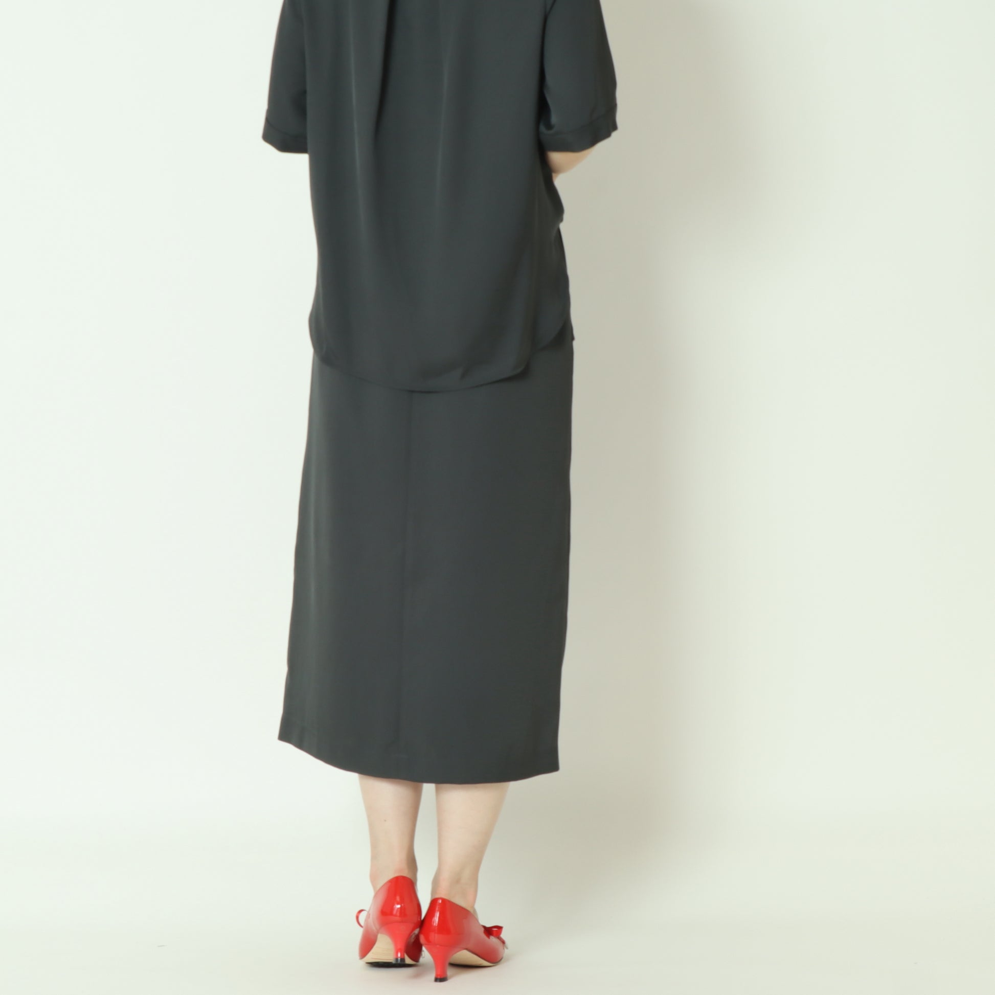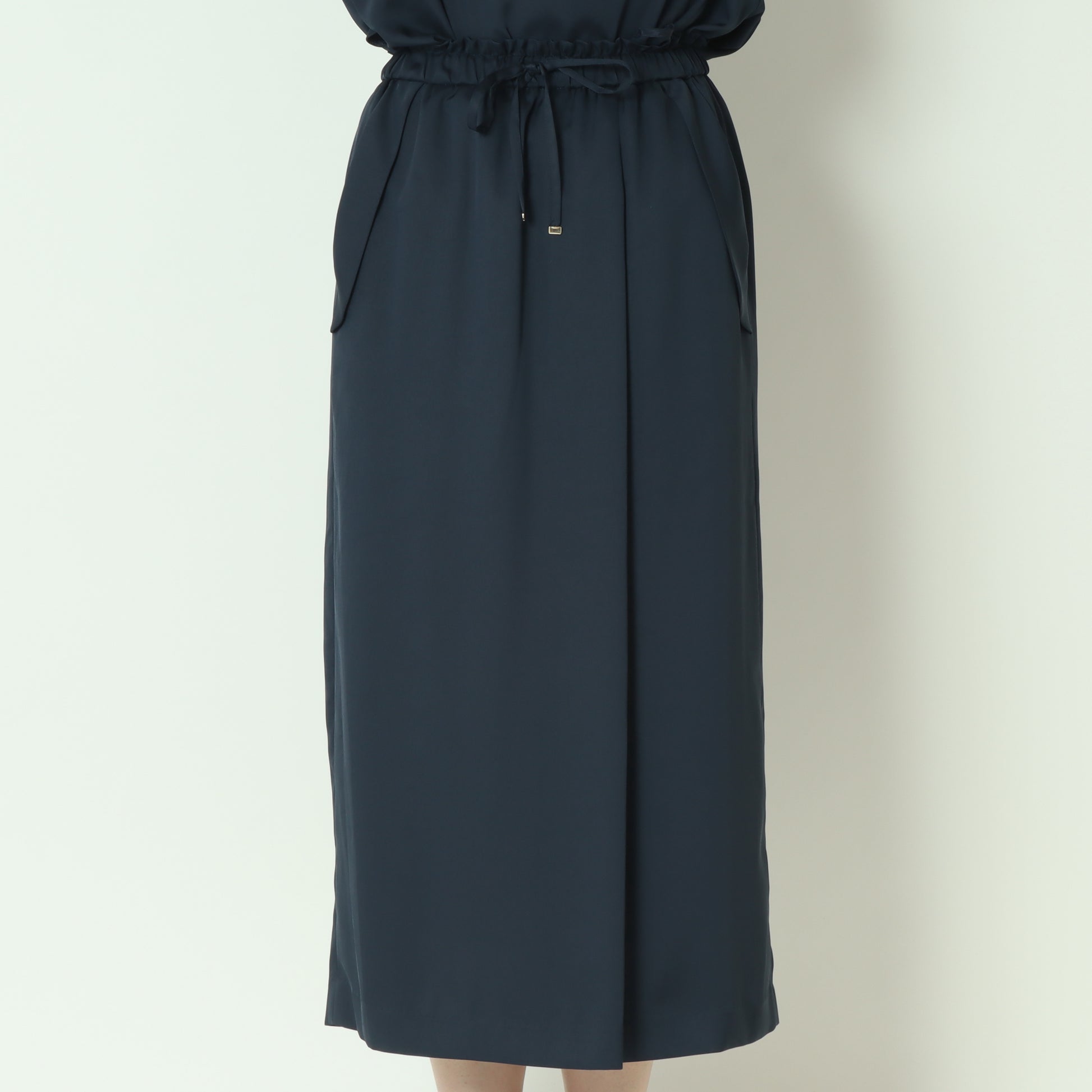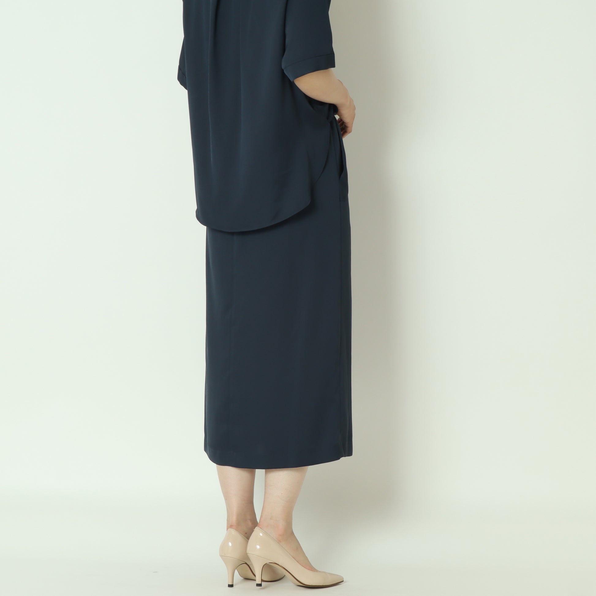 フロントの重ねたようなタックデザインとタイトなシルエットが大人っぽい上品な雰囲気を演出。
