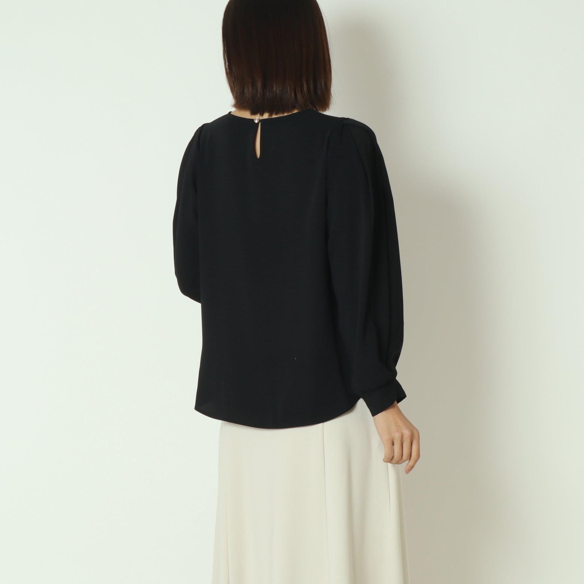 やや透け感のある切替を入れ、立体感を出したデザインの袖がコーディネートの主役になり、華やかで女性らしい雰囲気を演出します。