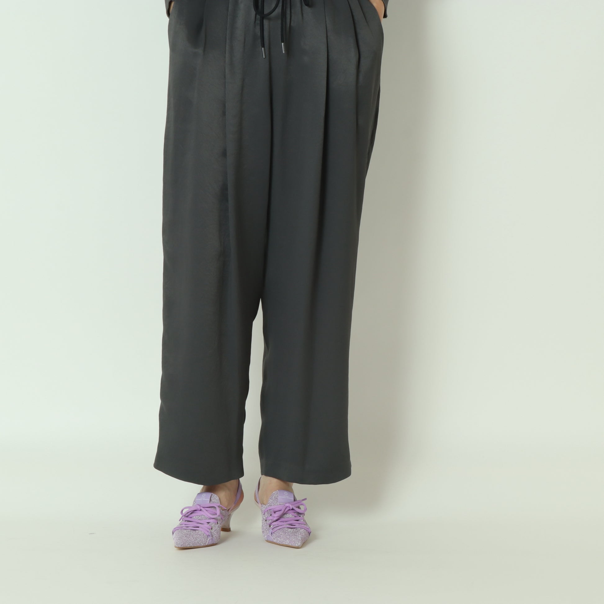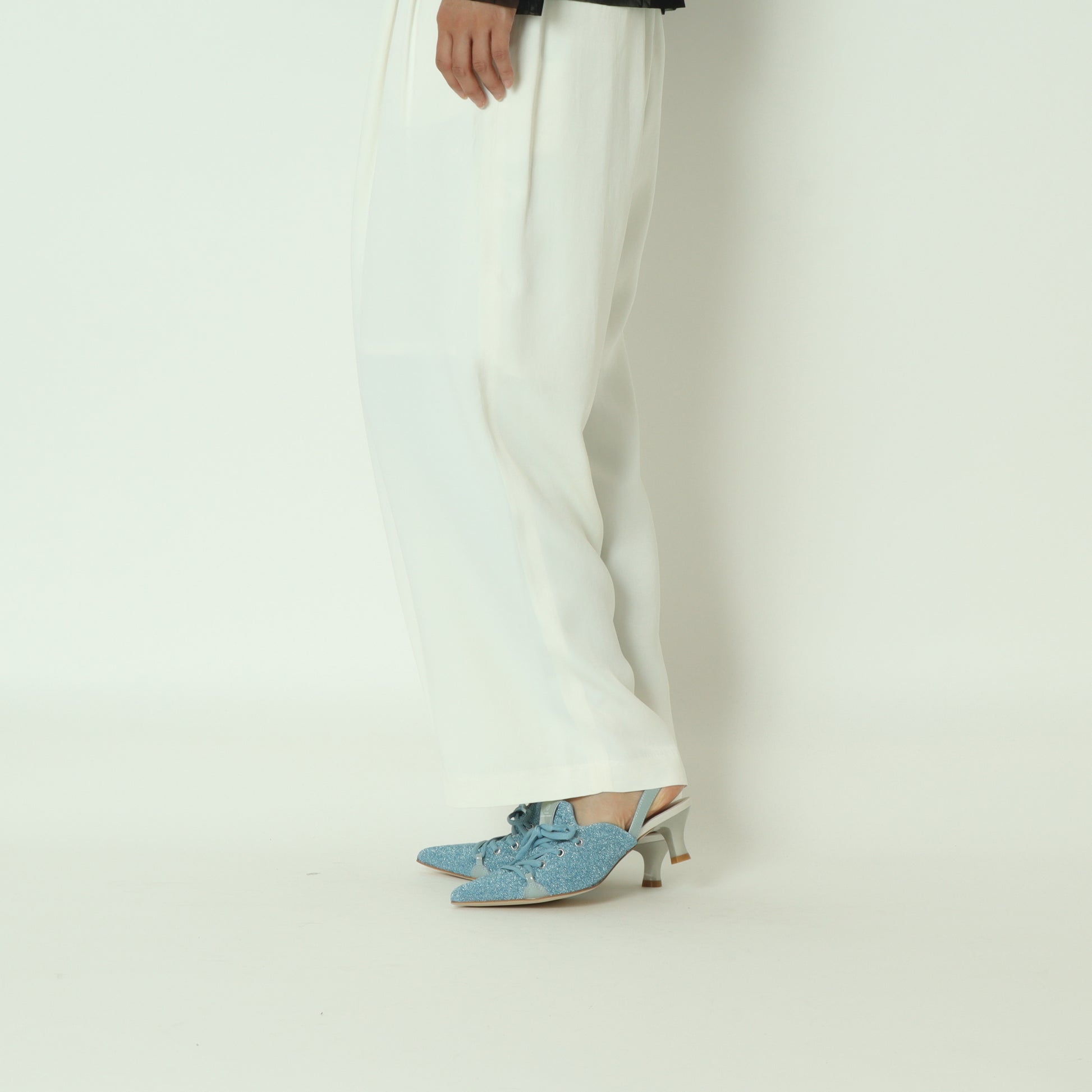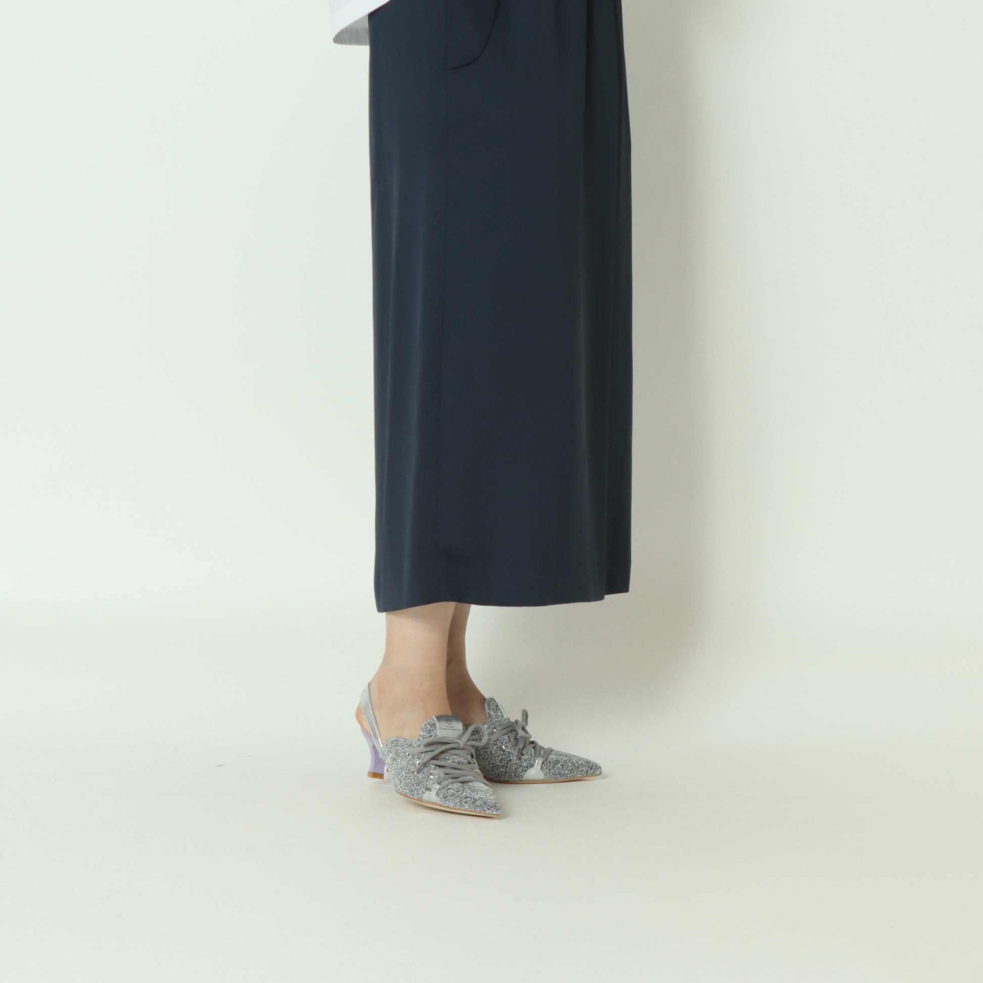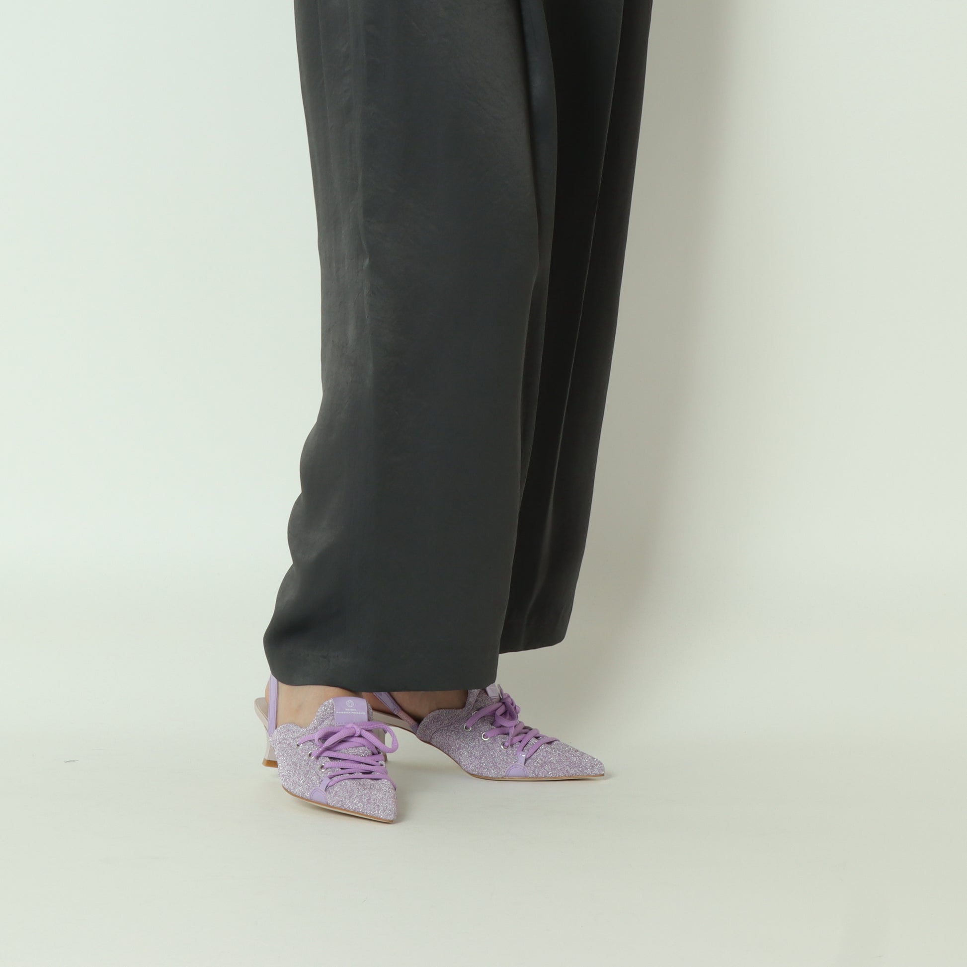 足元に華やかさを足すキラキラヤーンとカジュアルライクなレースアップデザインが目を引く一足。