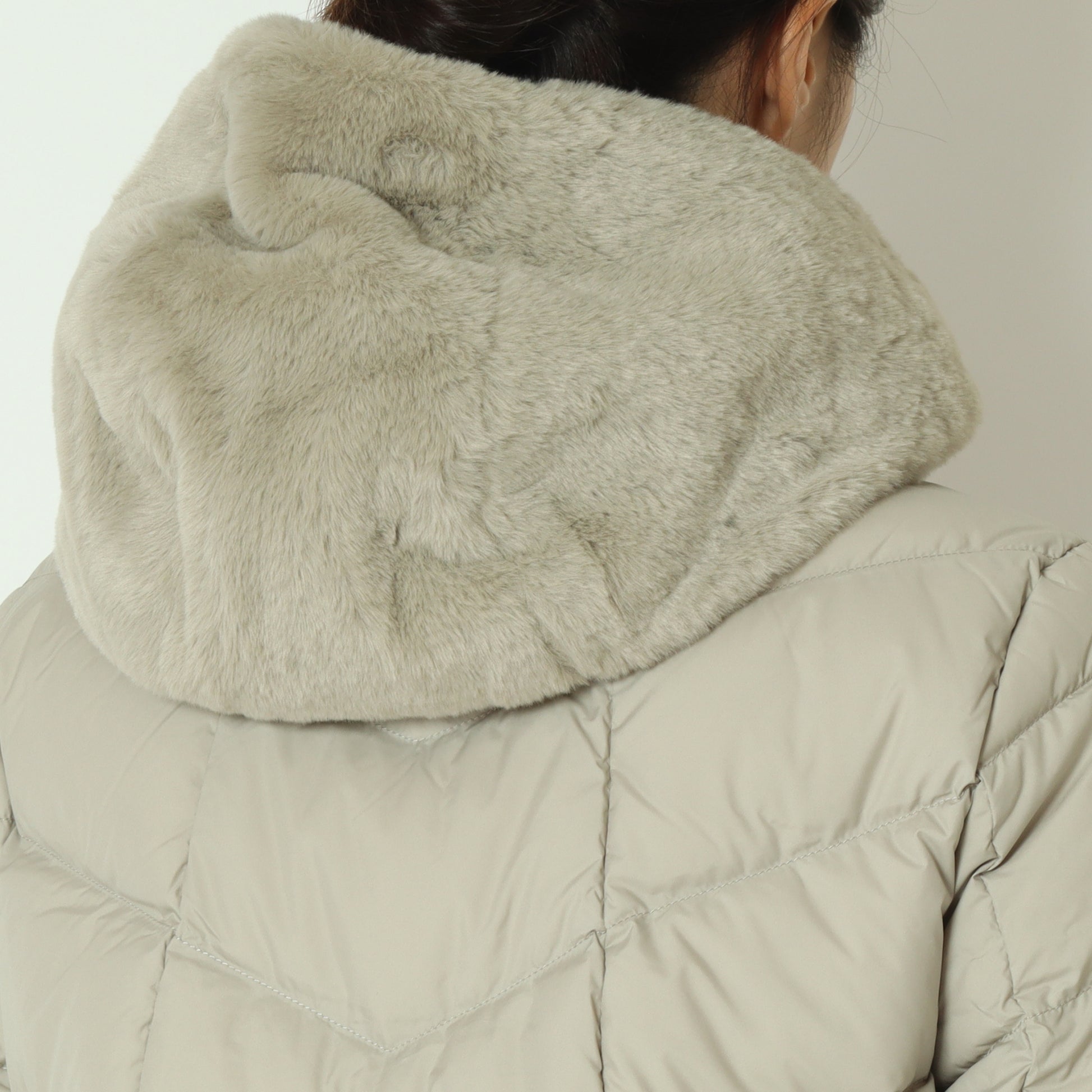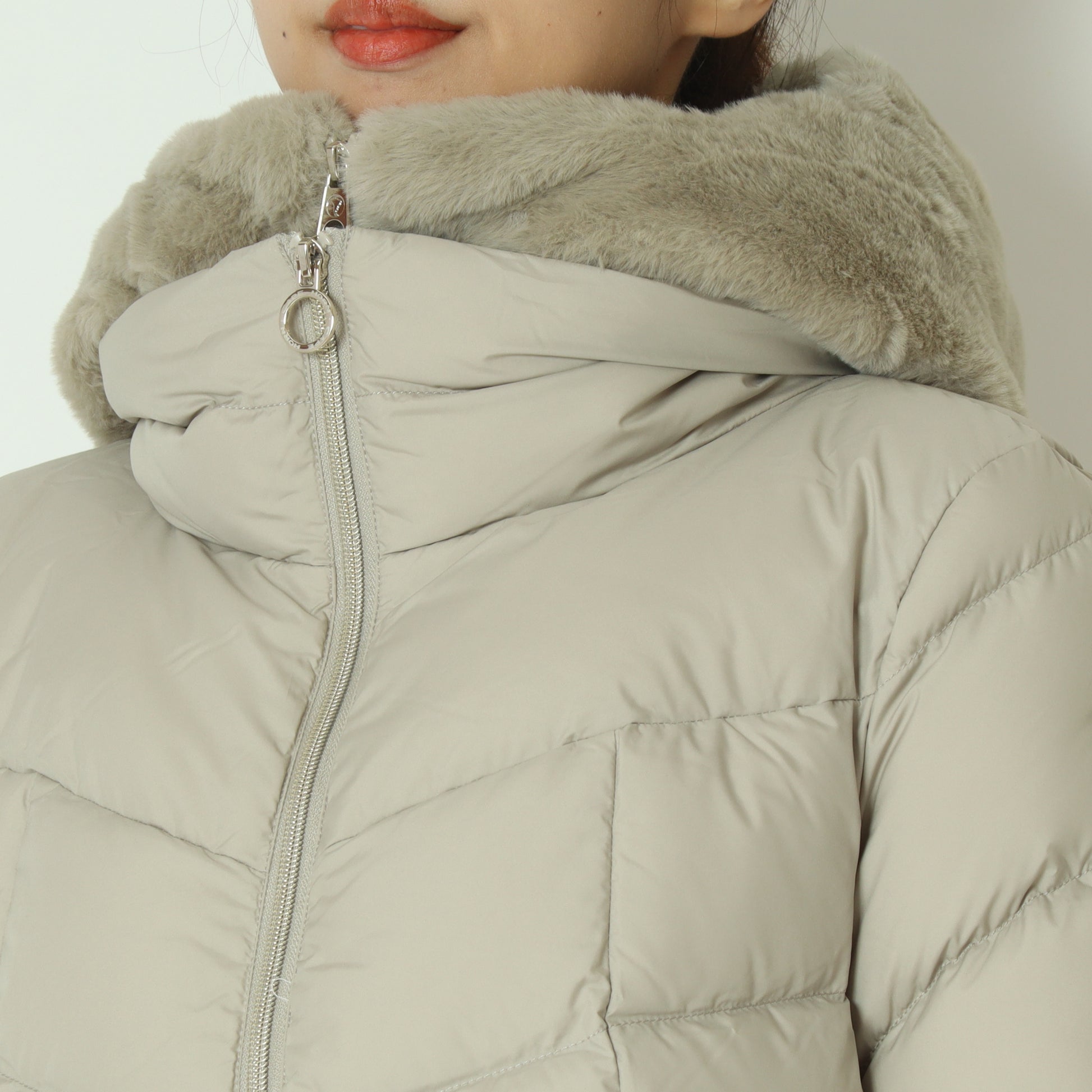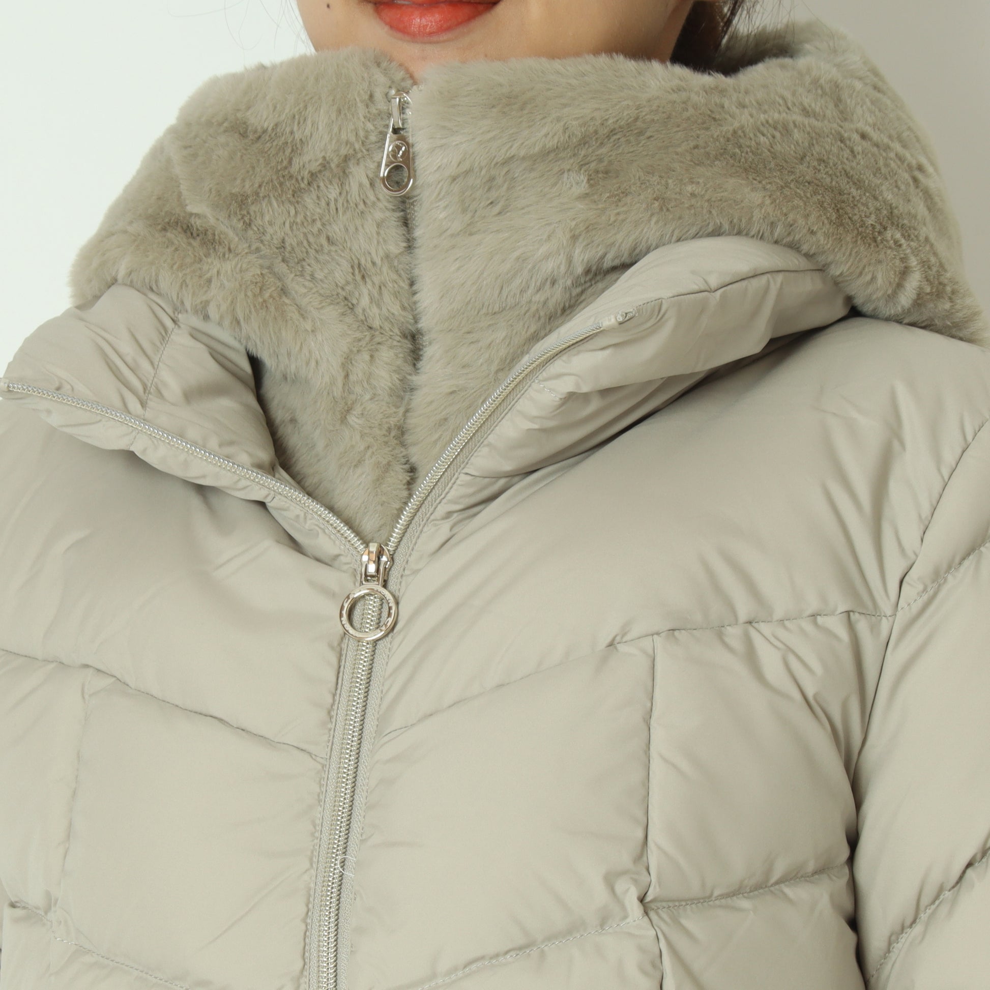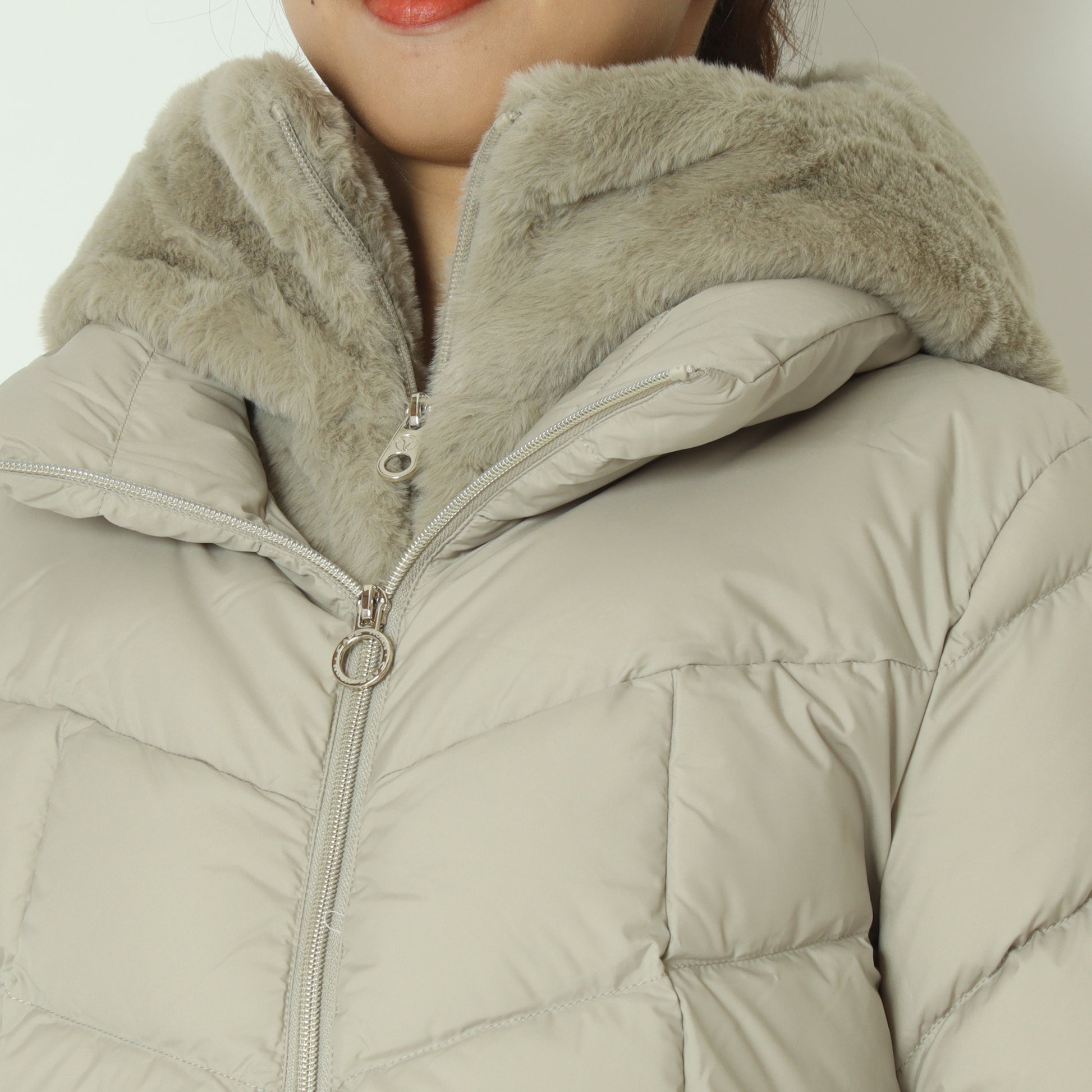 フードとフェイクファーのビブは取り外し可能で、シーンやお好みに合わせてアレンジできます。中央のダブルスライダーコイルジッパーにはカスタムプラーが付いており、スタイリッシュさと機能性を両立しています。