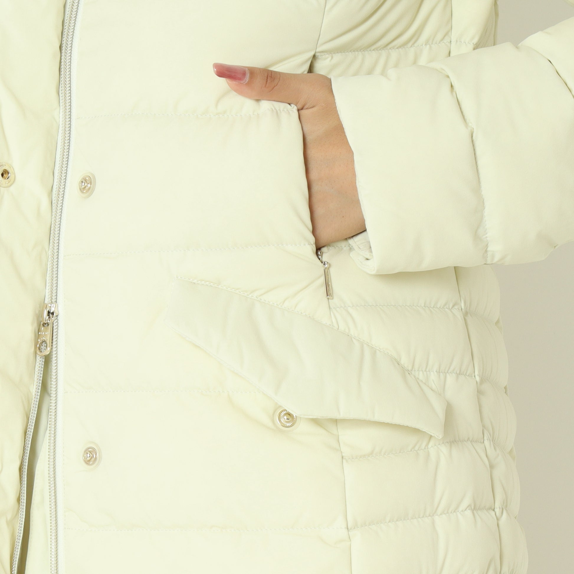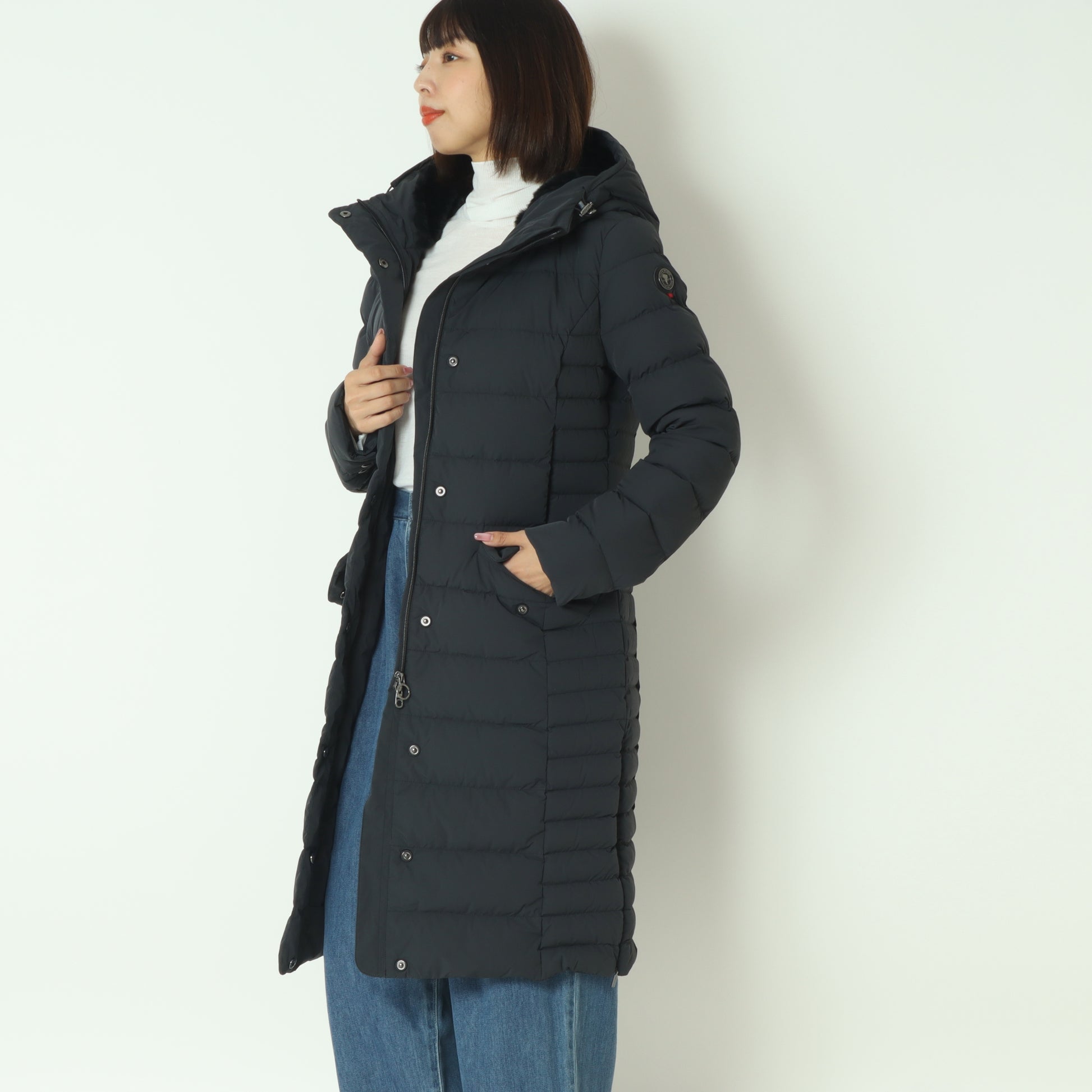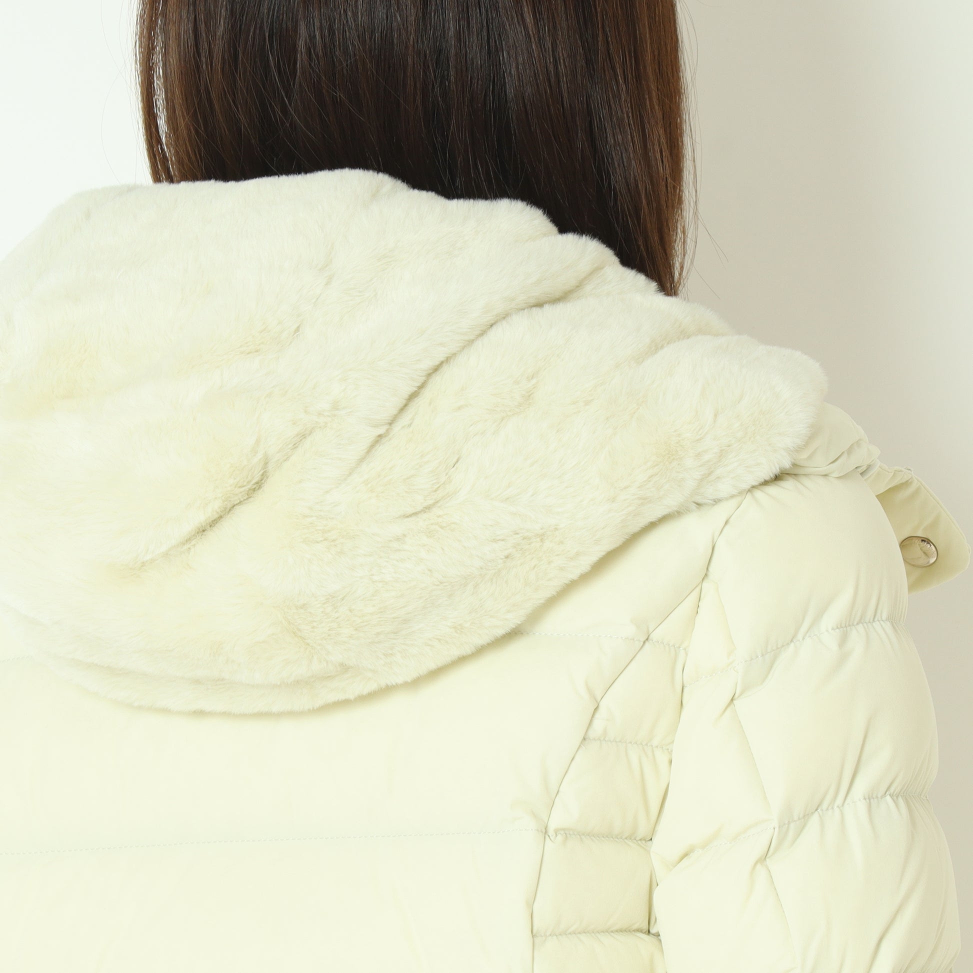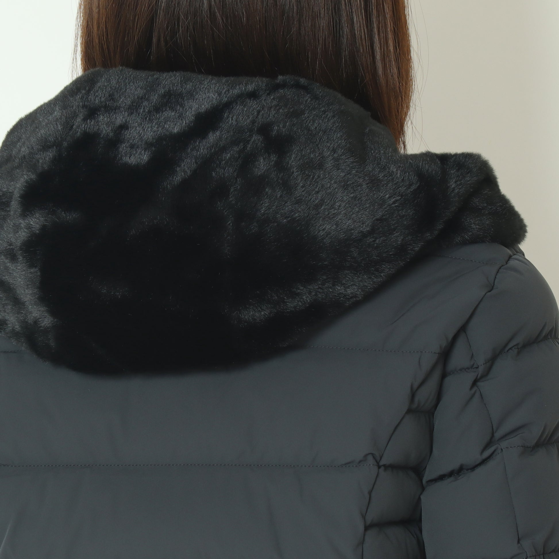 フードのエコファーと袖口のカフが上品なアクセントです。
