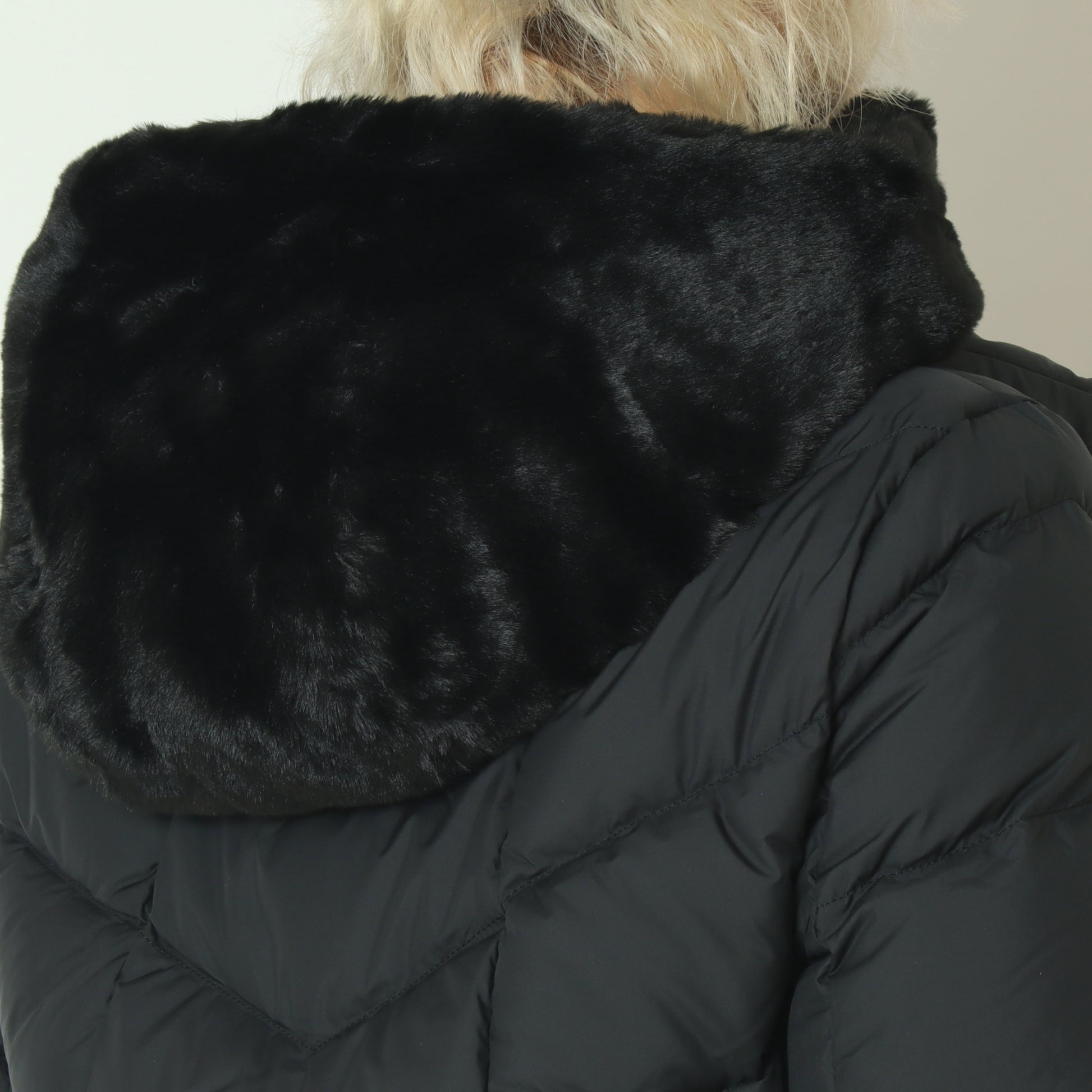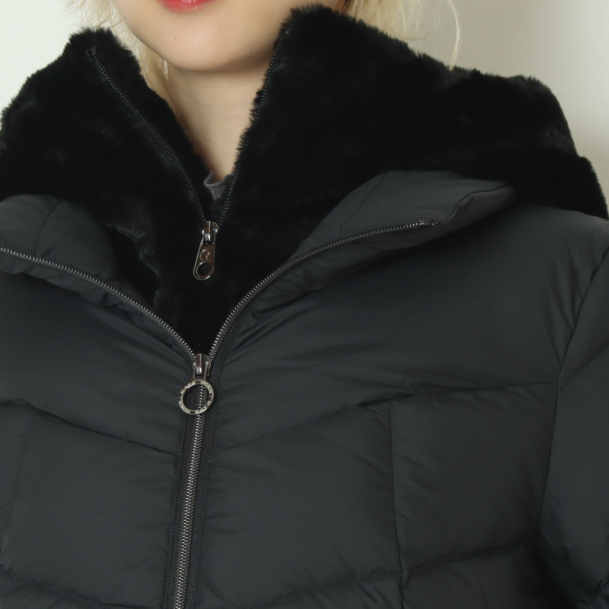 フードとフェイクファーのビブは取り外し可能で、シーンやお好みに合わせてアレンジできます。中央のダブルスライダーコイルジッパーにはカスタムプラーが付いており、スタイリッシュさと機能性を両立しています。