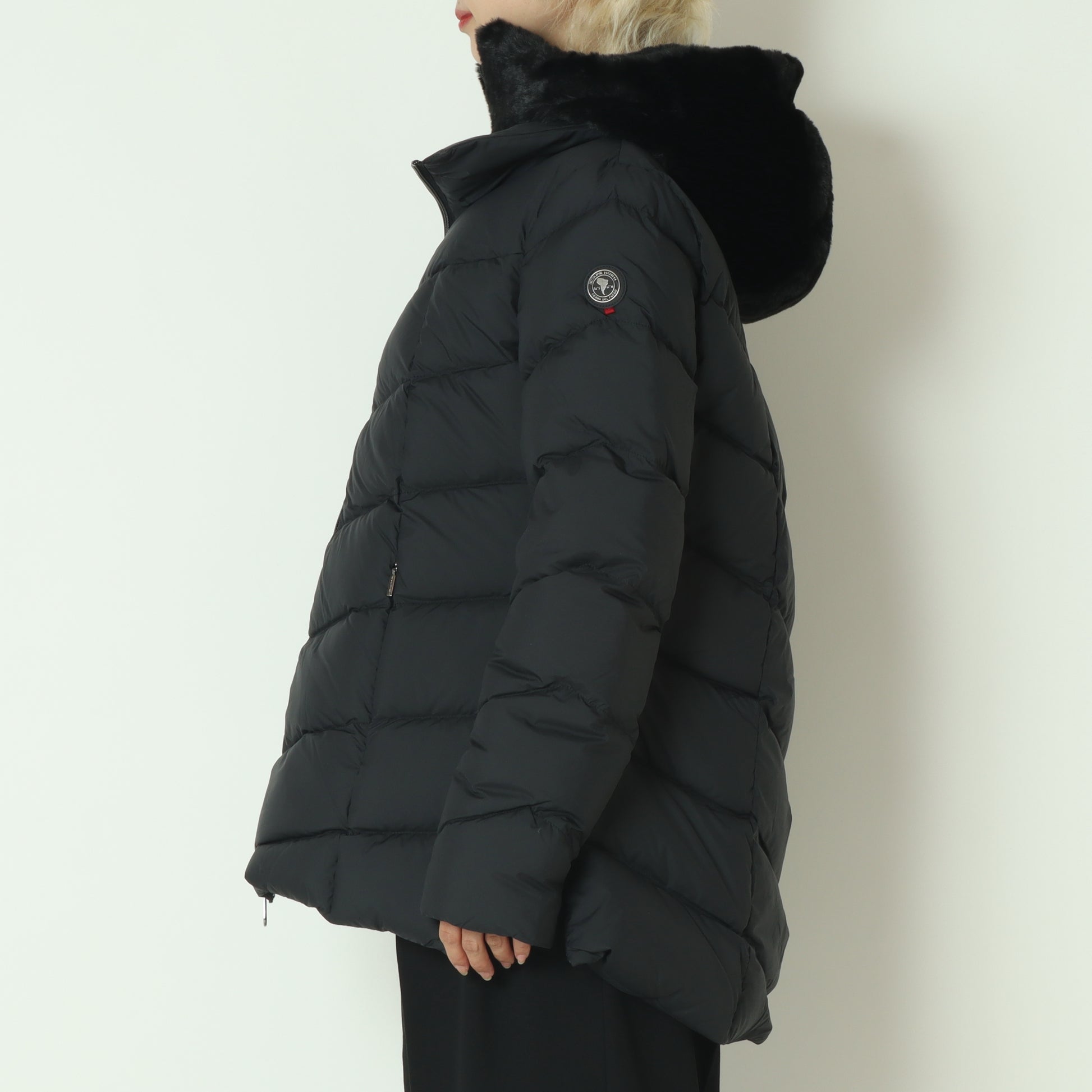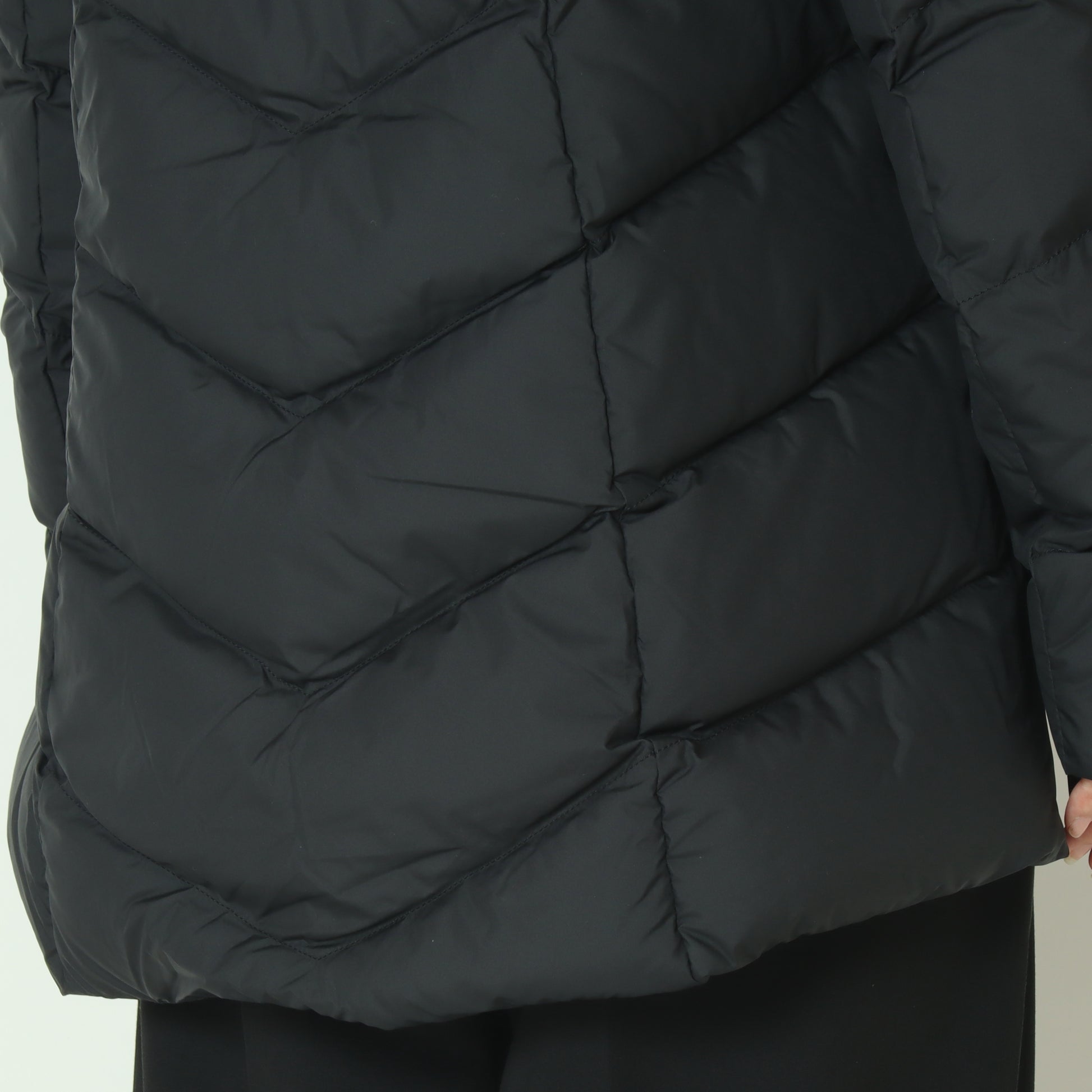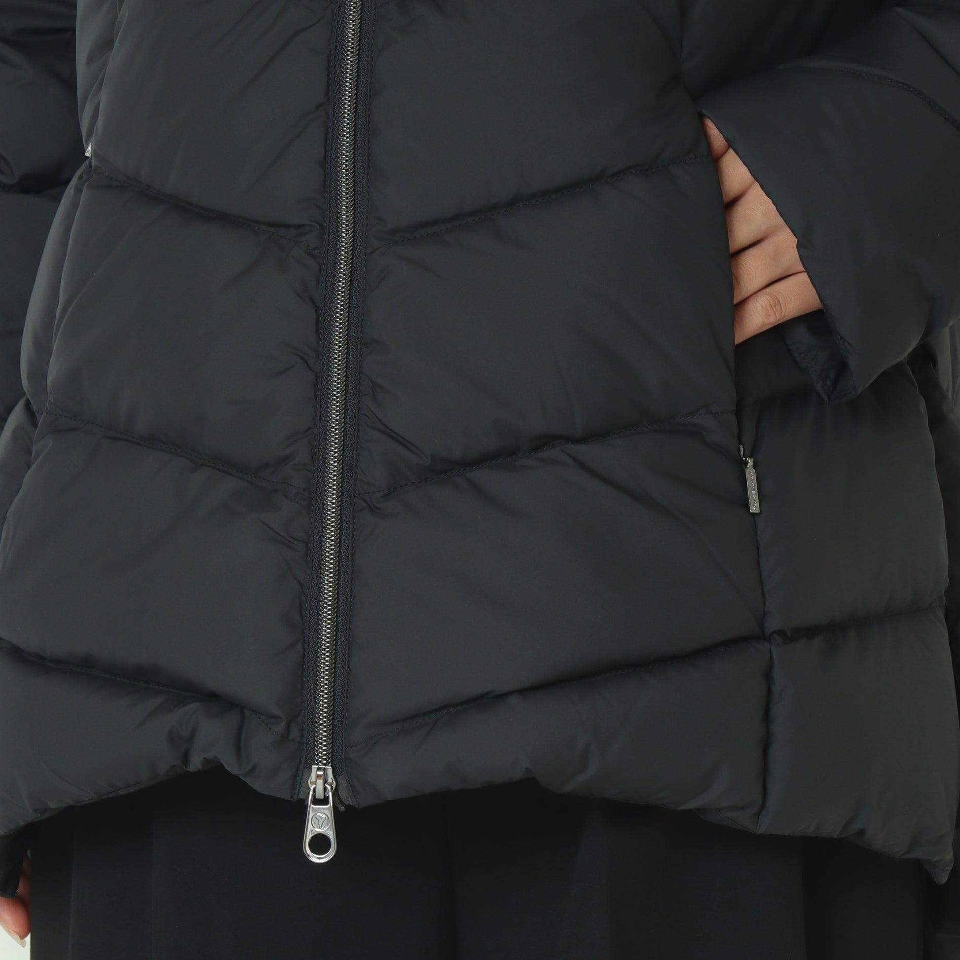 漆黒のボディに調和するガンメタルブラックの質感は、光を抑えた落ち着きがあり、ダウン本来のシルエットや素材感を一層引き立てます。