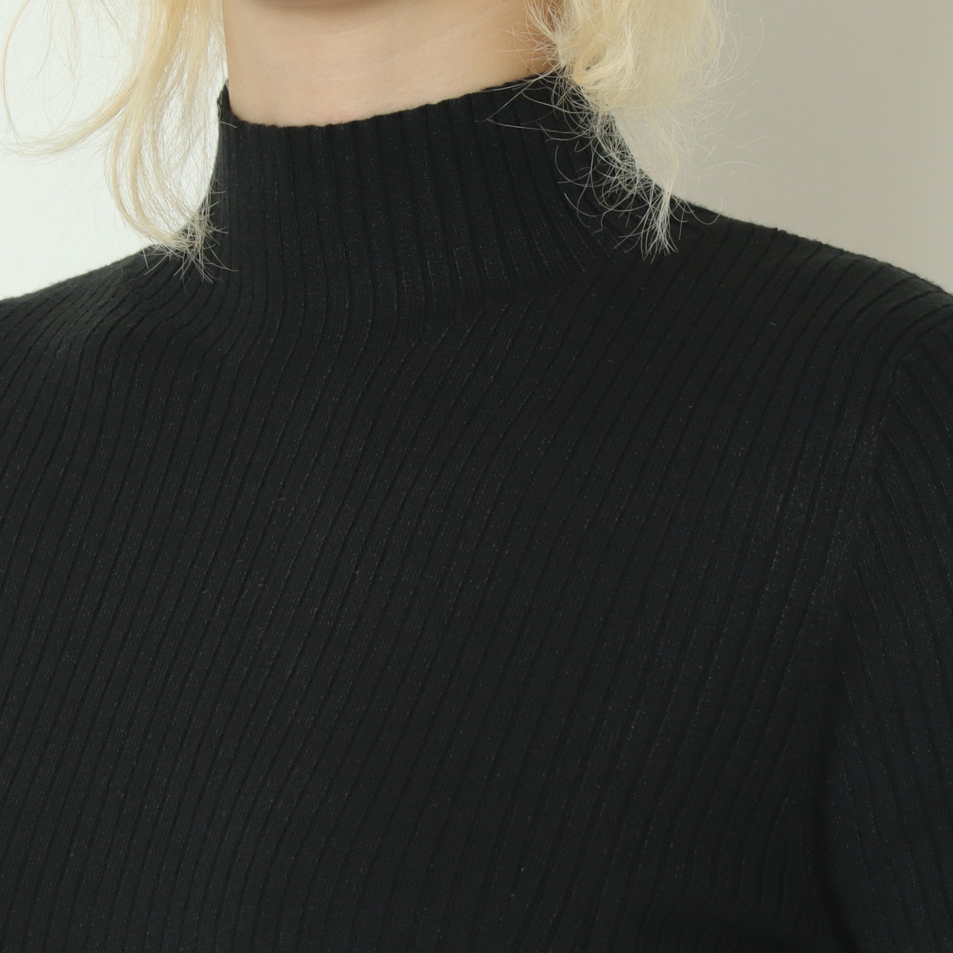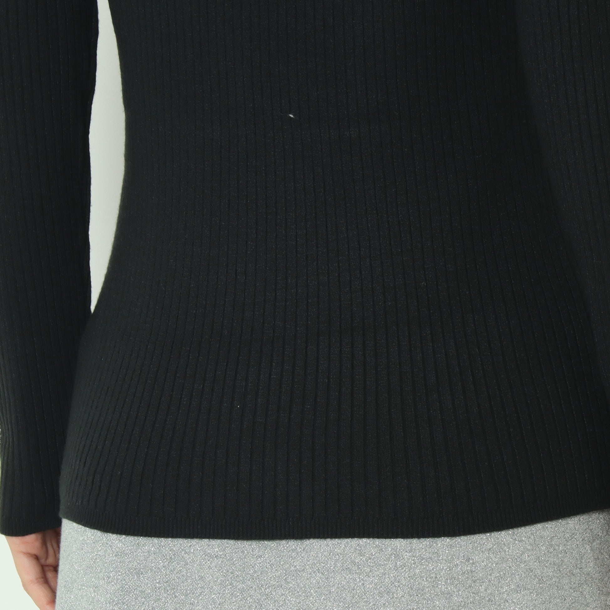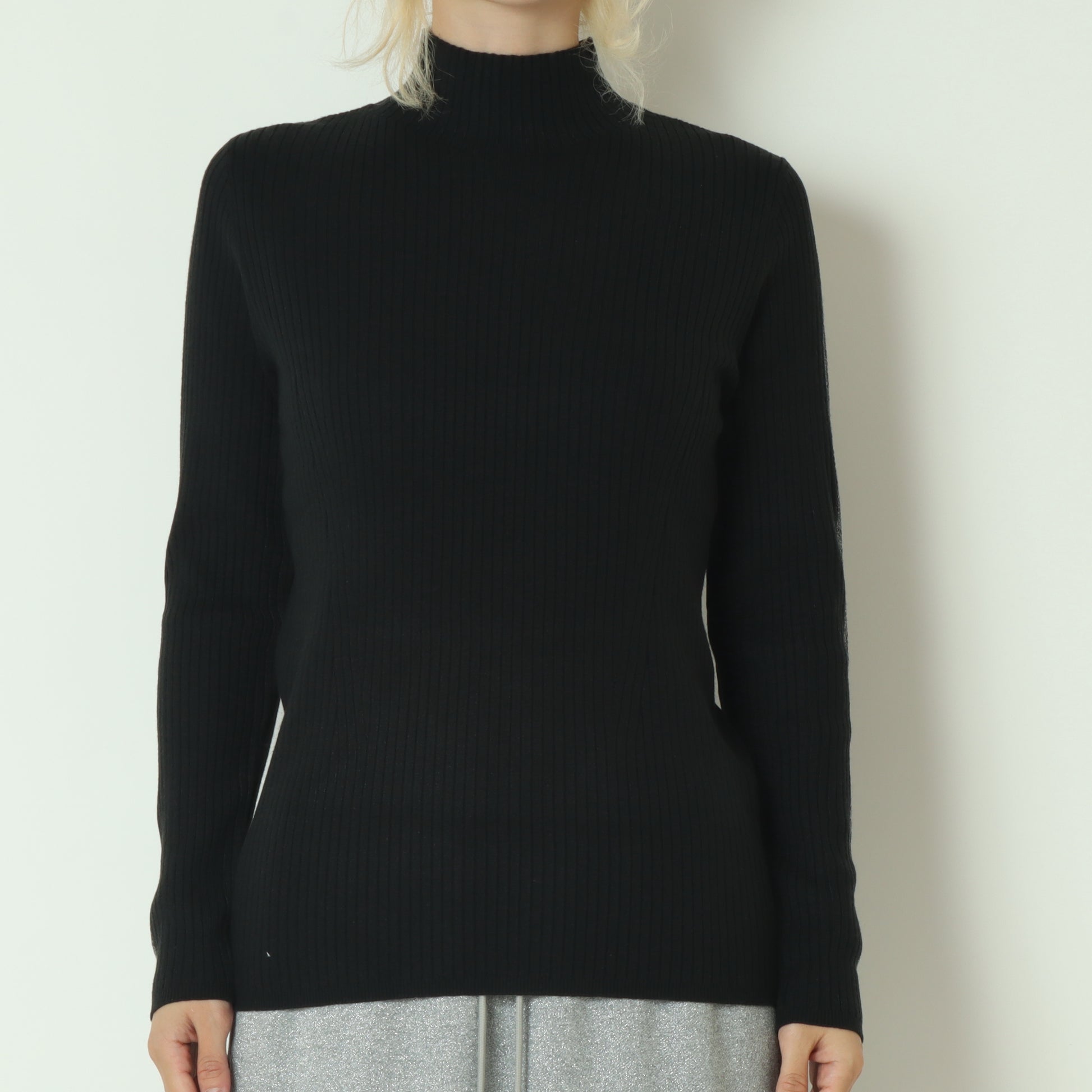 ハイネックの襟元はジレなどとのレイヤードで相性が良く、