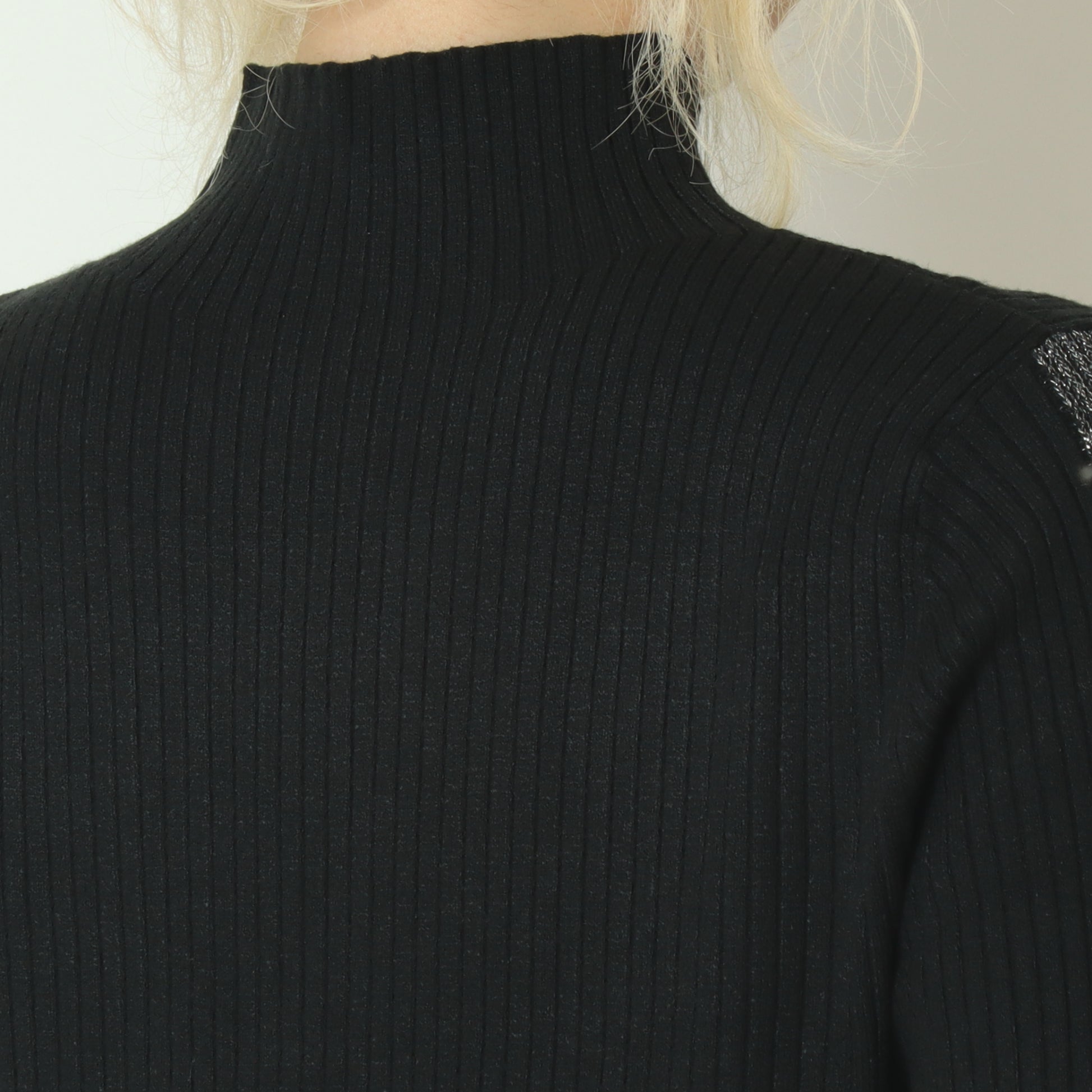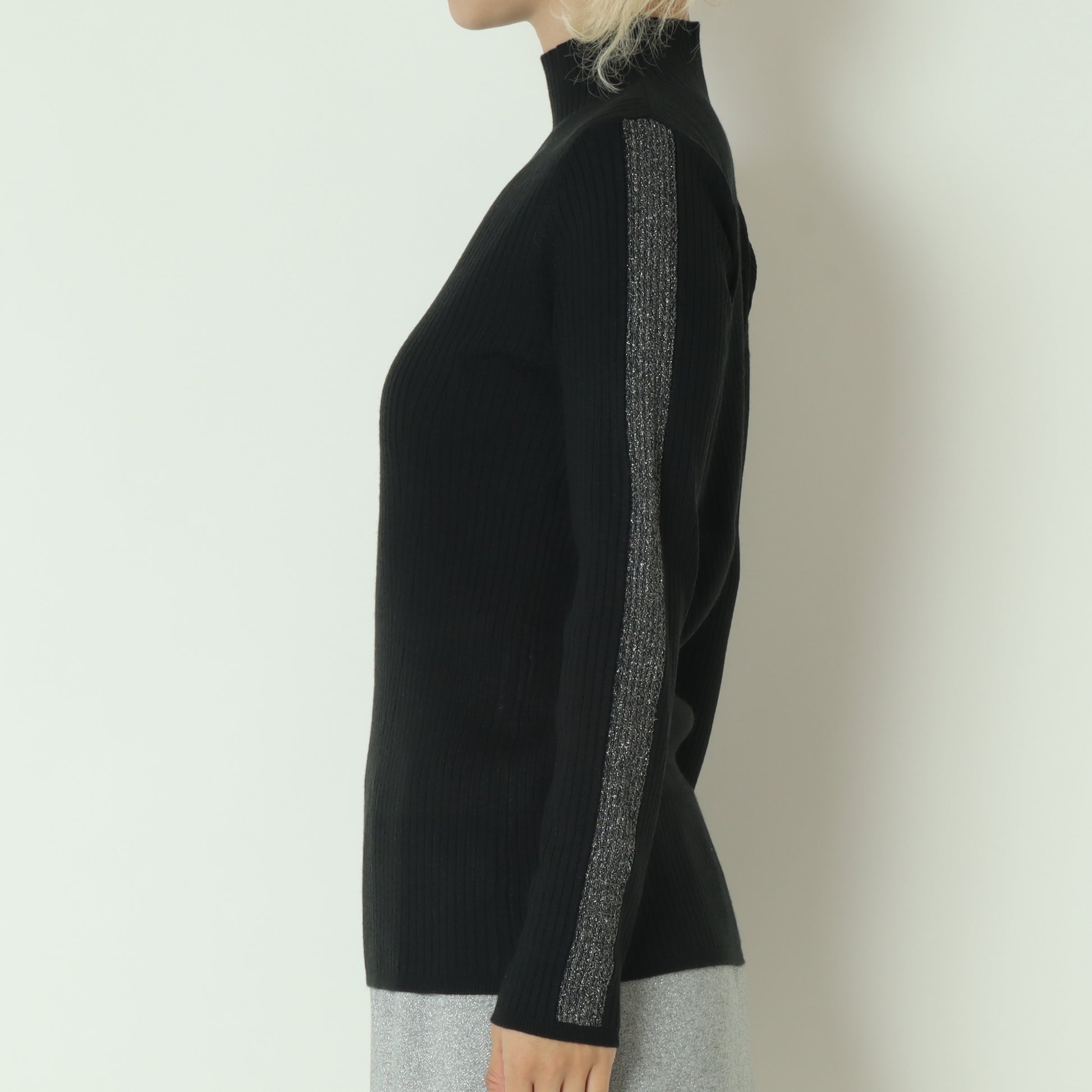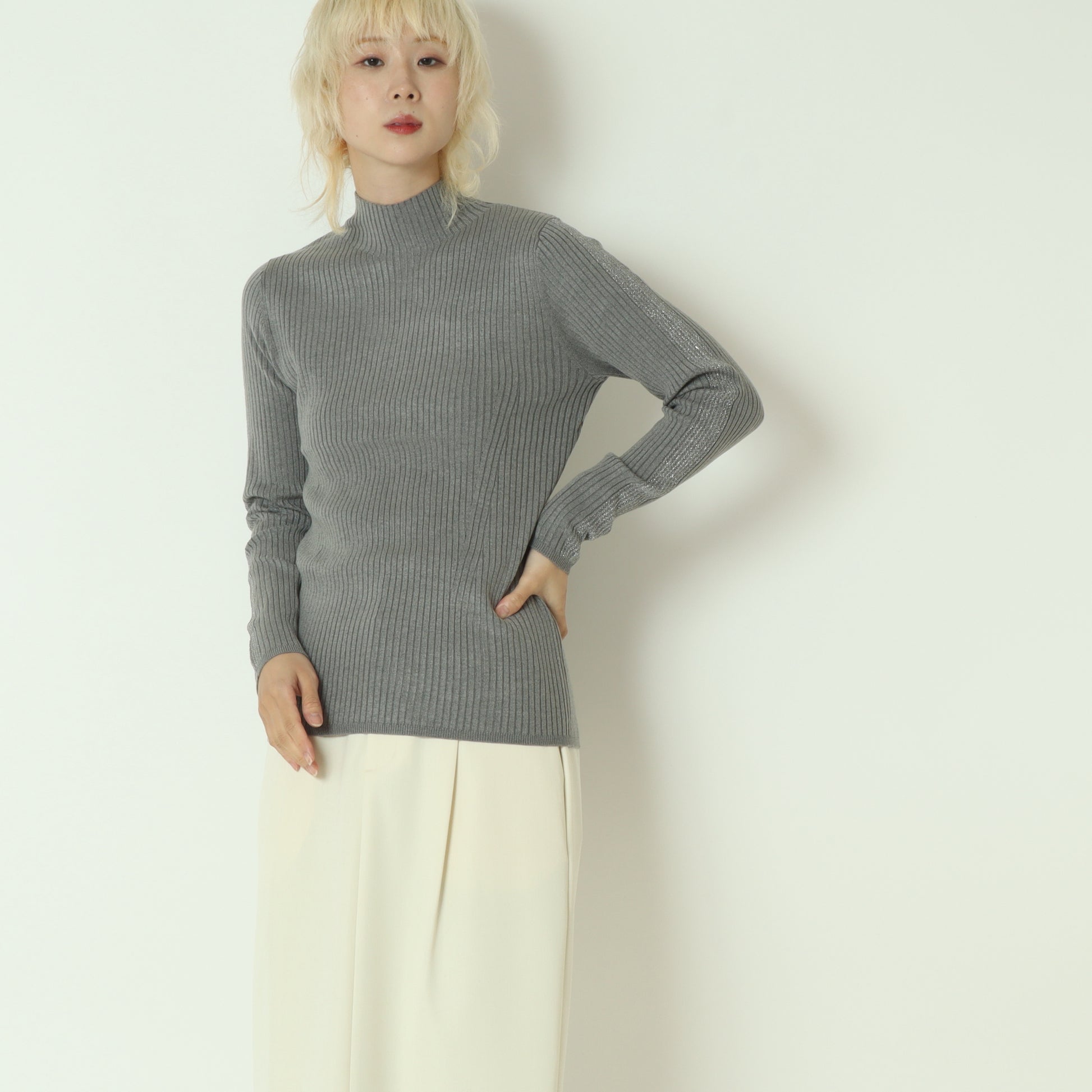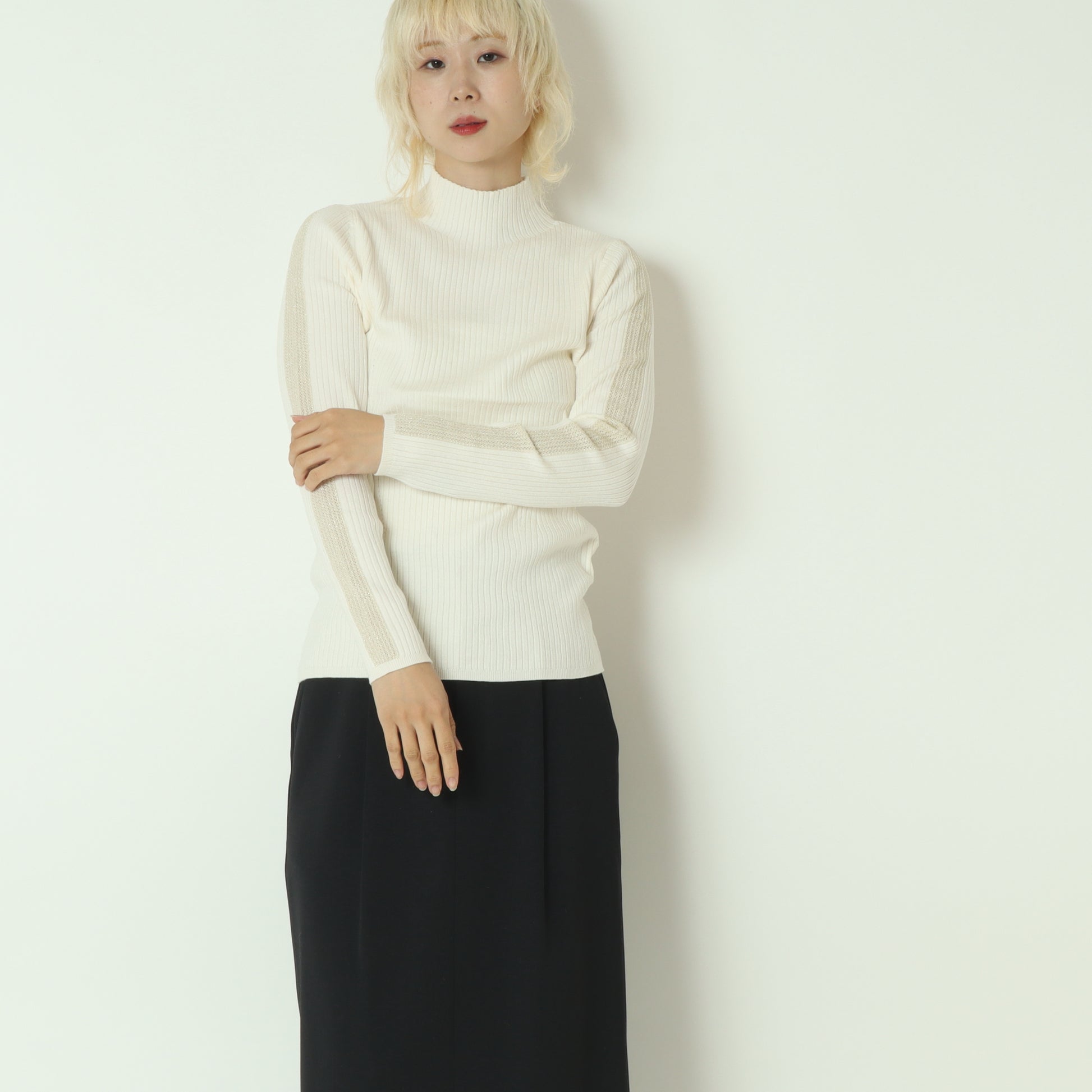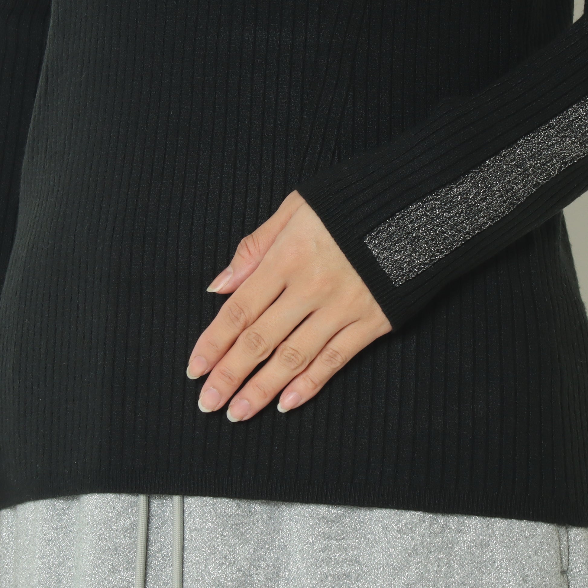 肩から袖口にかけてラメラインの入ったリブニットトップス。