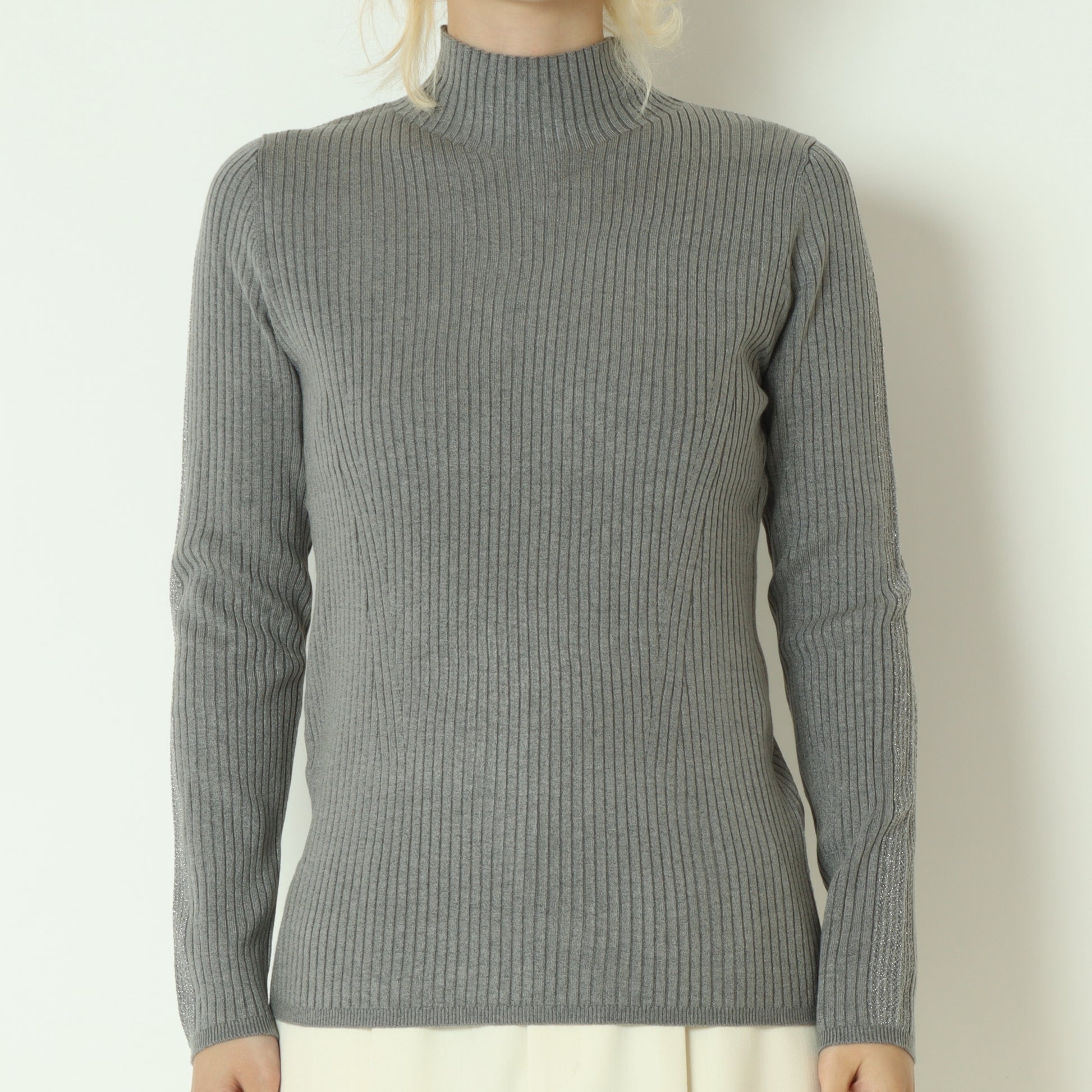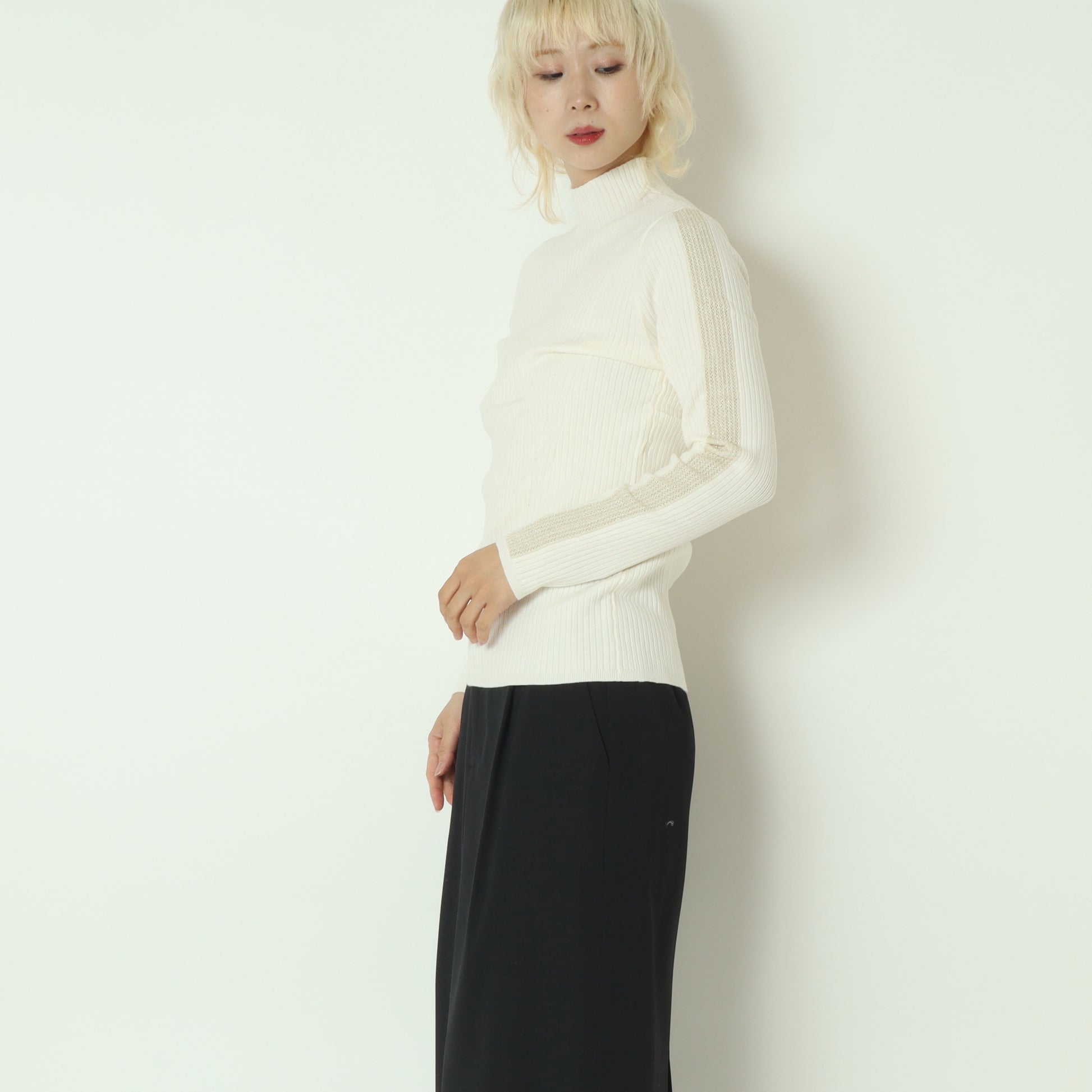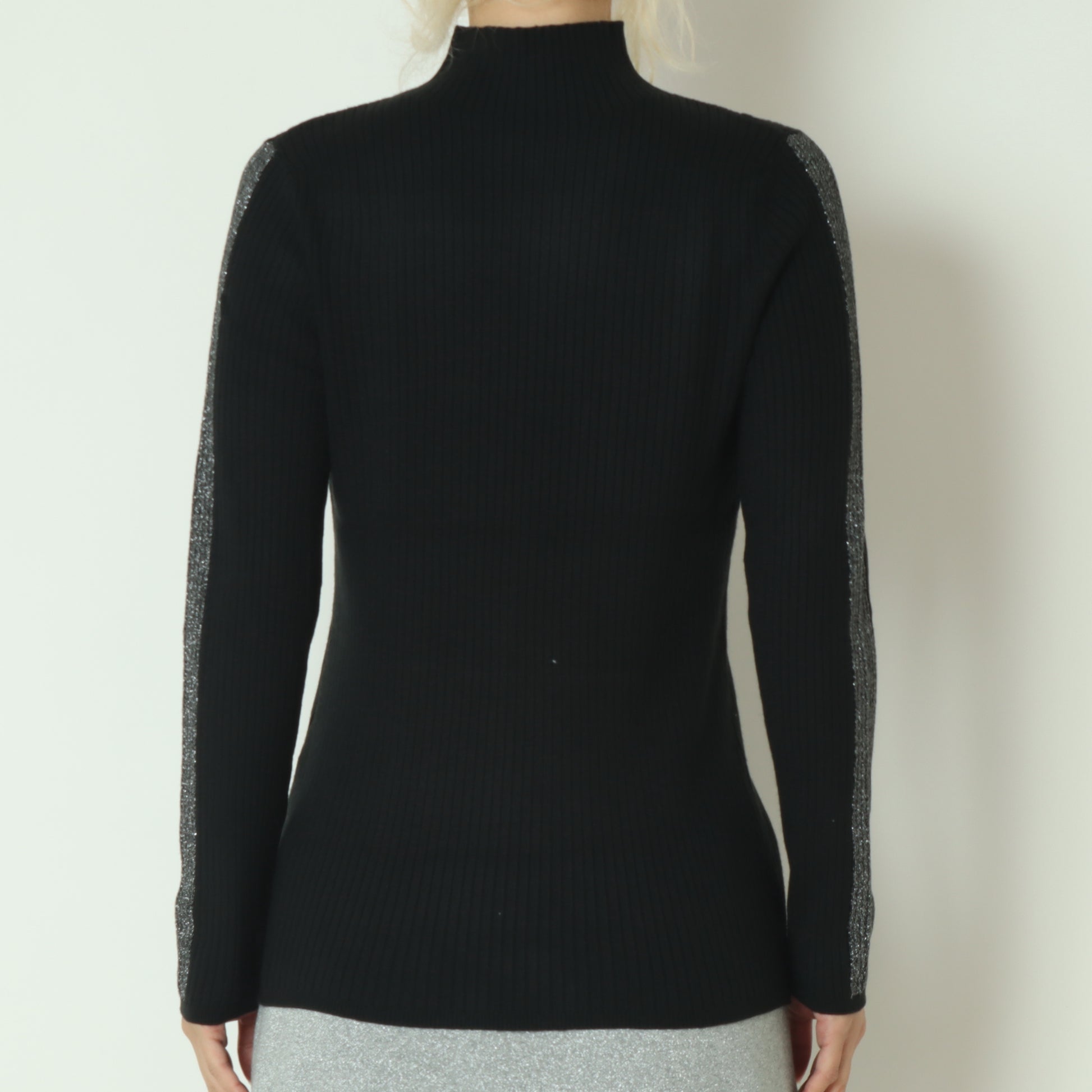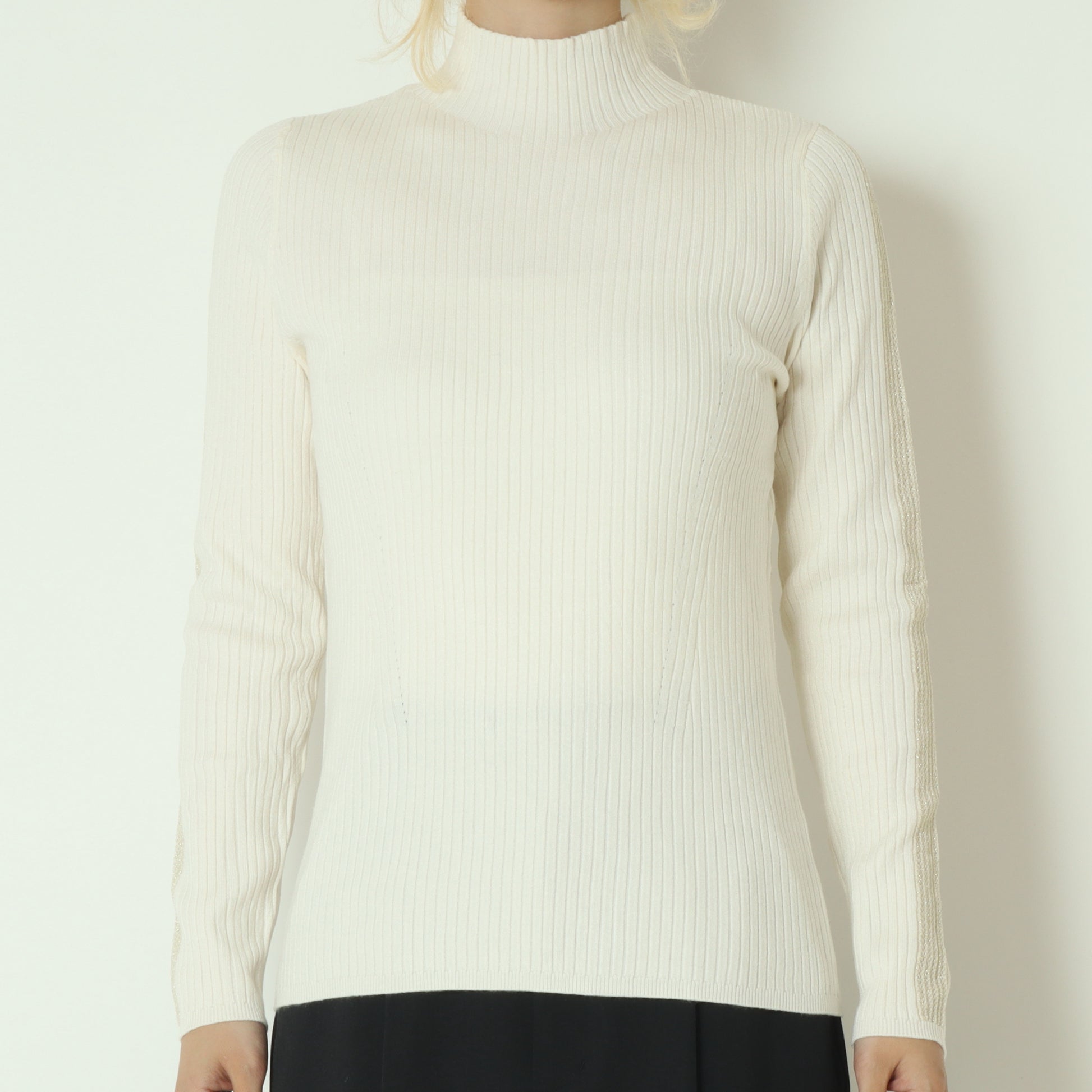 肩から袖口にかけてラメラインの入ったリブニットトップス。