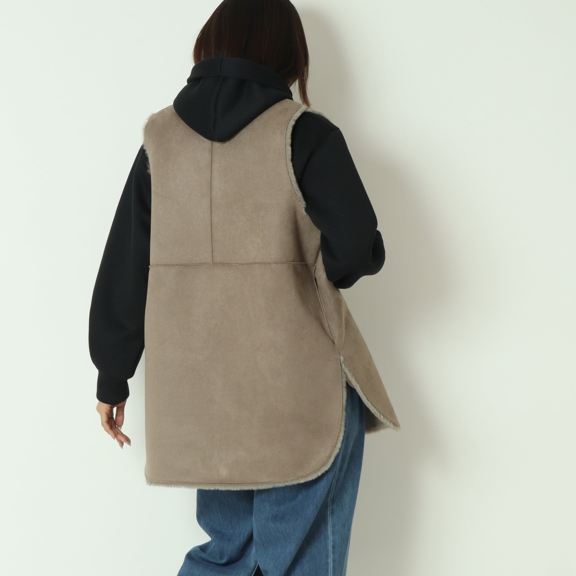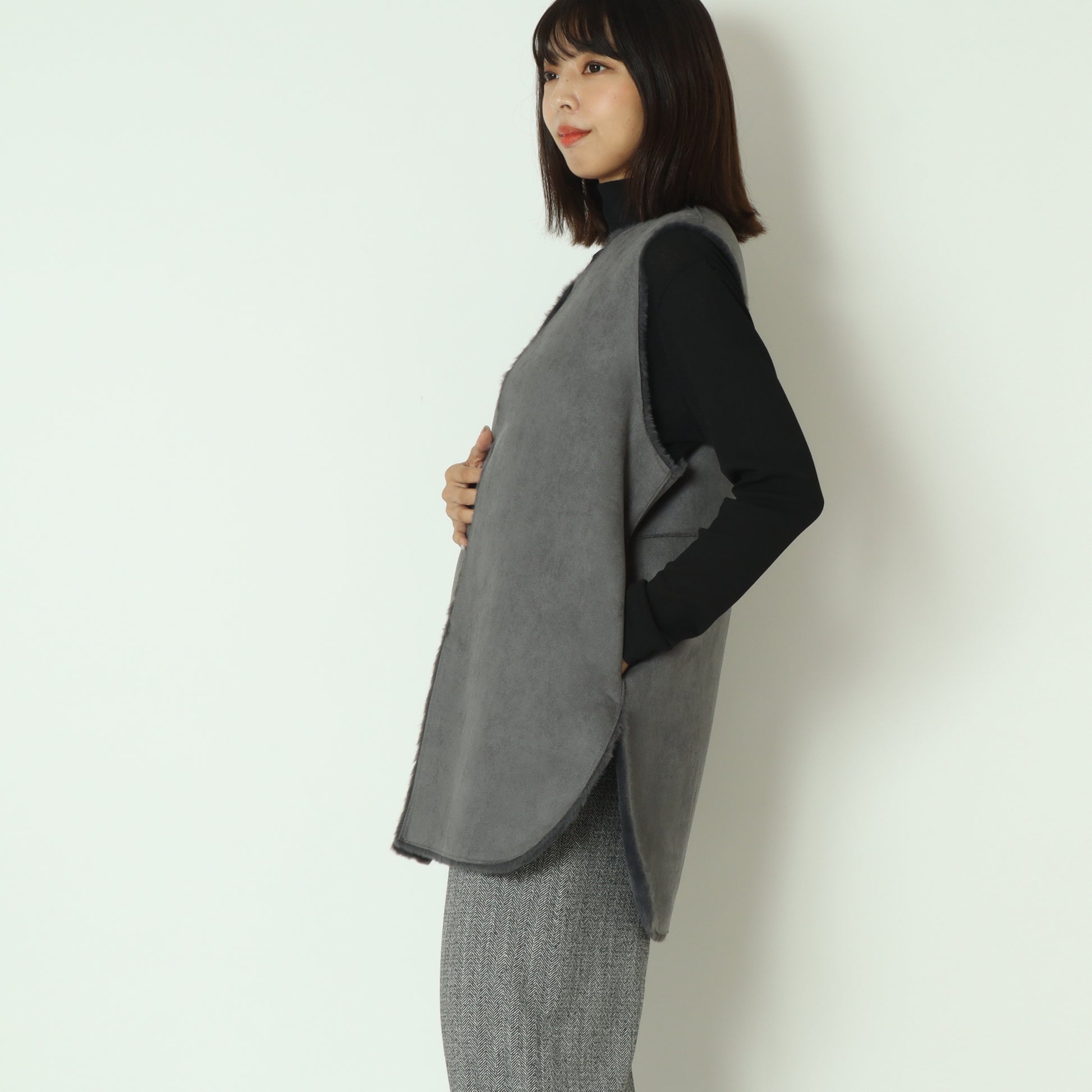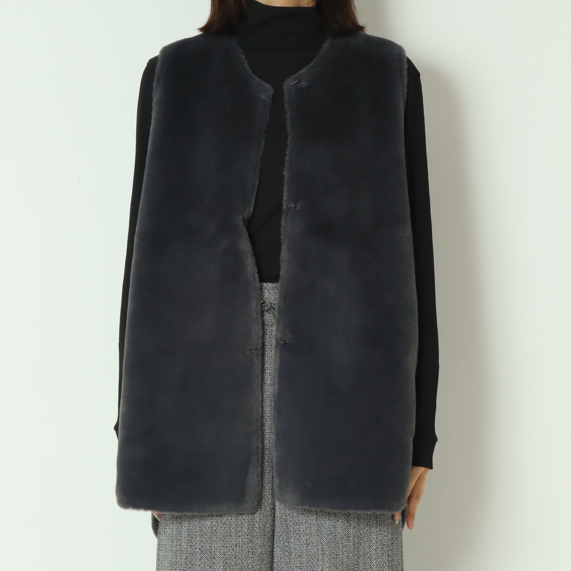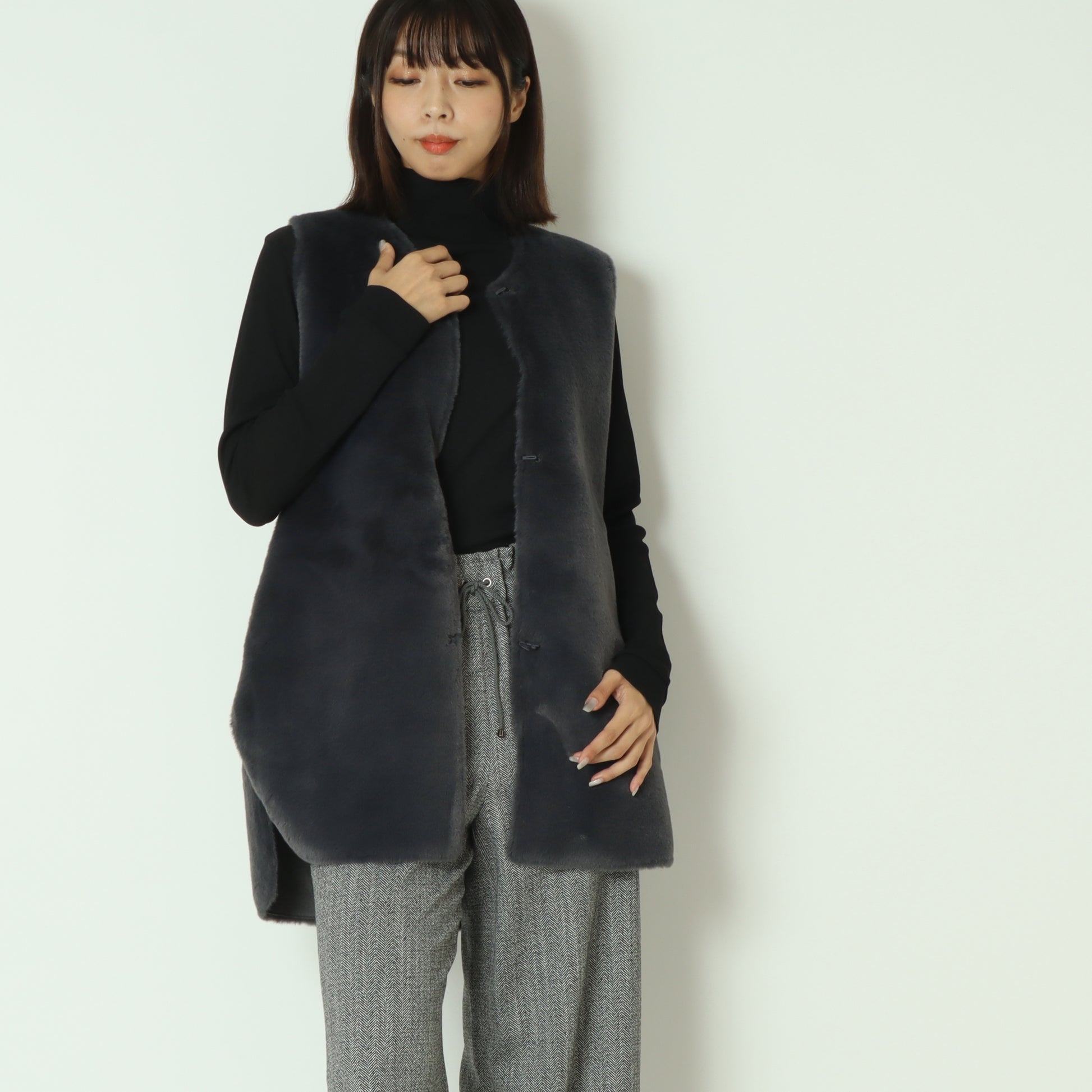 非常に滑らかな肌触りと、程よいボリューム感のフェイクファーのムートン仕立てミドルジレ。