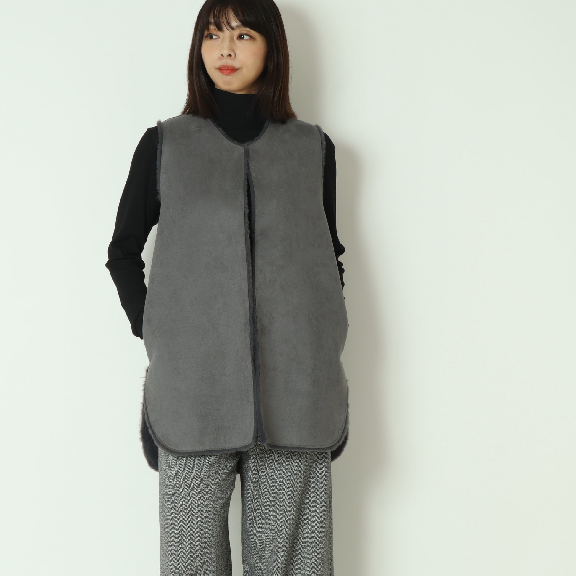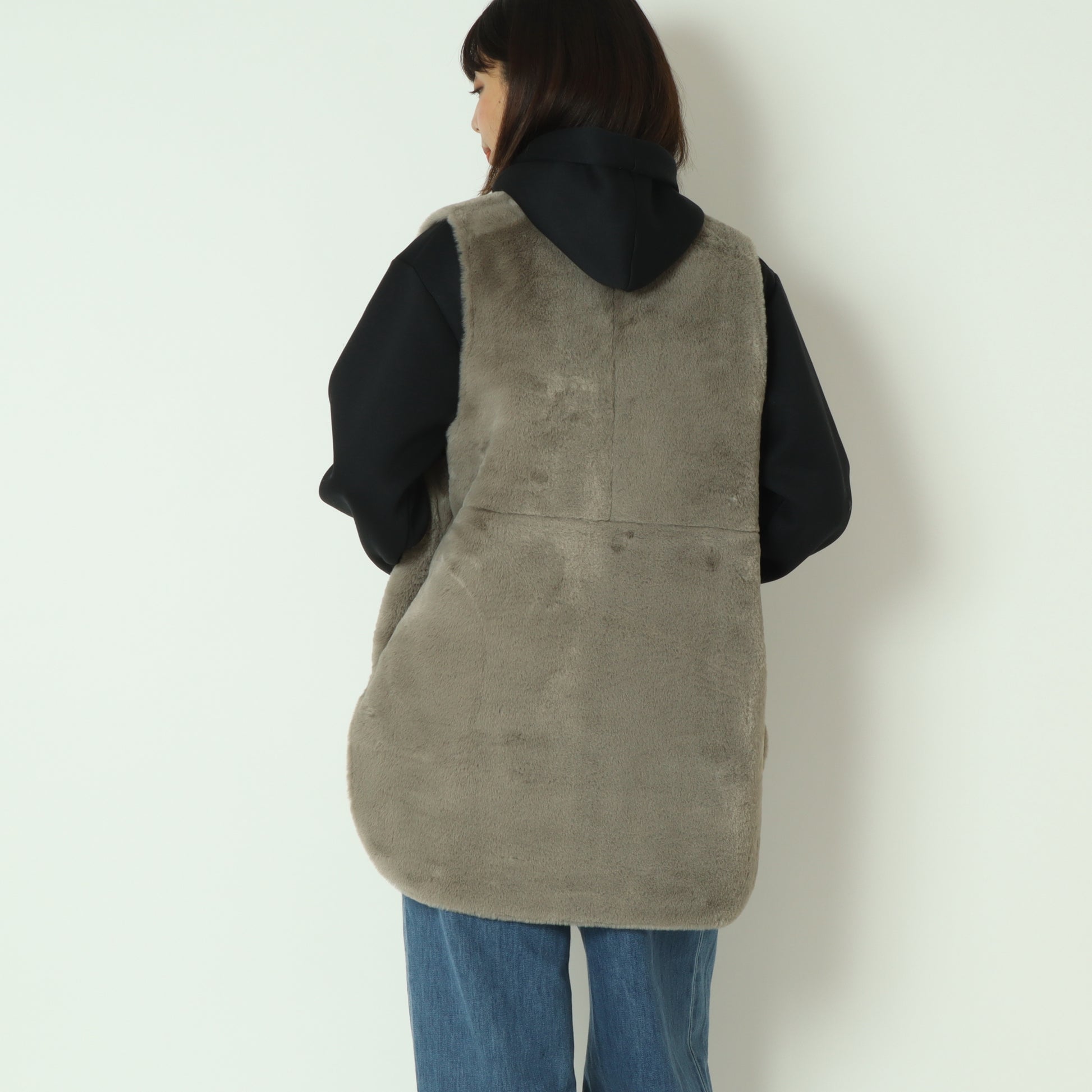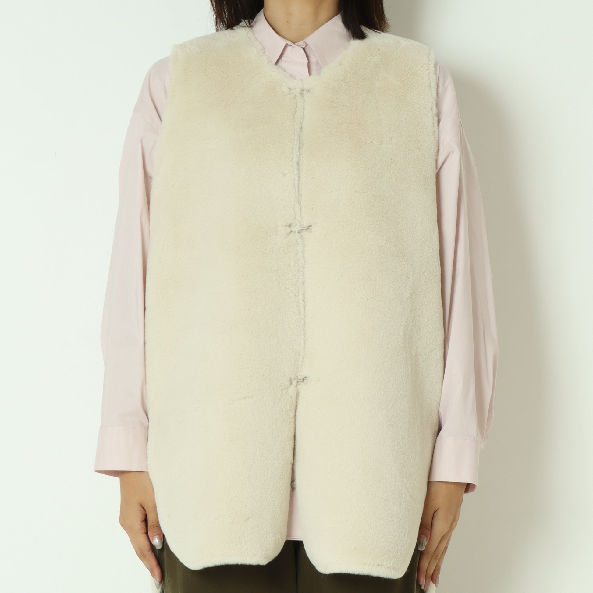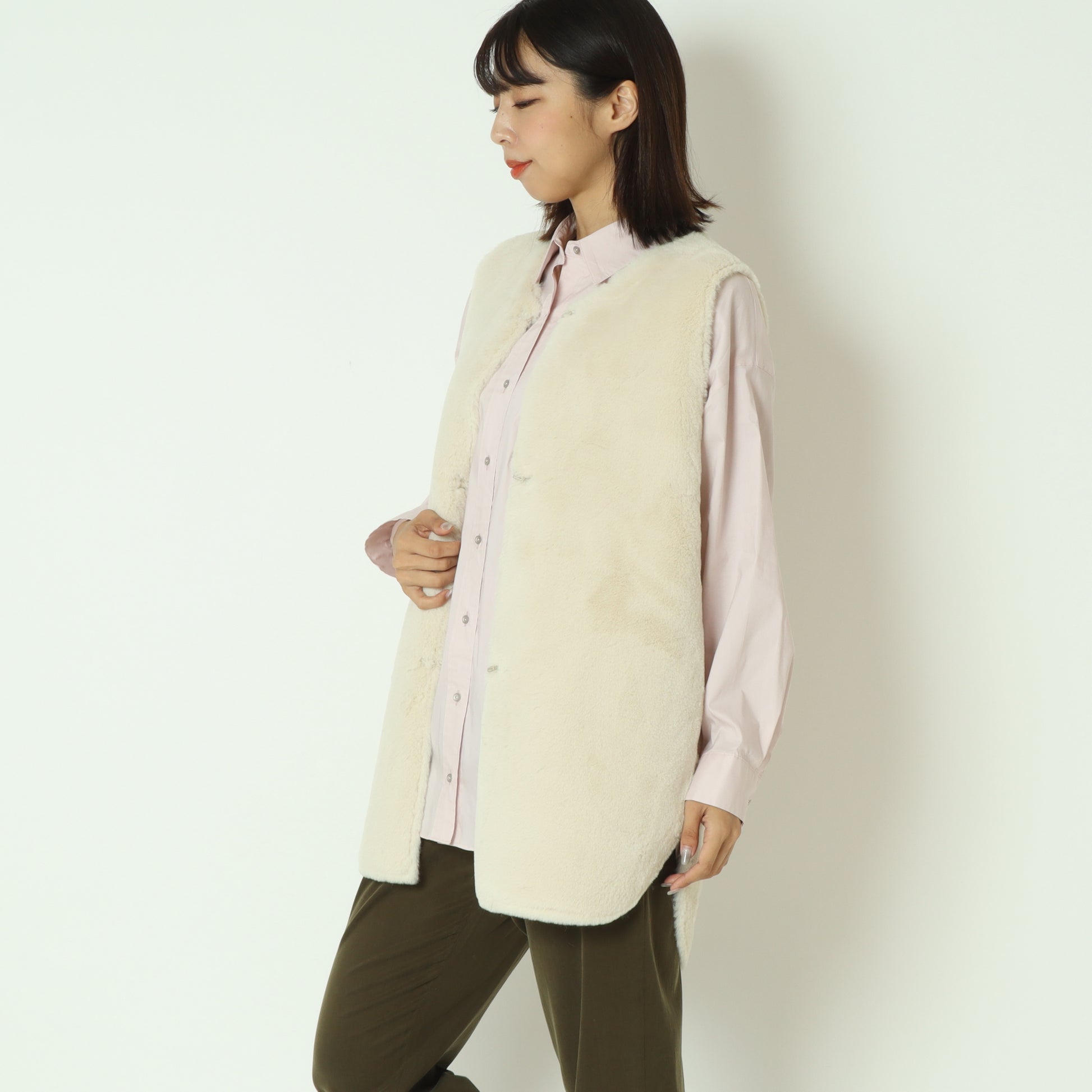 非常に滑らかな肌触りと、程よいボリューム感のフェイクファーのムートン仕立てミドルジレ。