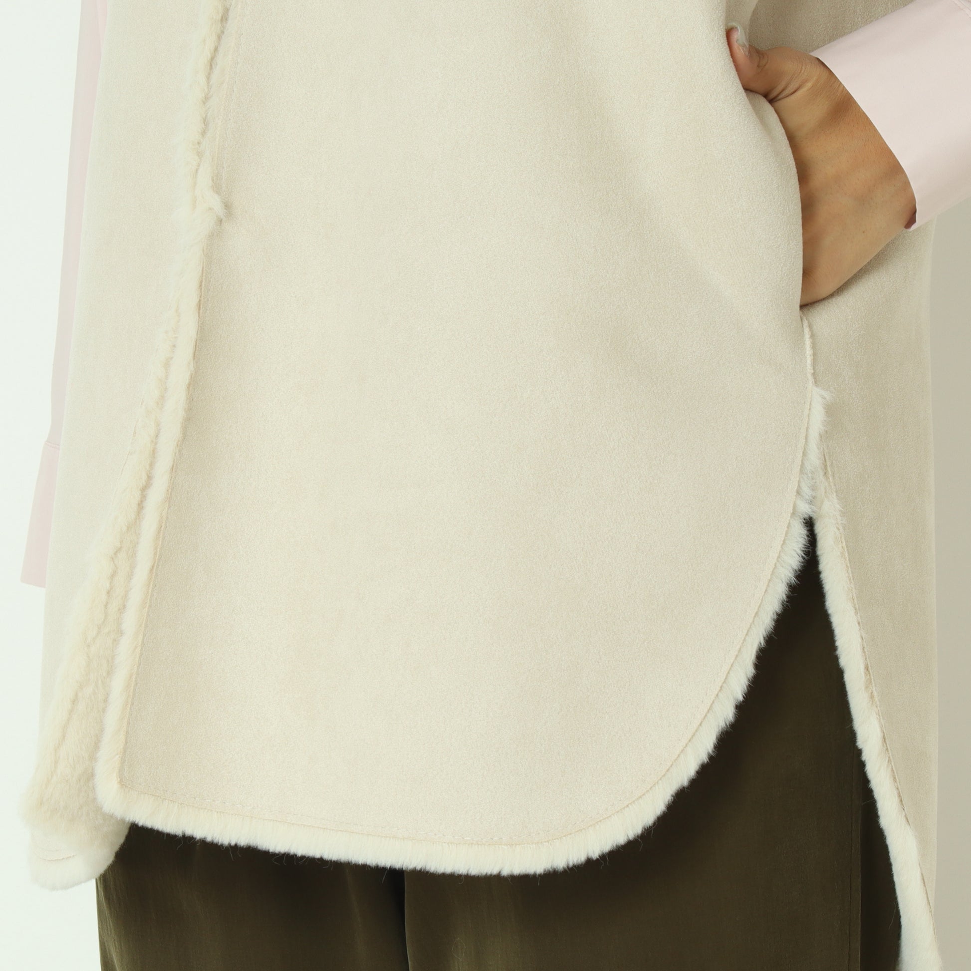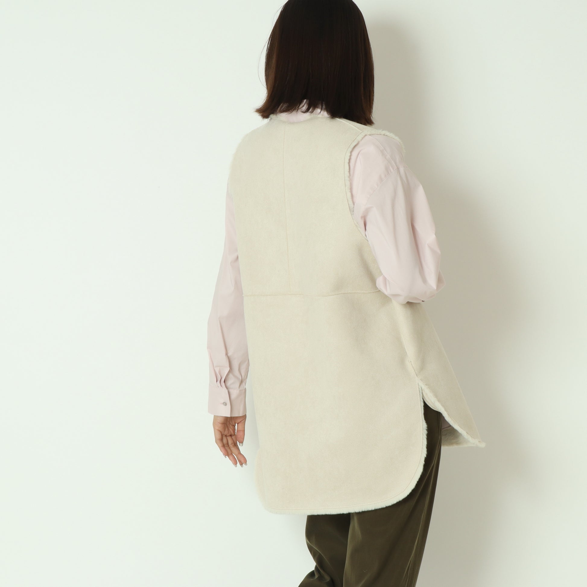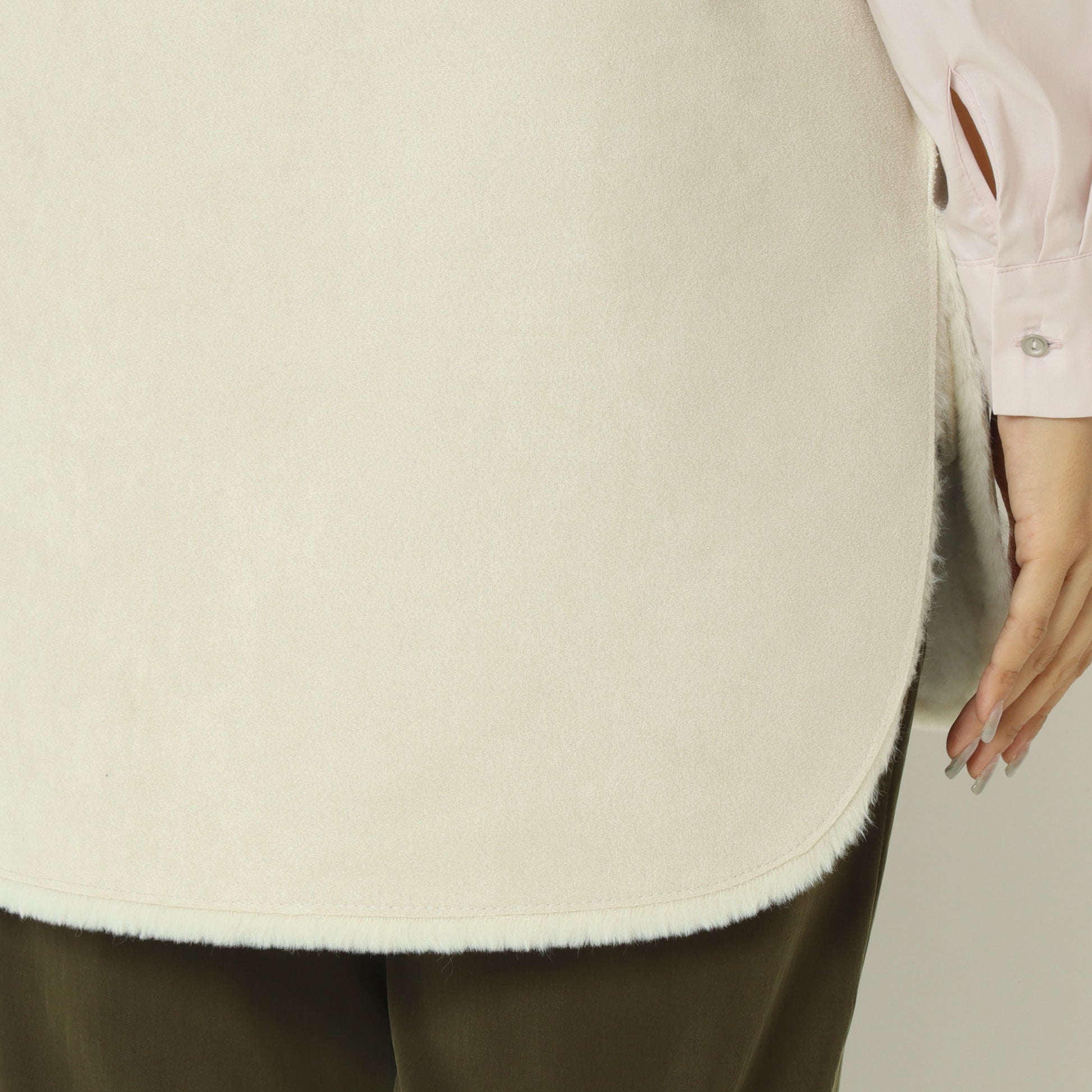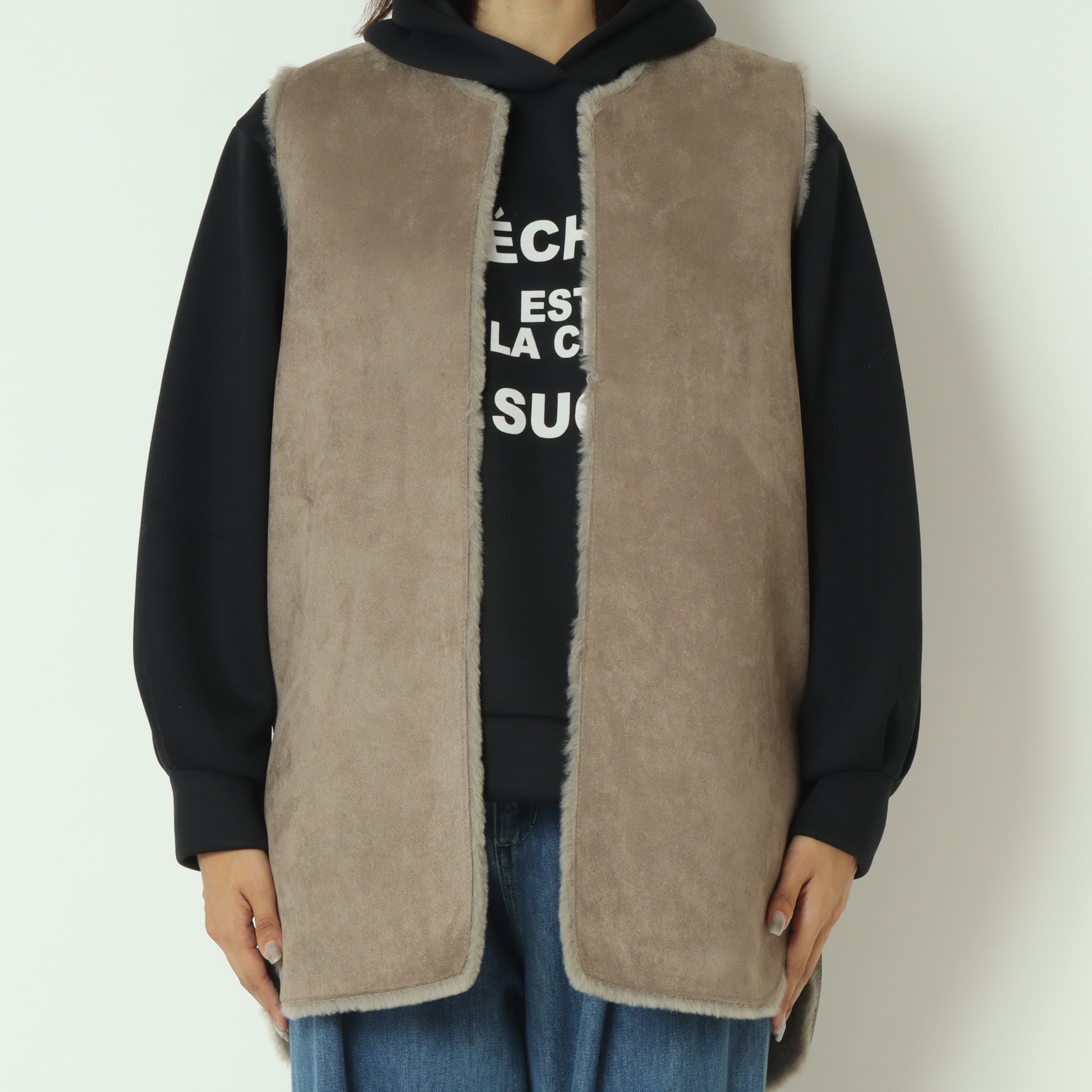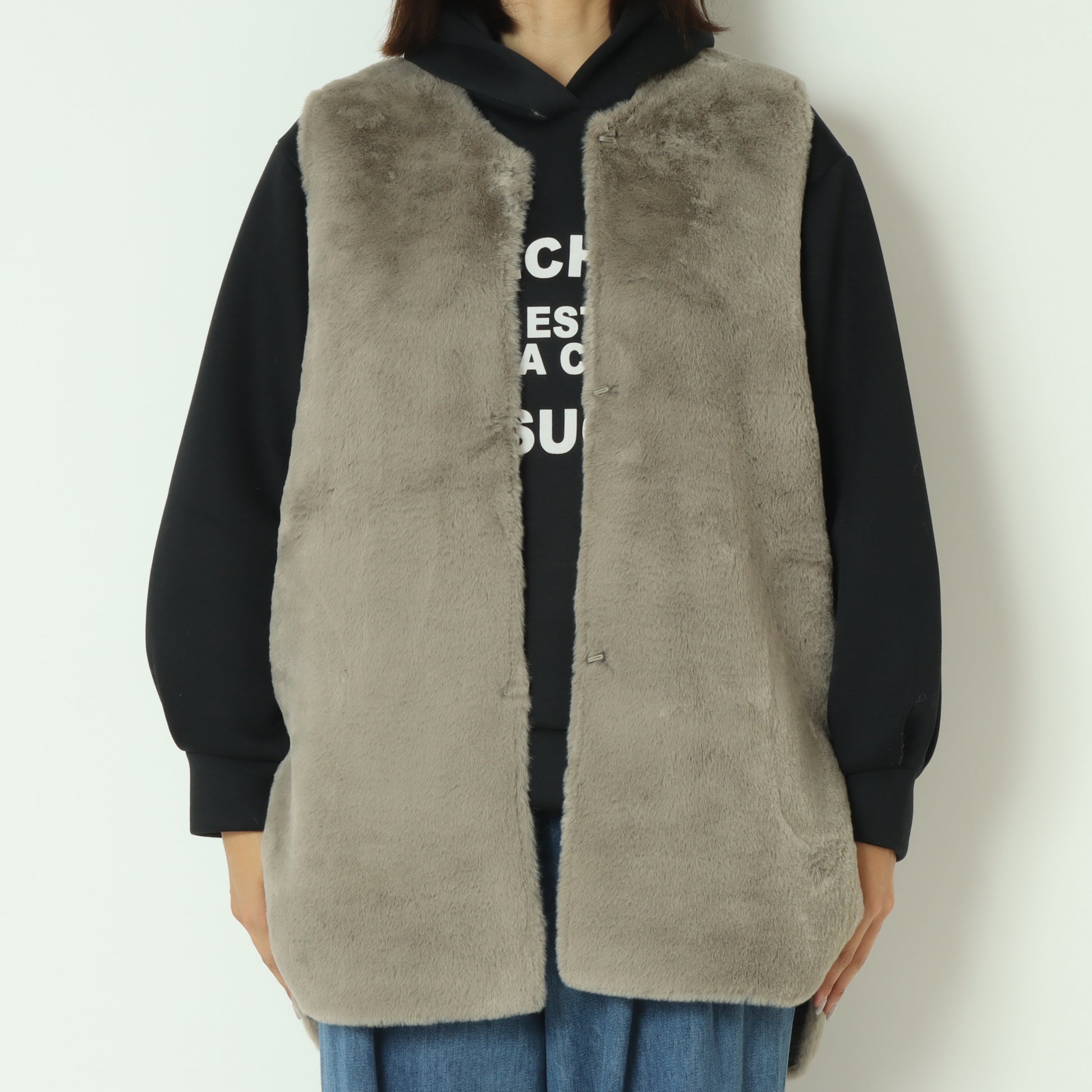 非常に滑らかな肌触りと、程よいボリューム感のフェイクファーのムートン仕立てミドルジレ。