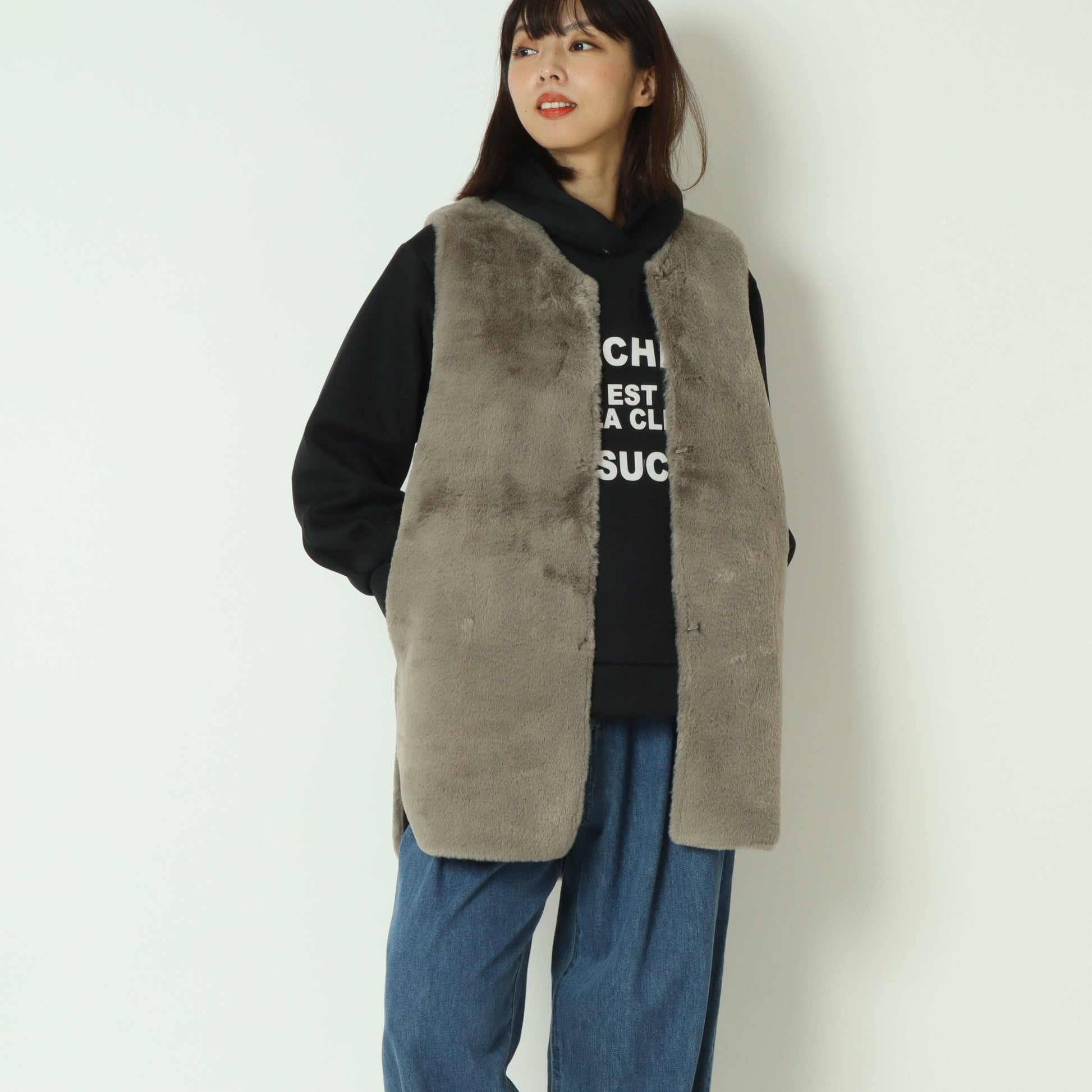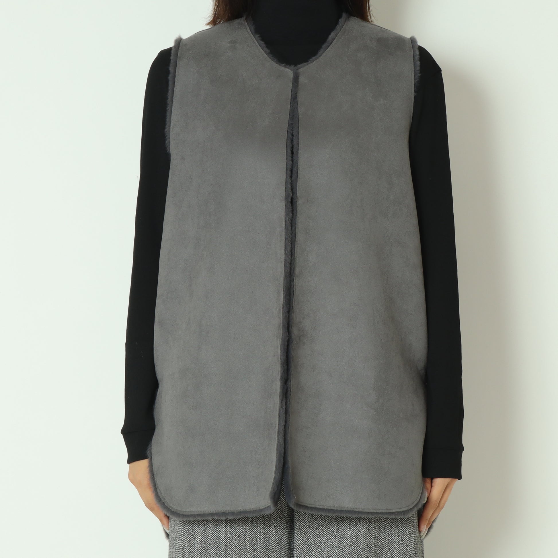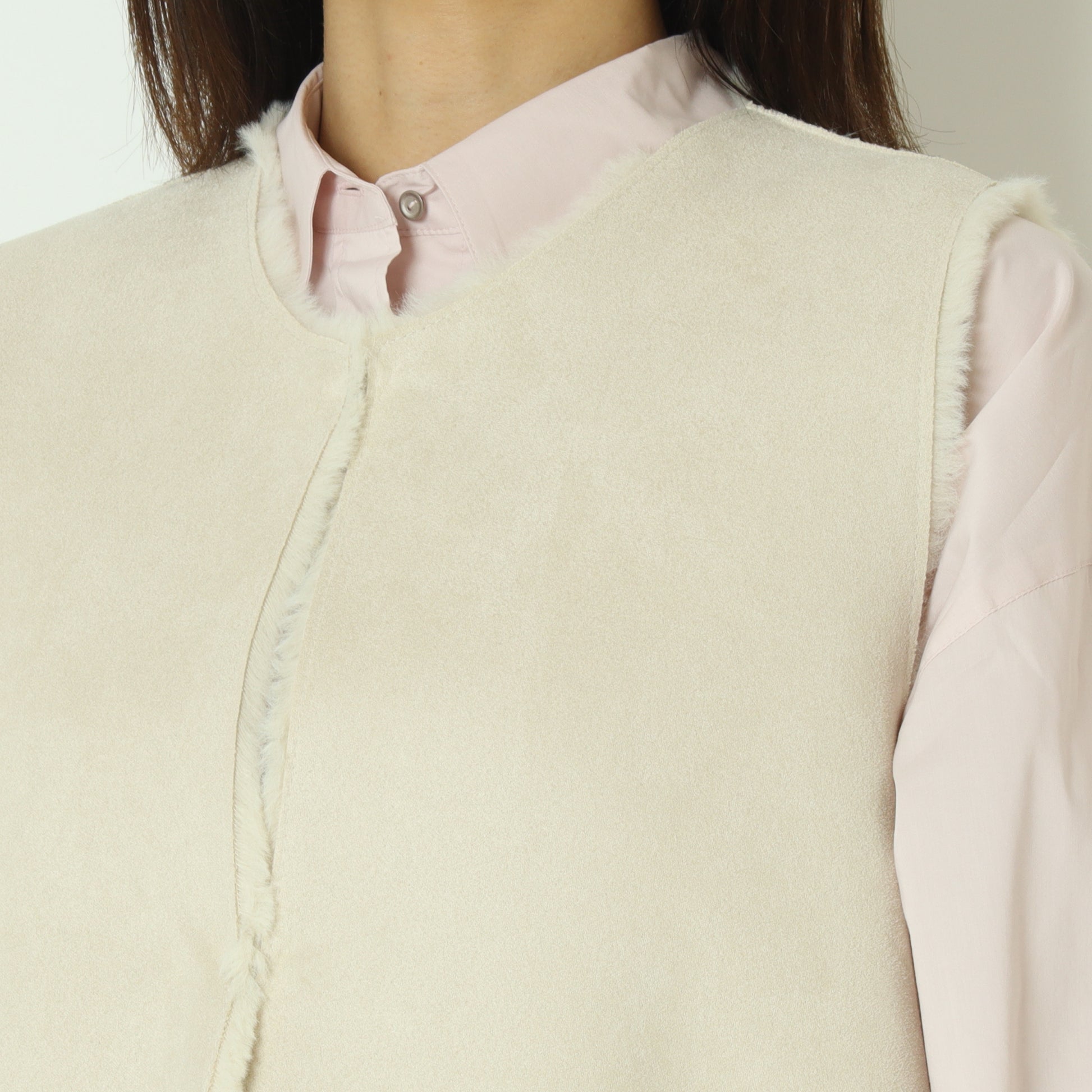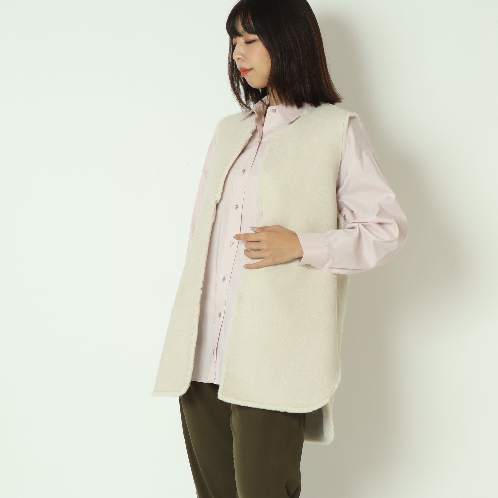 非常に滑らかな肌触りと、程よいボリューム感のフェイクファーのムートン仕立てミドルジレ。