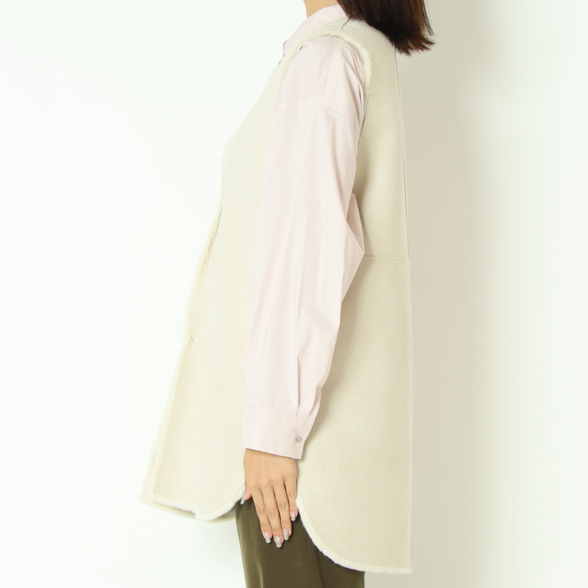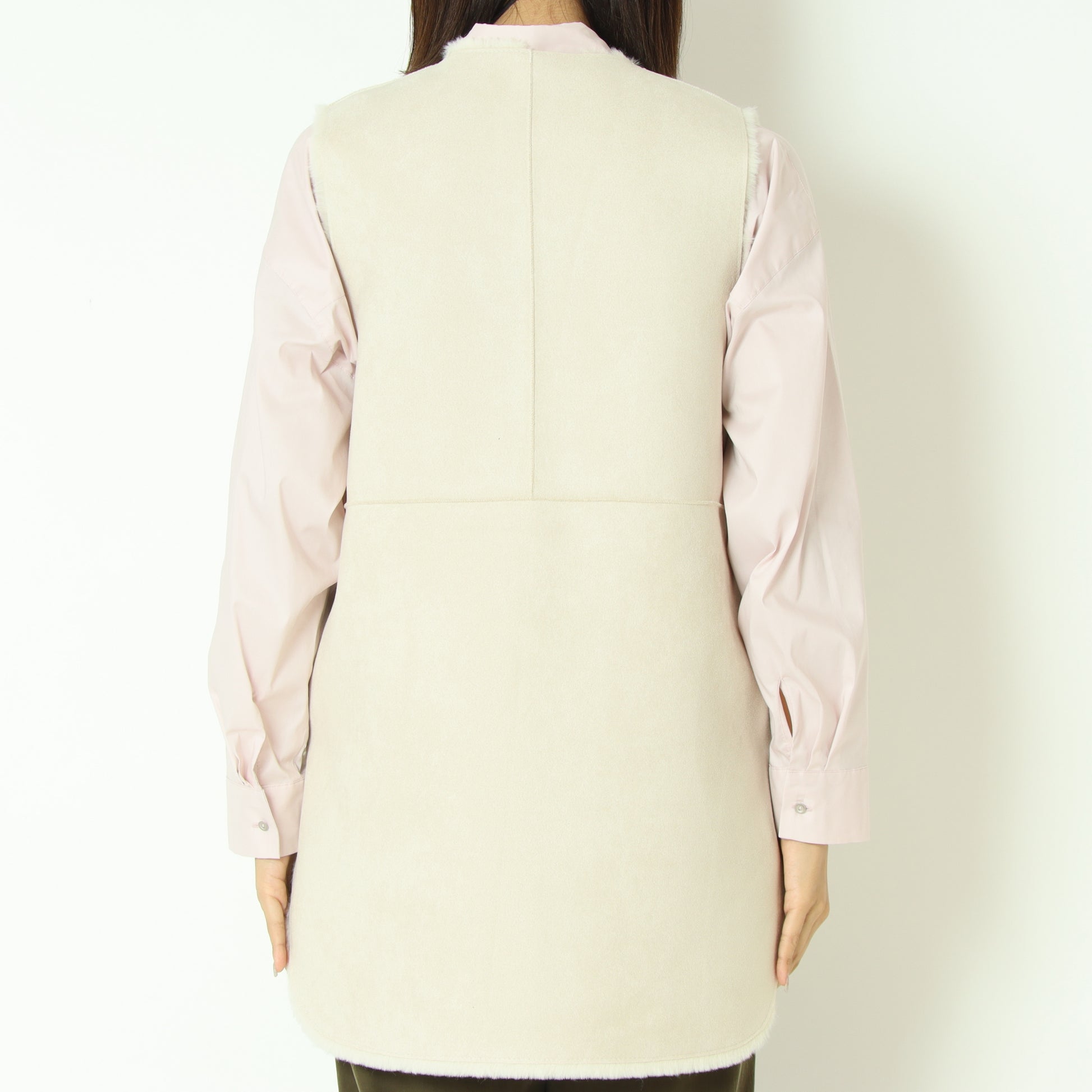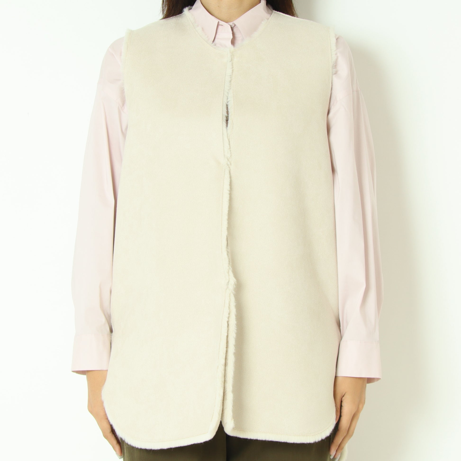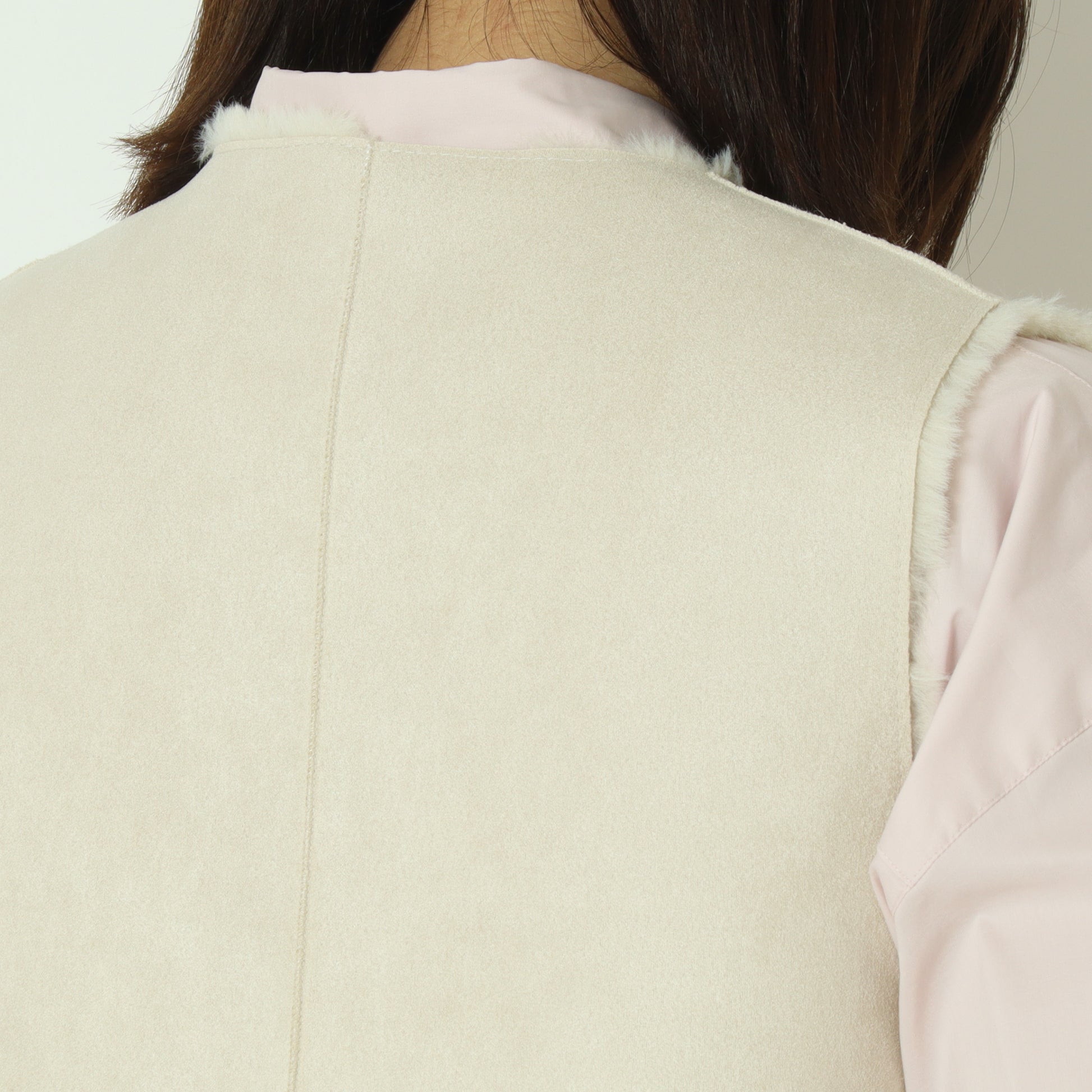 非常に滑らかな肌触りと、程よいボリューム感のフェイクファーのムートン仕立てミドルジレ。