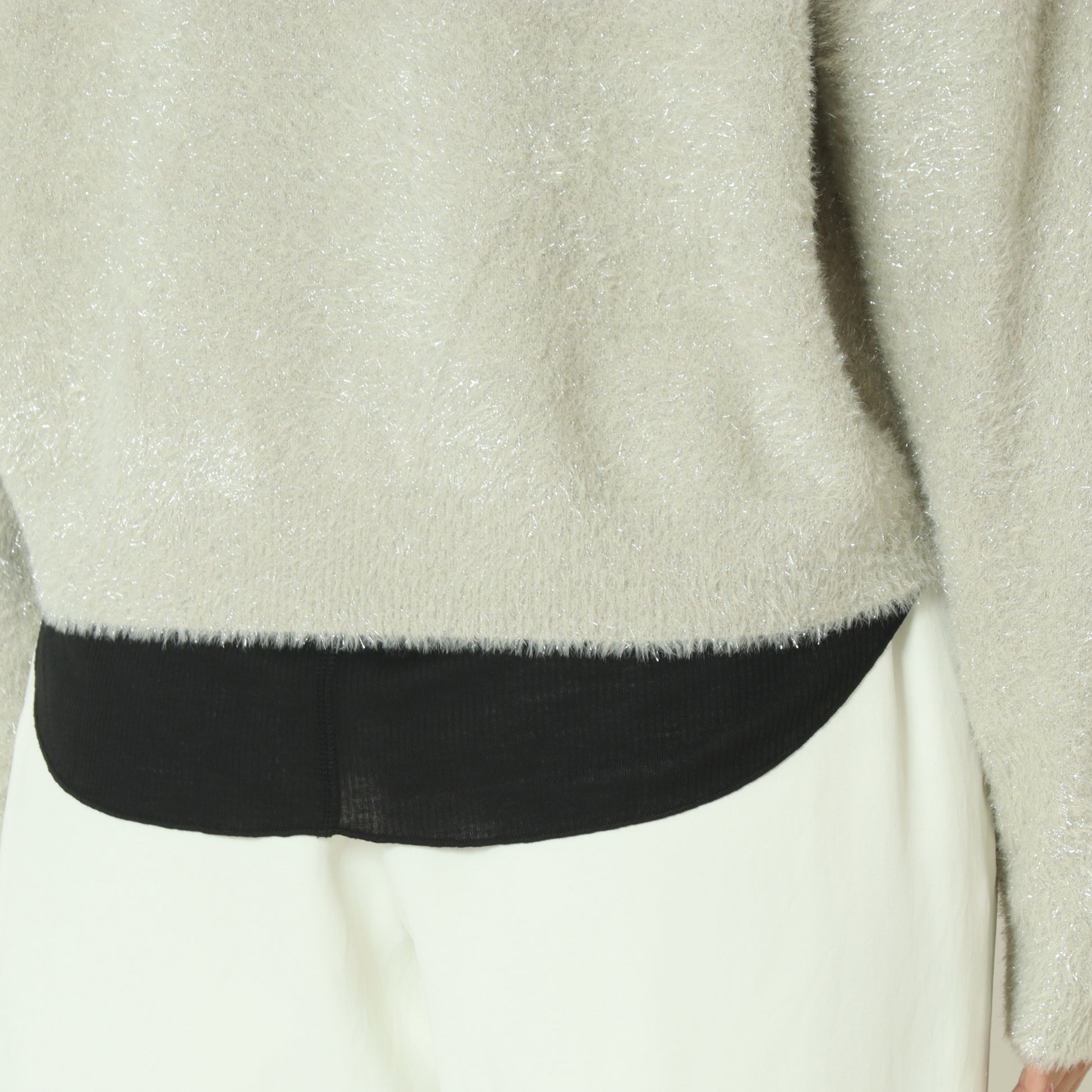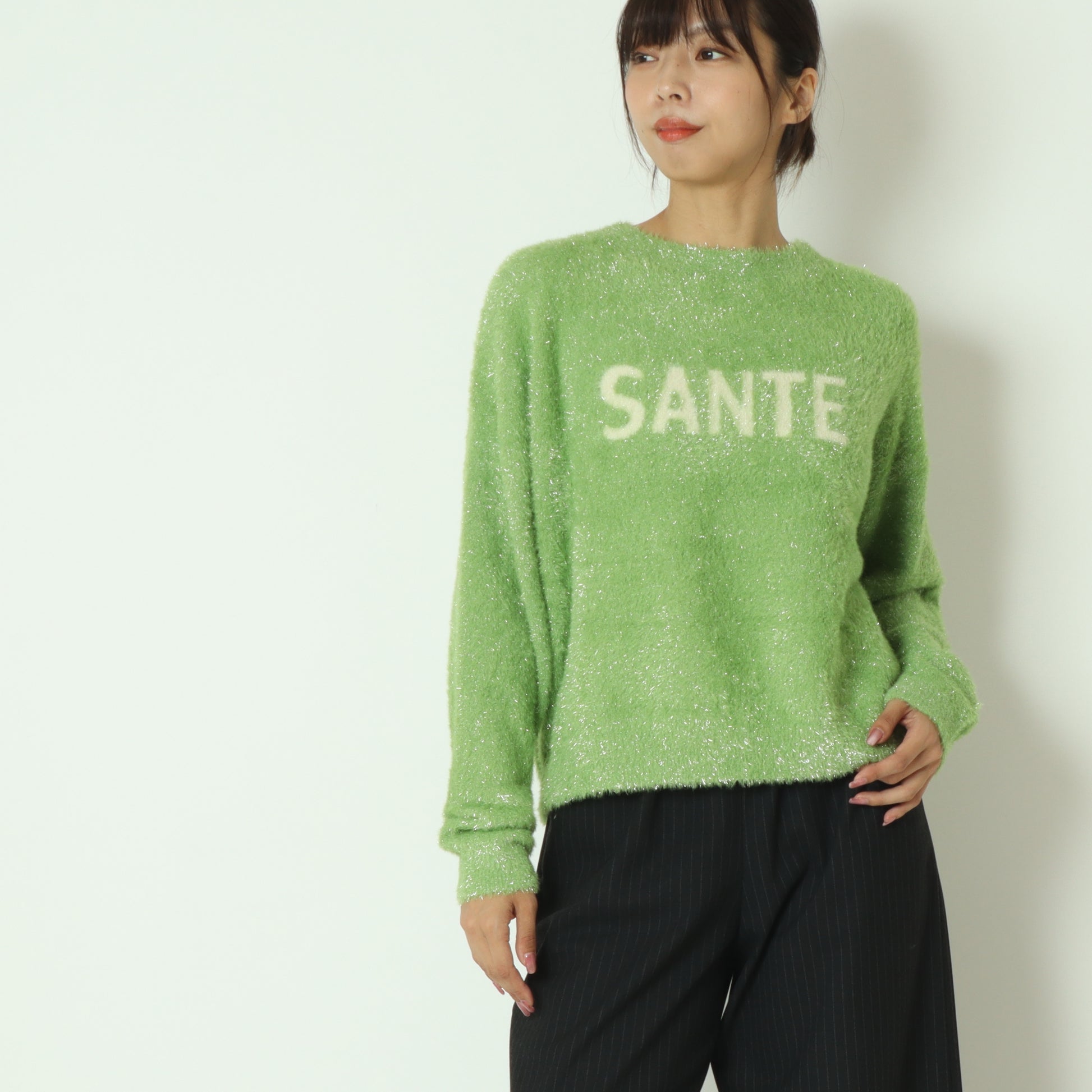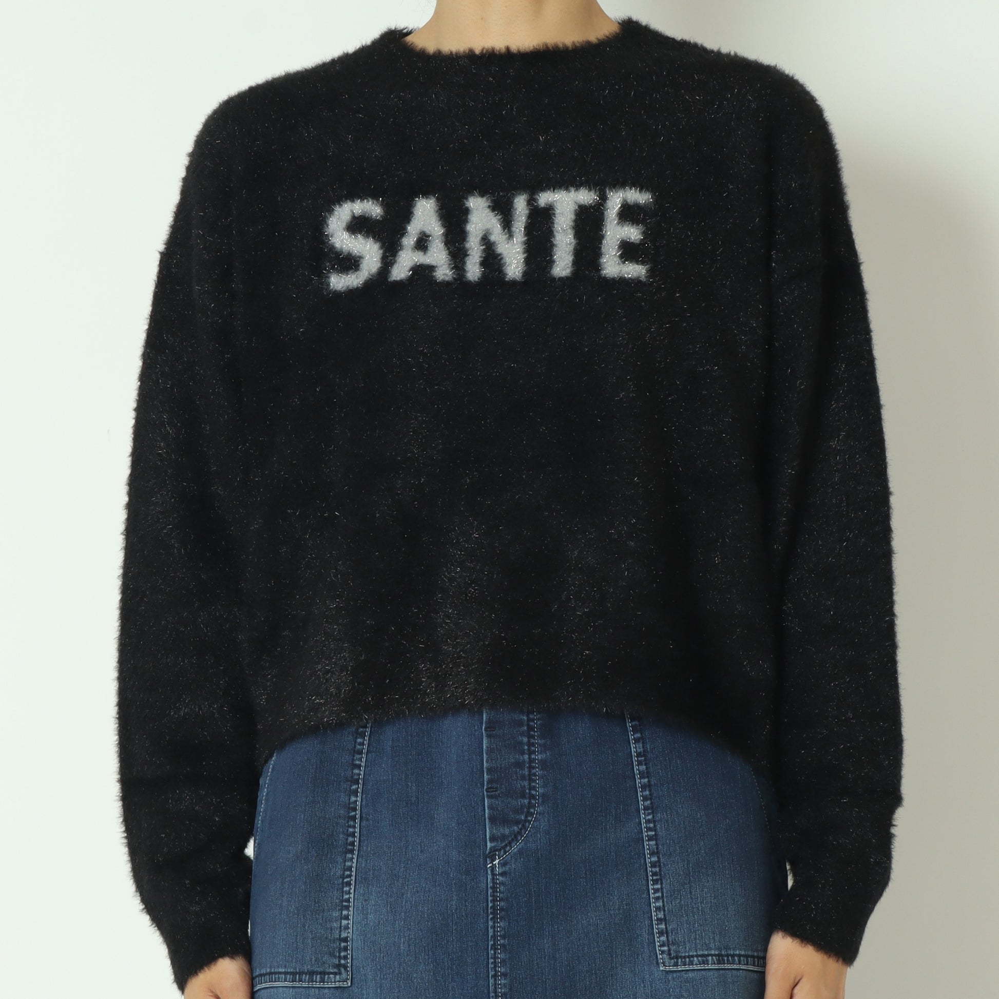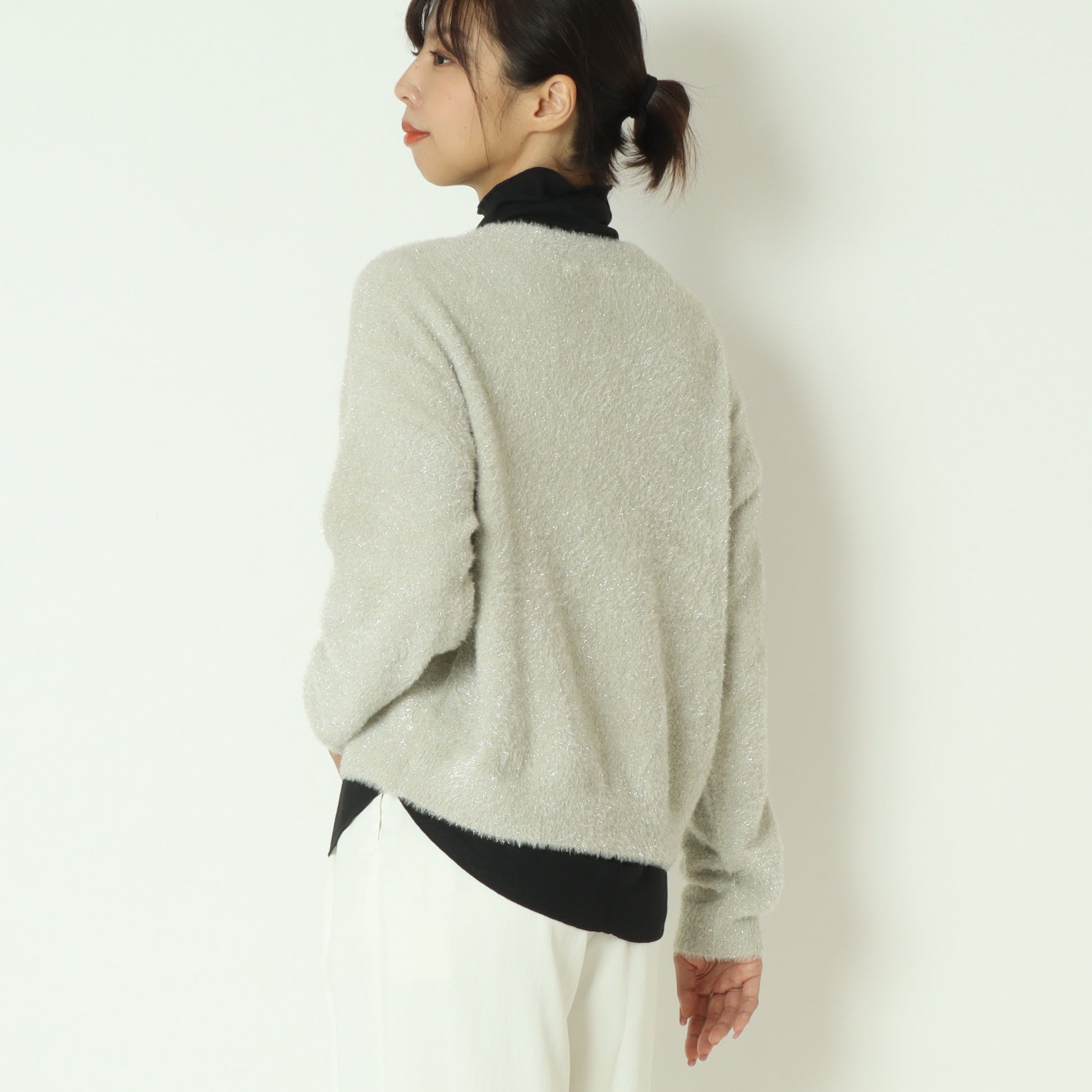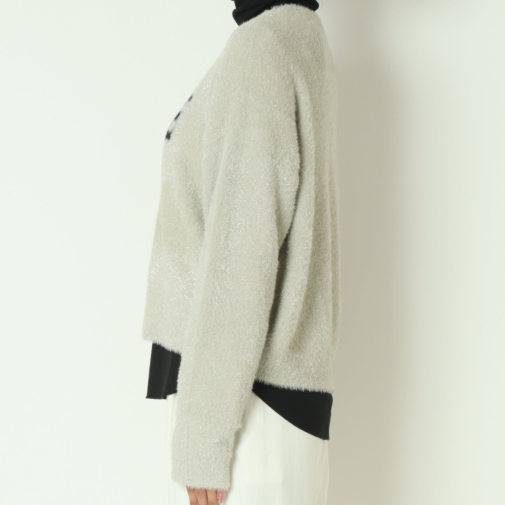 ふんわりと毛羽立った柔らかな手触りと見た目が特徴のラメシャギーロゴニット。