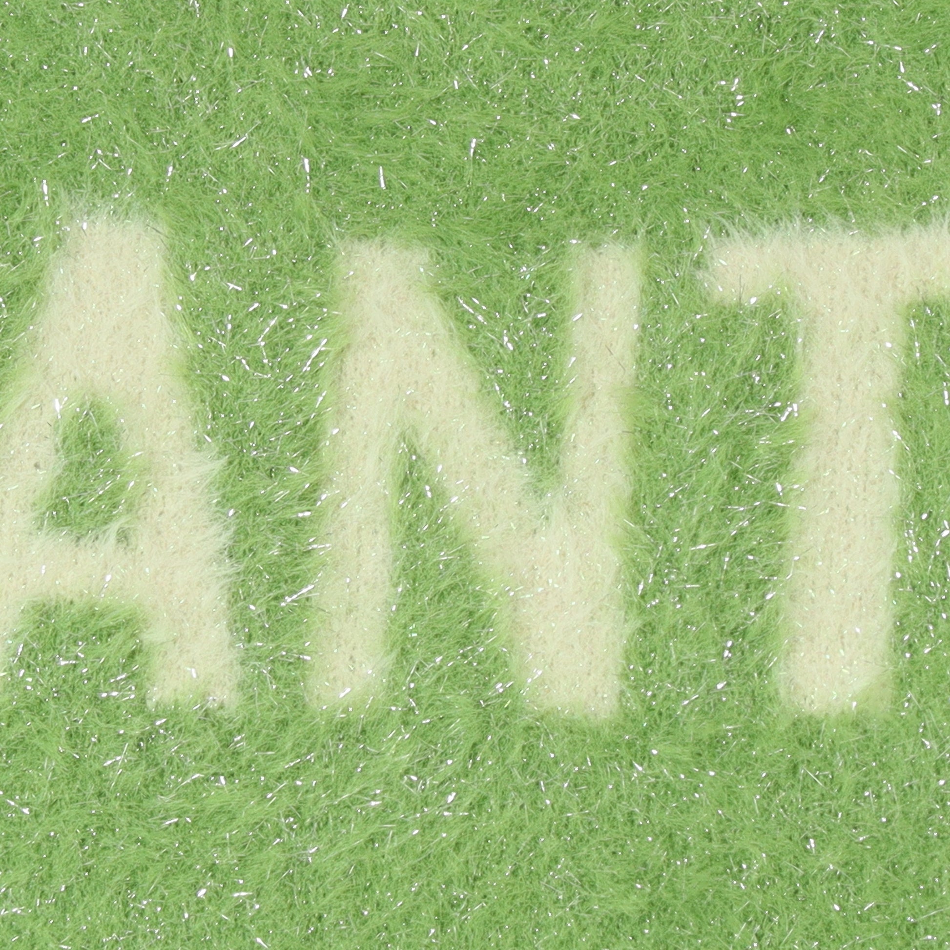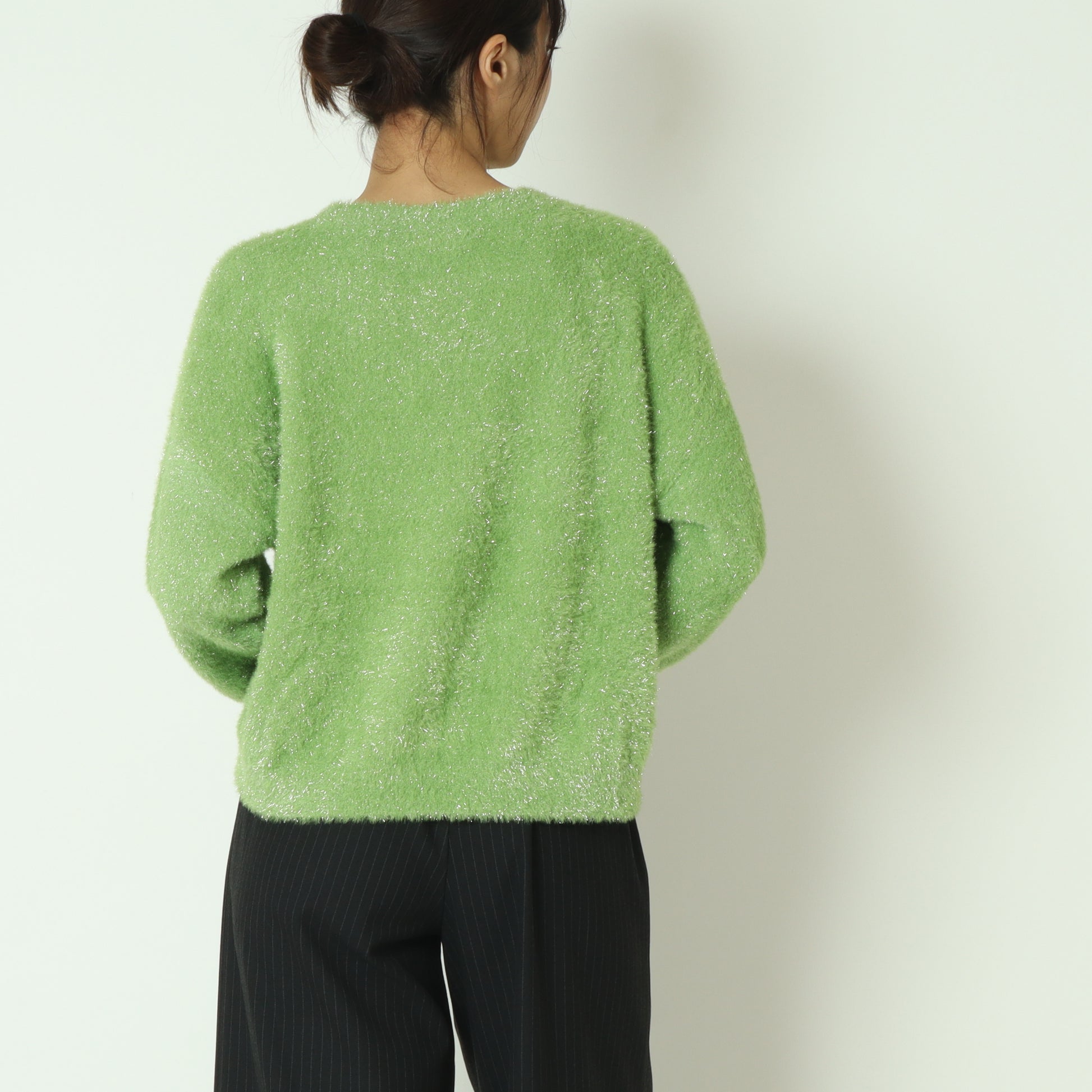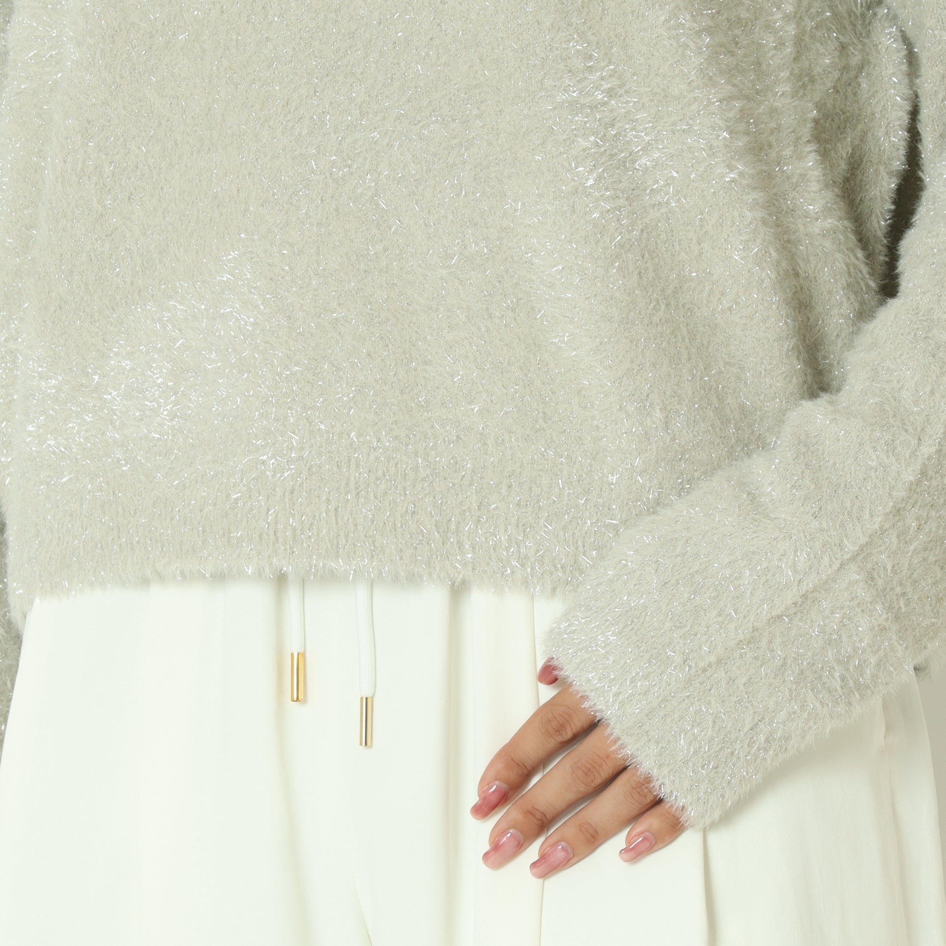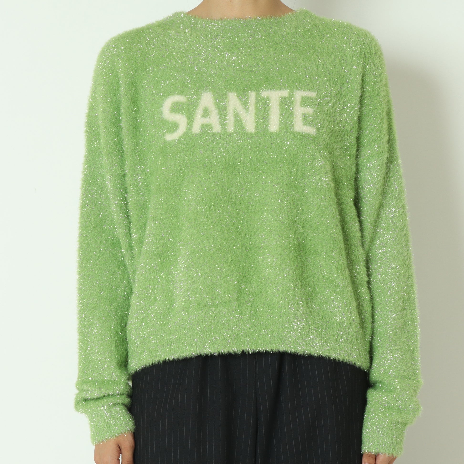 ふんわりと毛羽立った柔らかな手触りと見た目が特徴のラメシャギーロゴニット。