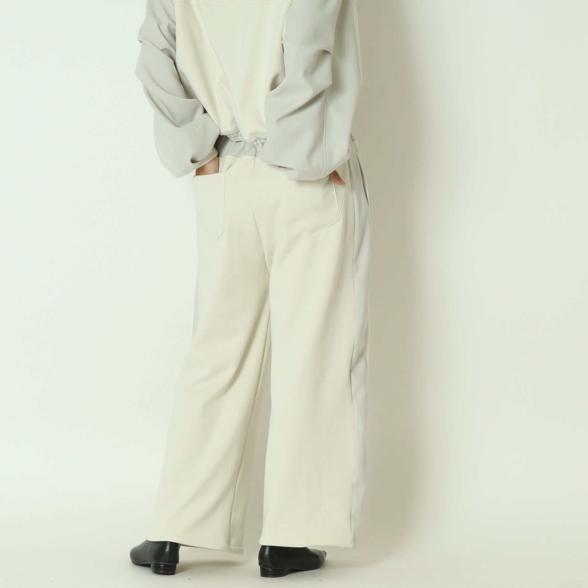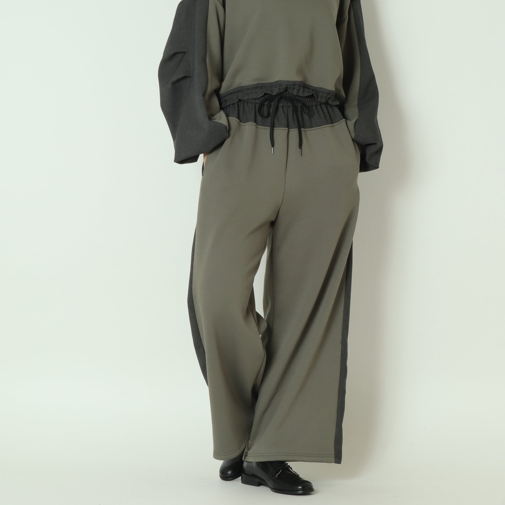 ウール調サージの上に裏起毛ジャージを重ね着したようなウエストデザインのリラクシーなワイドパンツ。