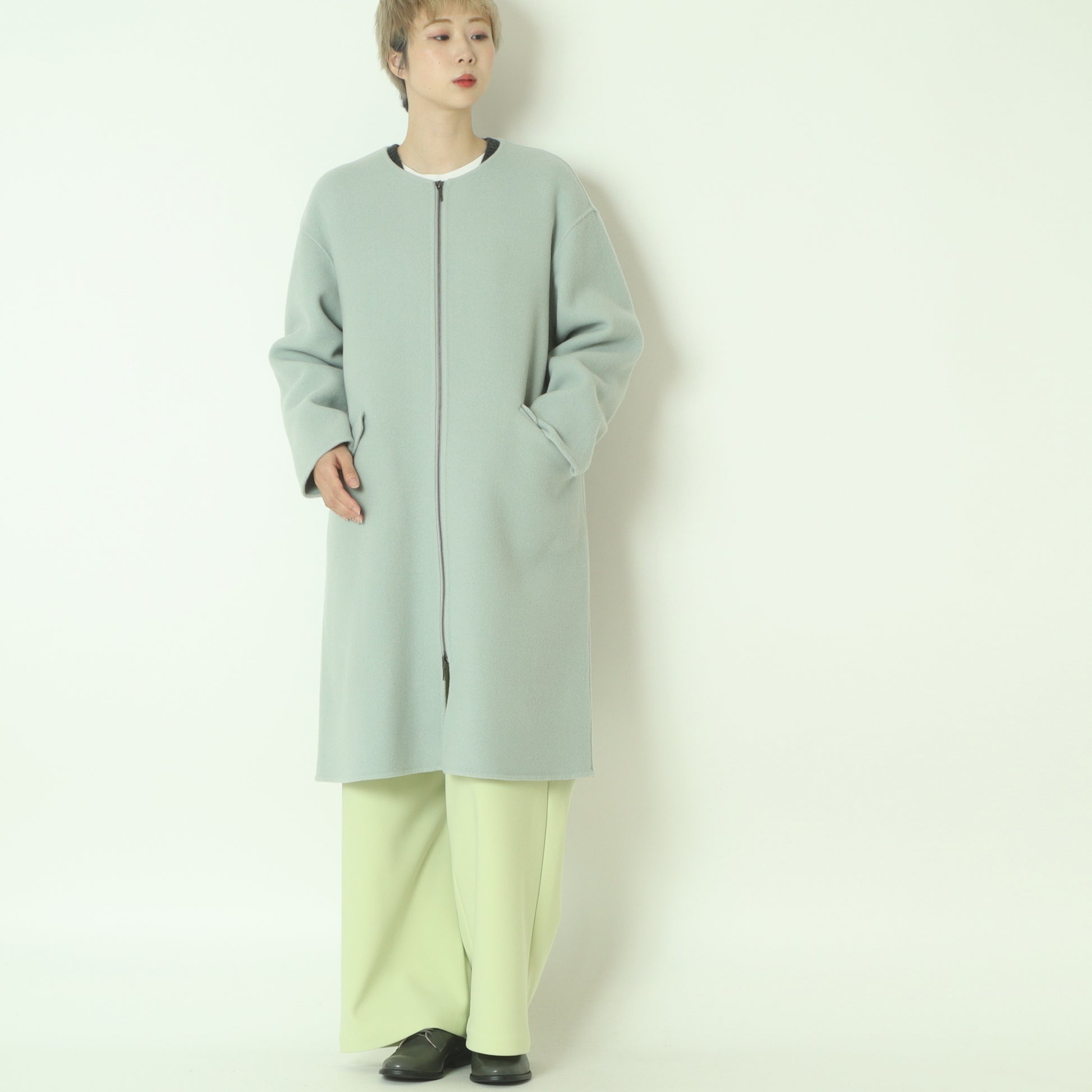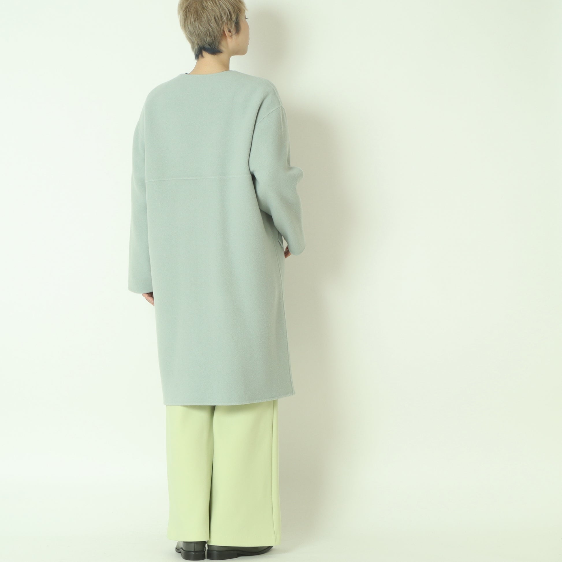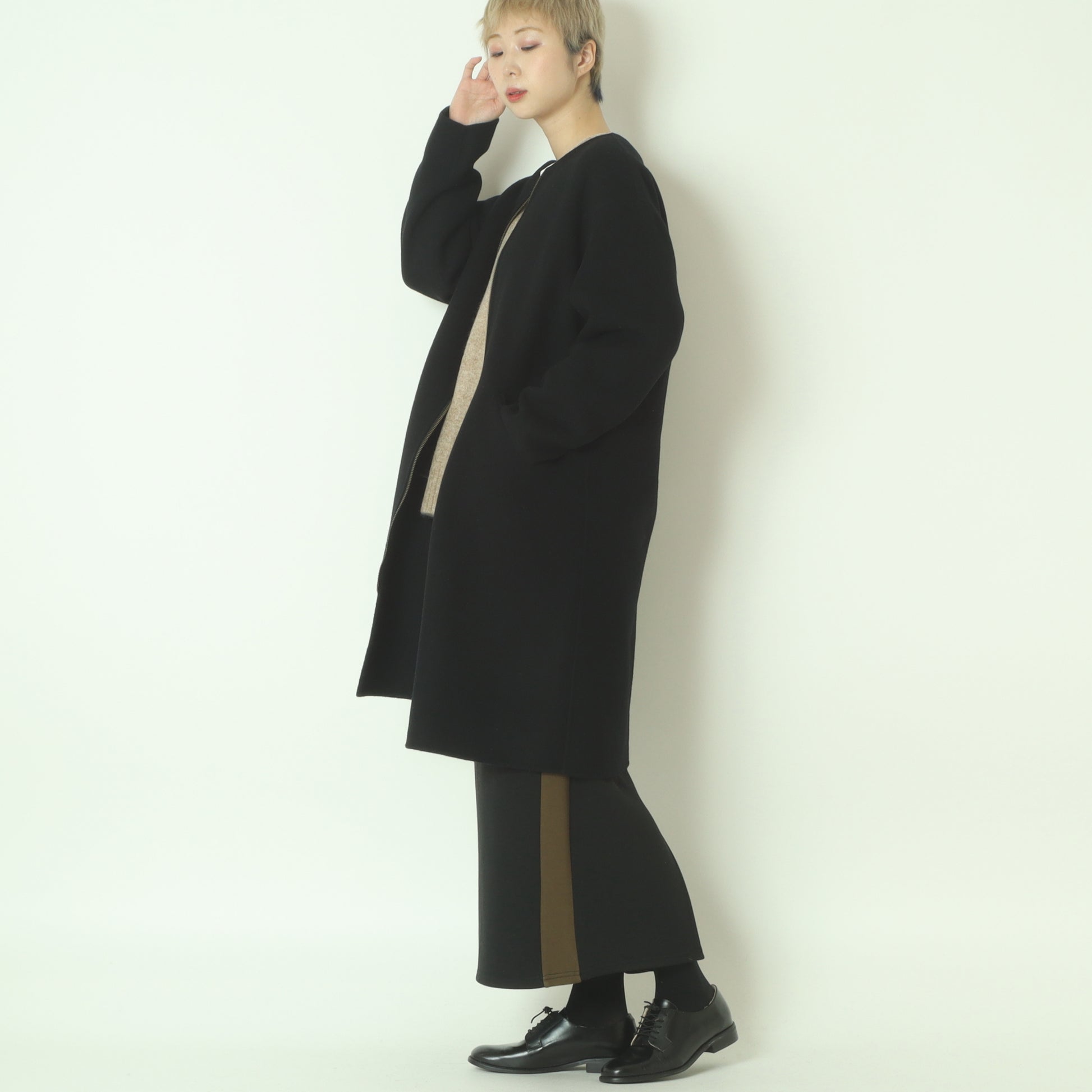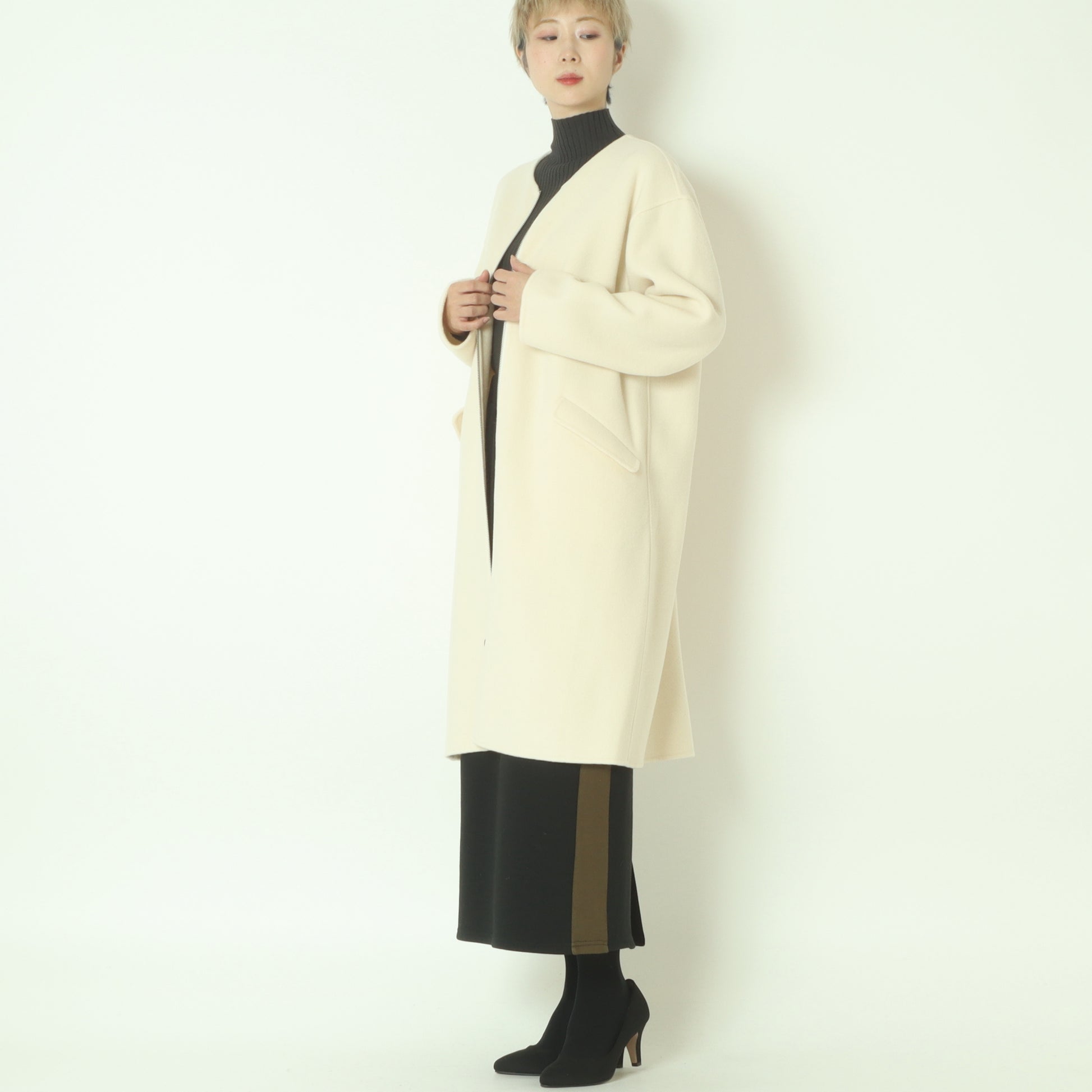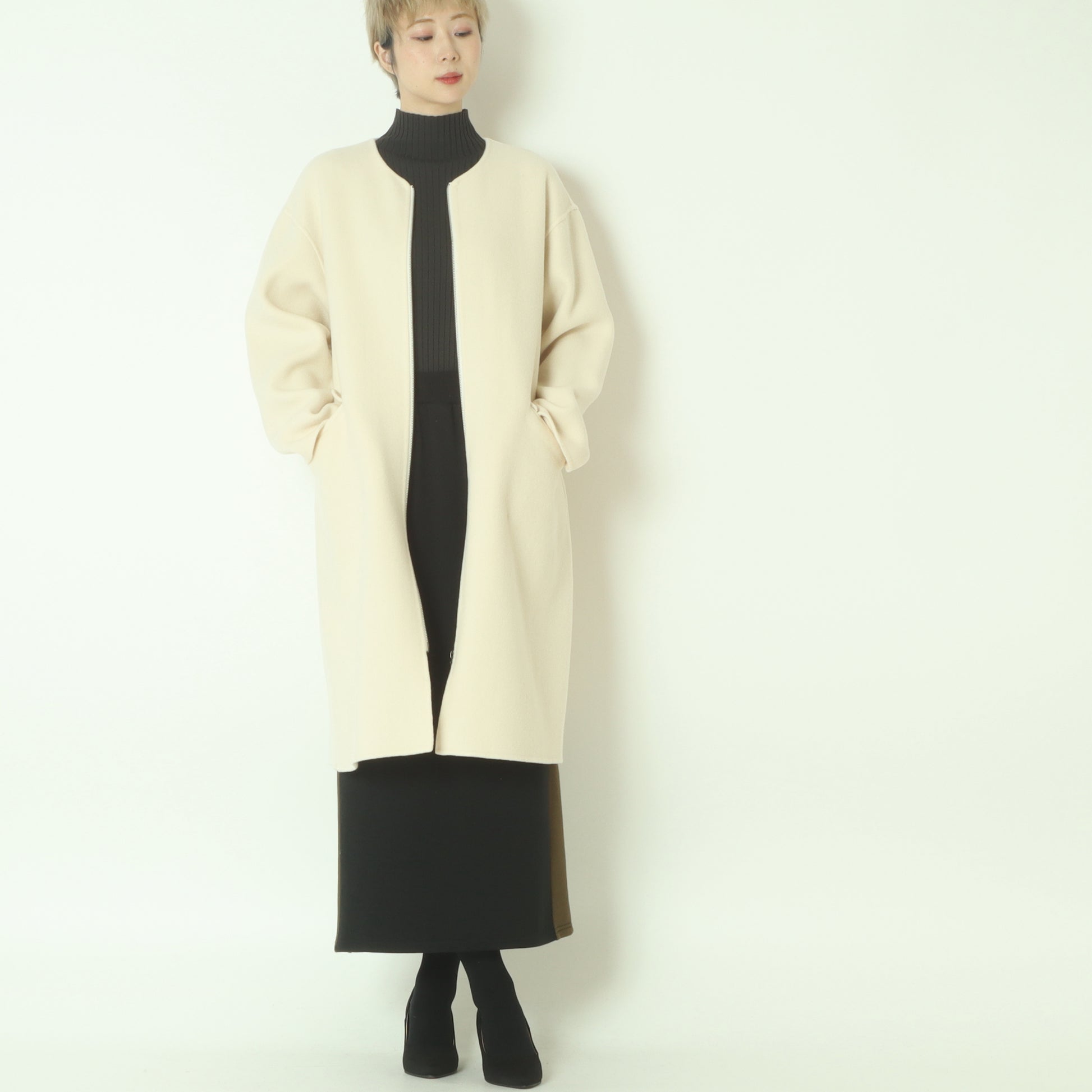 首元はすっきりとしたノーカラーデザインで、ストレートな綺麗めシルエットがシンプルながらも上品な印象を演出します。
