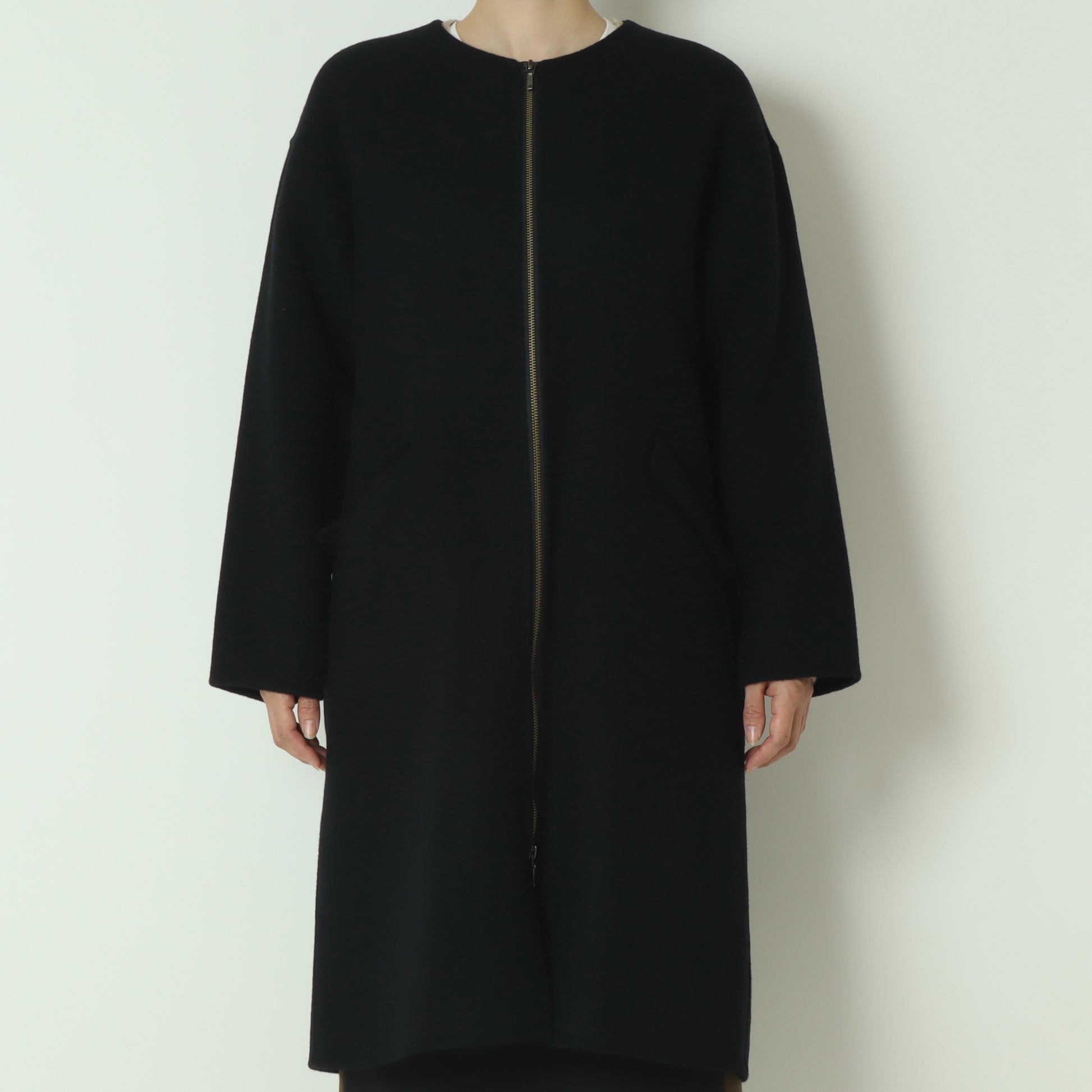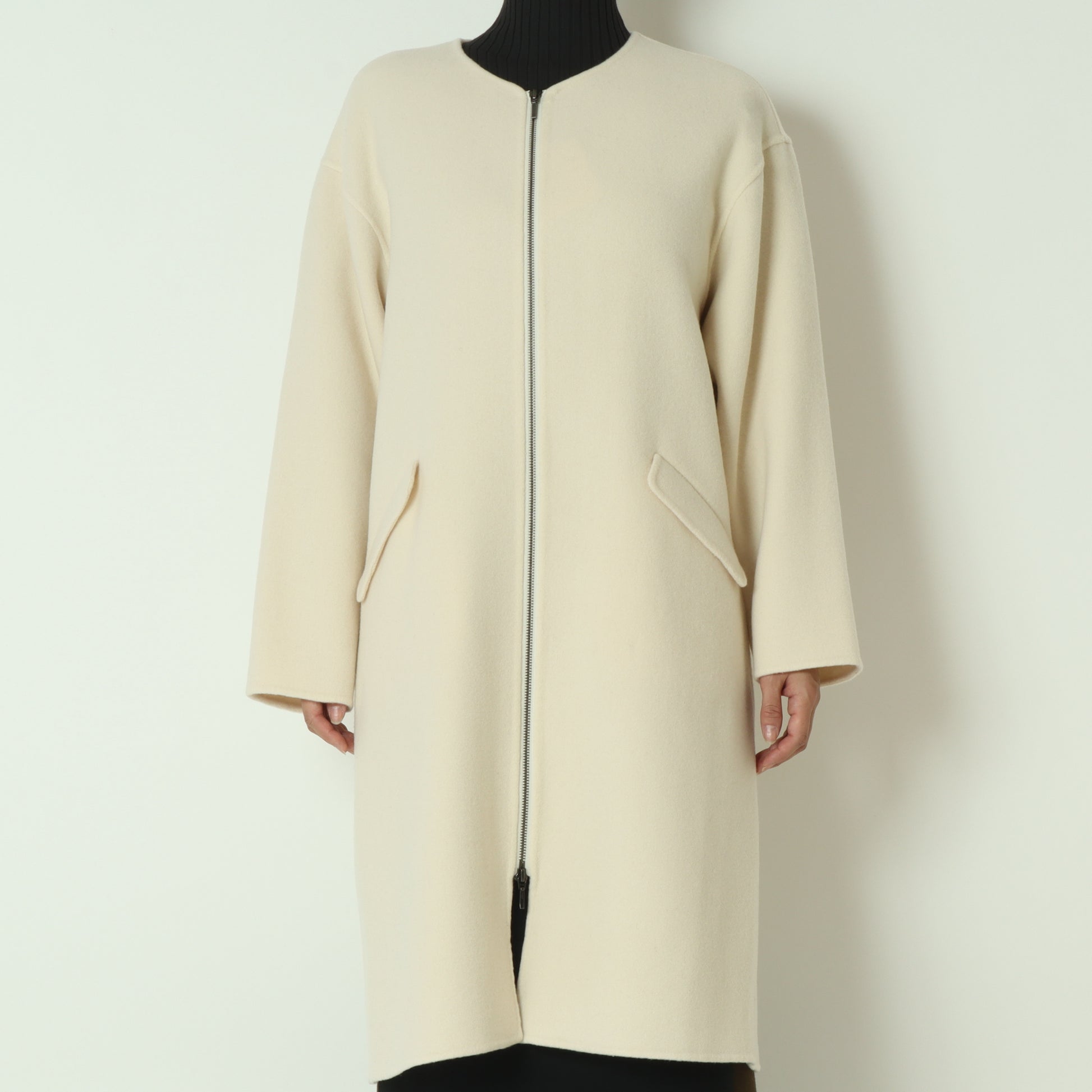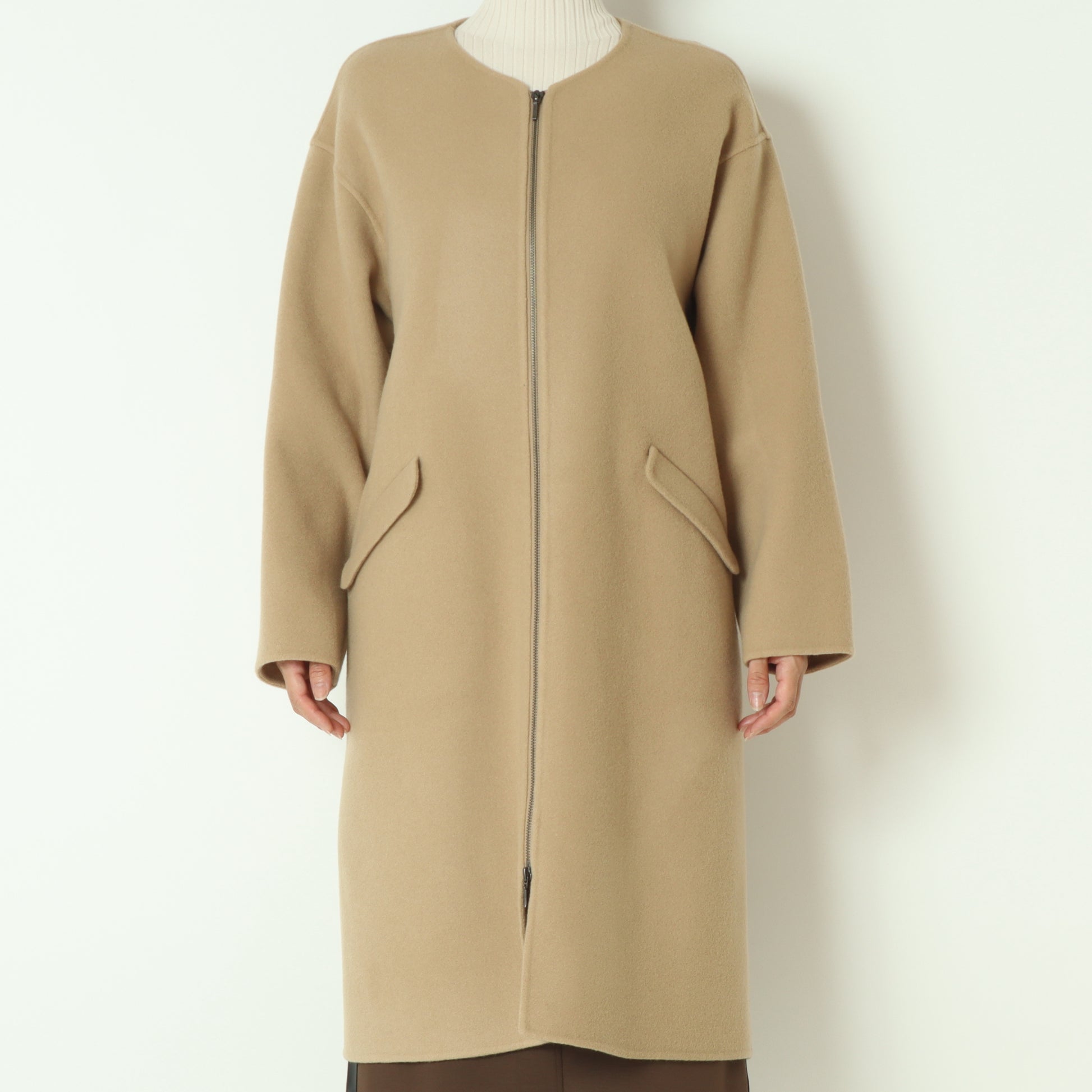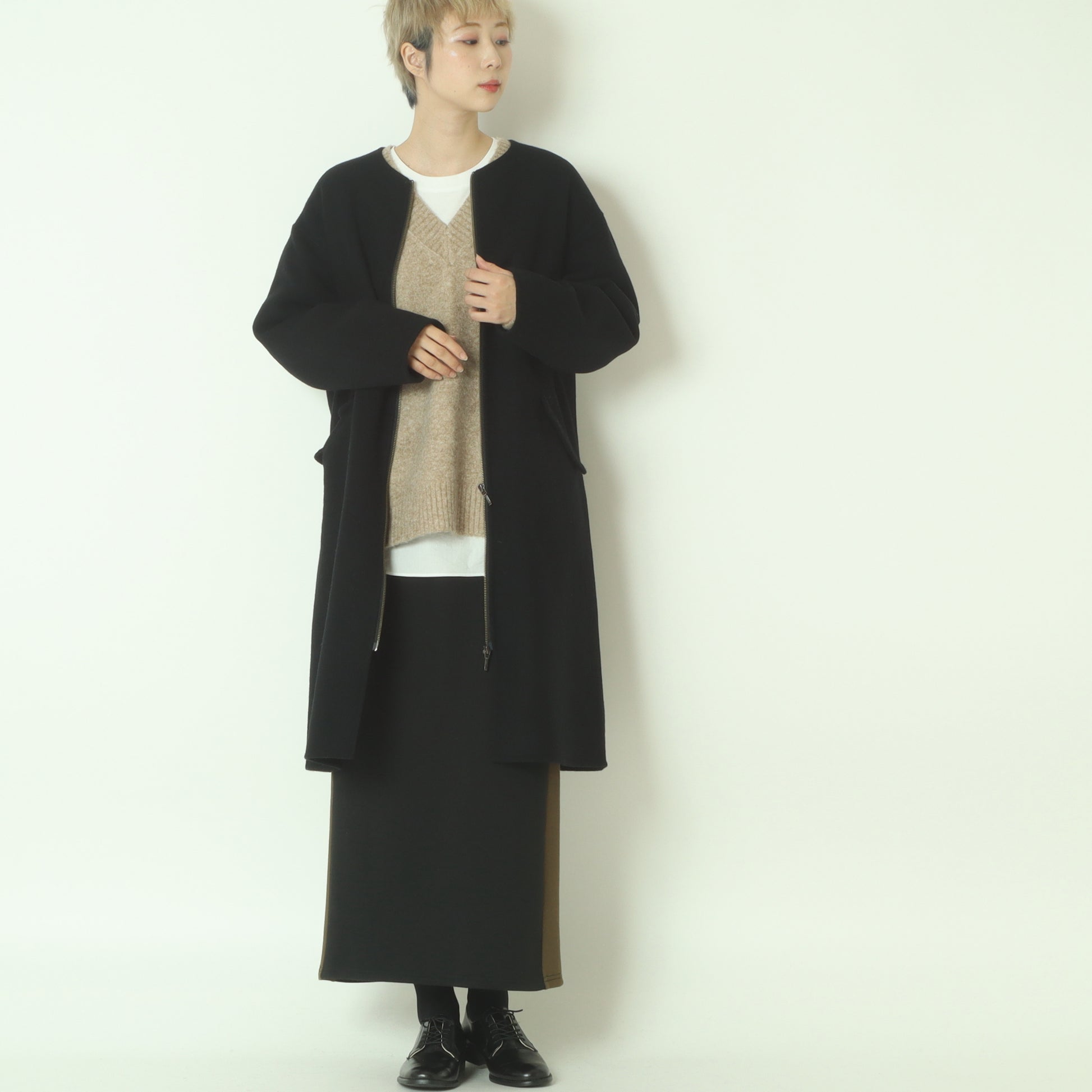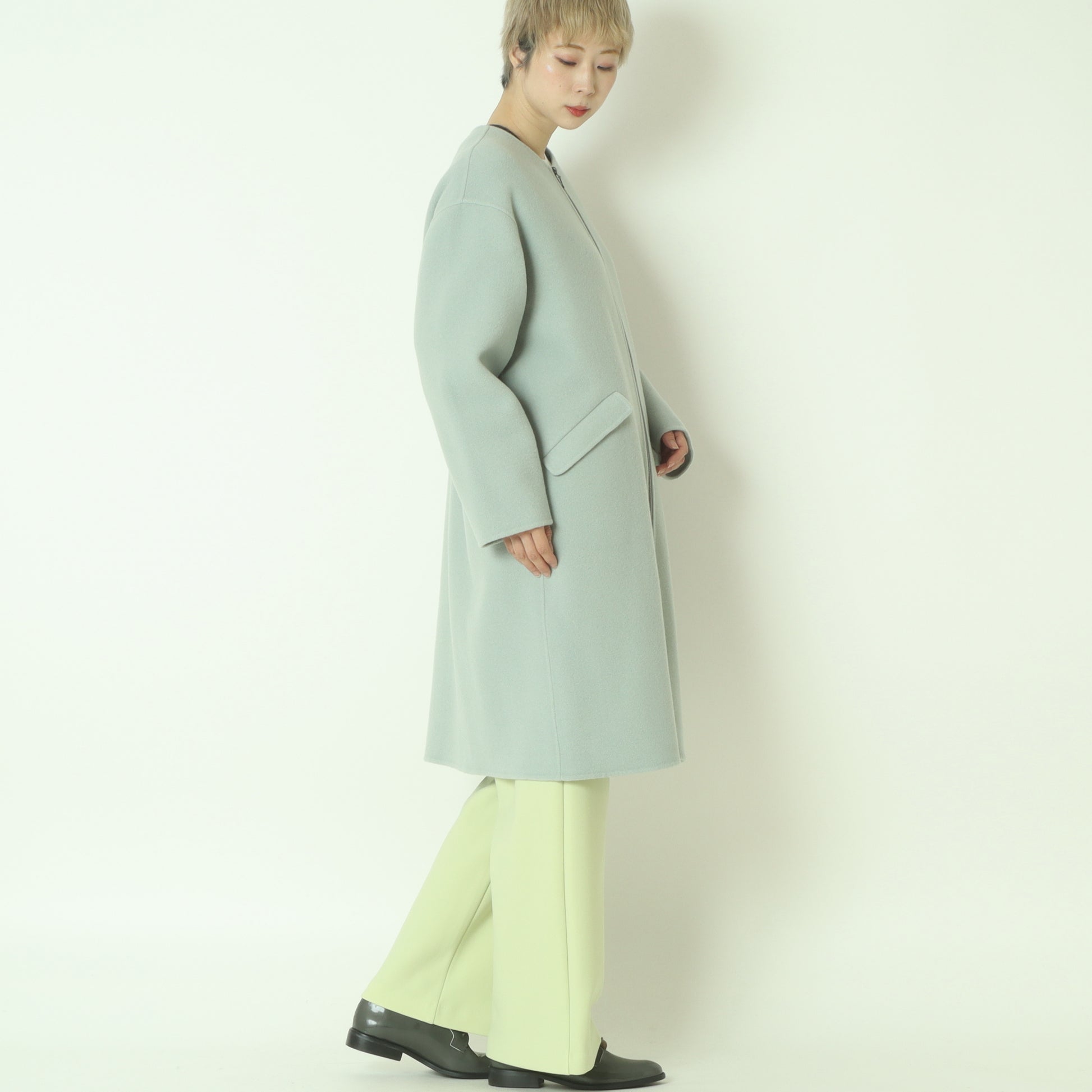 首元はすっきりとしたノーカラーデザインで、ストレートな綺麗めシルエットがシンプルながらも上品な印象を演出します。