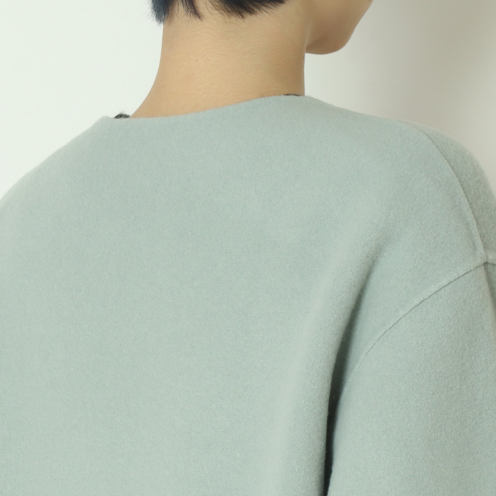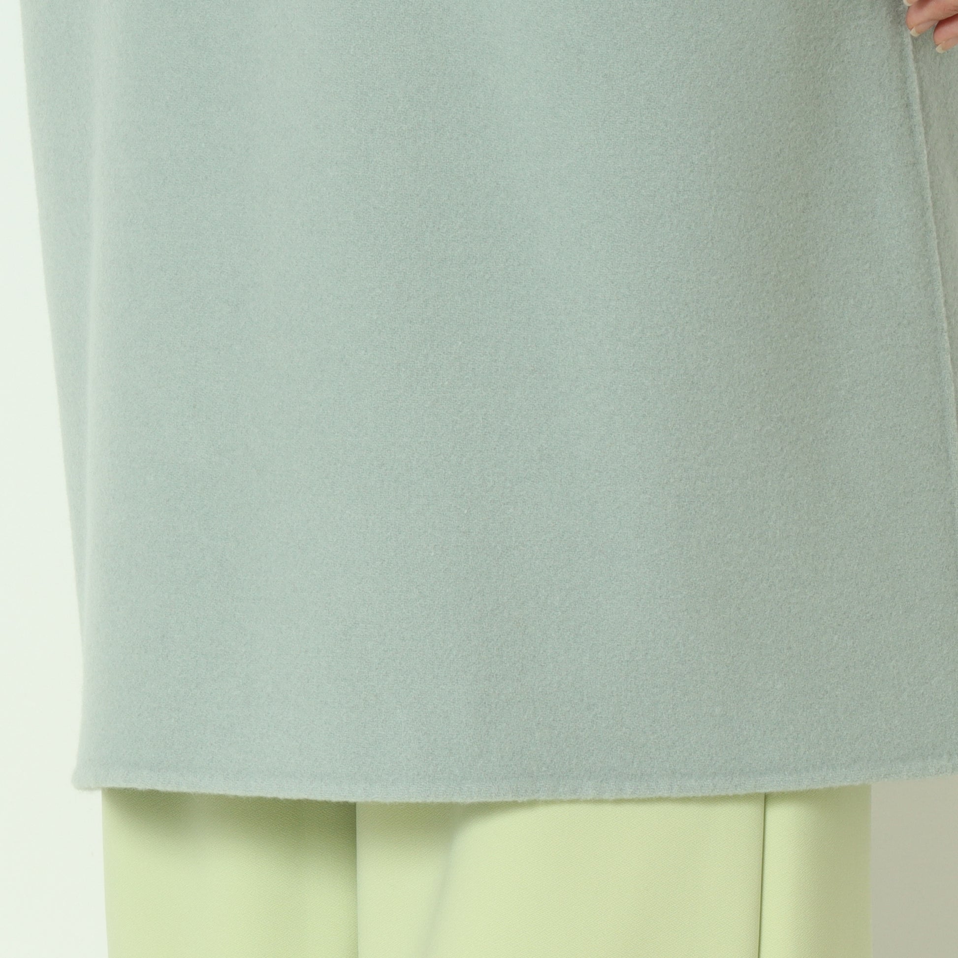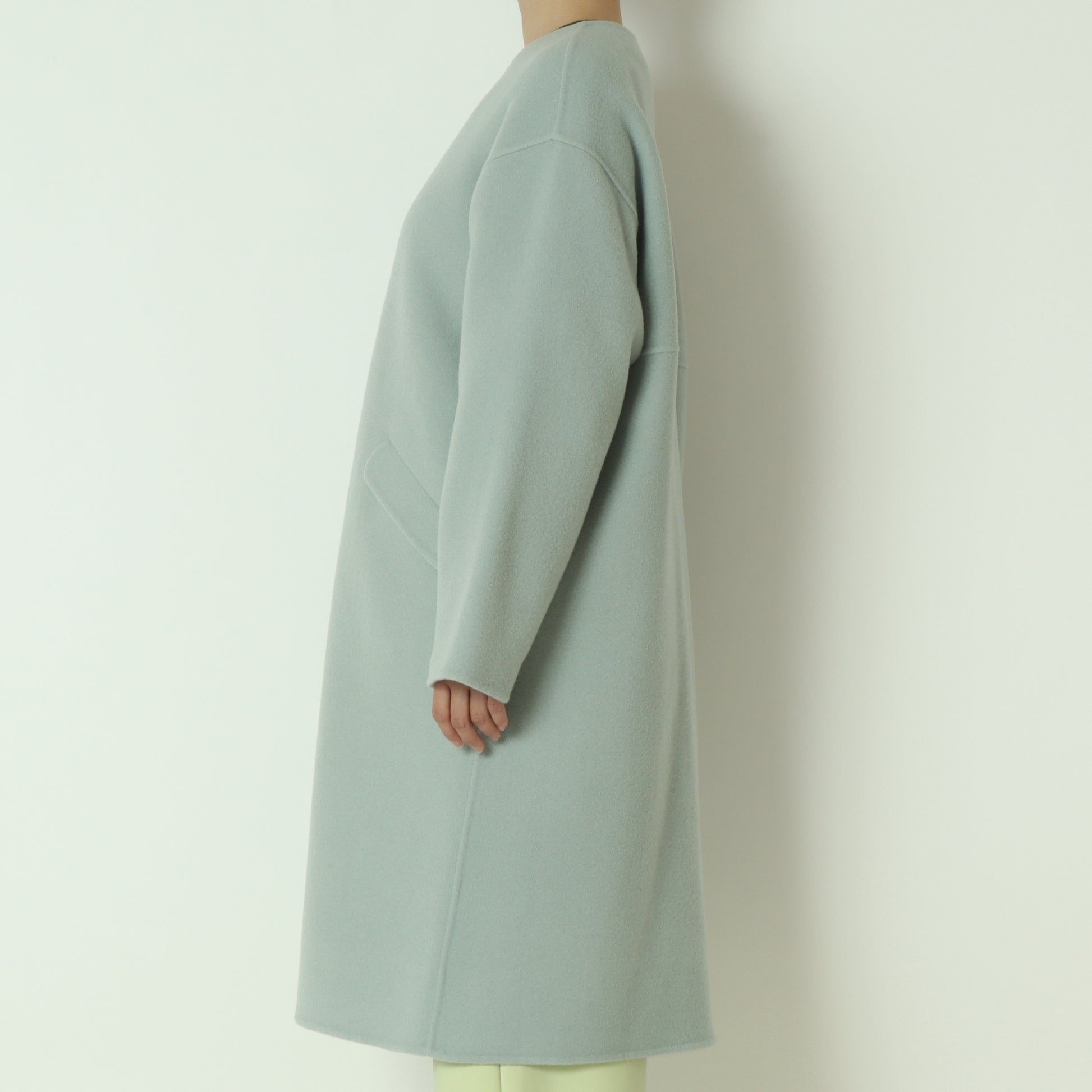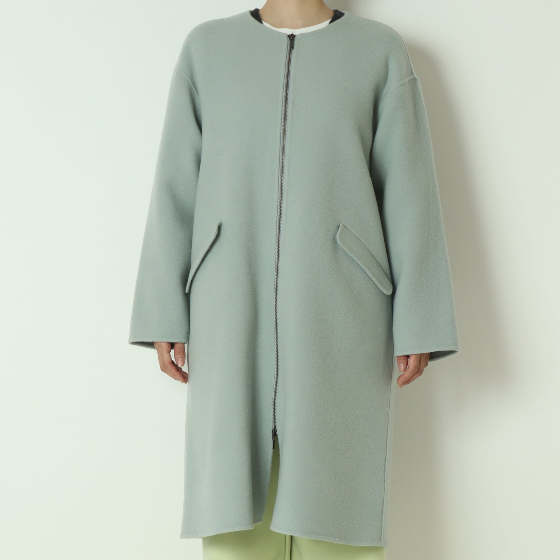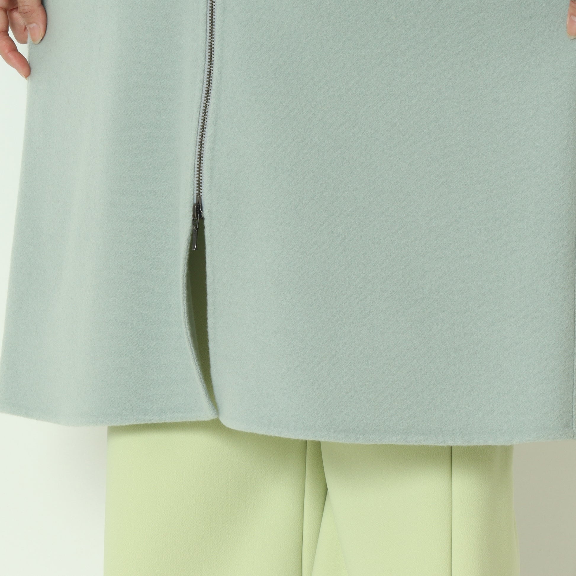 首元はすっきりとしたノーカラーデザインで、ストレートな綺麗めシルエットがシンプルながらも上品な印象を演出します。