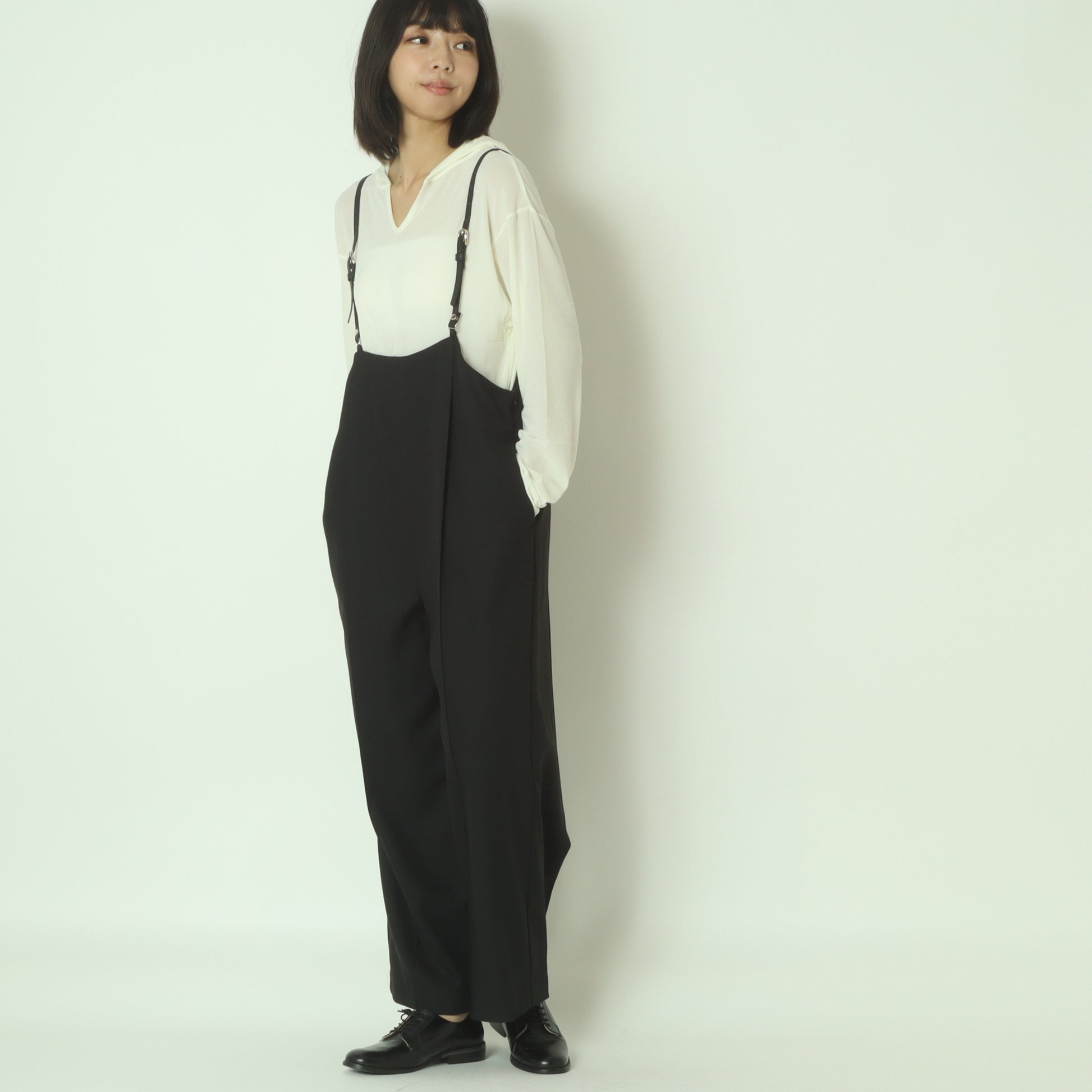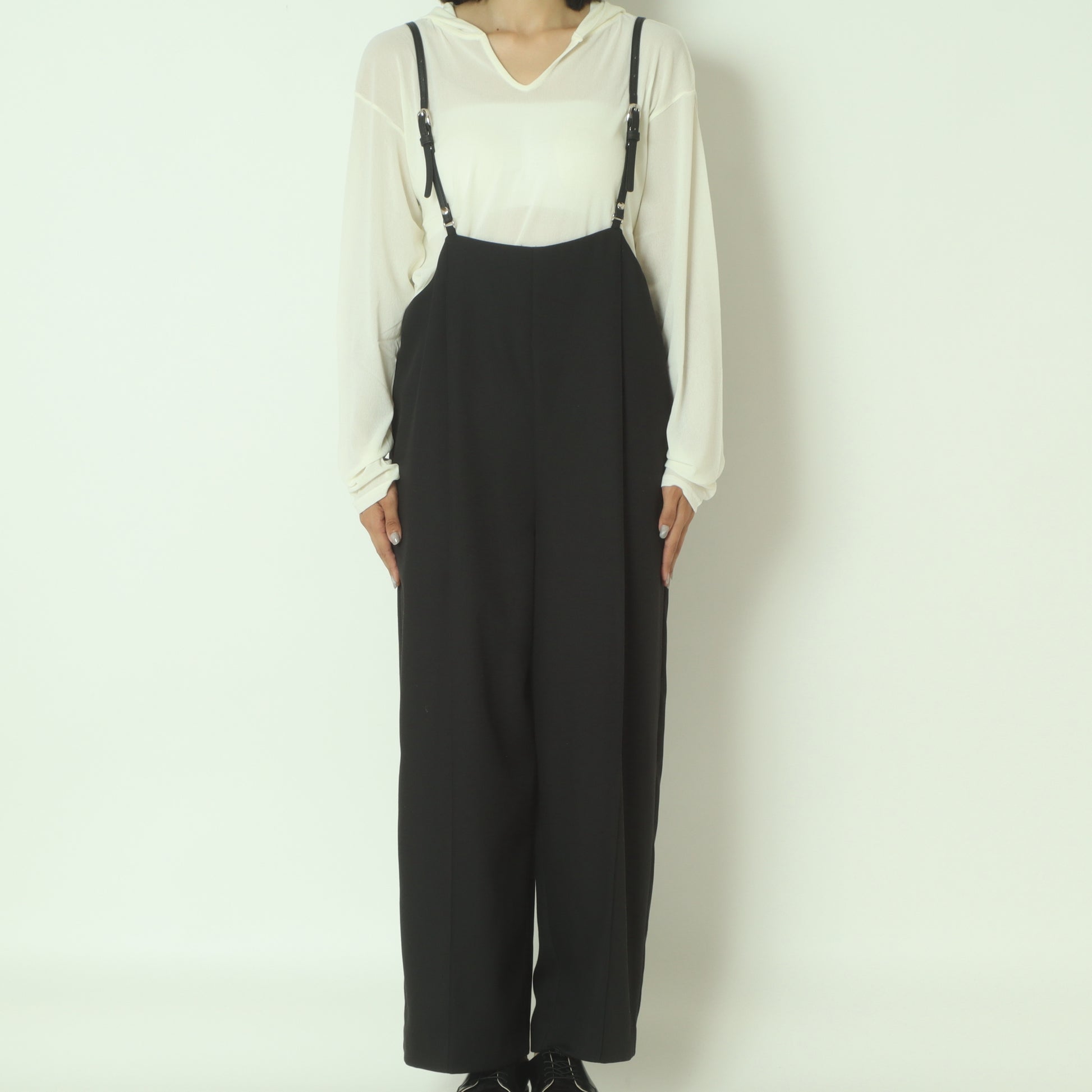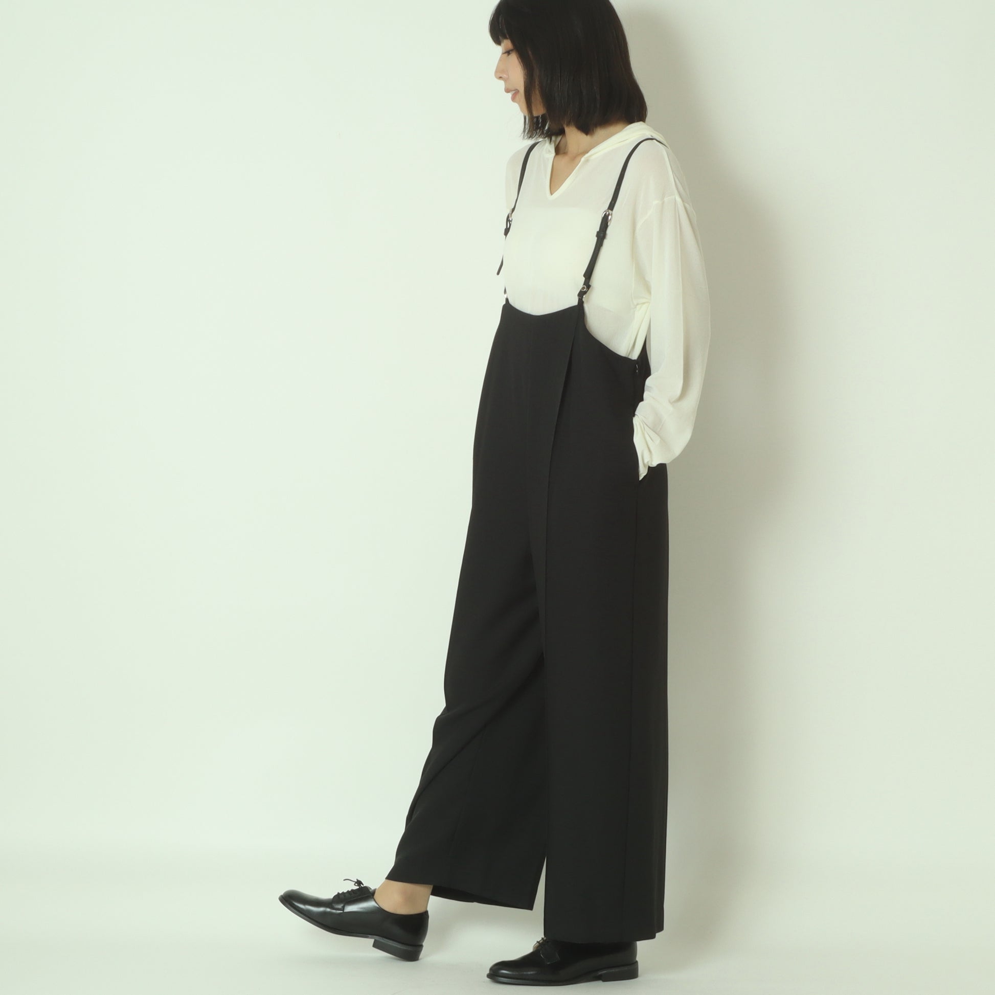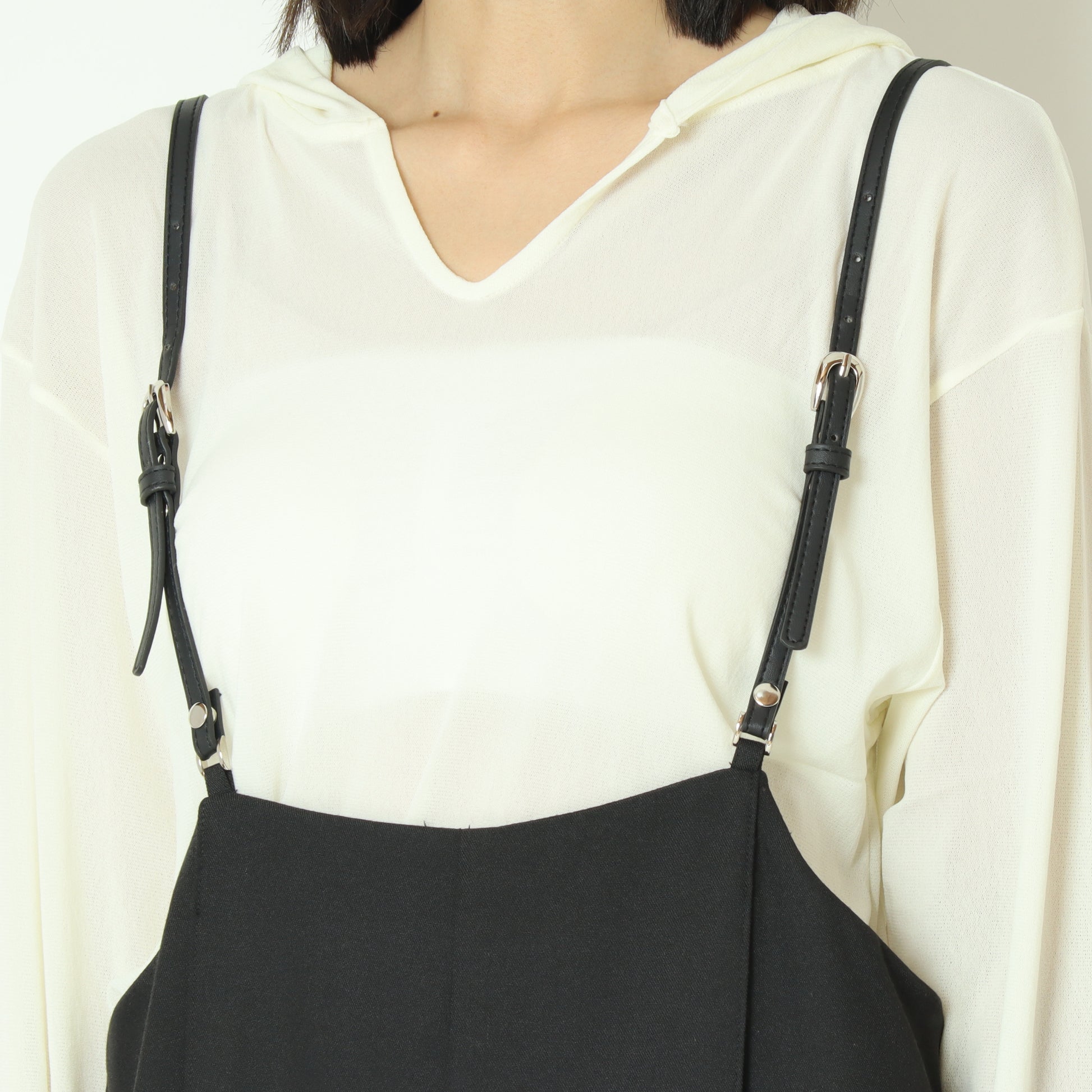 フェイクレザーの細いベルトがポイントのサスペンダーパンツ。