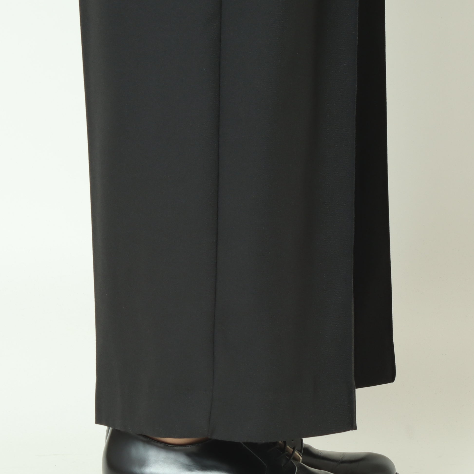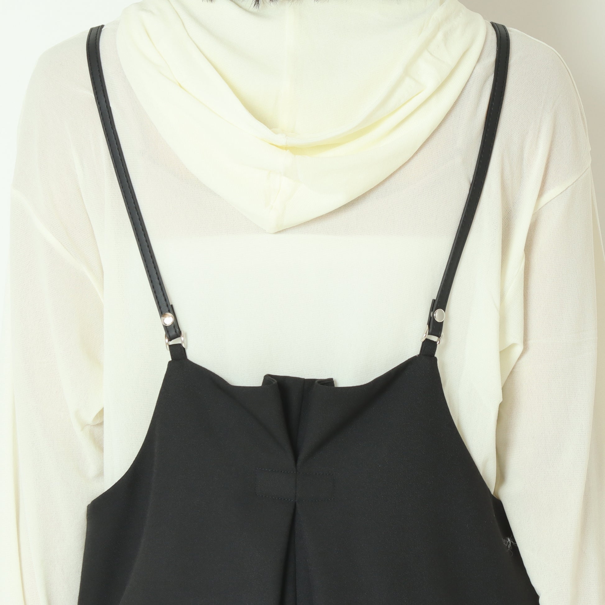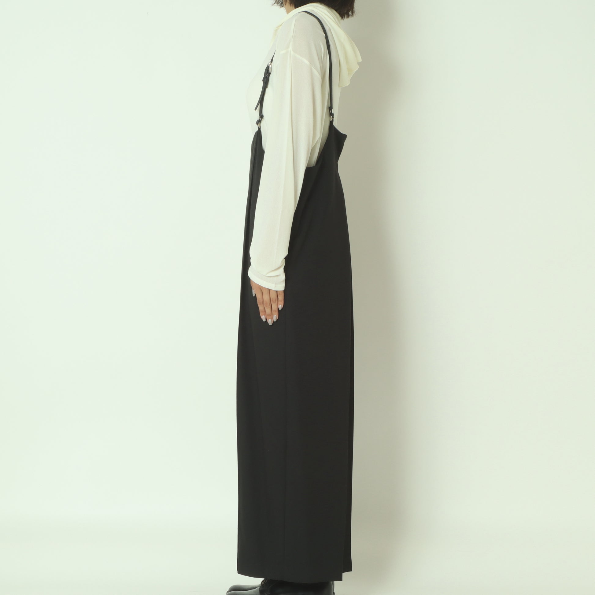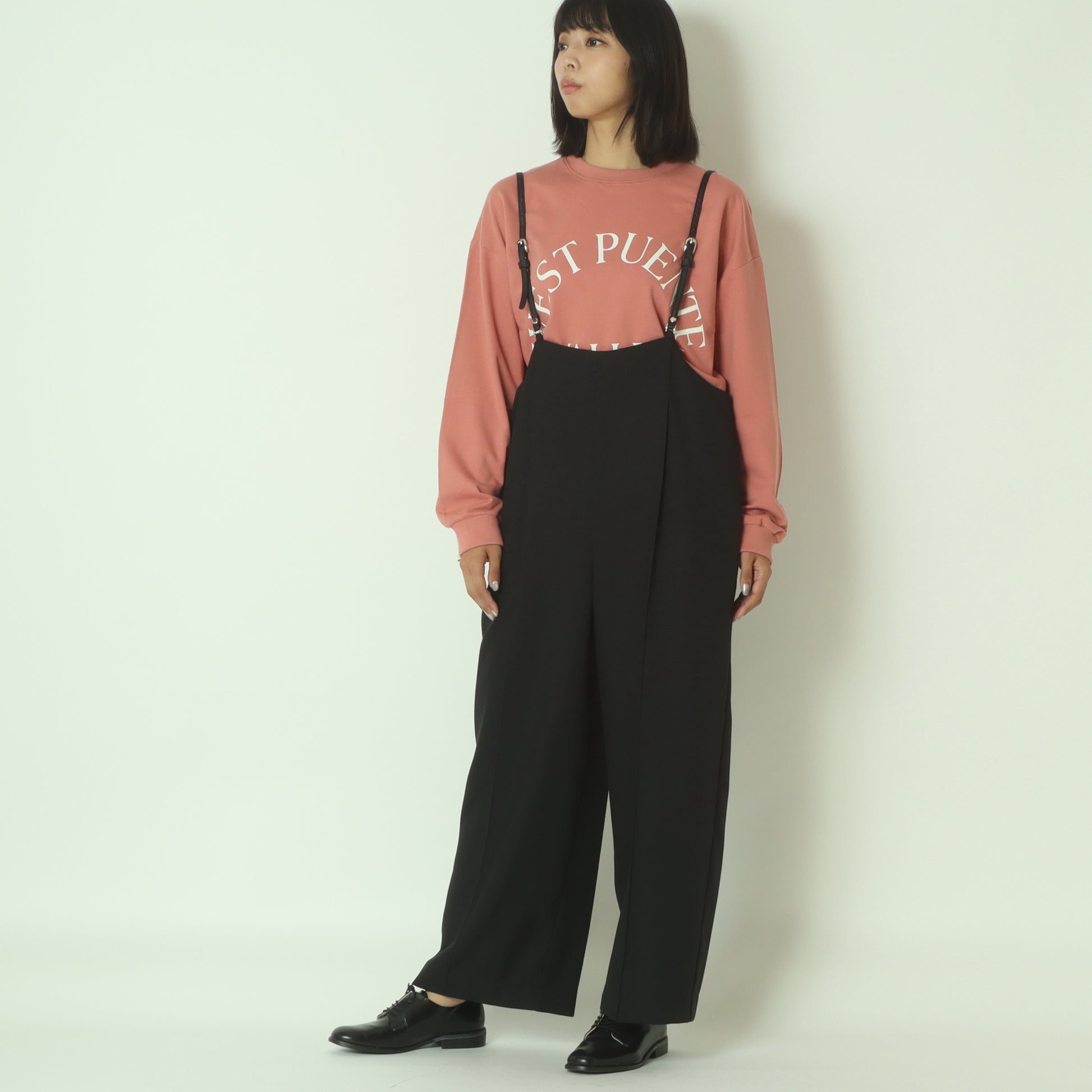 フェイクレザーの細いベルトがポイントのサスペンダーパンツ。