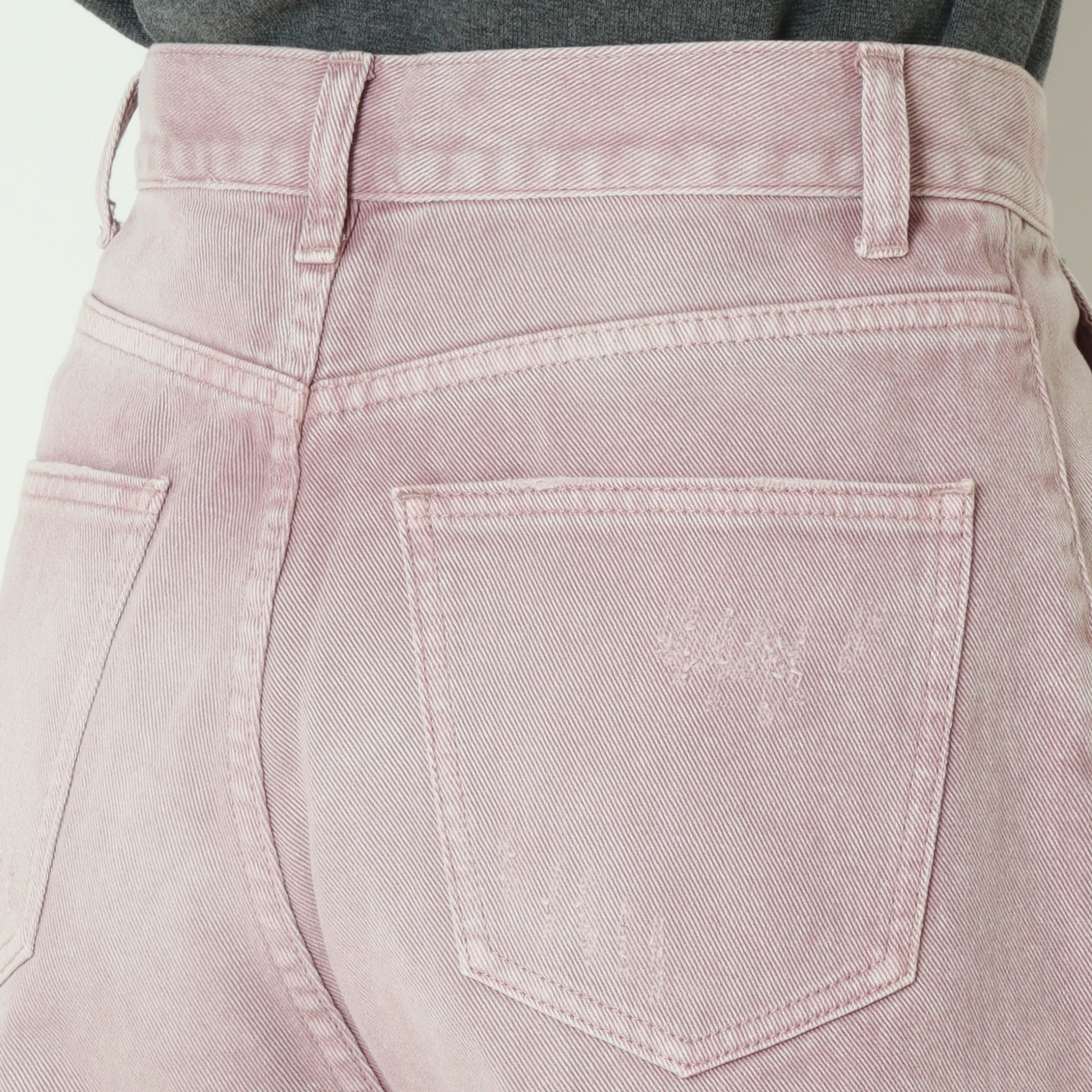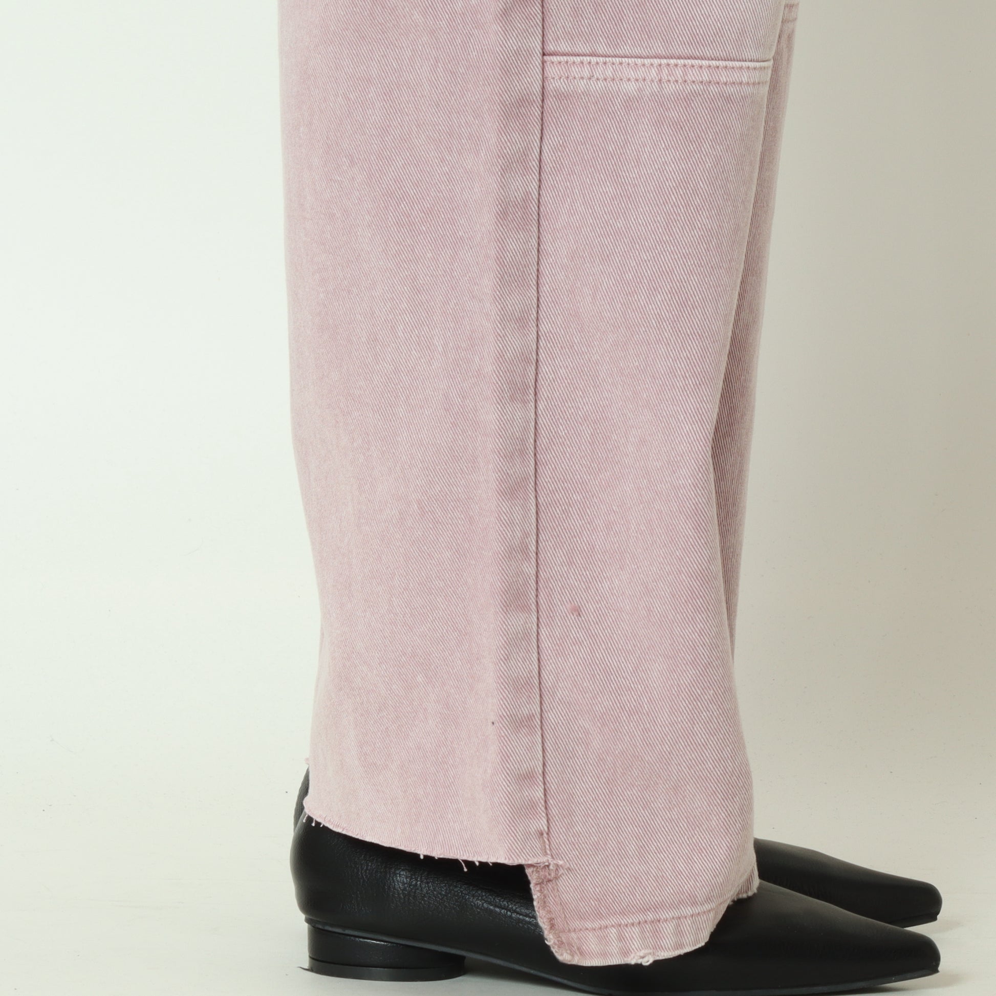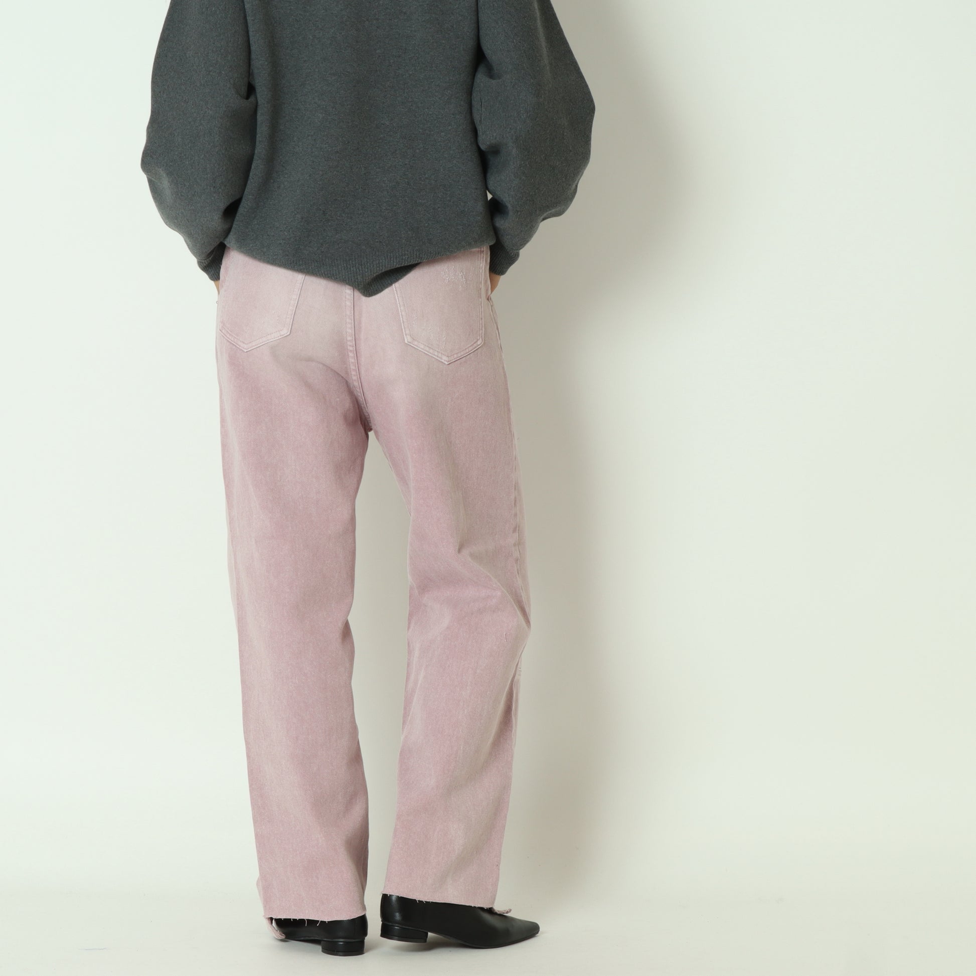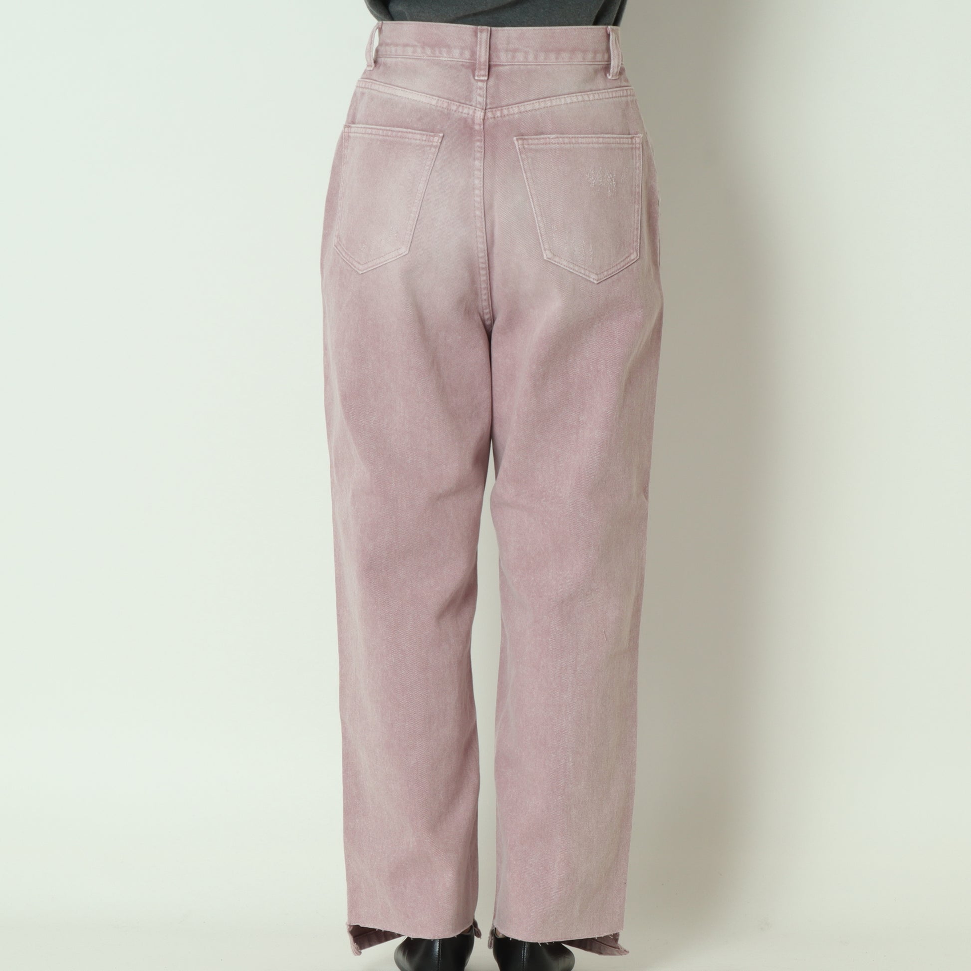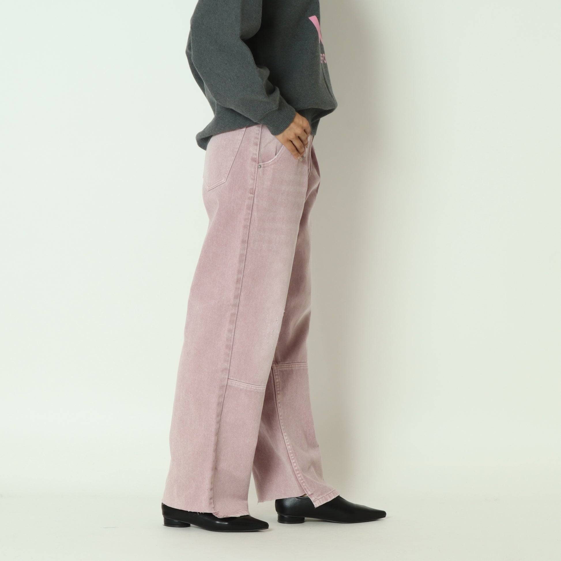 膝下の切り替えデザインや、さりげないダメージ加工など、細部までこだわった一着です。