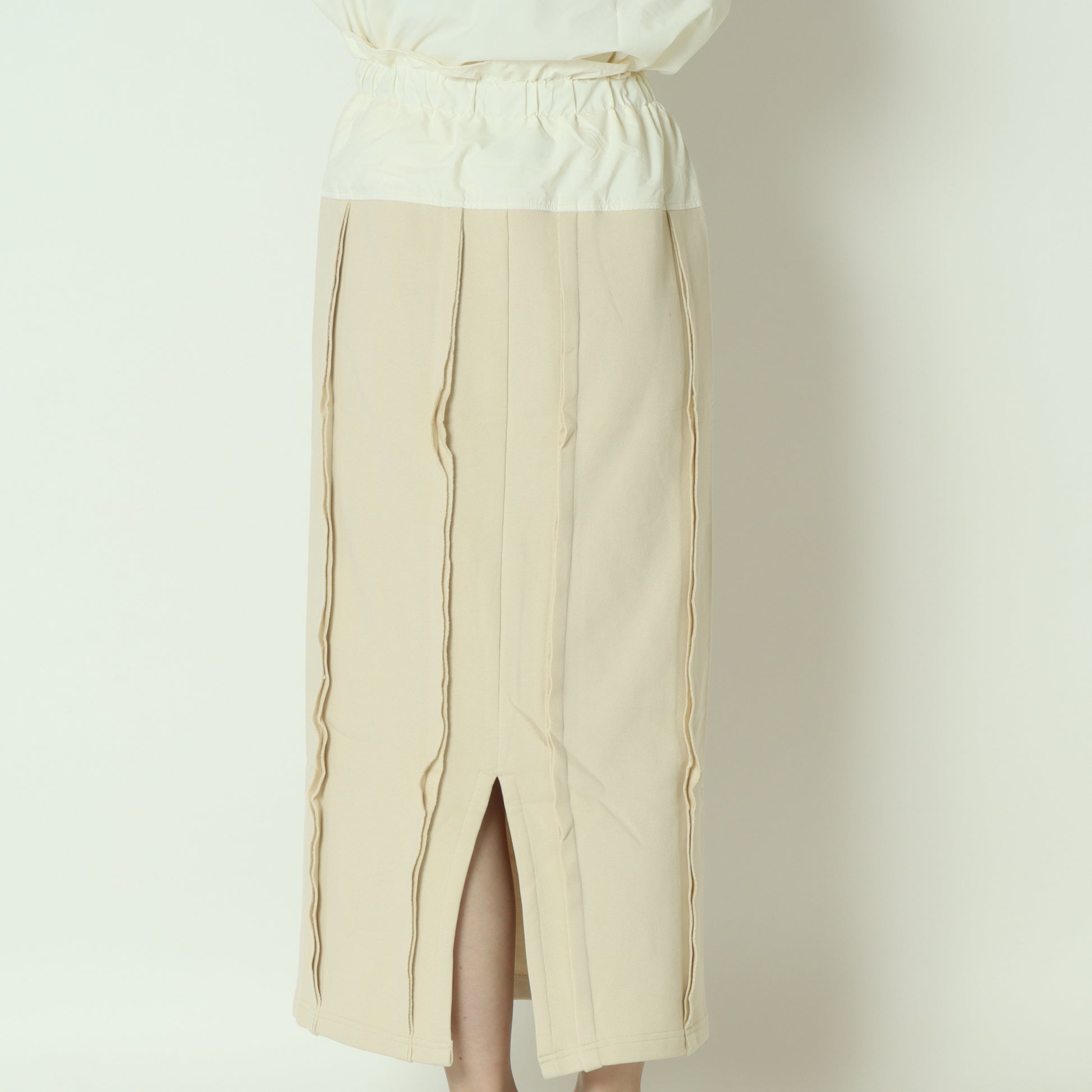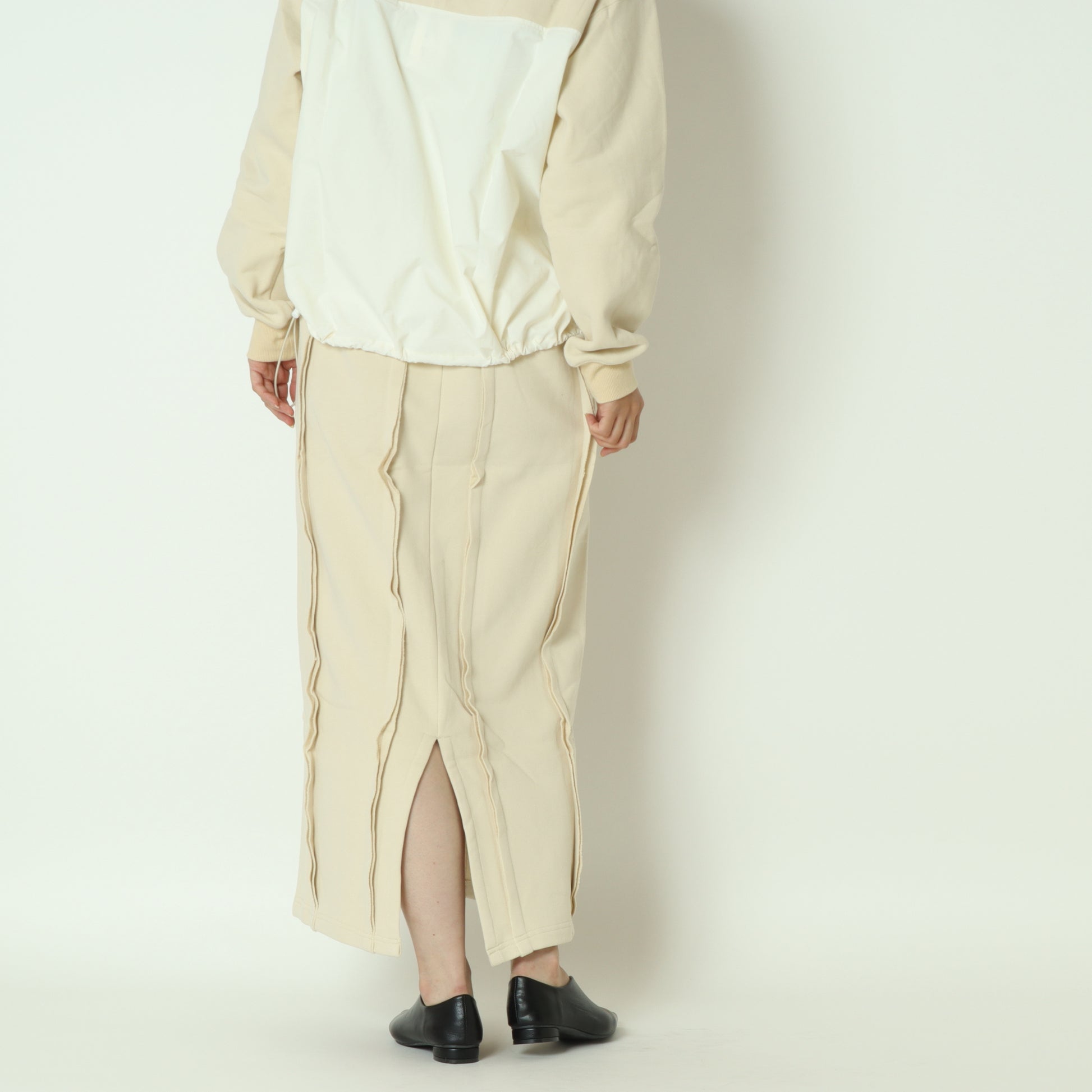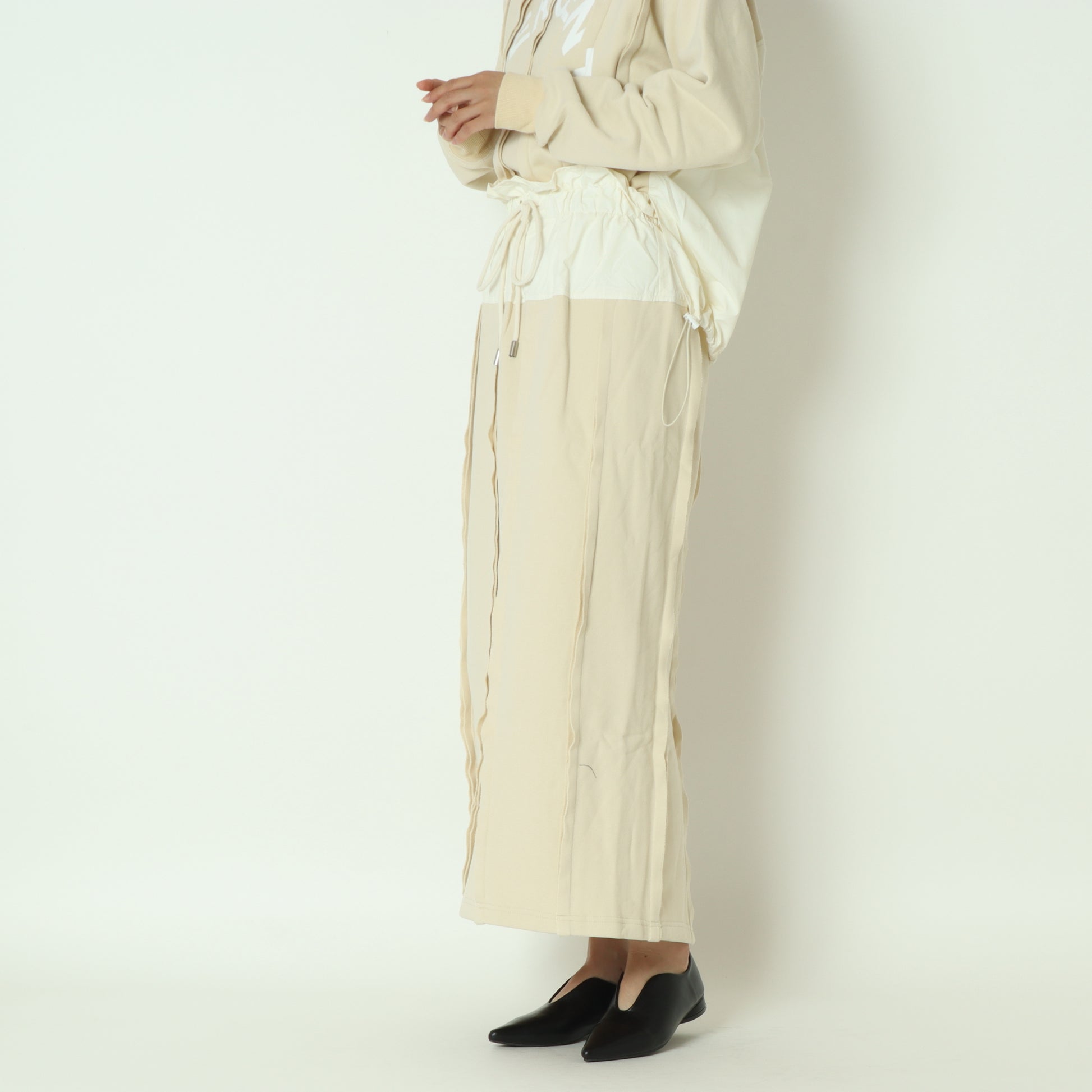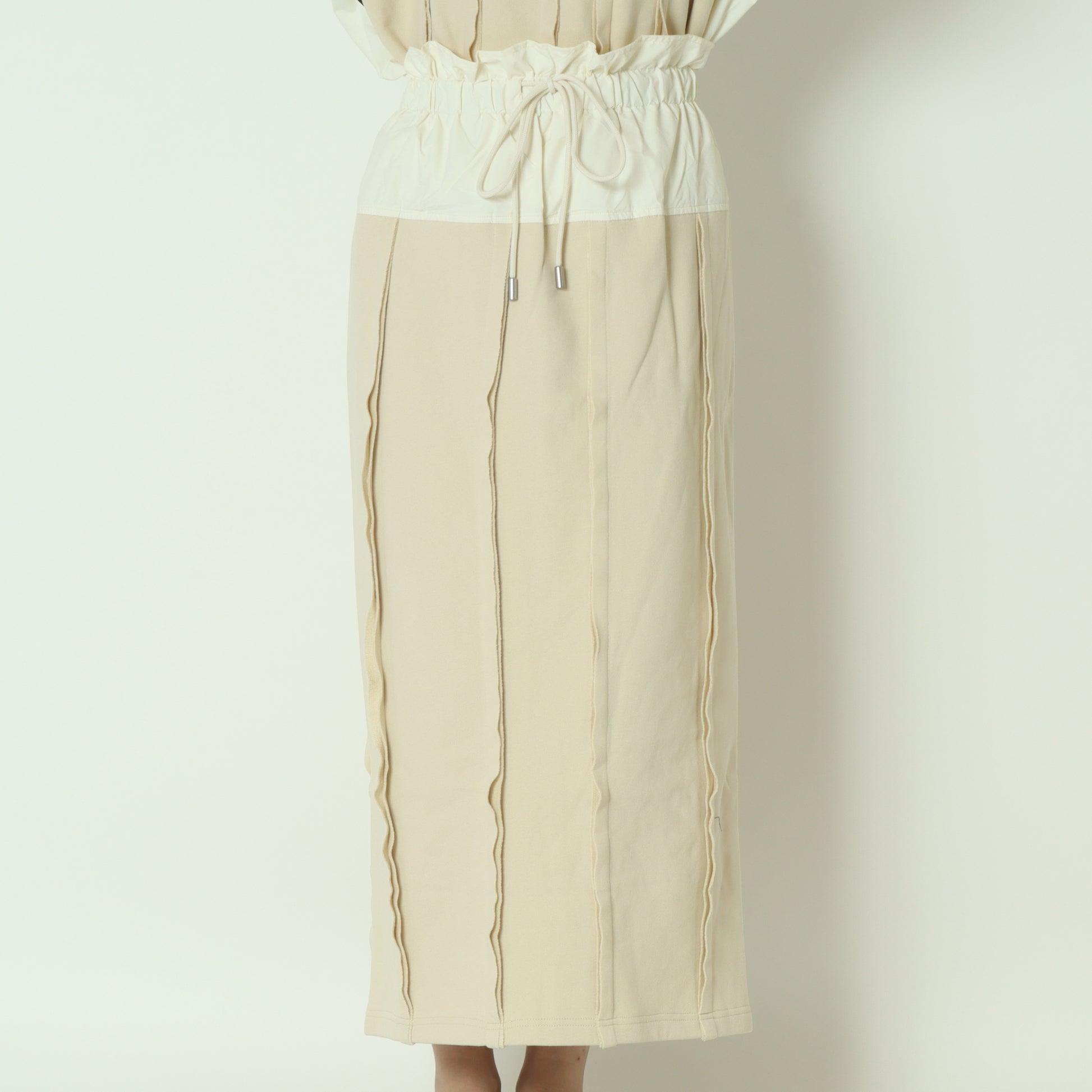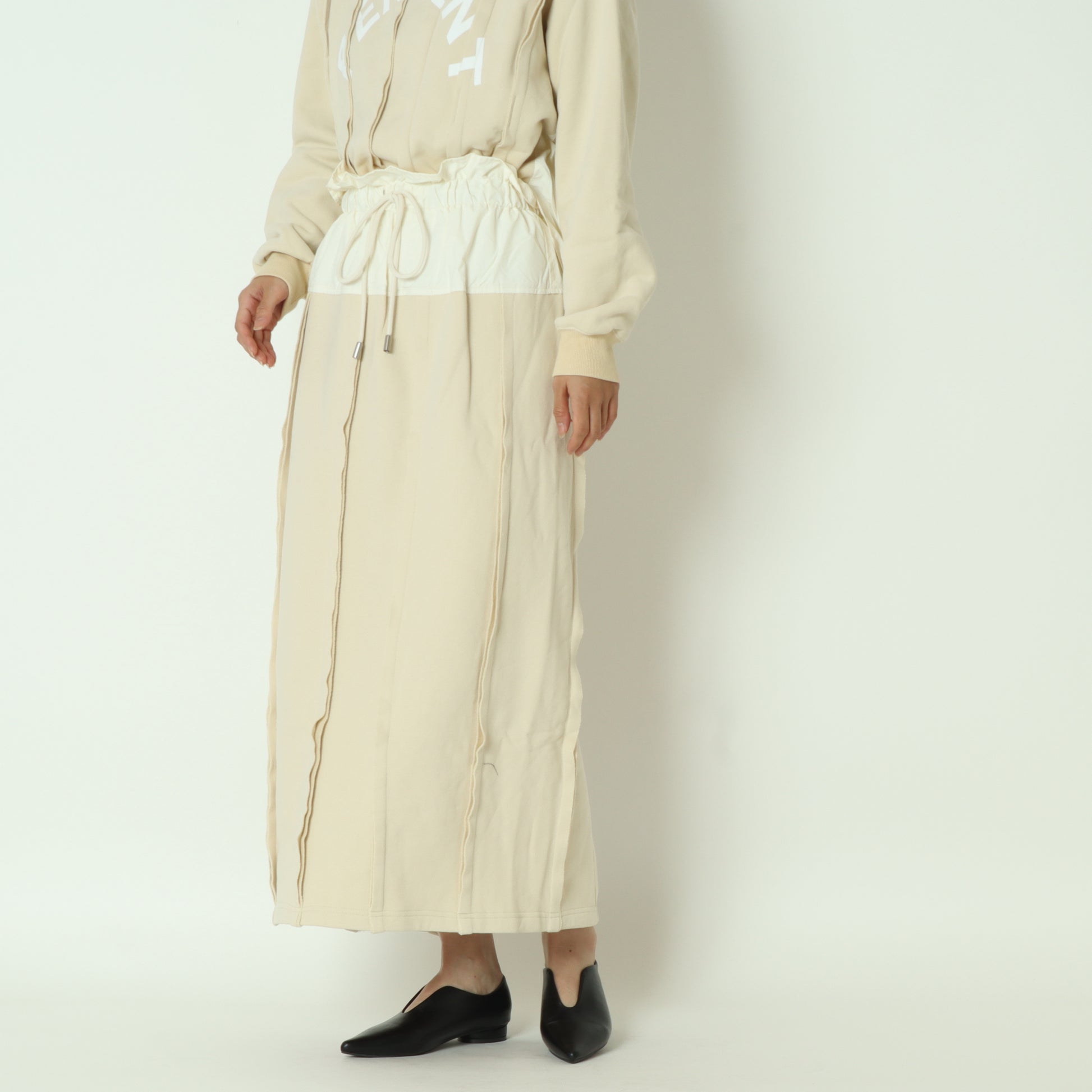 異素材をドッキングしたデザインのスウェットロングスカート。