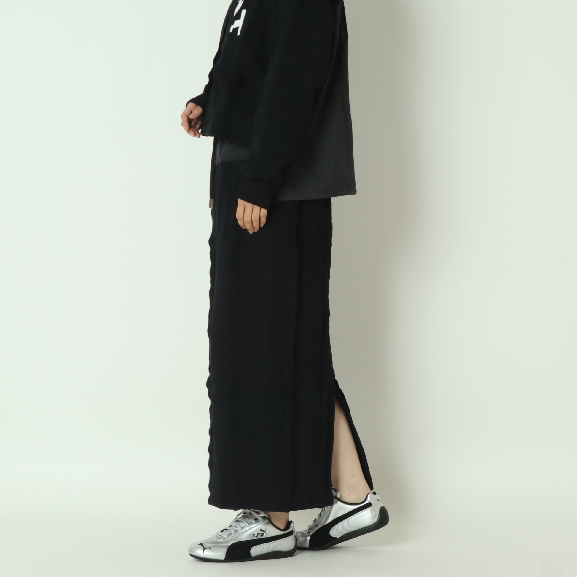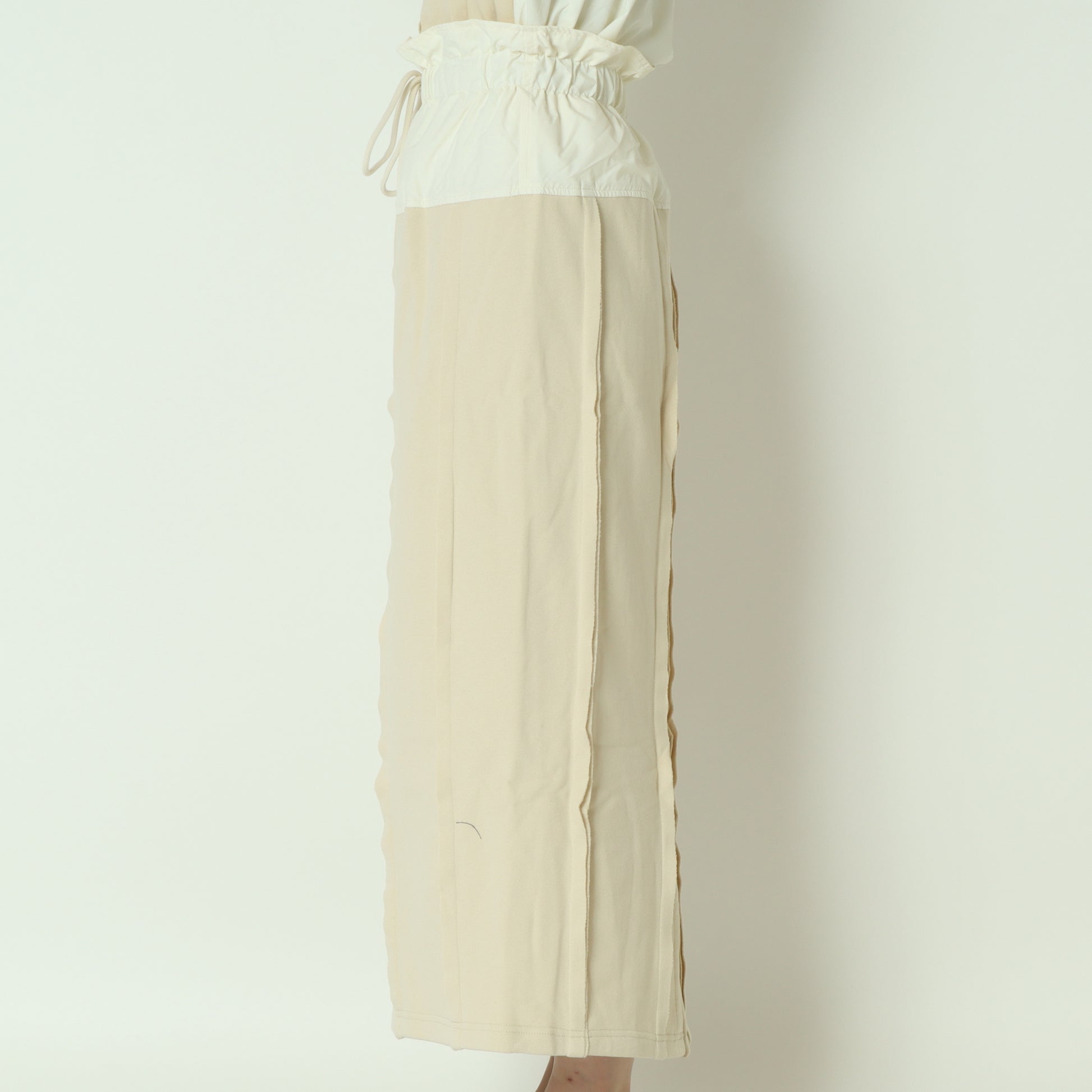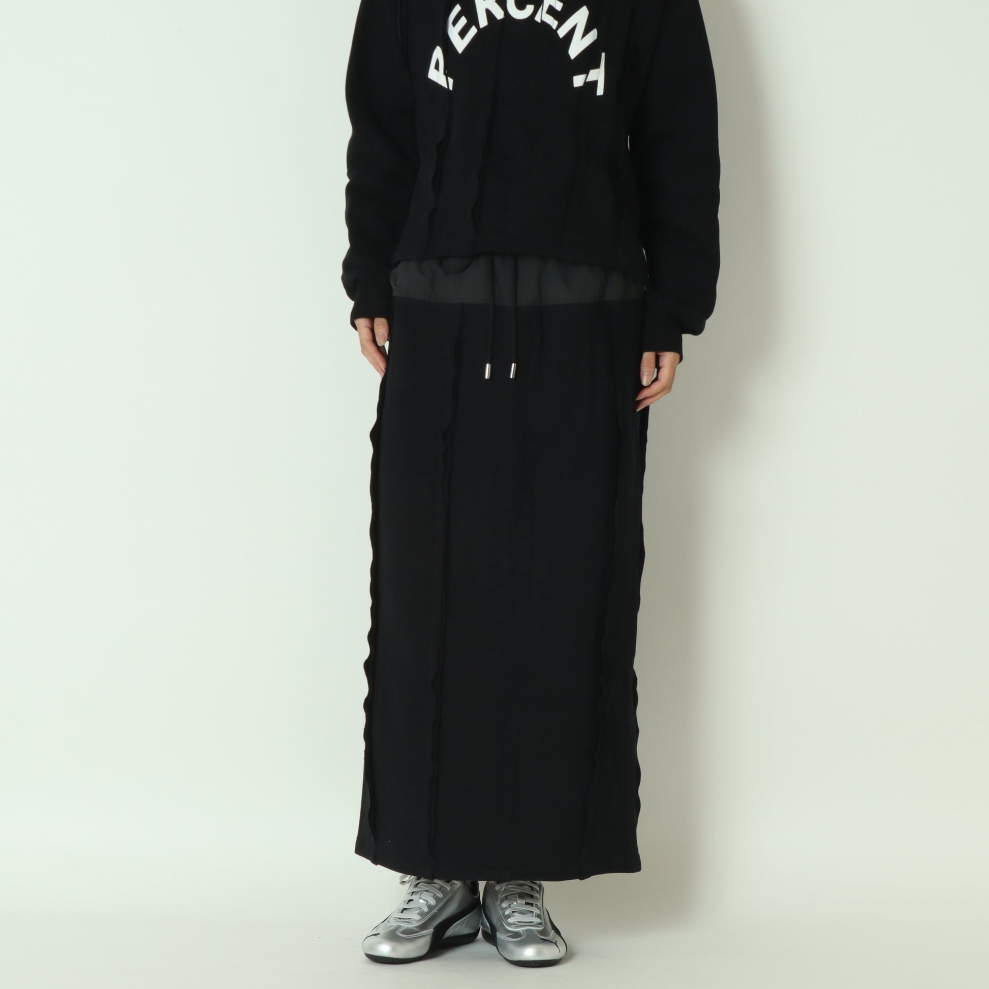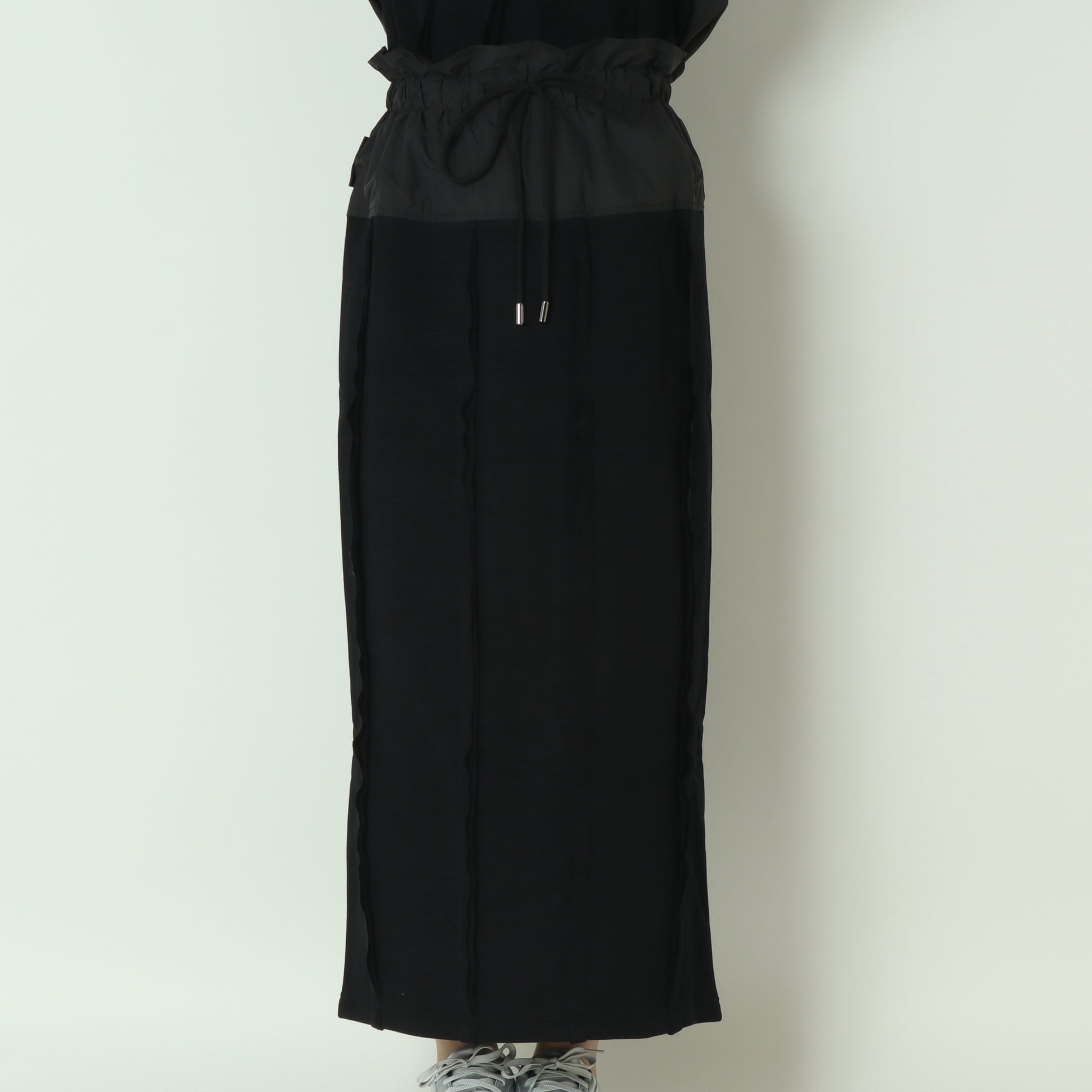 異素材をドッキングしたデザインのスウェットロングスカート。