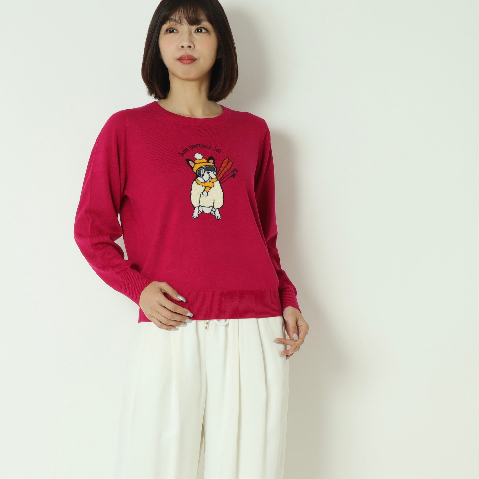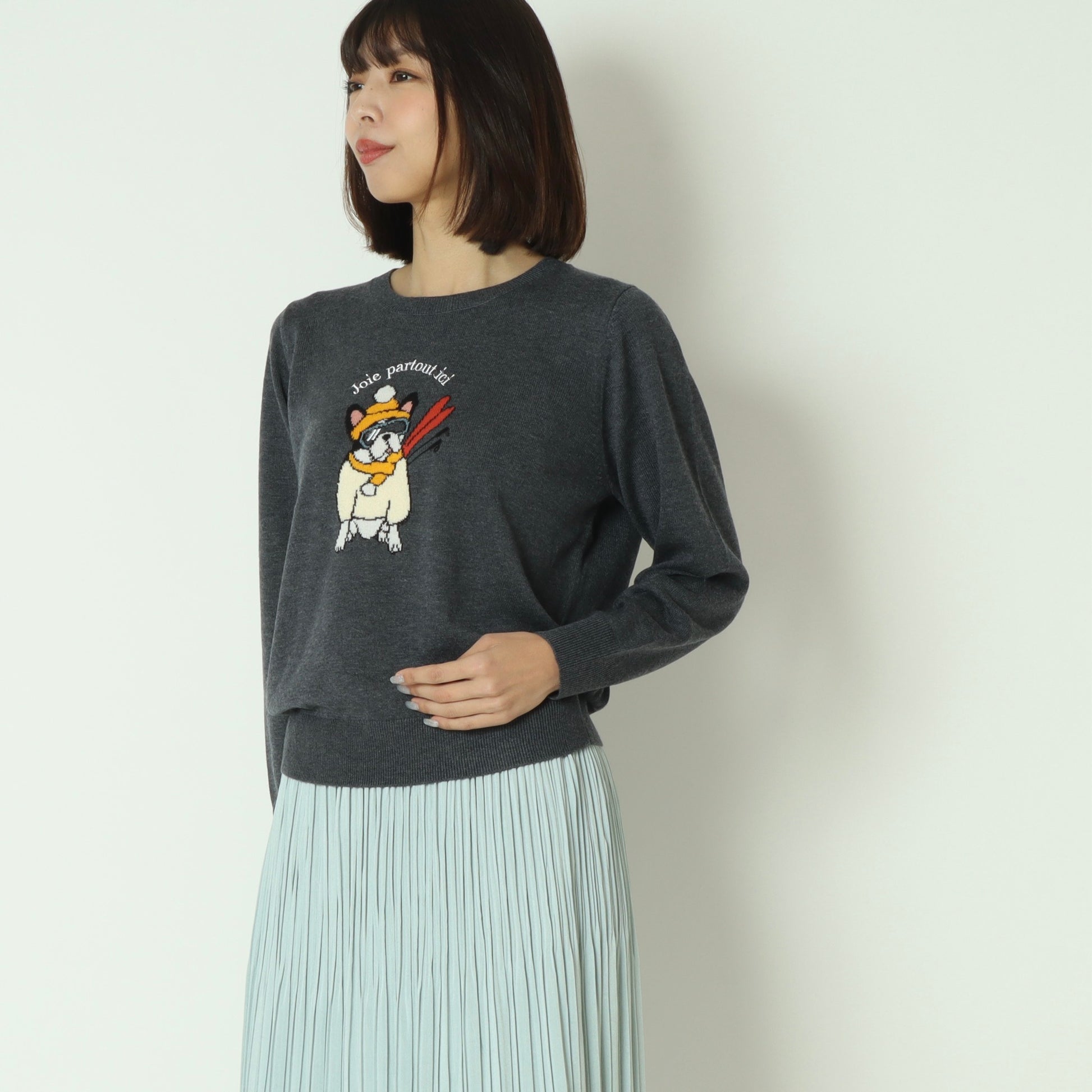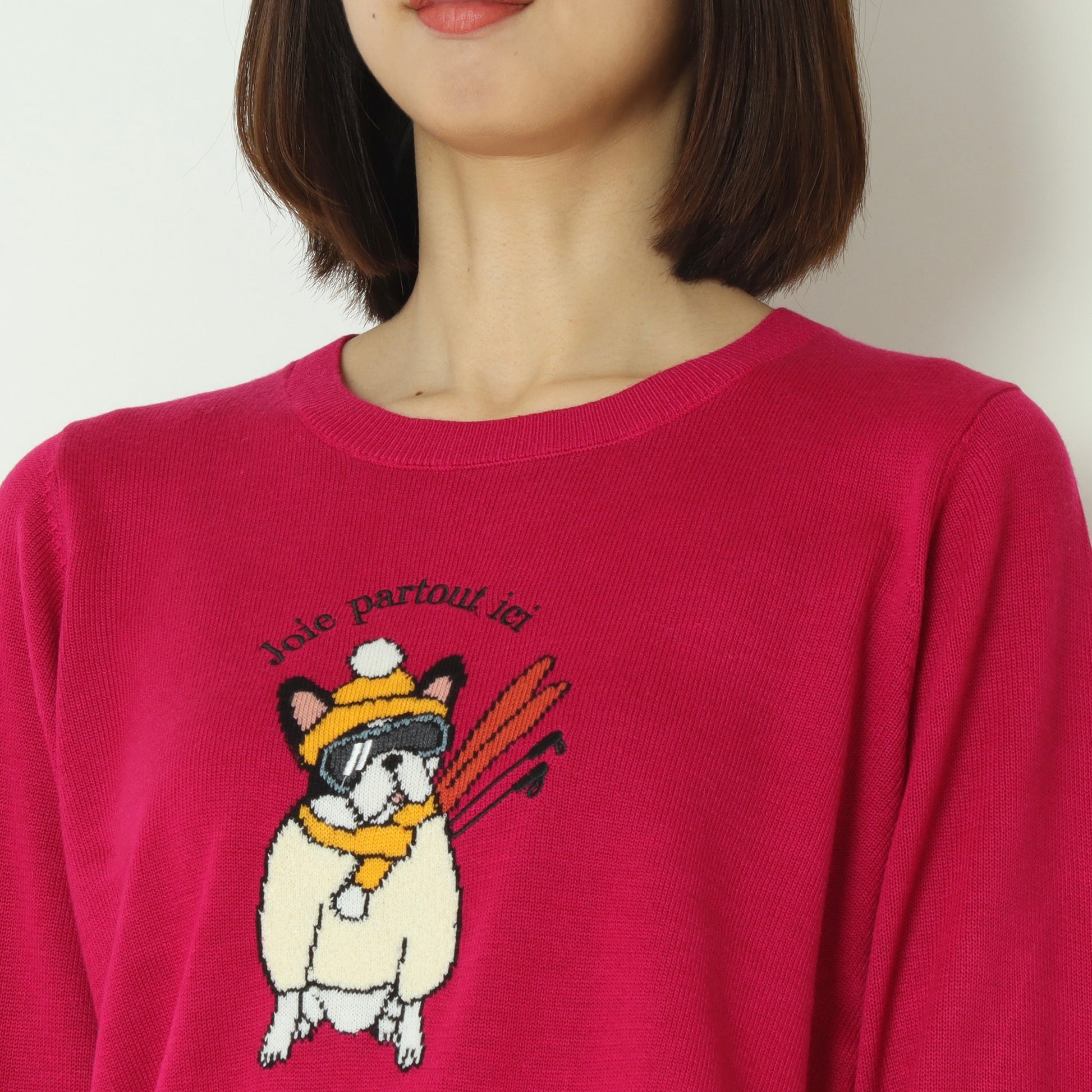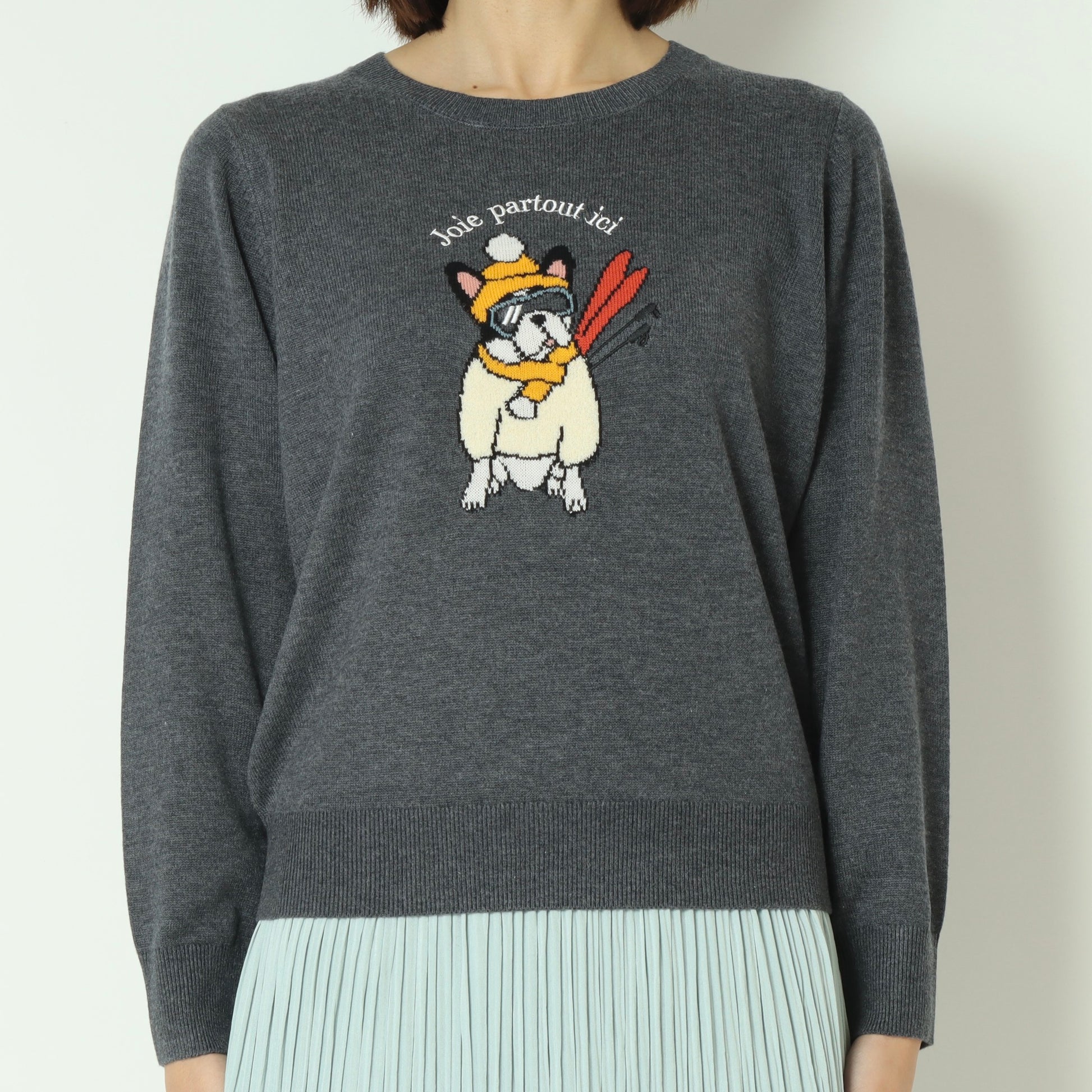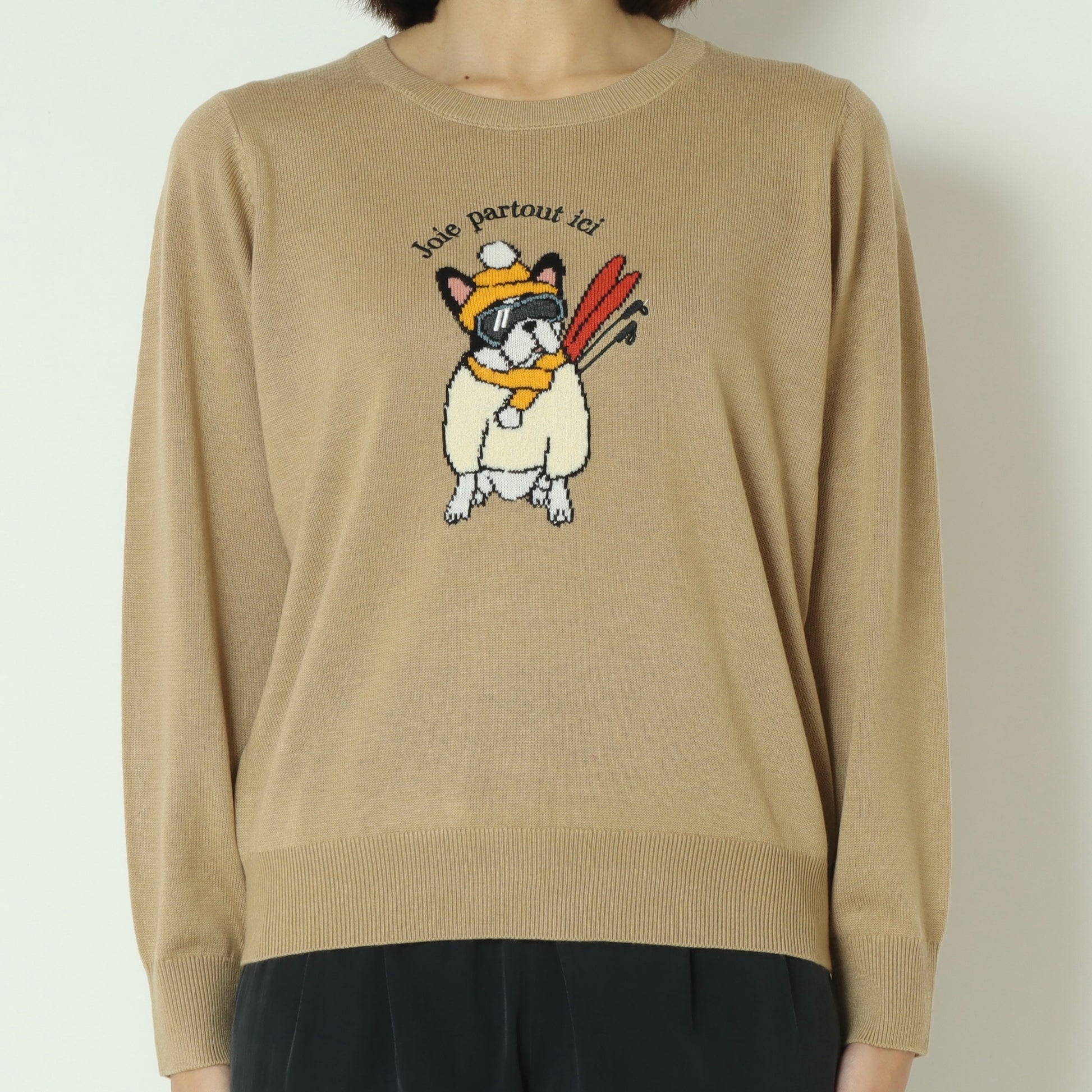 スキーウェアを着たブルドッグデザインがアクセントのインターシャニットプルオーバー。