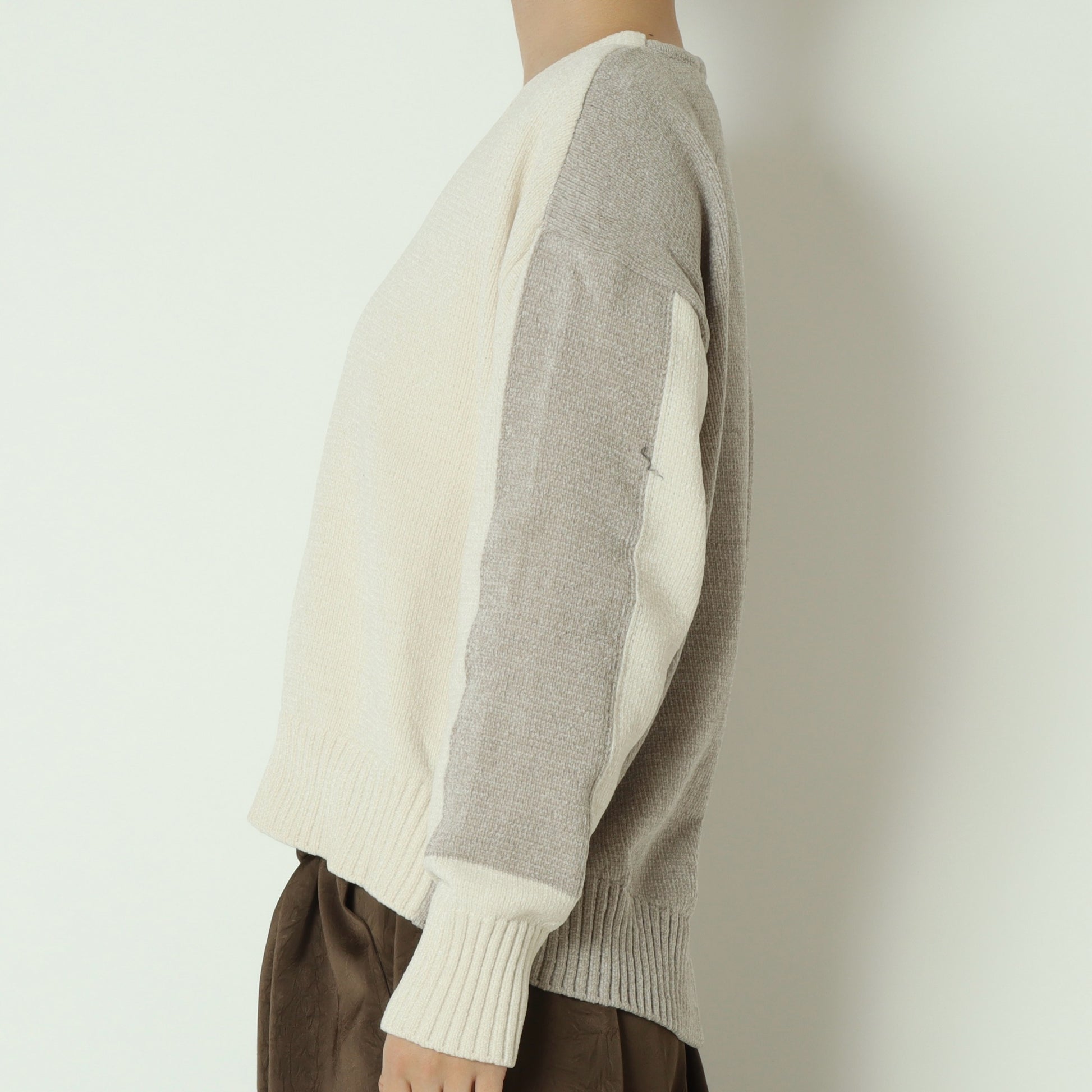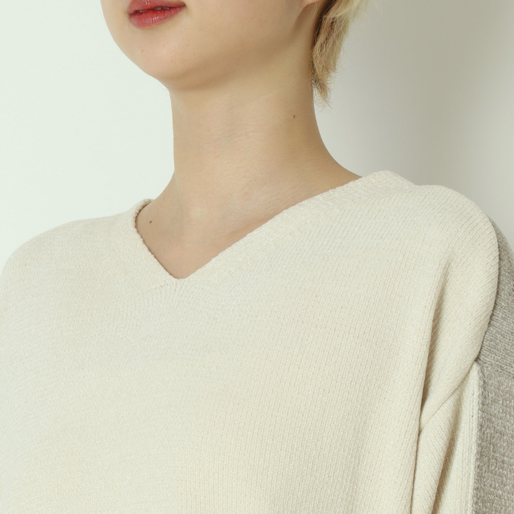 柔らかく、ふんわりとした風合いのモール糸を使用したVネックニットトップス。