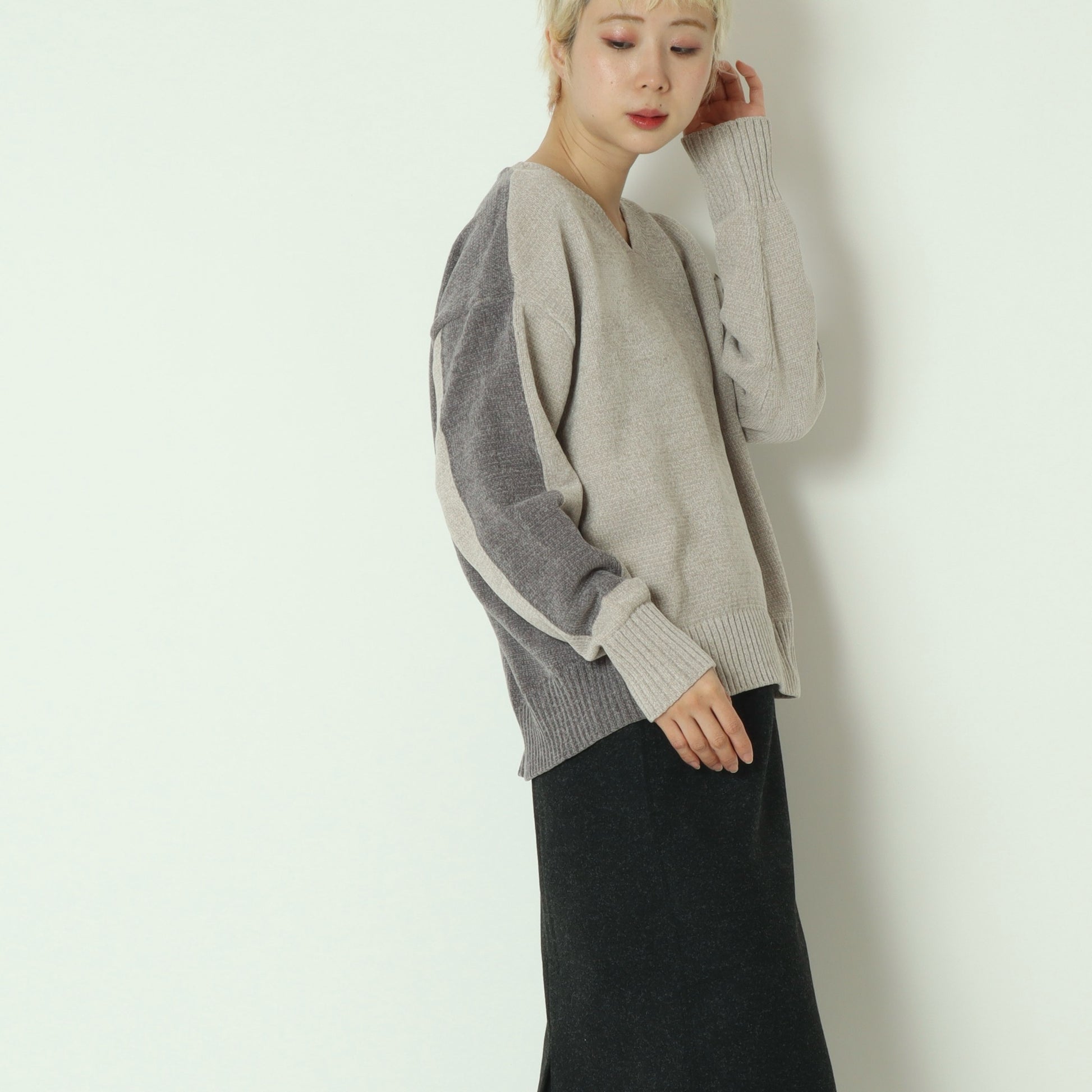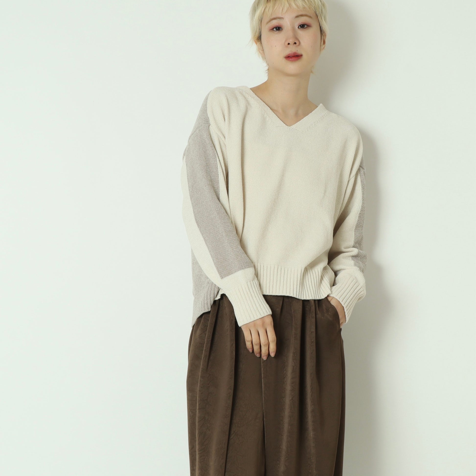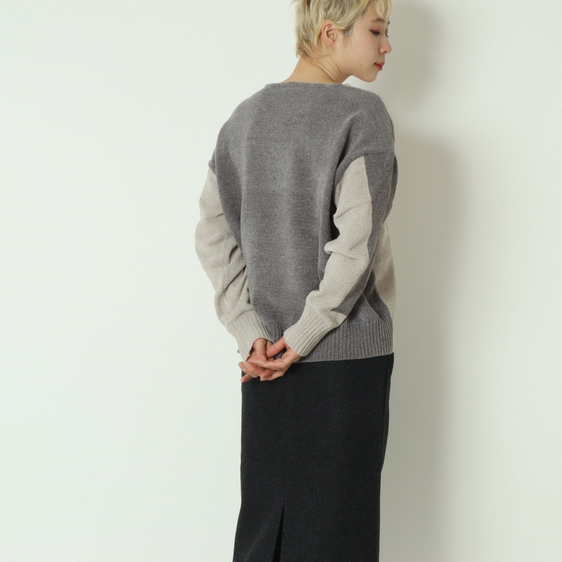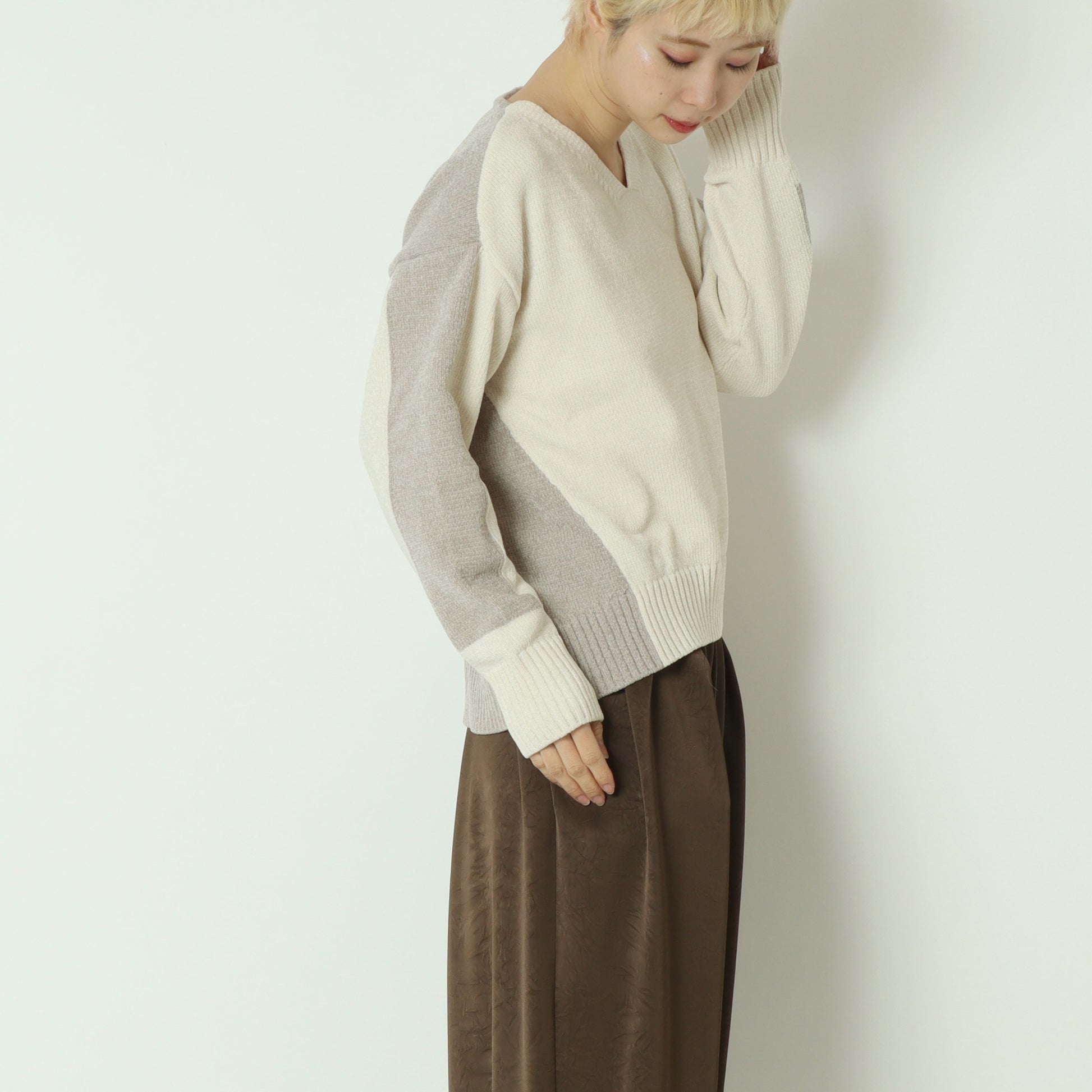 後ろ下がりの丸みを帯びたシルエットと、浅めのVネックが顔まわりをすっきりと見せ、程よく抜け感のある大人の佇まいを演出。