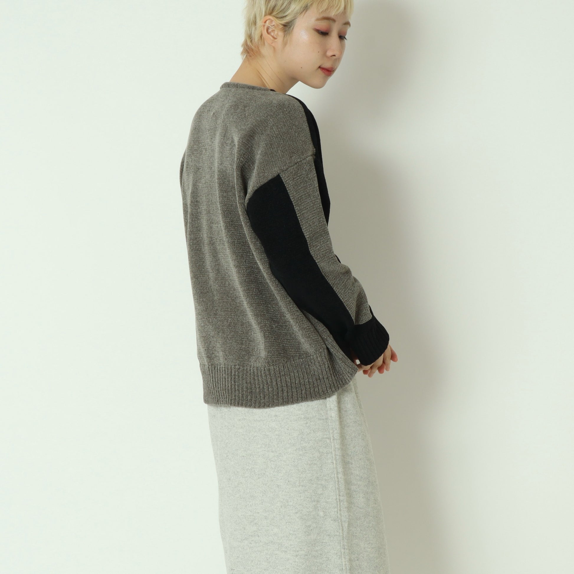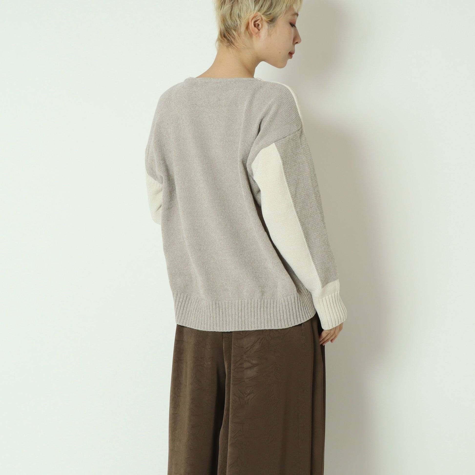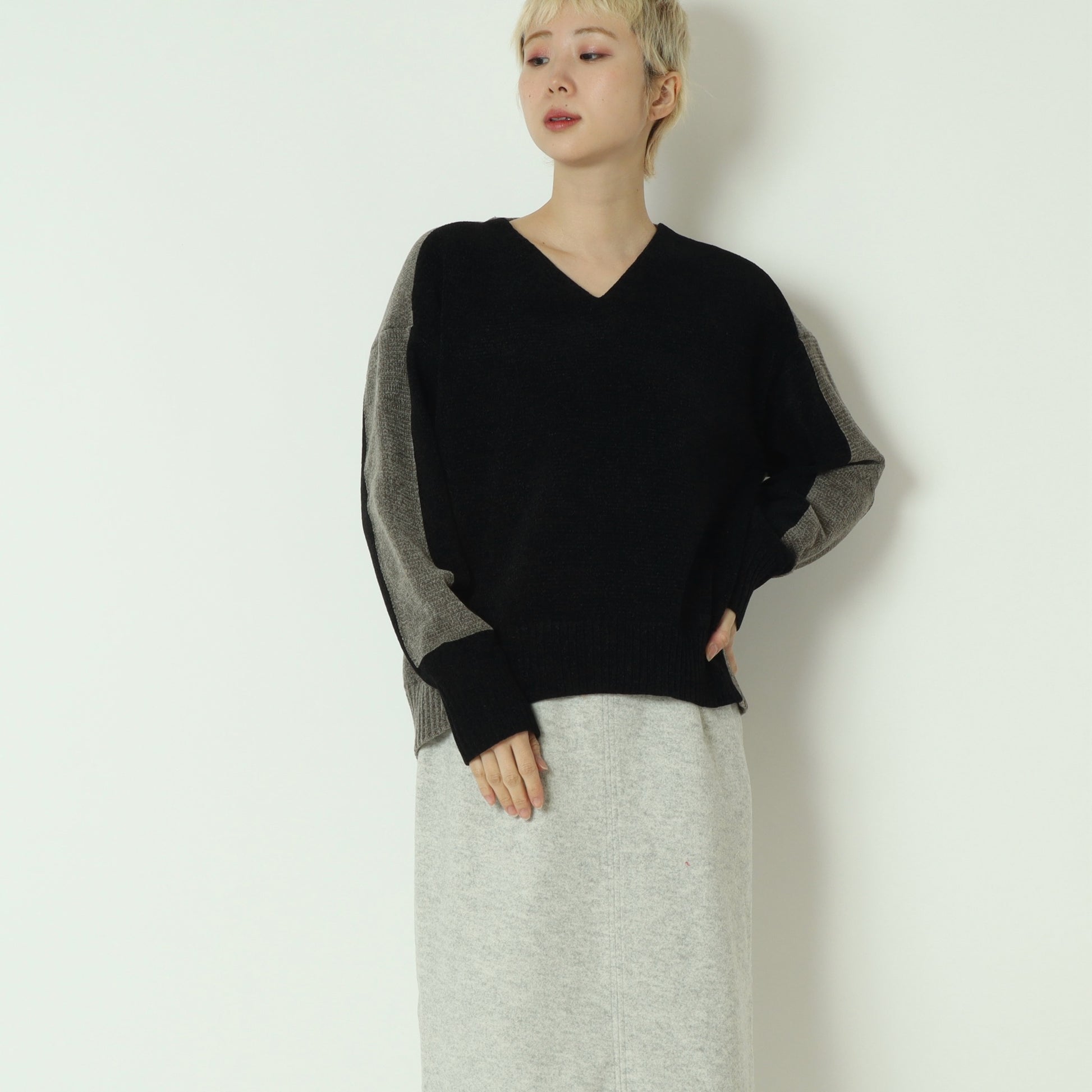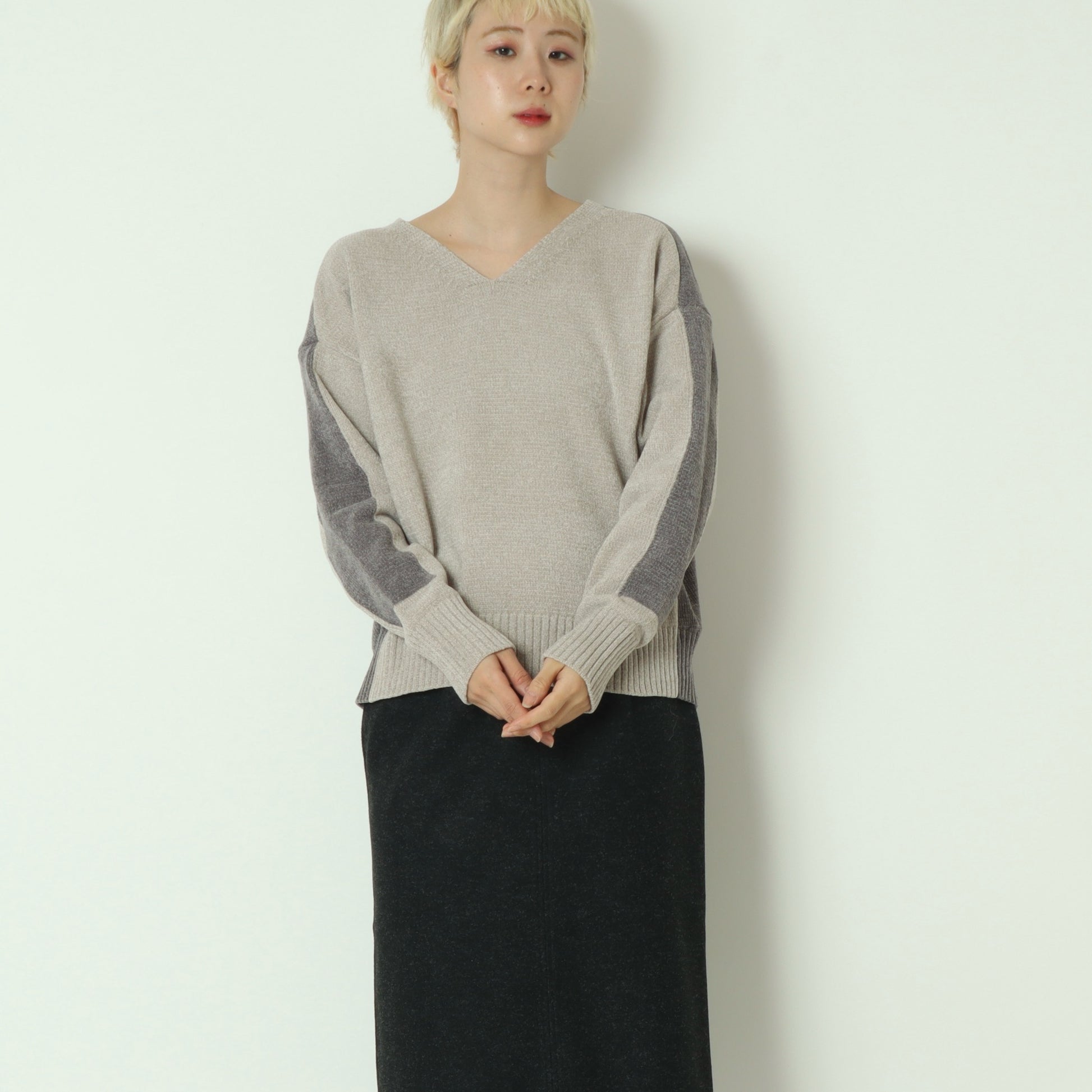 後ろ下がりの丸みを帯びたシルエットと、浅めのVネックが顔まわりをすっきりと見せ、程よく抜け感のある大人の佇まいを演出。