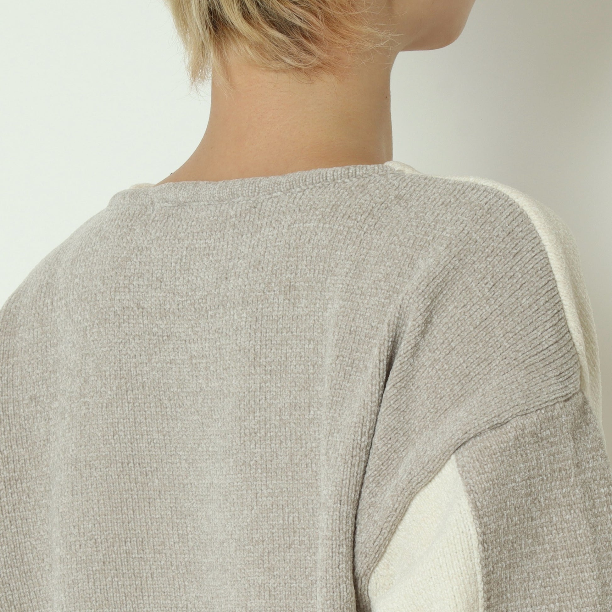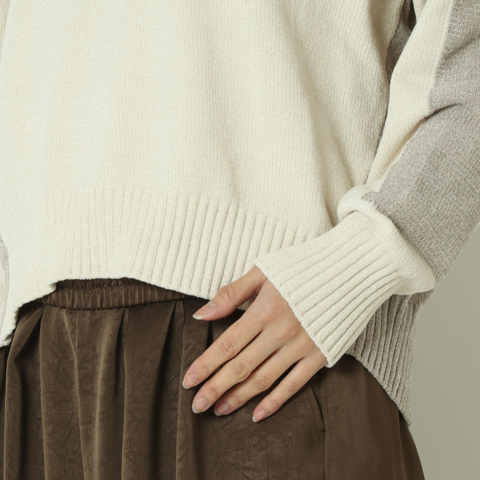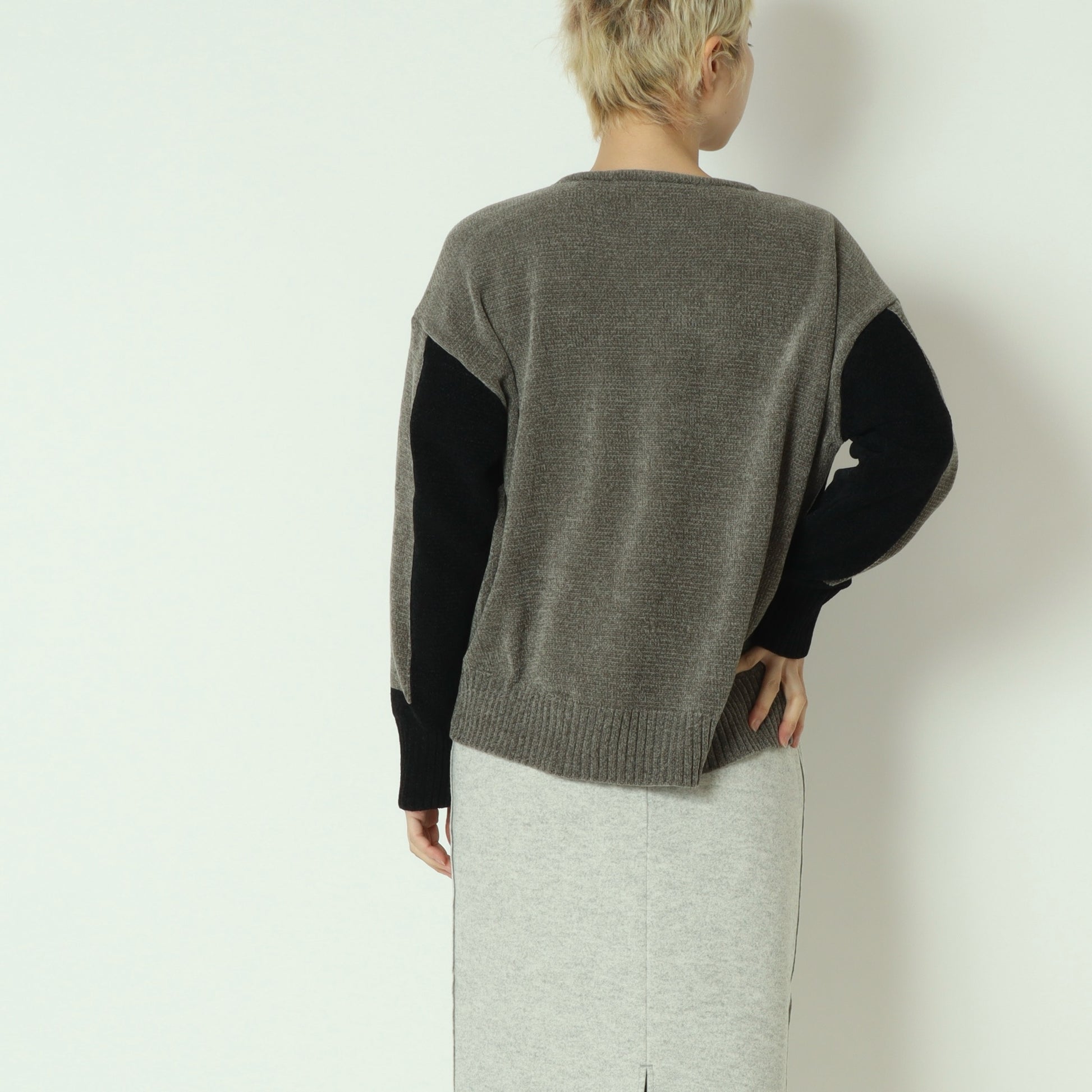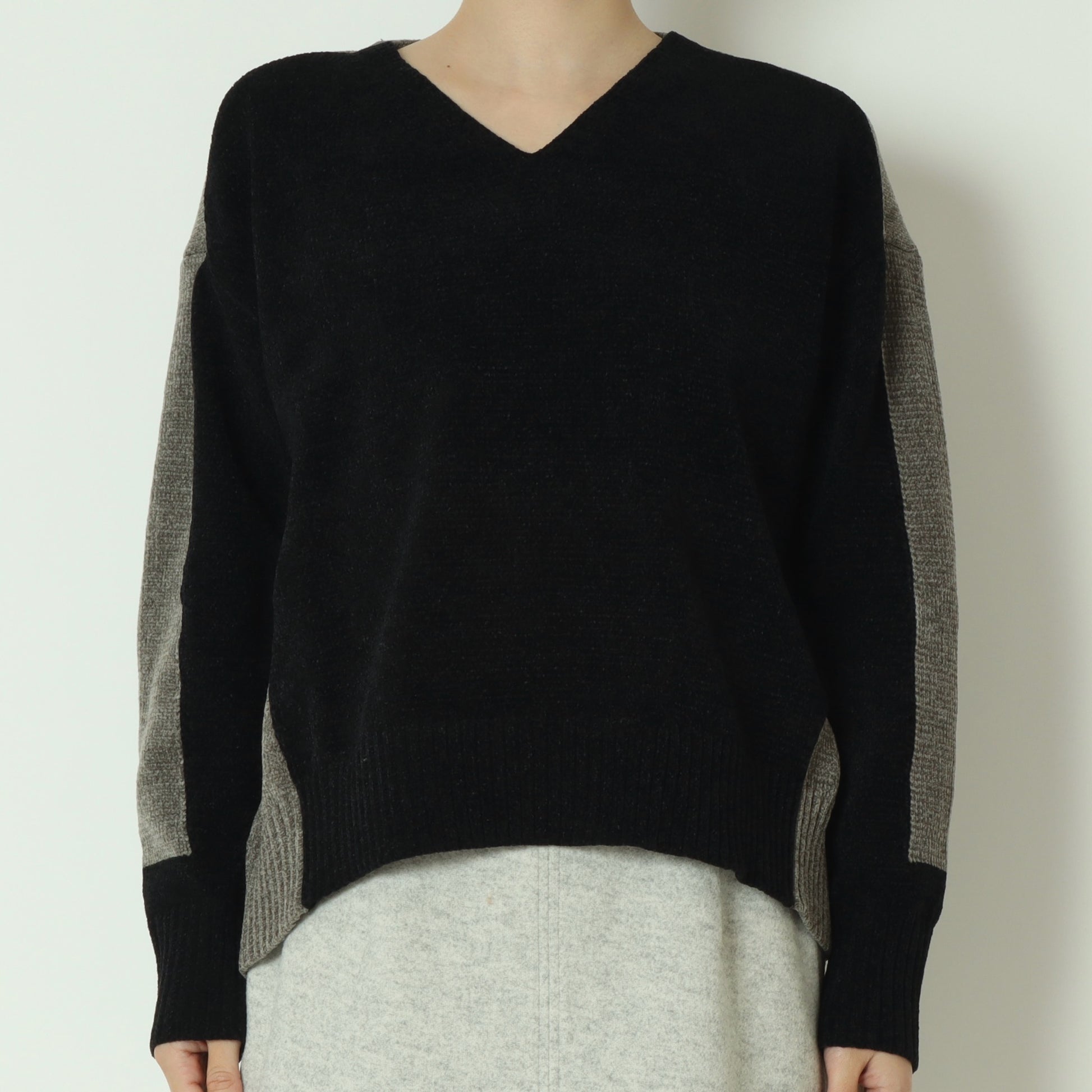 後ろ下がりの丸みを帯びたシルエットと、浅めのVネックが顔まわりをすっきりと見せ、程よく抜け感のある大人の佇まいを演出。