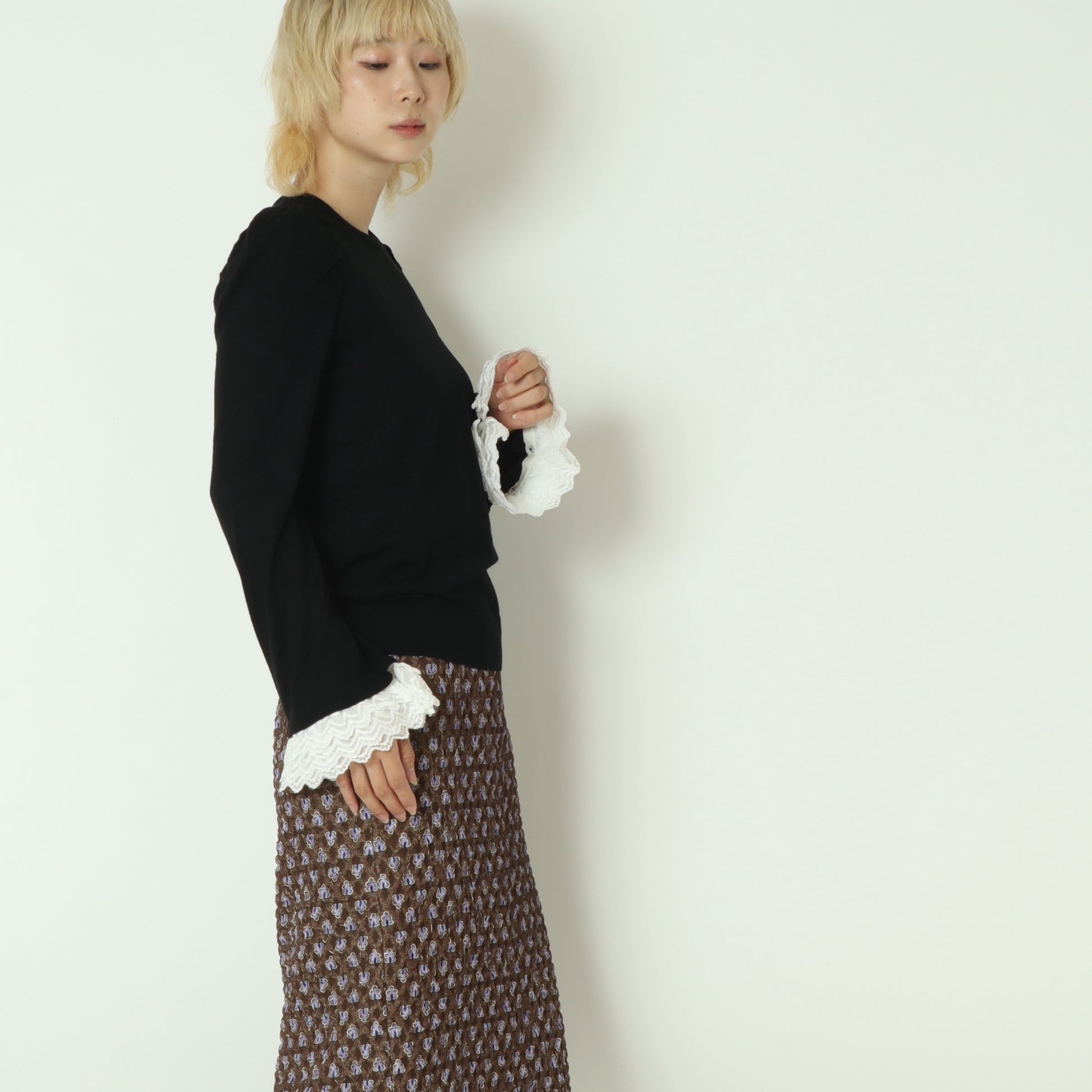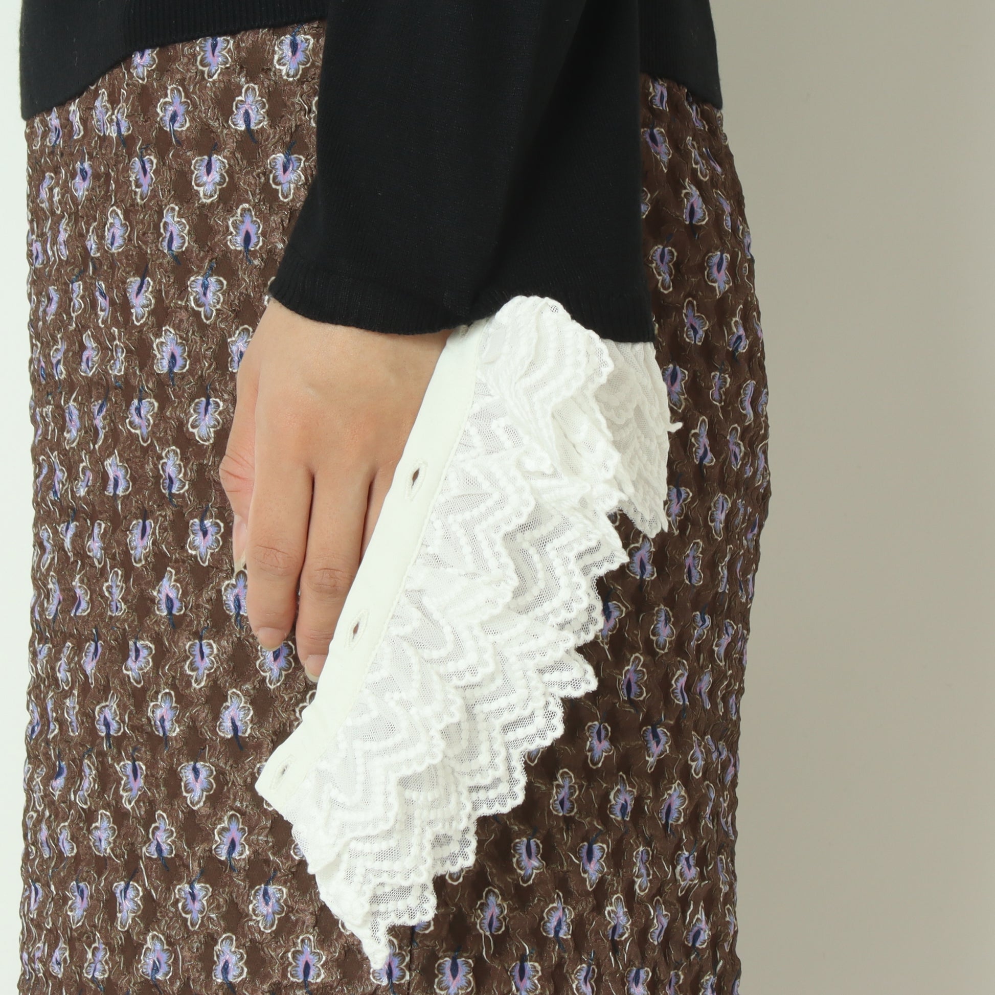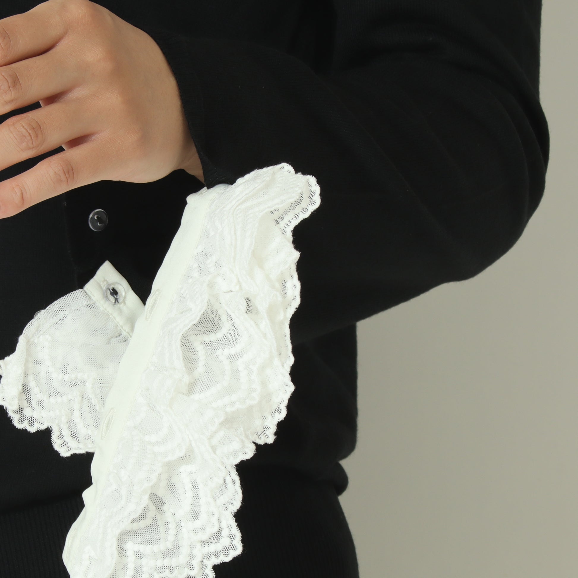 ギャザーショルダーから流れるように広がった袖口とスカラップレースが、