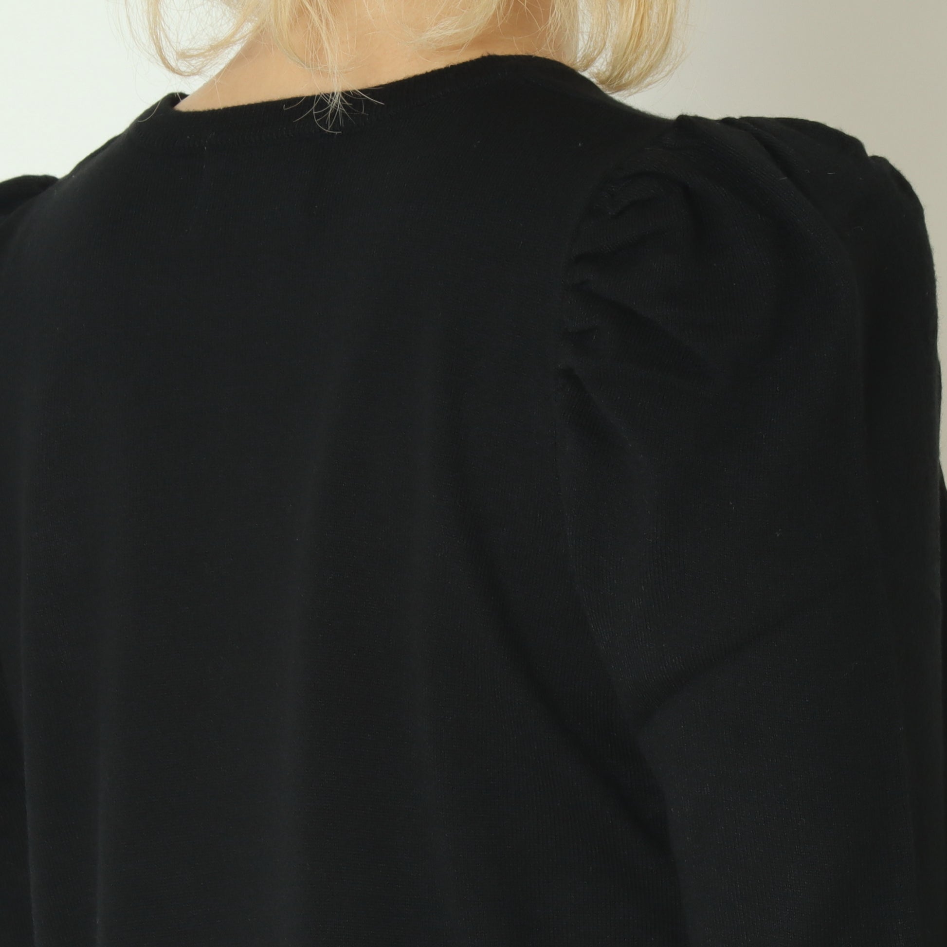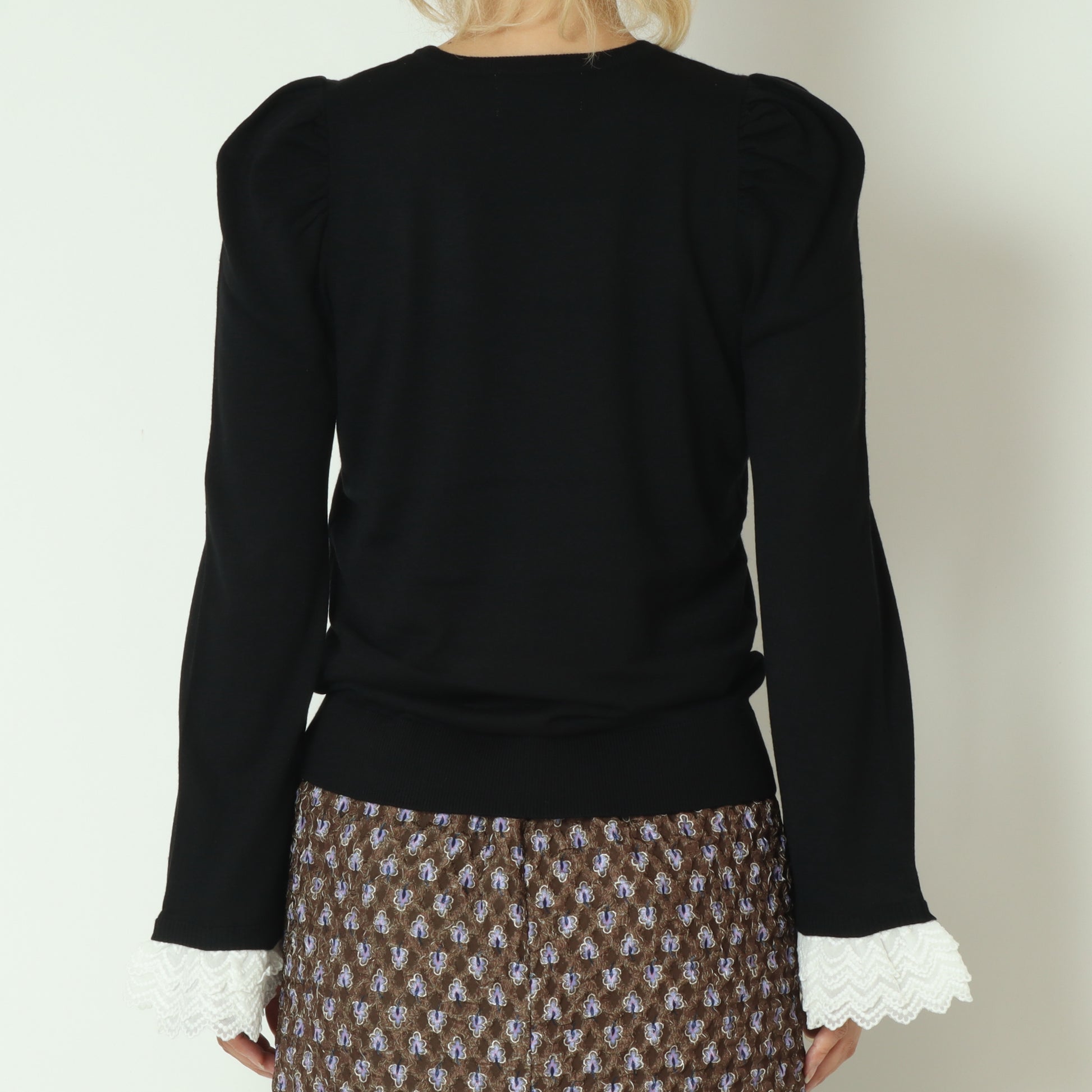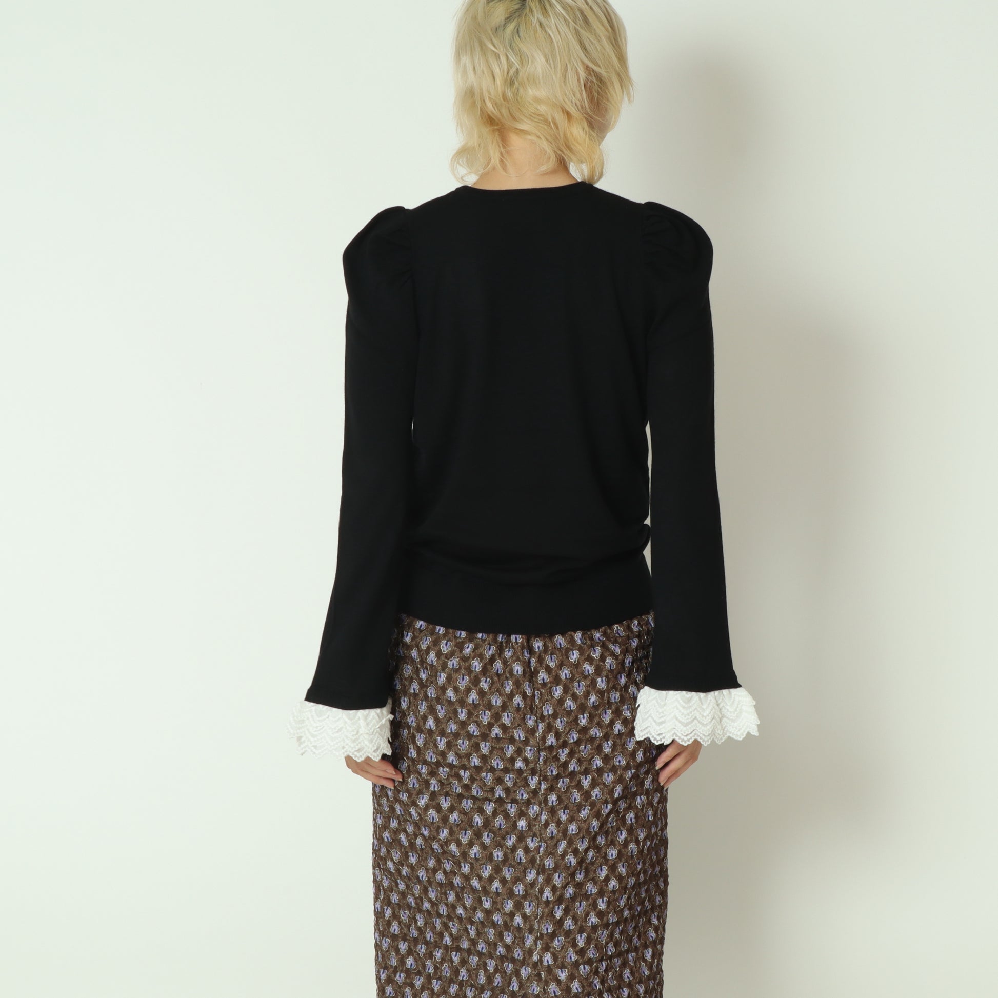 ギャザーショルダーから流れるように広がった袖口とスカラップレースが、