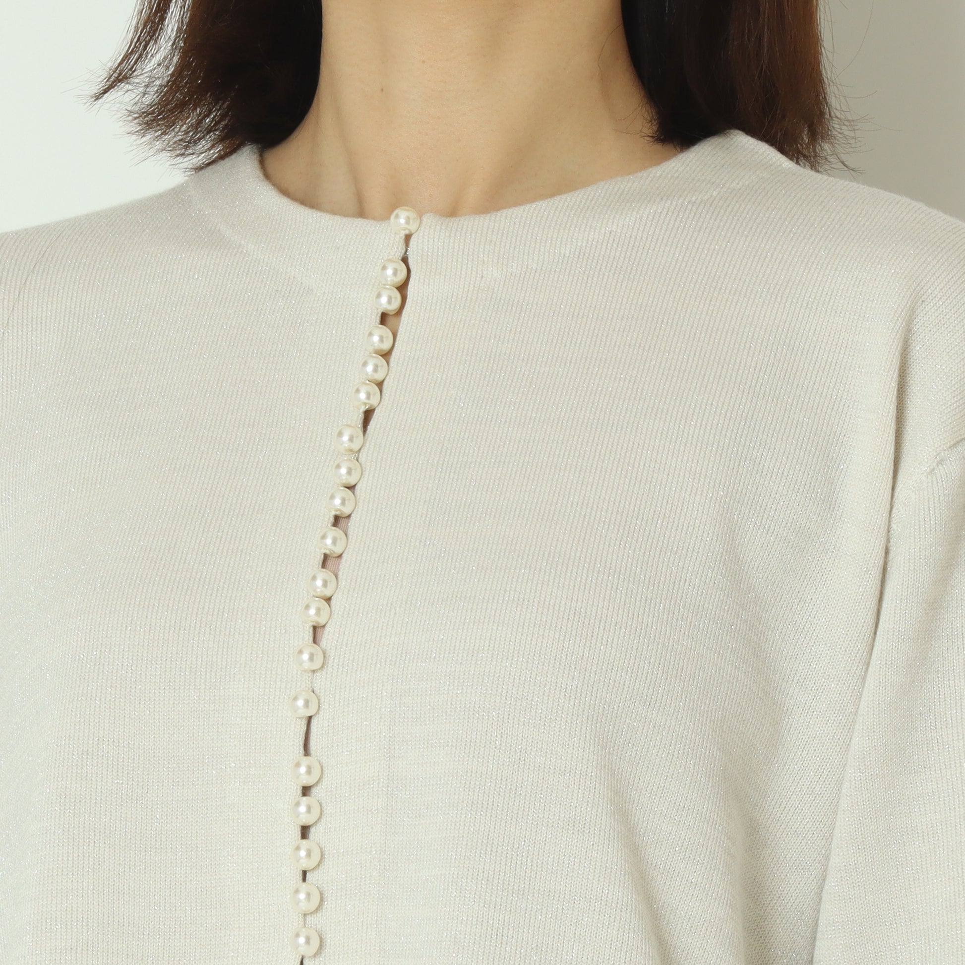 フロントにはパールボタンをあしらいフェミニンな装いに。