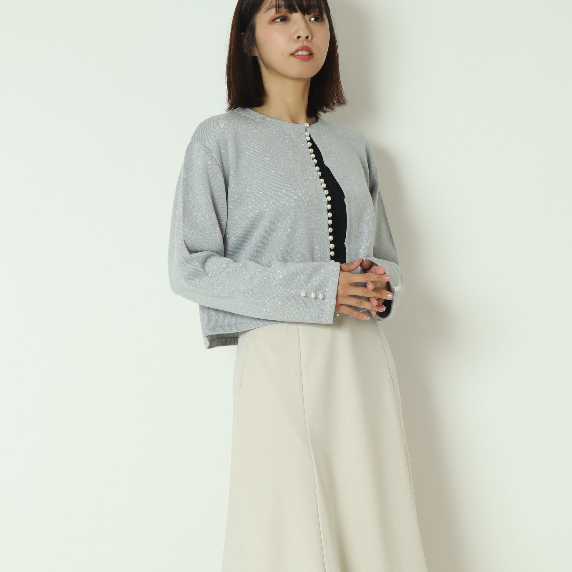 華やかな印象のメタリックジャージ素材のカーディガン。
